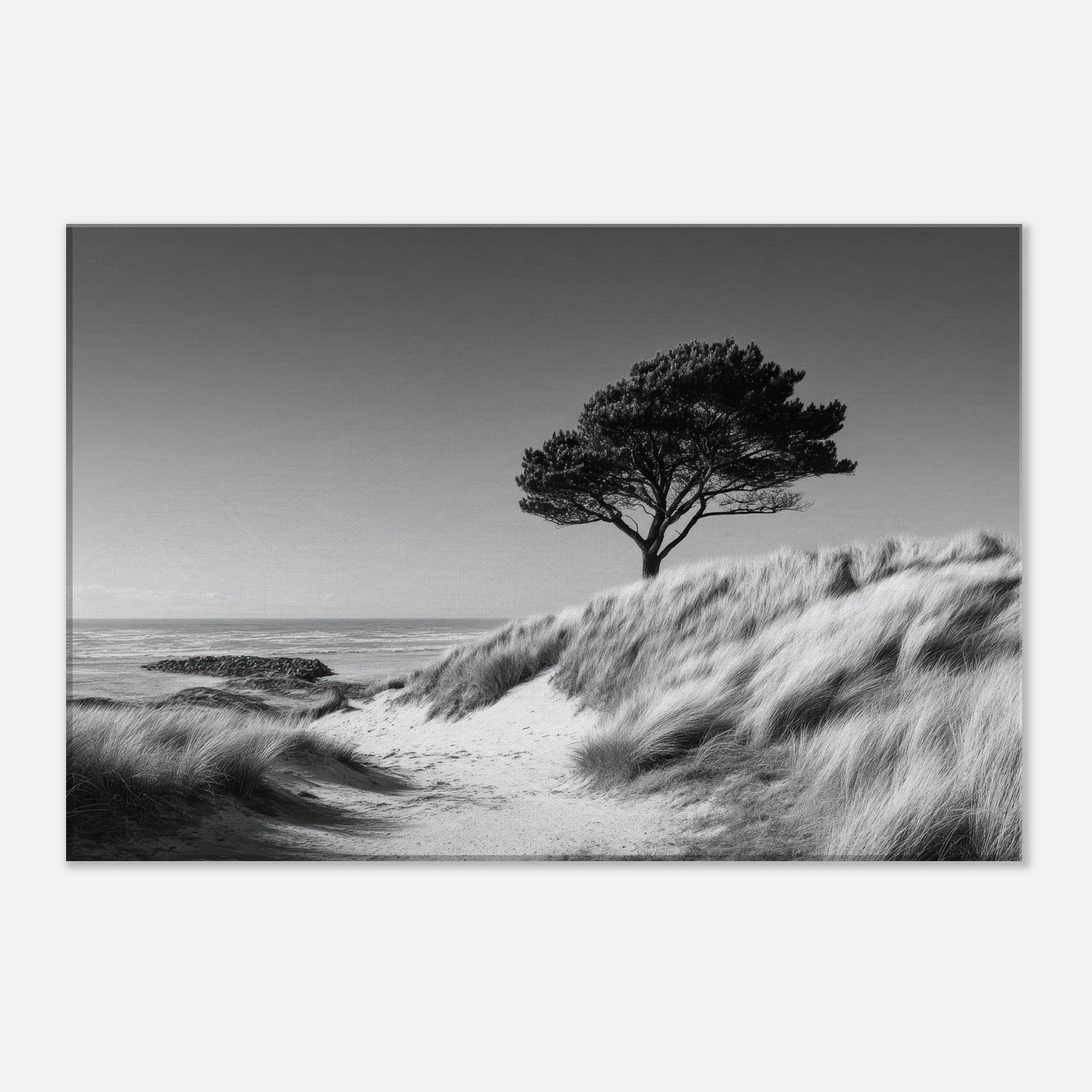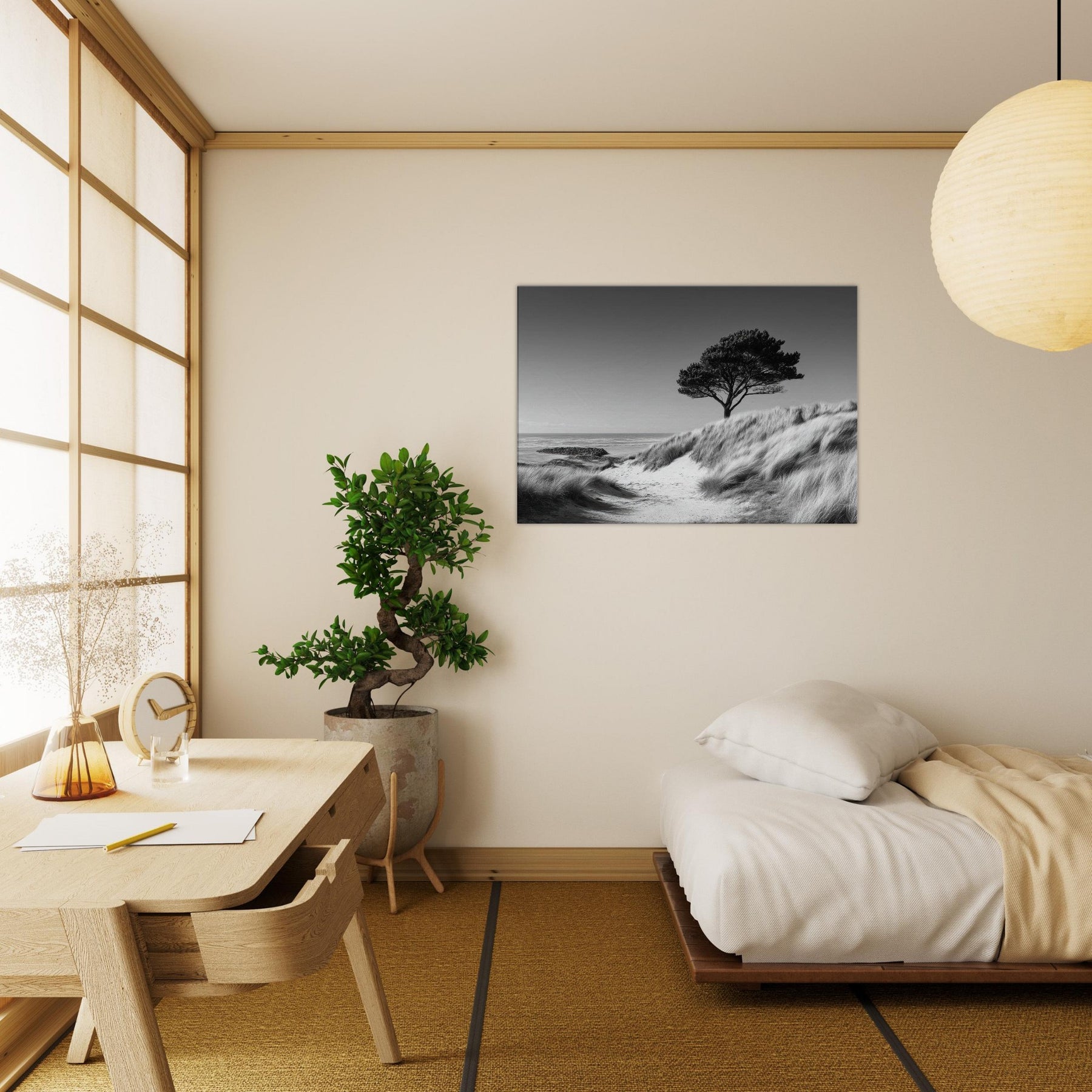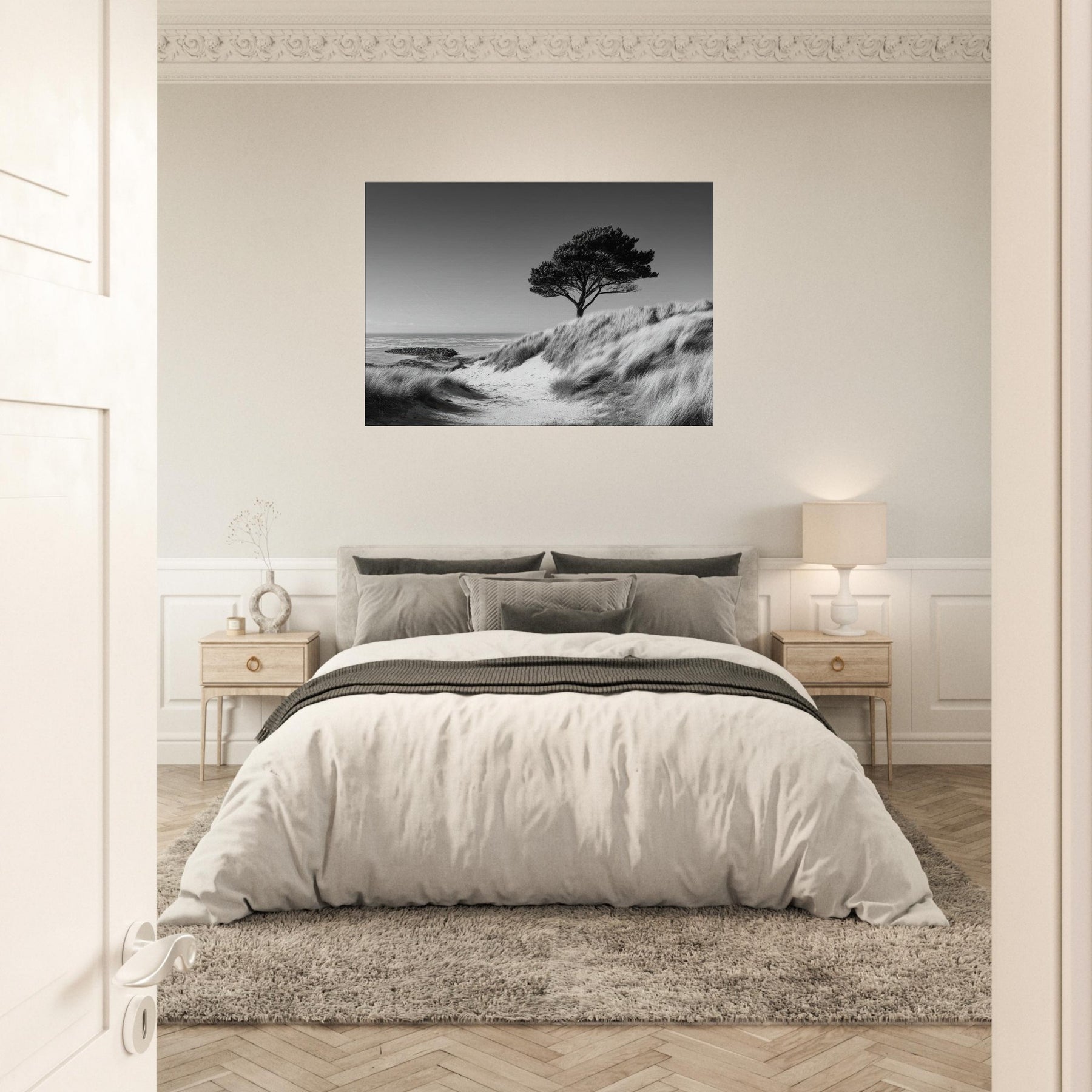 Coastal Dunes in black and white unfold as a quiet meditation on wind, water, and solitude. This image captures a lone tree perched above rolling dunes, where the sea whispers at the horizon and light chisels every grain of sand into delicate texture. Hang it to invite a serene, contemplative mood into your living room or bedroom, where monochrome contrast deepens neutrals and the tactile rhythm of grasses adds subtle movement to the space.