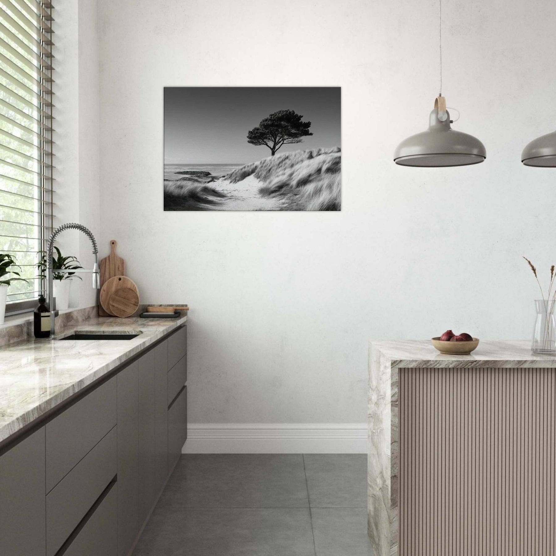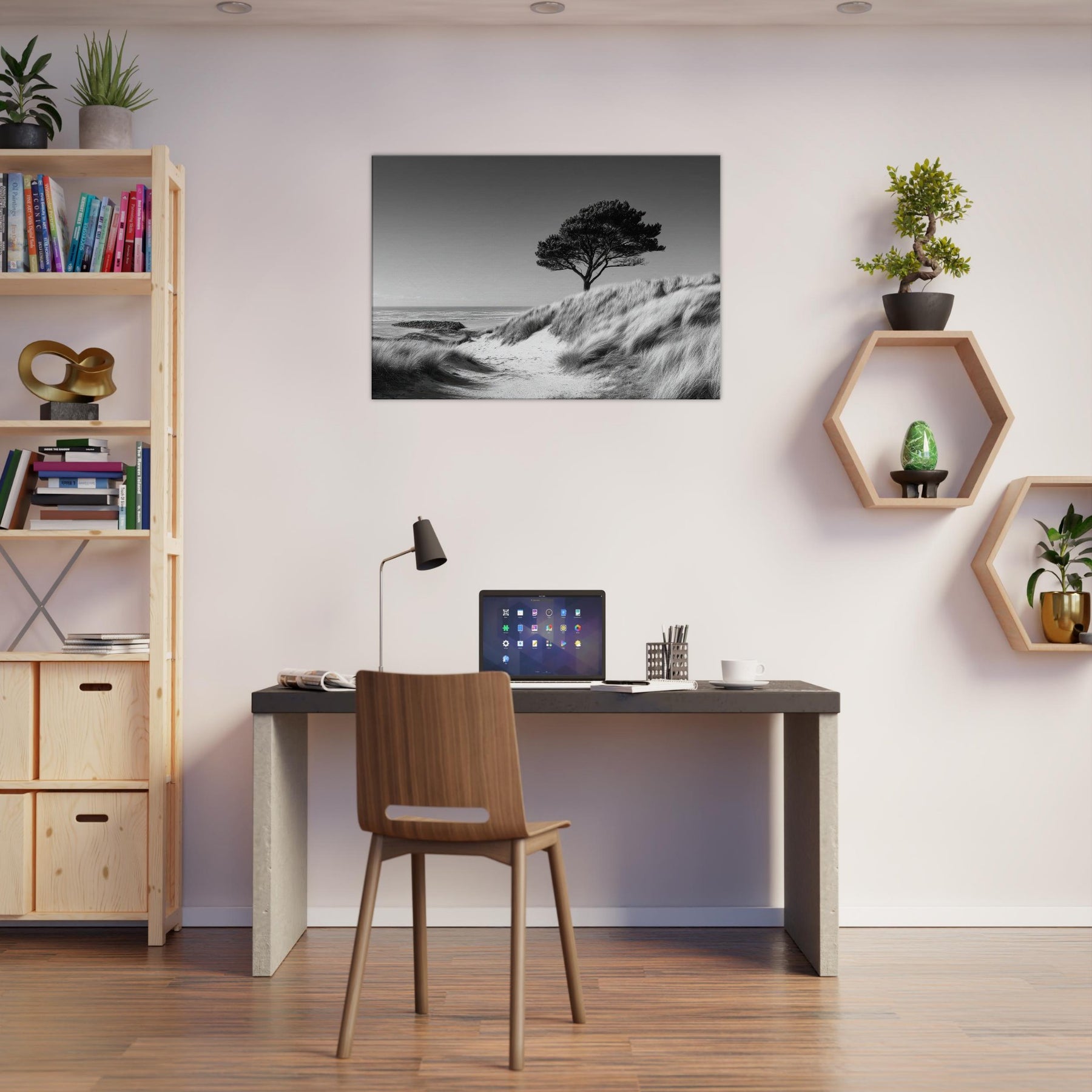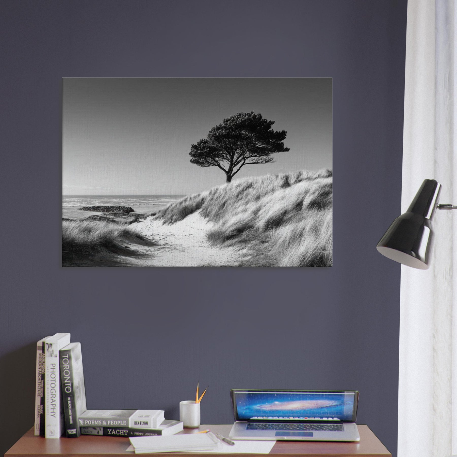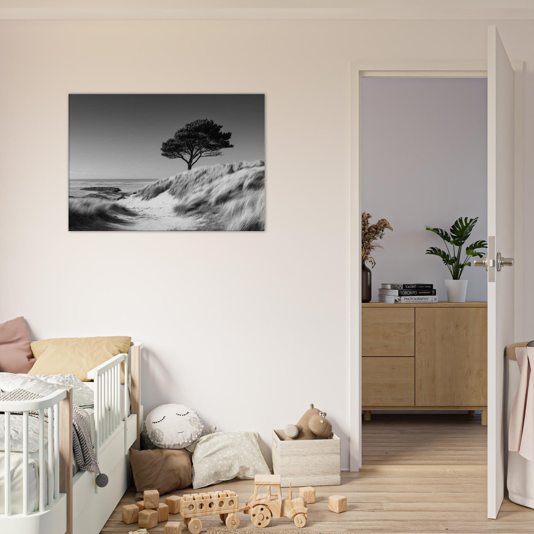 Coastal Dunes in black and white unfold as a quiet meditation on wind, water, and solitude. This image captures a lone tree perched above rolling dunes, where the sea whispers at the horizon and light chisels every grain of sand into delicate texture. Hang it to invite a serene, contemplative mood into your living room or bedroom, where monochrome contrast deepens neutrals and the tactile rhythm of grasses adds subtle movement to the space.