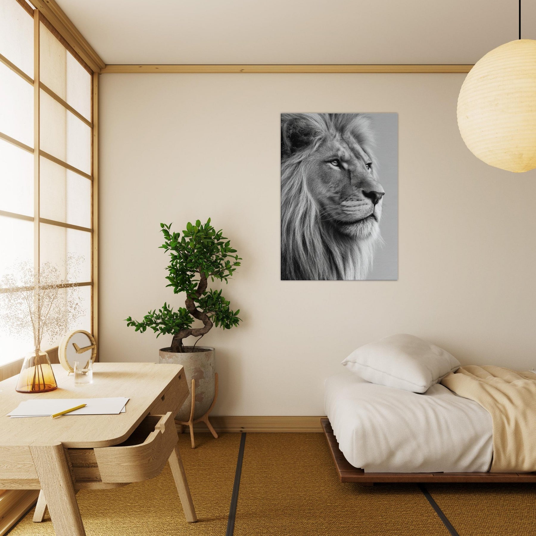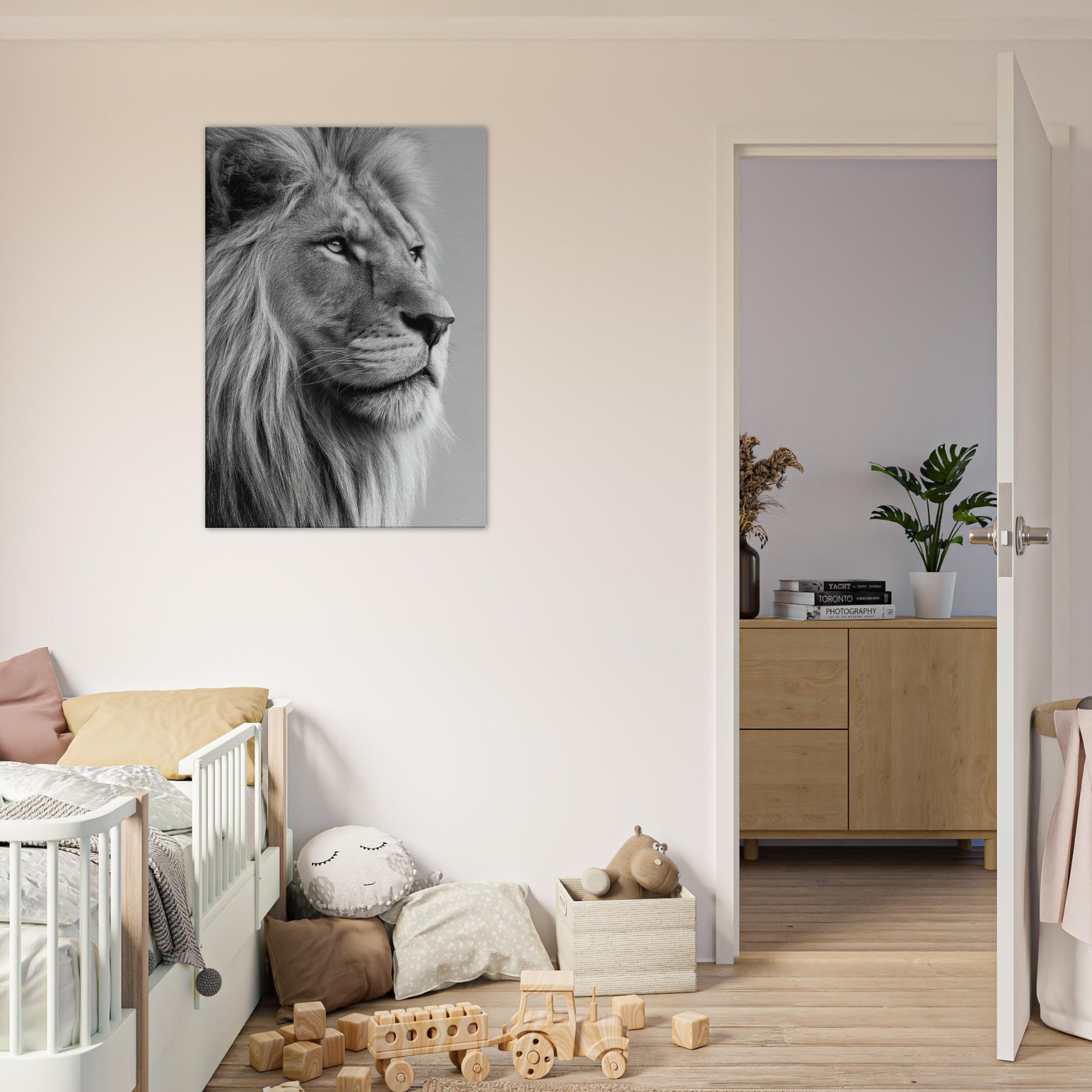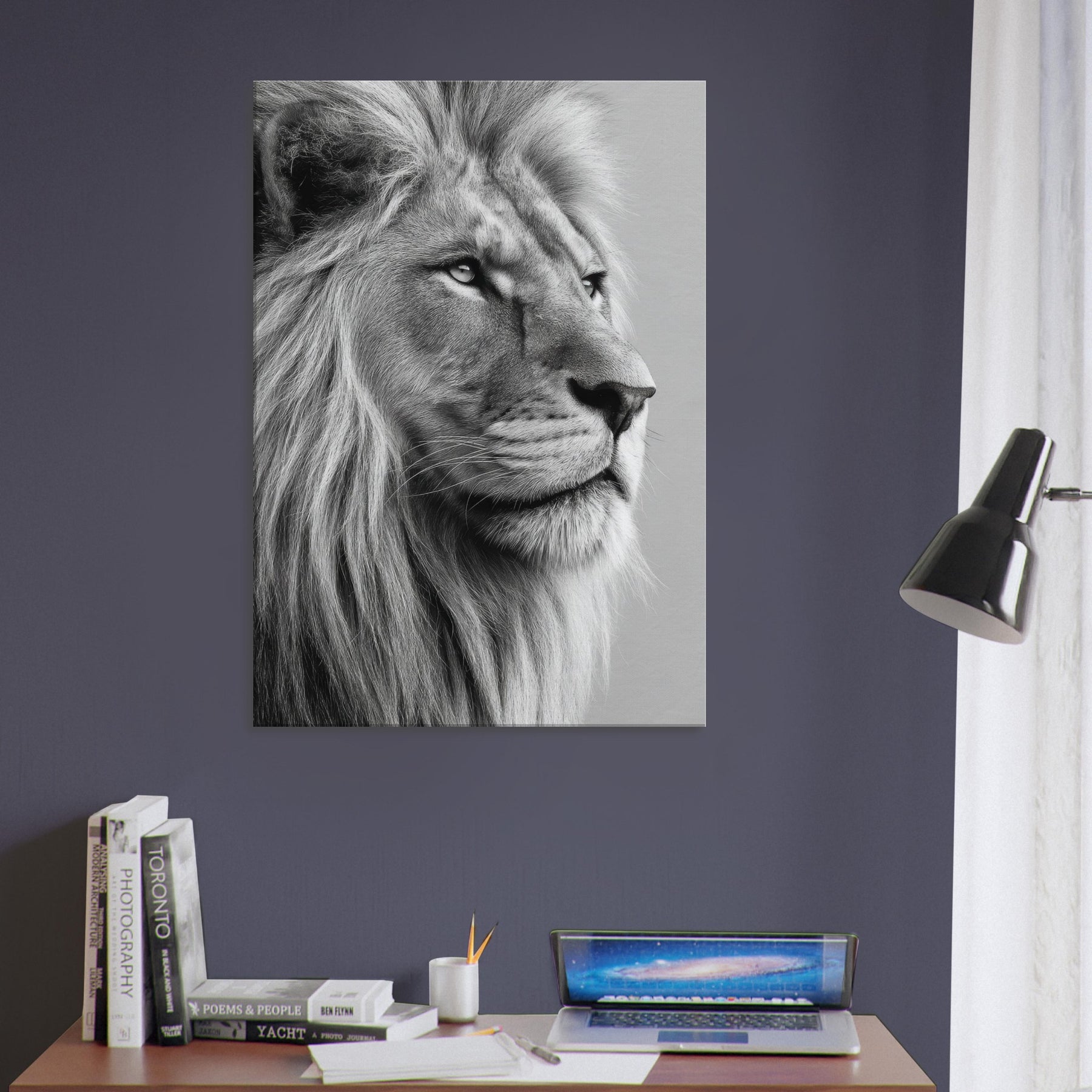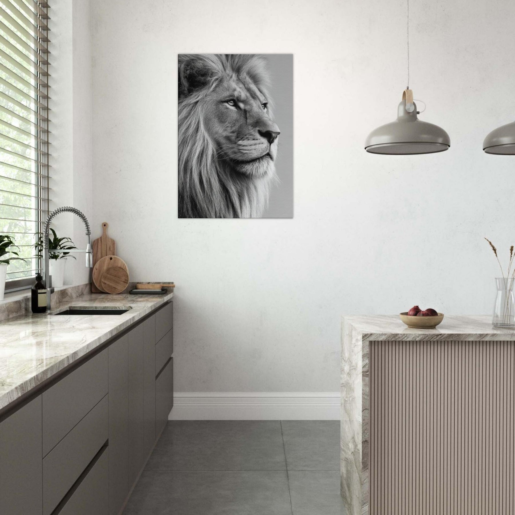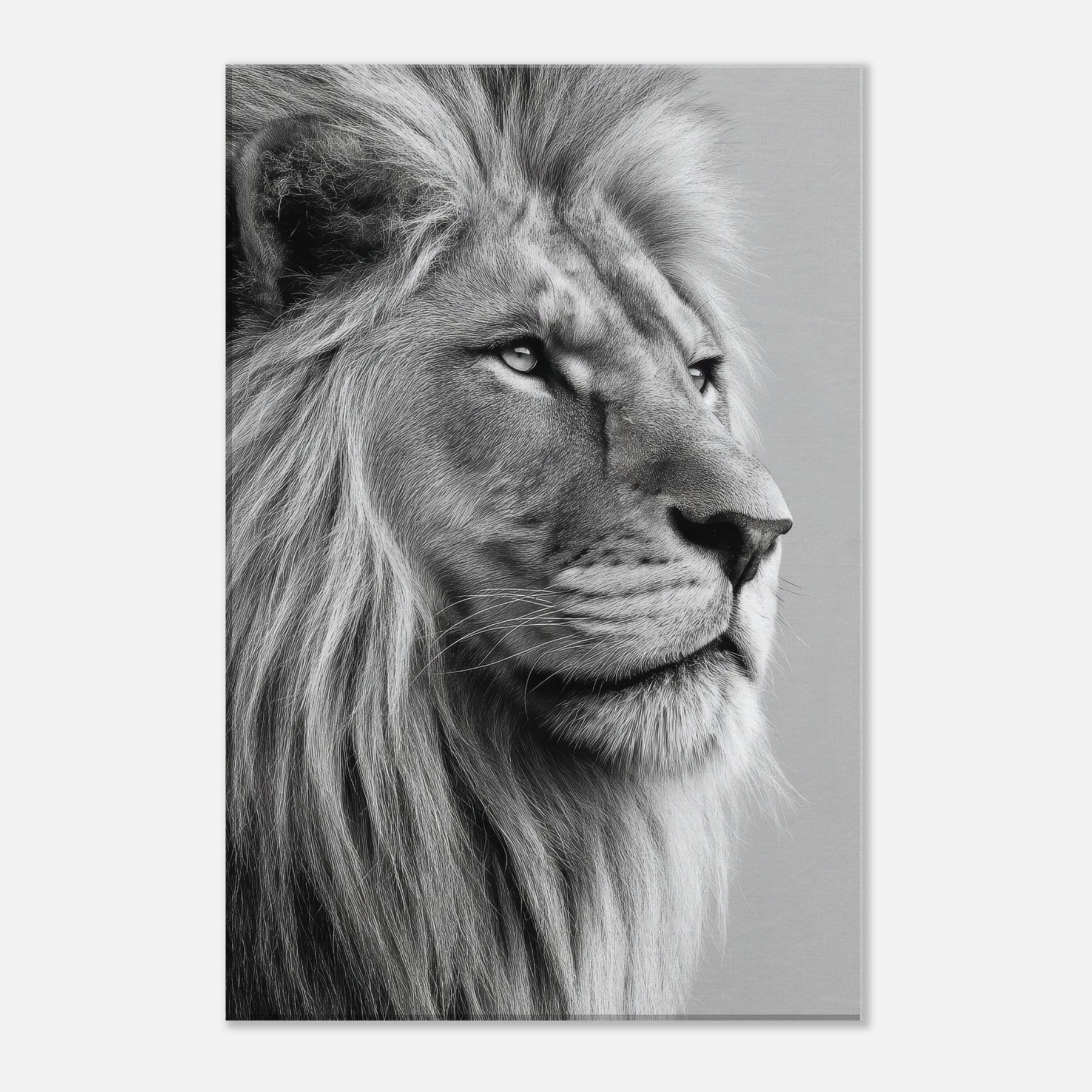 An arresting study in contrast, this black and white frames the lion in a moment of contemplative grace. The stark lines and soft mane draw the eye, creating a meditative focal point that quiets a room and invites lingering, reflective moments. The lion, rendered with precision and mood, becomes a powerful yet serene presence in any living space a wall companion that elevates textures from wood to metal and glows with timeless, gallery like quiet.