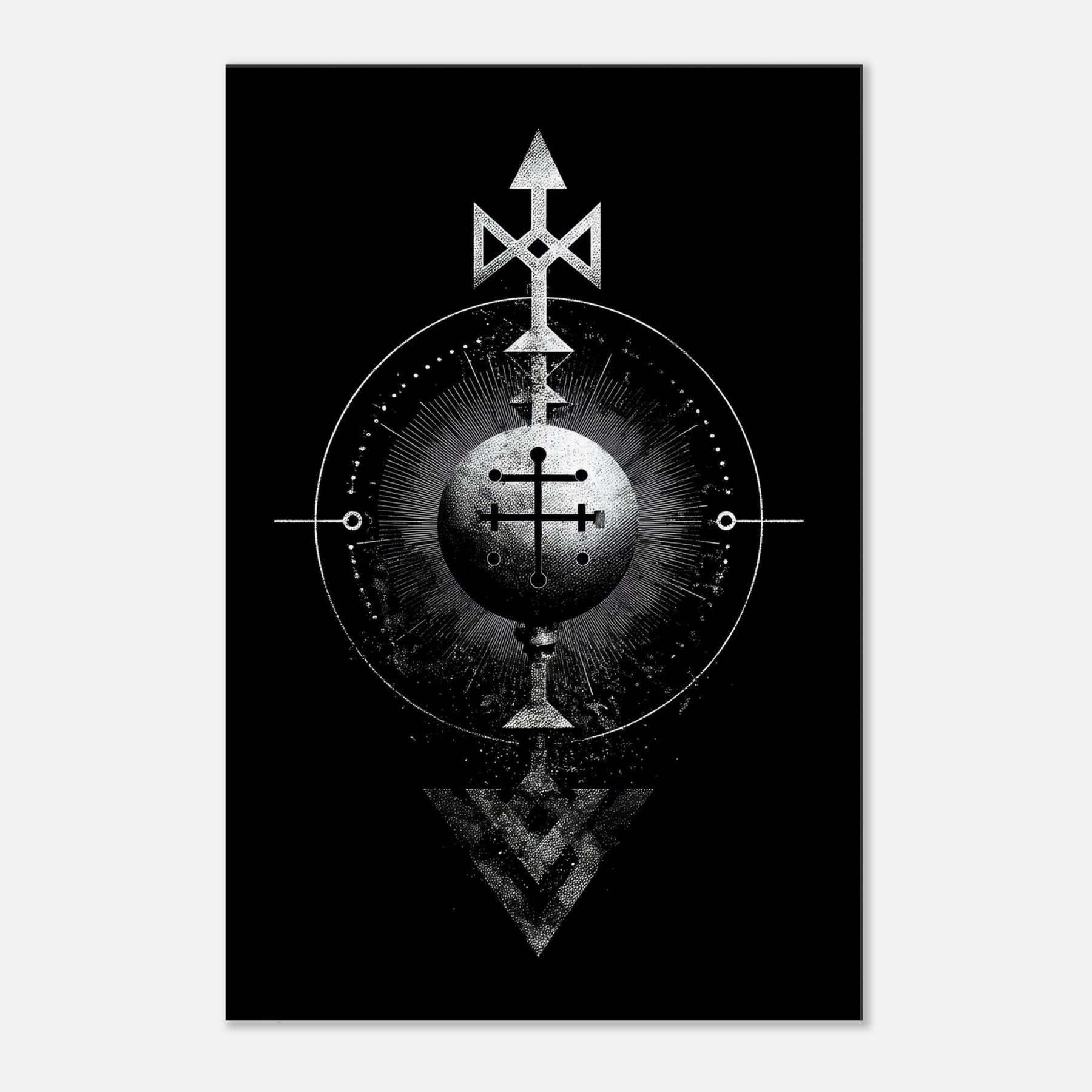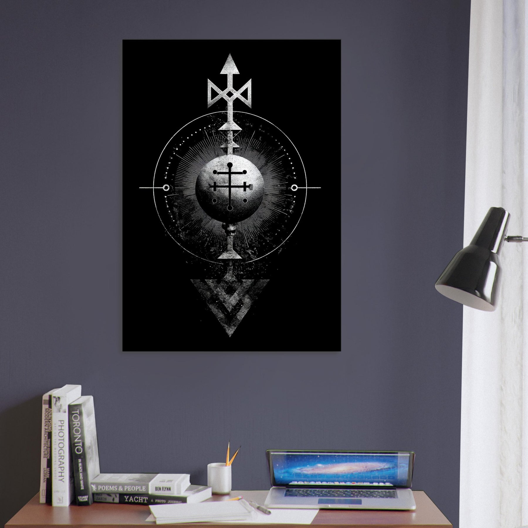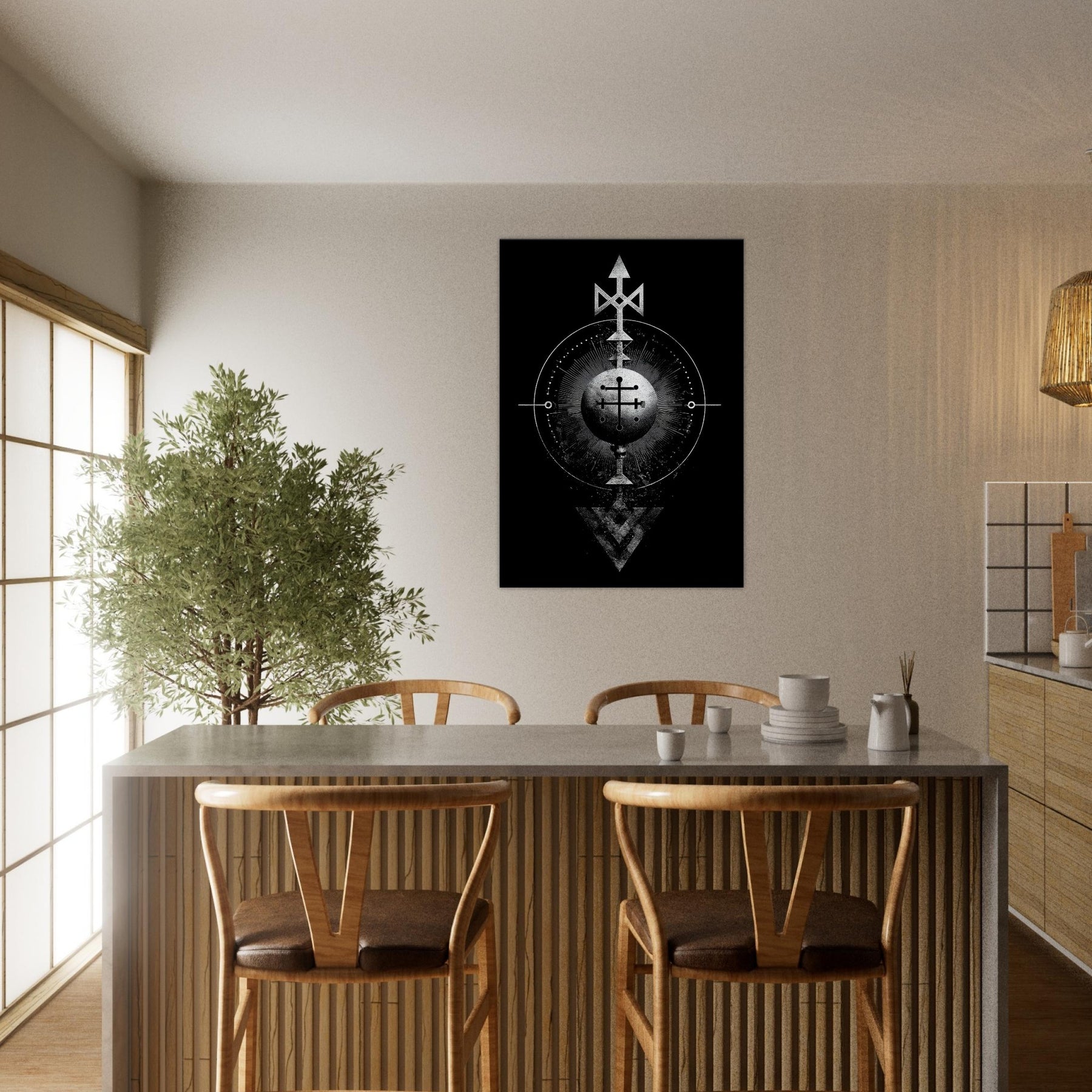 In stark black and white, this wall work anchors a room with quiet radiance. The Alchemy Symbols (Salt, Sulfur, Mercury) are rendered as a disciplined study of ascent and balance, inviting the eye to travel from circle to glyph to line. A central orb and radiant halo evoke ancient laboratories and midnight meditations, while the precise geometry lends both clarity and mystery. Hang it to cultivate focus, contemplation, and a refined, timeless atmosphere in any living space.