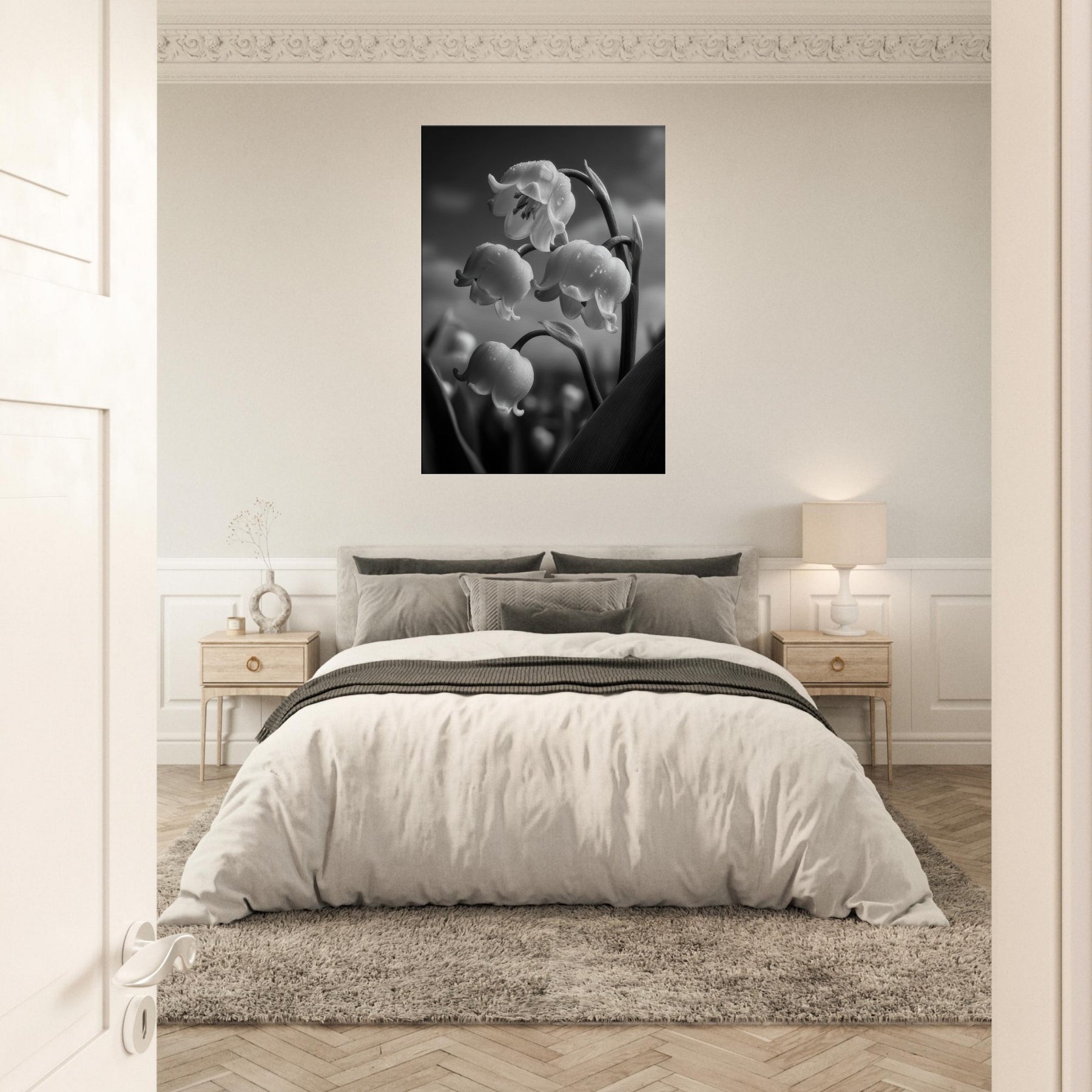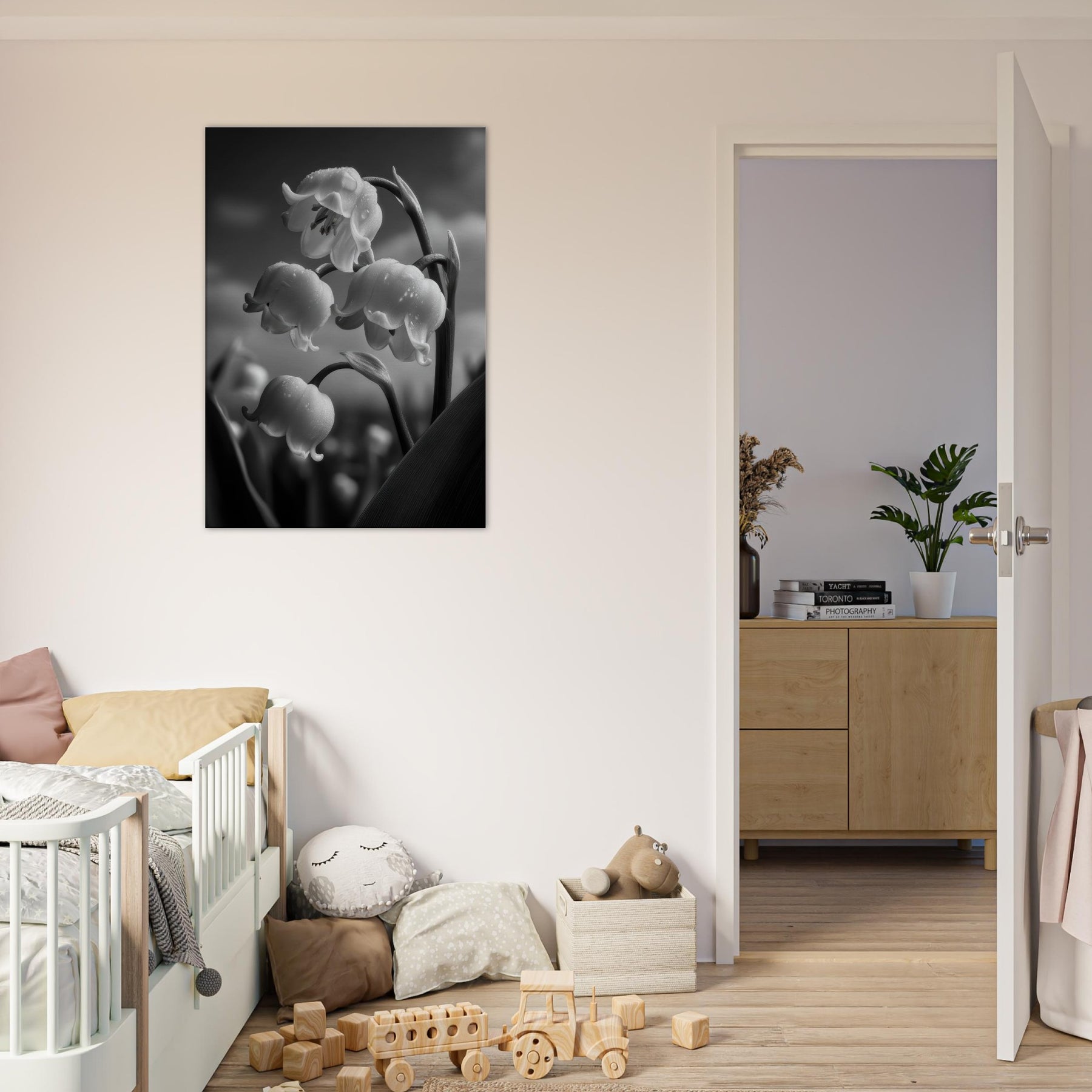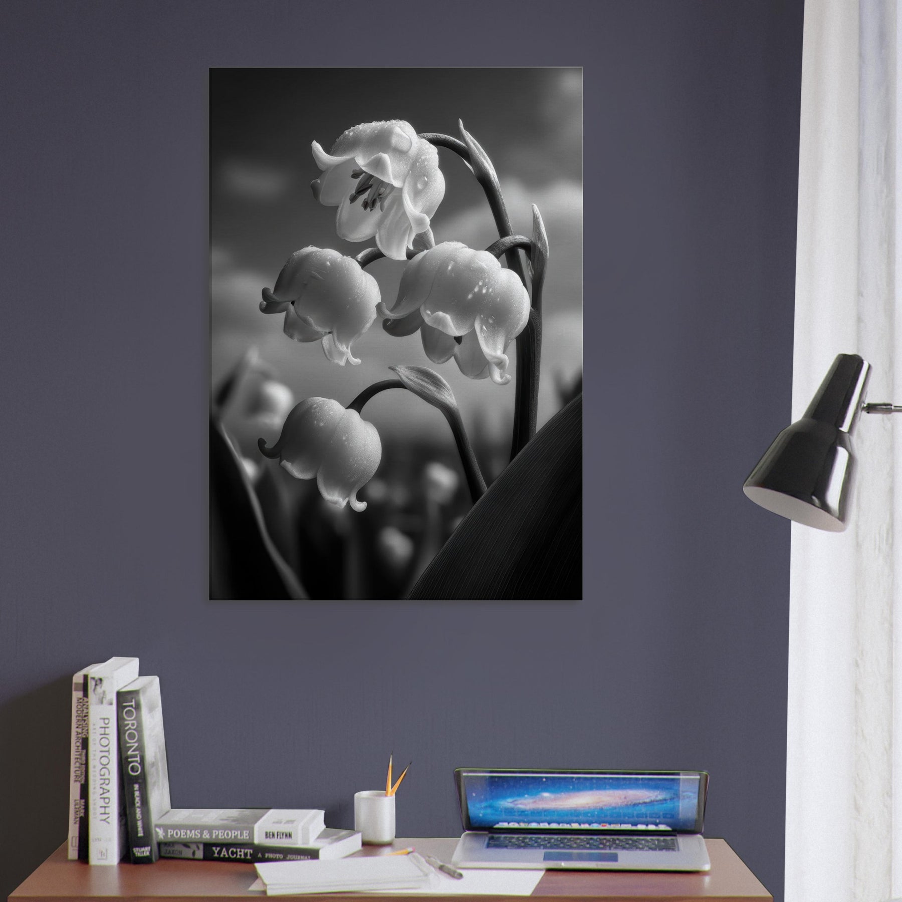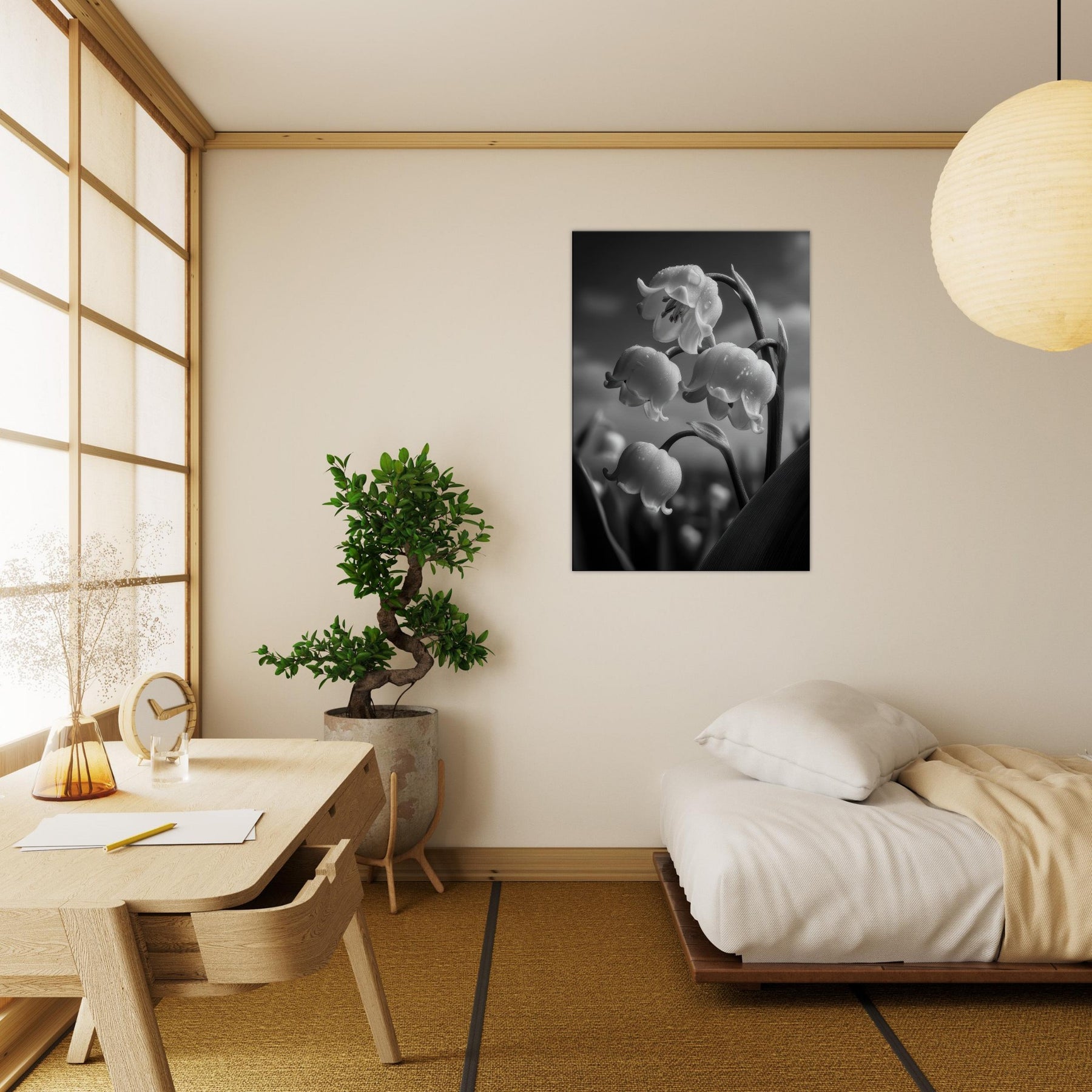 Let Lily of the Valley breathe in quiet majesty across your wall. In pure black and white, the bells suspend with a soft and intimate rhythm, each petal velvet to the touch of light and dew. Subtle shadows weave around the stems, giving depth and stillness to a naturally elegant motif. This artwork invites contemplation and a breath of nature into living spaces, elevating a room with a serene focal point that feels both timeless and contemporary.