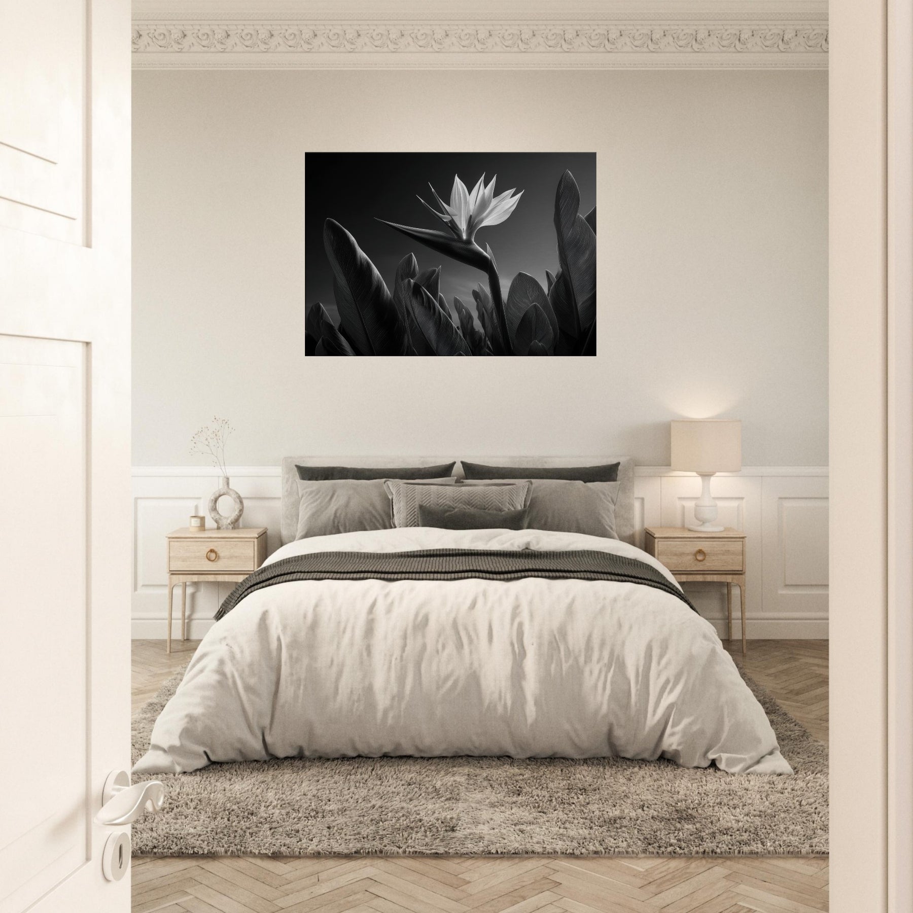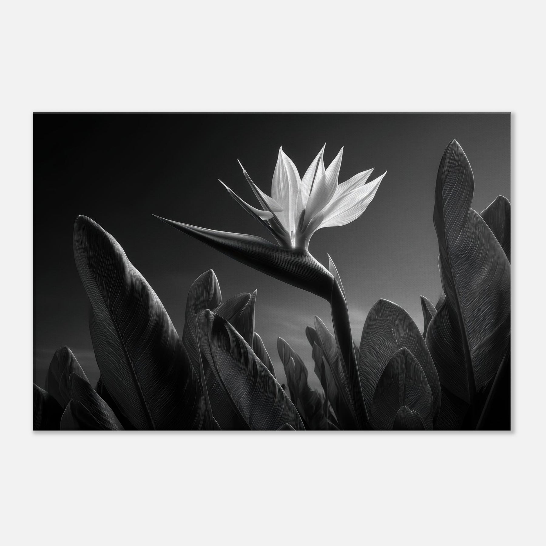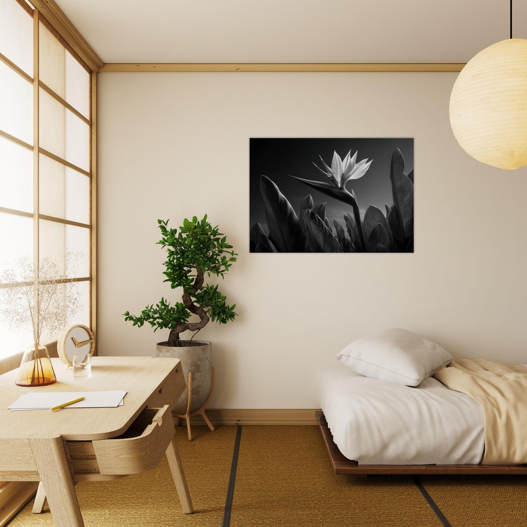 Capture a quiet drama with a lone Bird Of Paradise rising from shadowed foliage. This black and white study slows time, inviting contemplation as light traces the feathered edges and the soft curves of the leaves. Ideal for a serene living room or refined hall, it brings balance and atmosphere to walls, turning them into a calm stage. The Bird Of Paradise, rendered in stark contrast, becomes a timeless focal whisper in any modern interior.