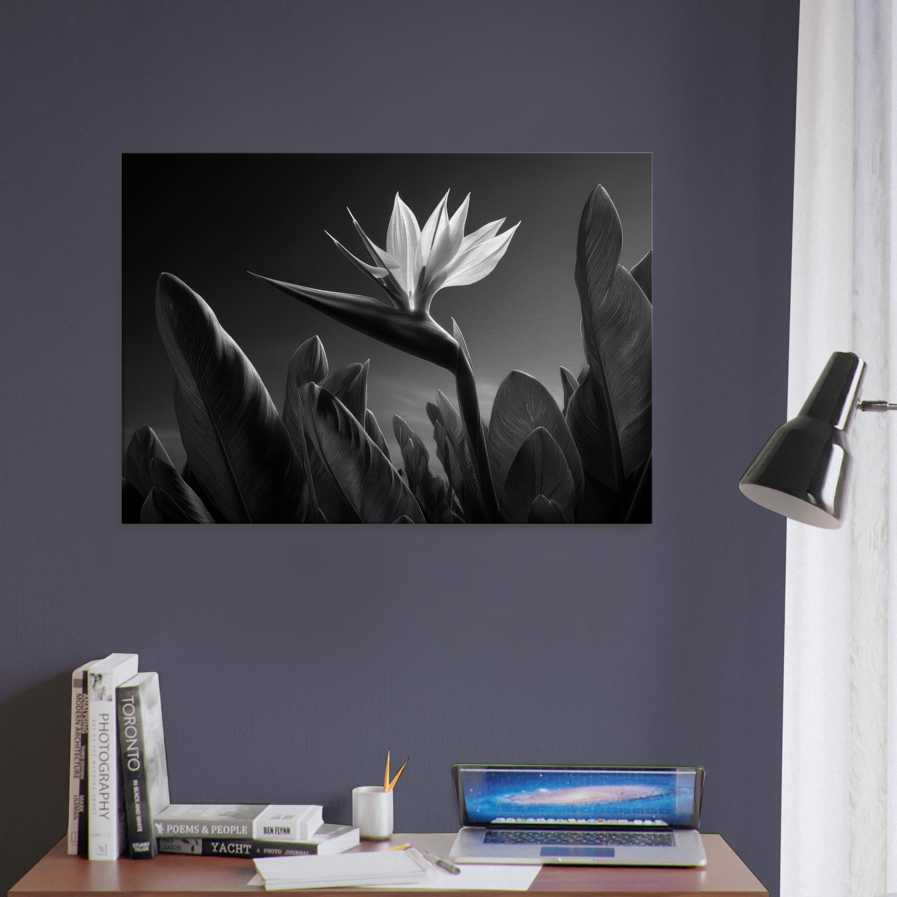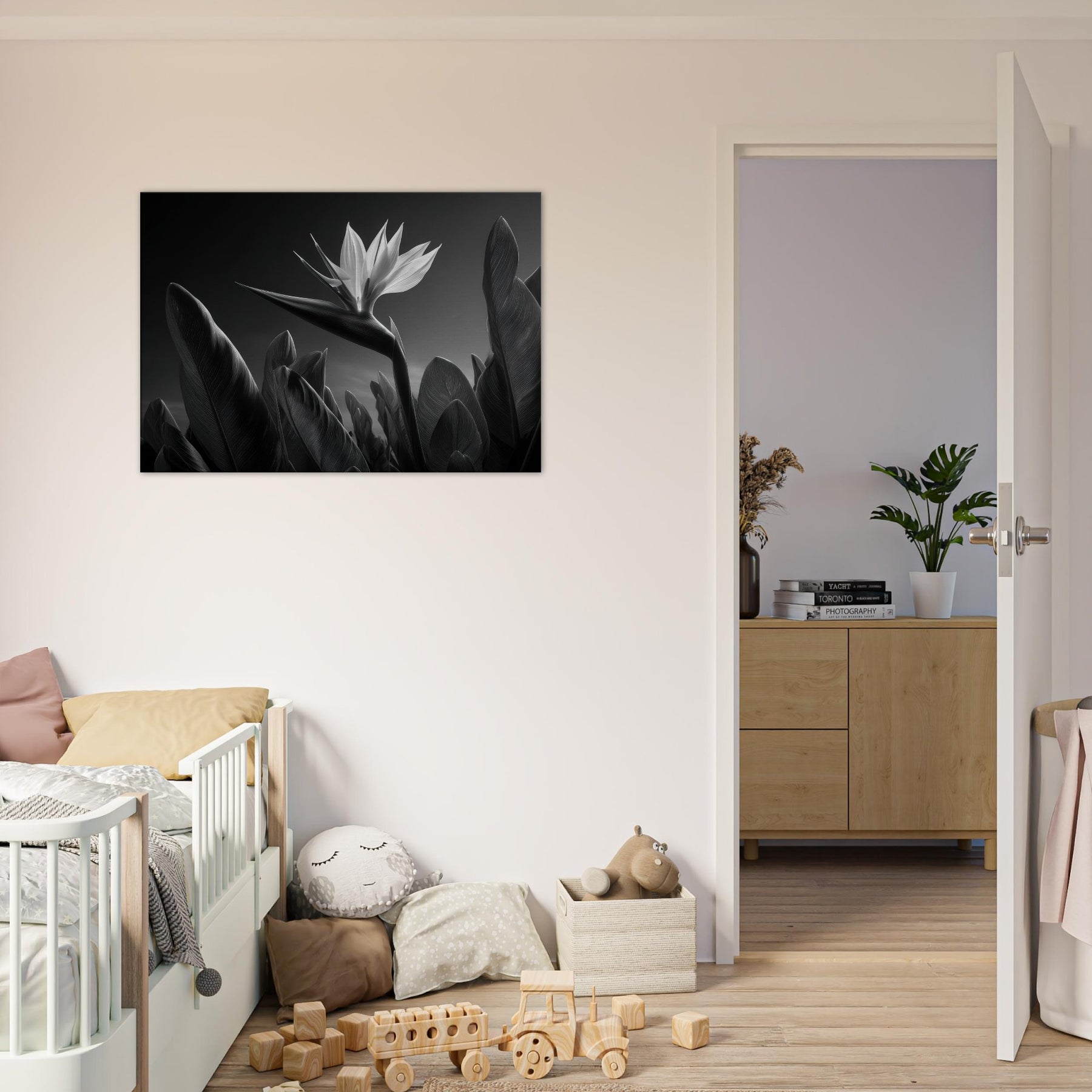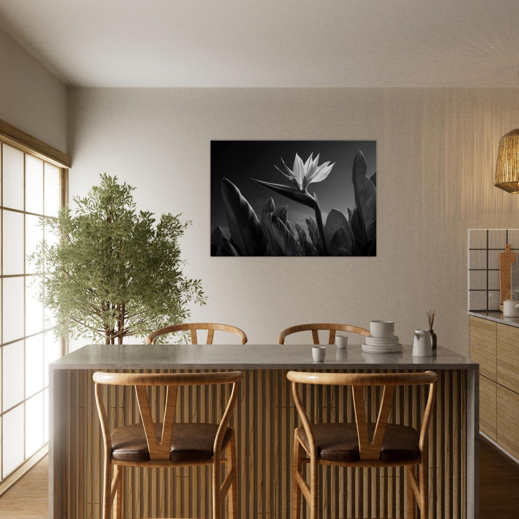 Capture a quiet drama with a lone Bird Of Paradise rising from shadowed foliage. This black and white study slows time, inviting contemplation as light traces the feathered edges and the soft curves of the leaves. Ideal for a serene living room or refined hall, it brings balance and atmosphere to walls, turning them into a calm stage. The Bird Of Paradise, rendered in stark contrast, becomes a timeless focal whisper in any modern interior.