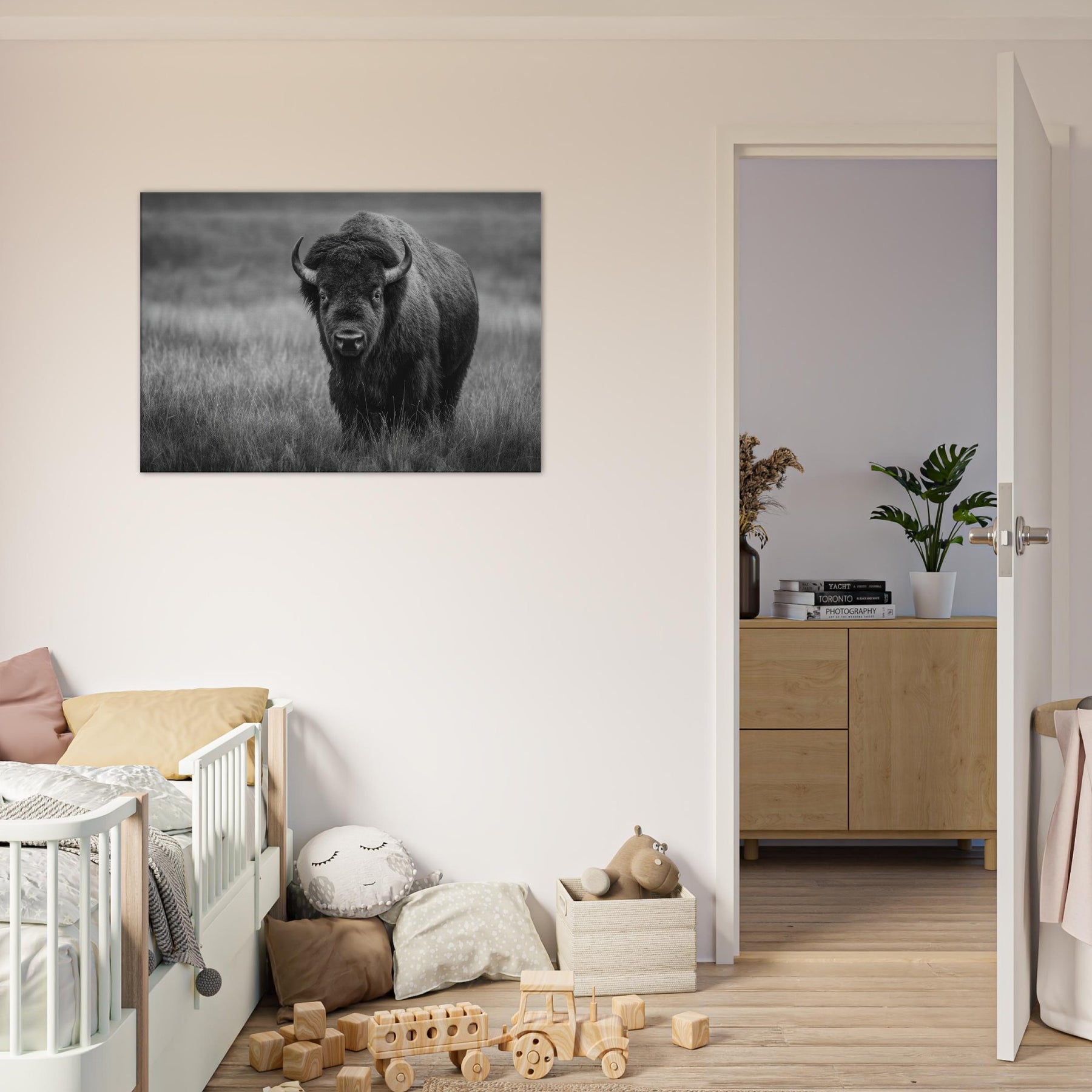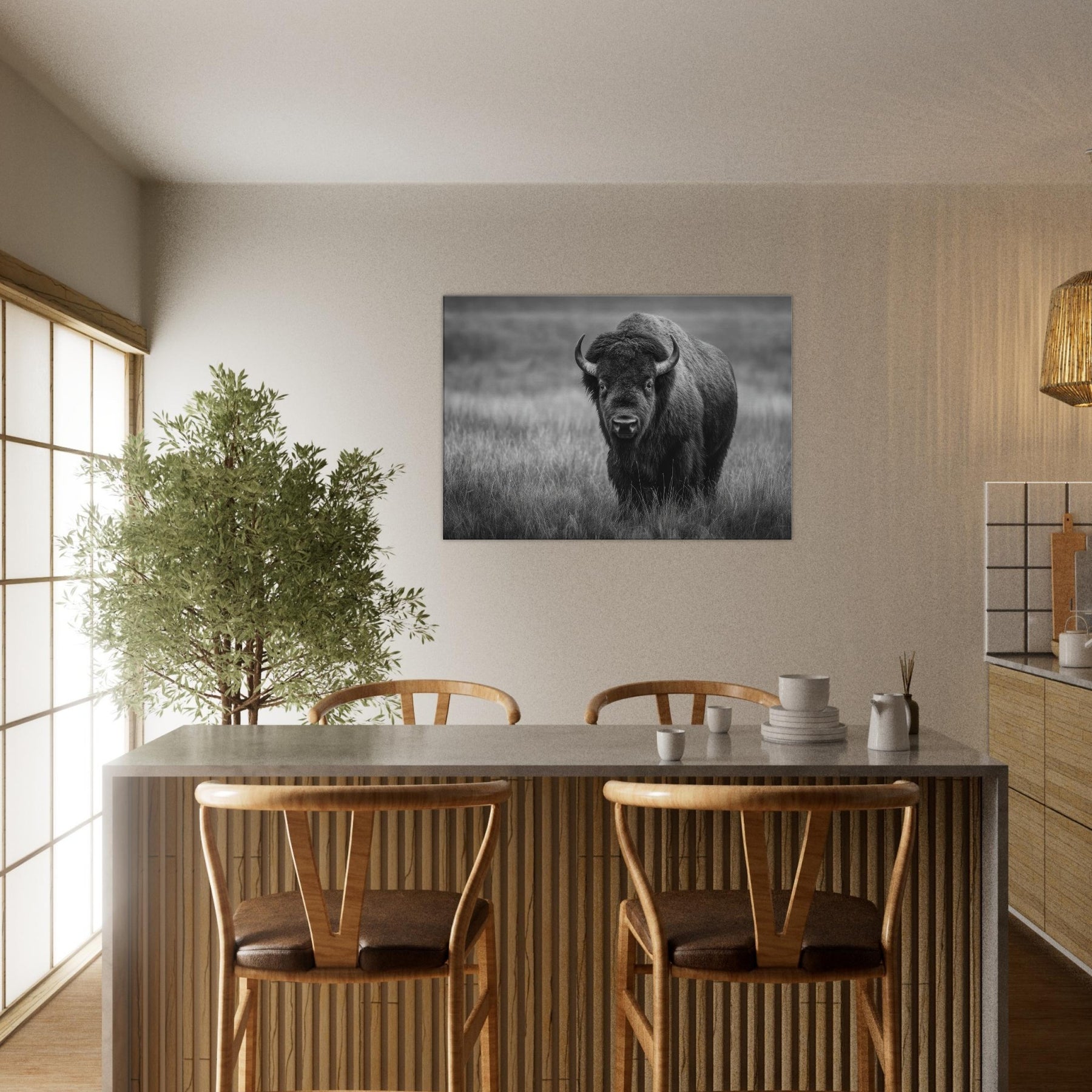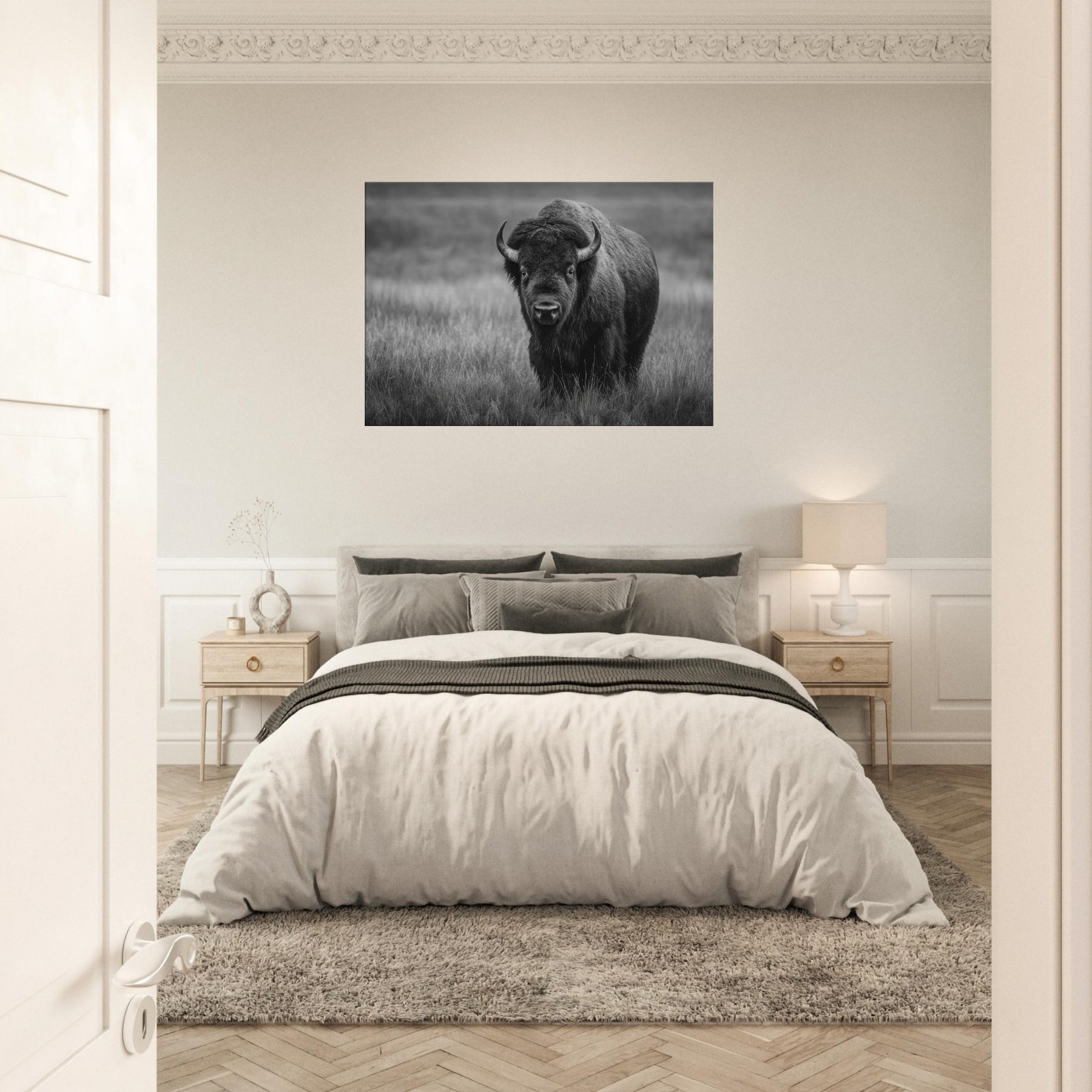 Bold and intimate, this black and white captures the Bison as a quiet force in the meadow. The monochrome tonal range stages the creature's weighty presence, the shaggy coat catching the light, the curve of the horns, the still gaze that seems to listen to the wind. Hang it in a living room or study to invite calm, grounded energy; it pairs with warm woods and minimal furnishings, turning your space into a sanctuary where memory and meet in silence.