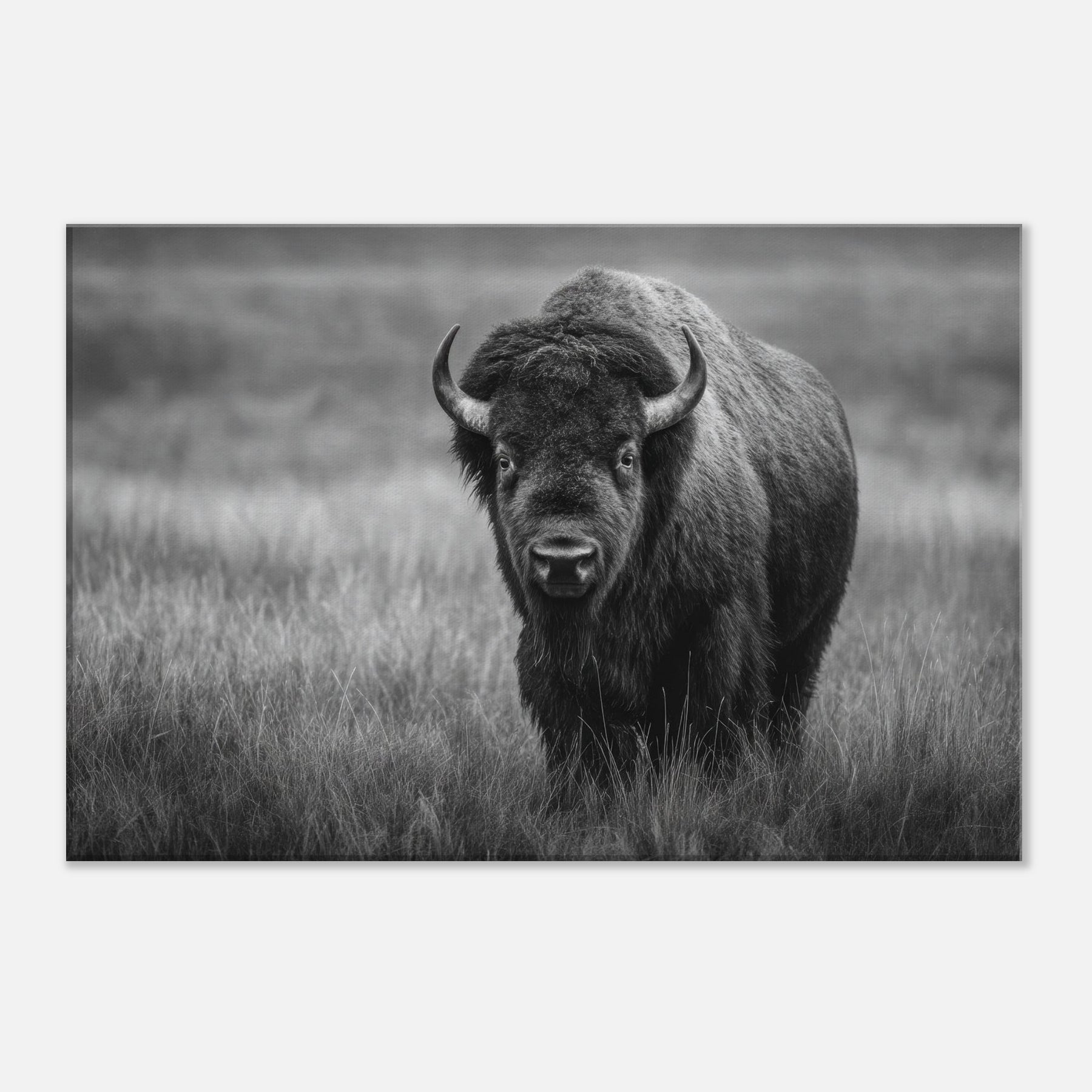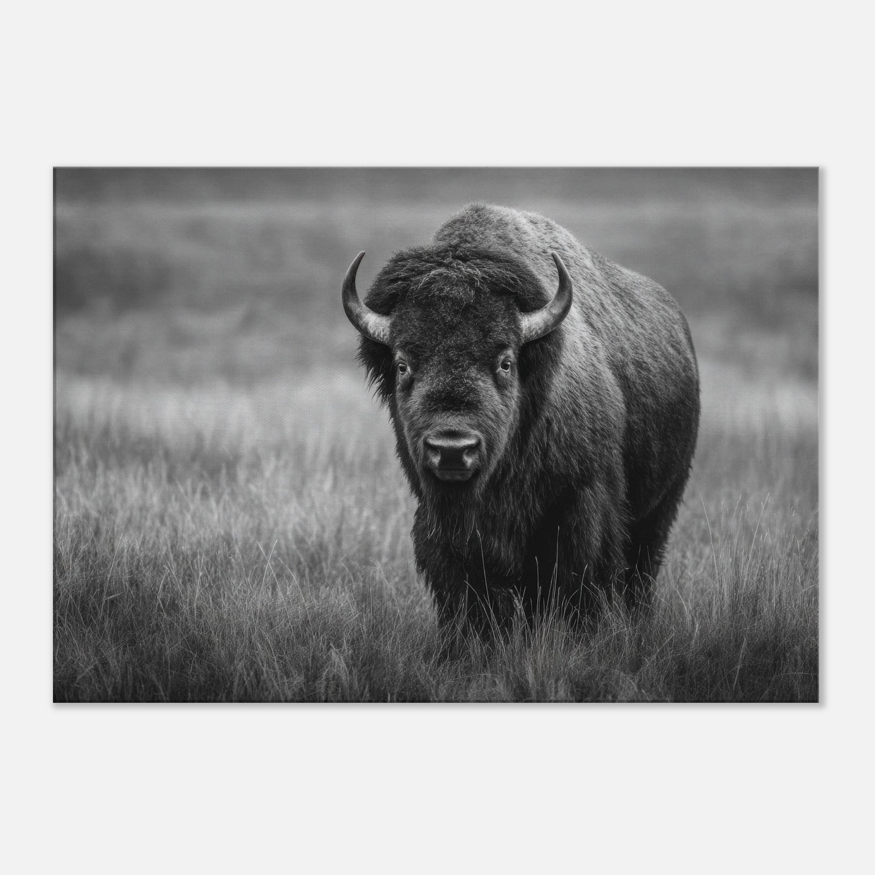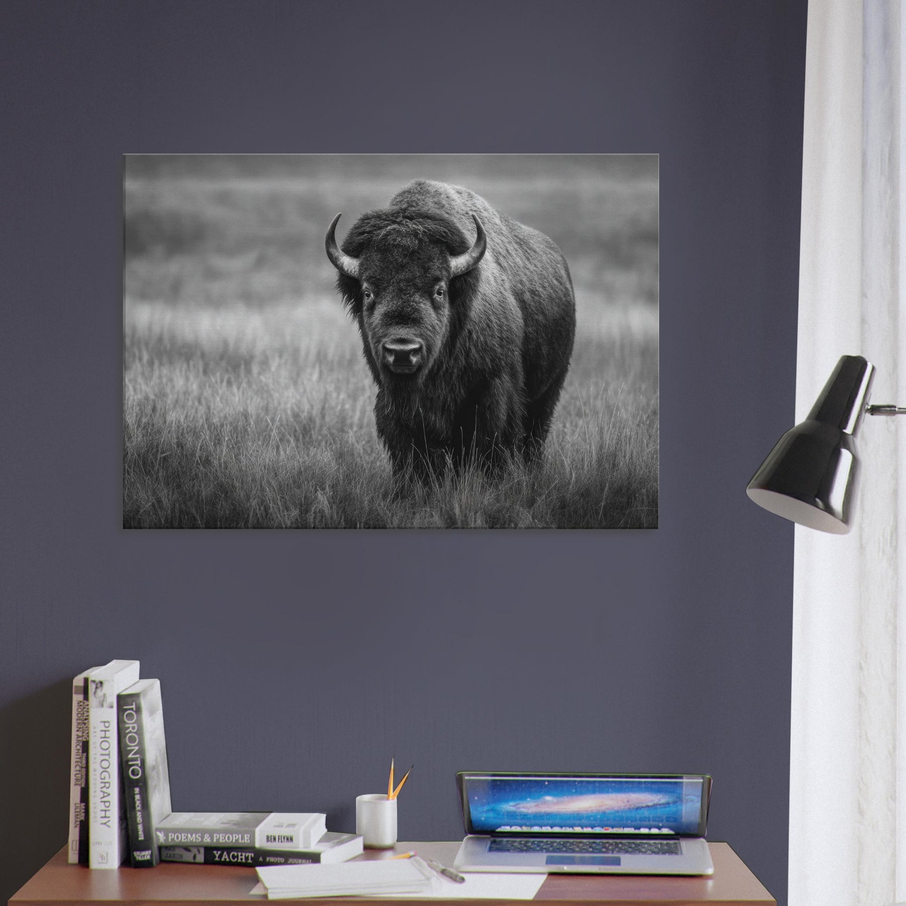 Bold and intimate, this black and white captures the Bison as a quiet force in the meadow. The monochrome tonal range stages the creature's weighty presence, the shaggy coat catching the light, the curve of the horns, the still gaze that seems to listen to the wind. Hang it in a living room or study to invite calm, grounded energy; it pairs with warm woods and minimal furnishings, turning your space into a sanctuary where memory and meet in silence.