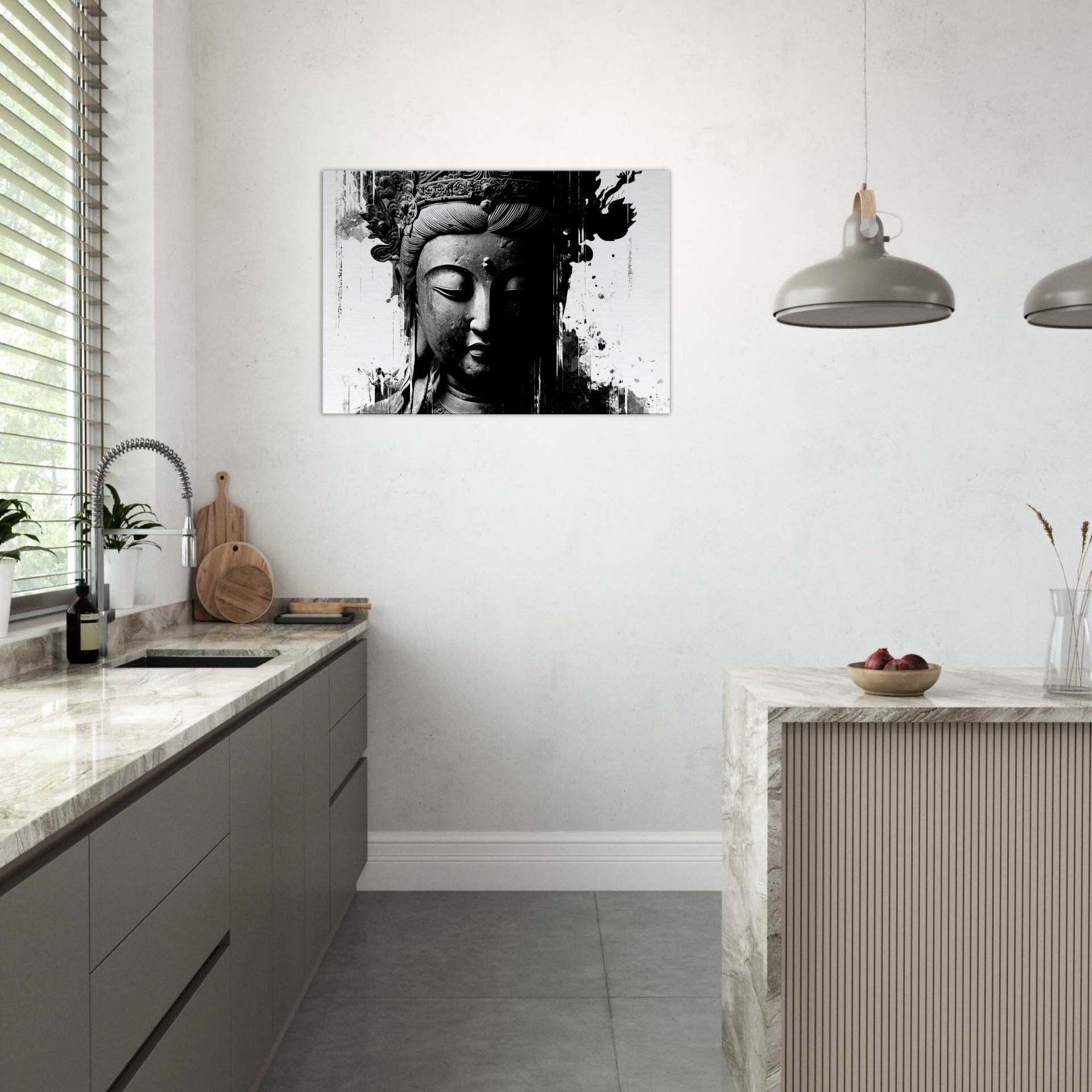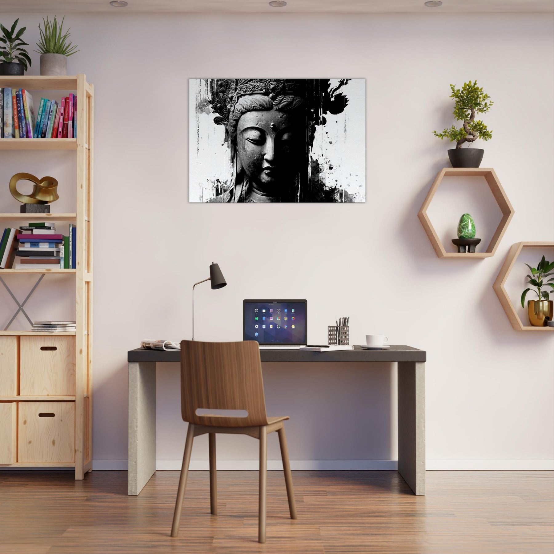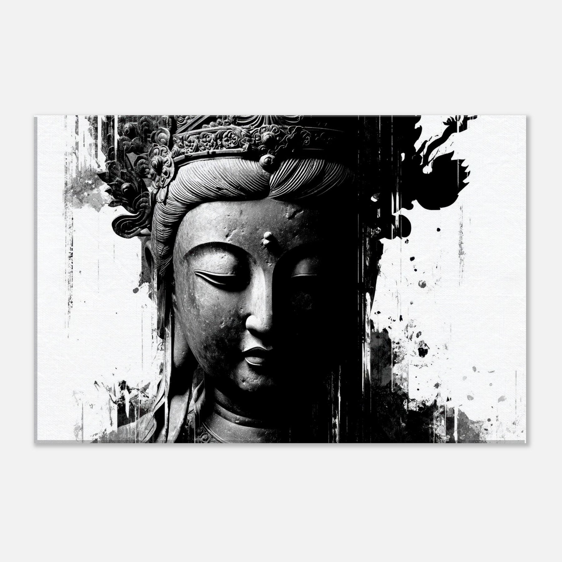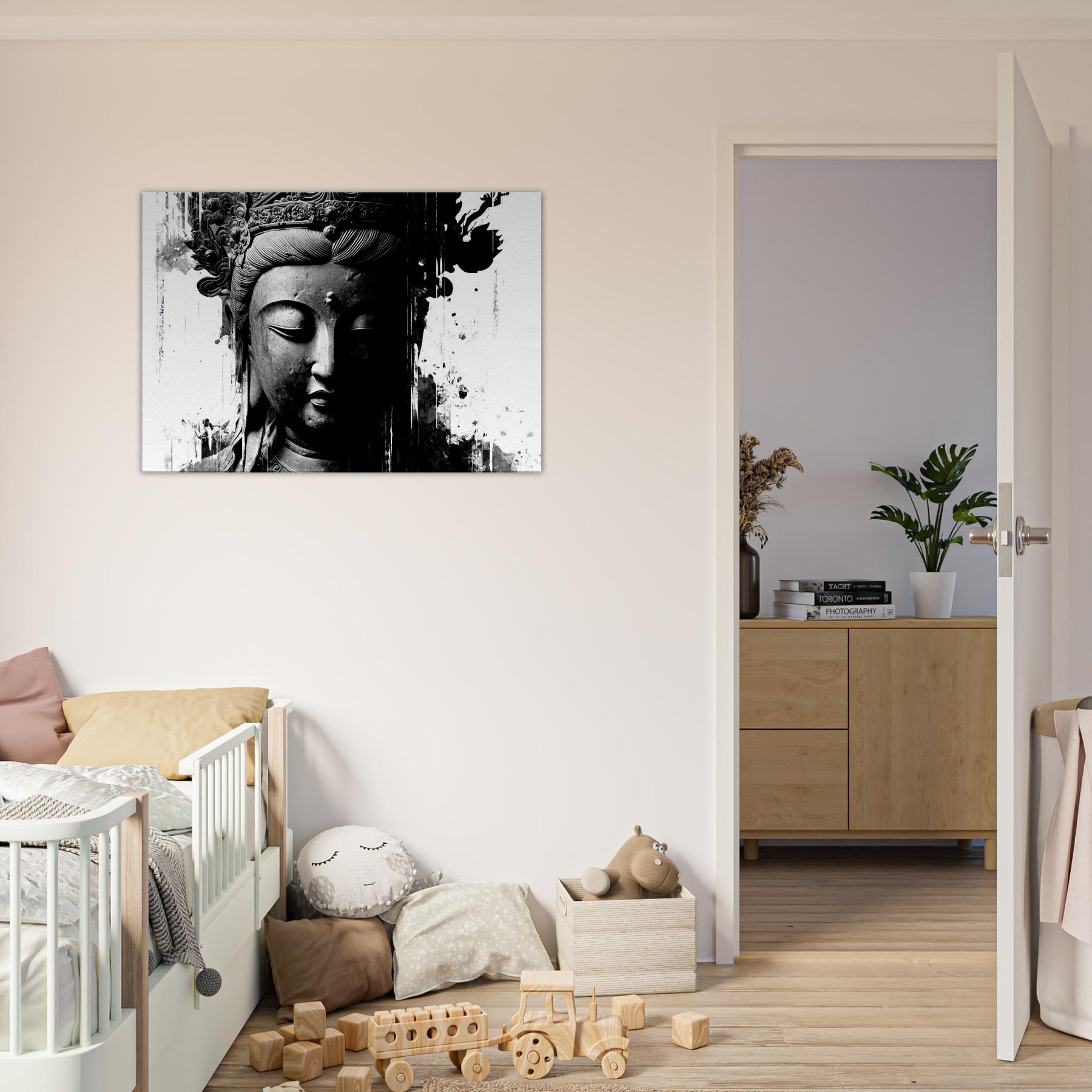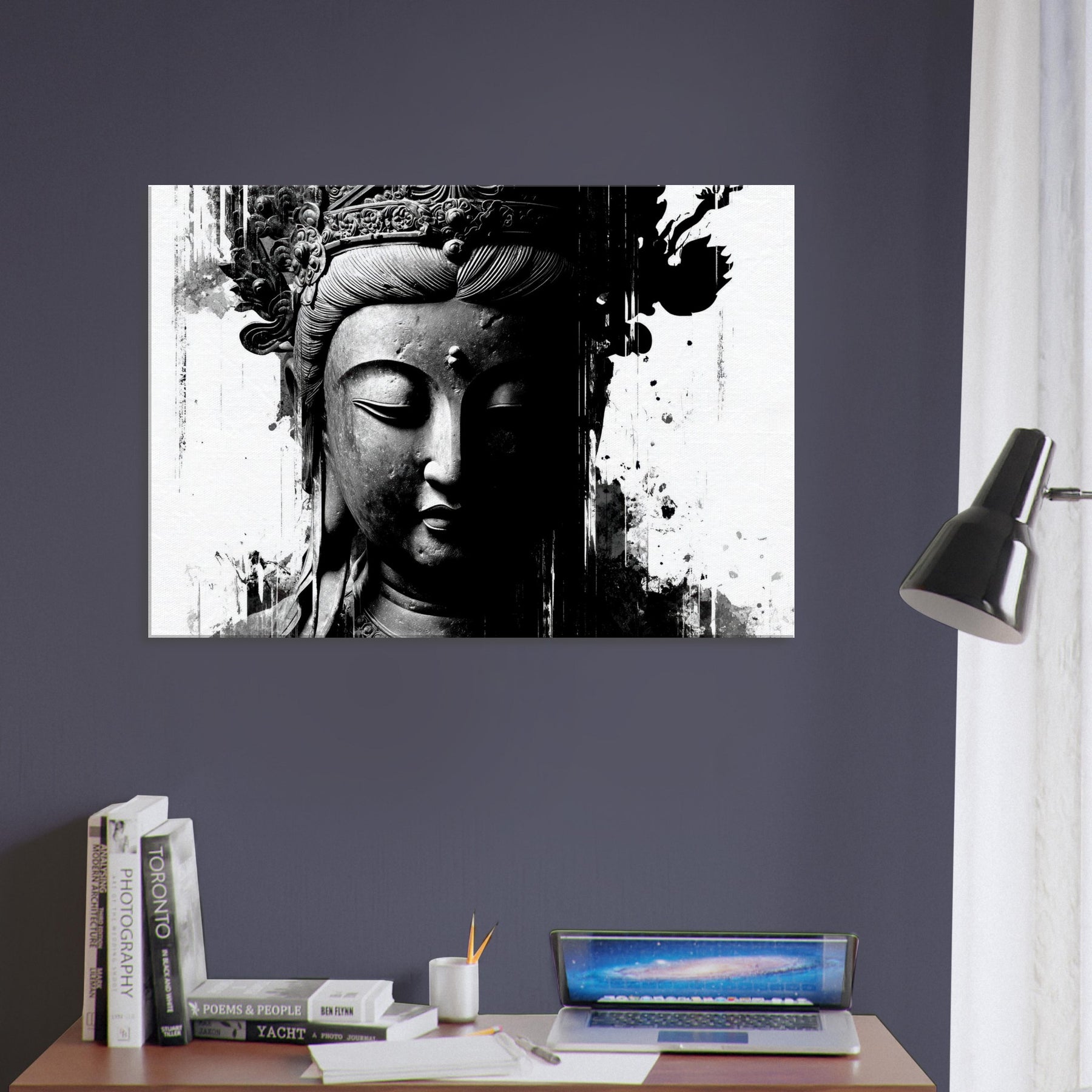 Immerse your space in hushed reverence with Kuan Yin (Guanyin) rendered in stark black and white. The serene visage, crowned and contemplative, invites a slow breath, as if the room itself softens around the edges. This mystical channels quiet strength, turning a wall into a meditative window. Hang it in a living room or study to subtly elevate ambiance, encouraging mindfulness, balance, and a sense of timeless grace.
