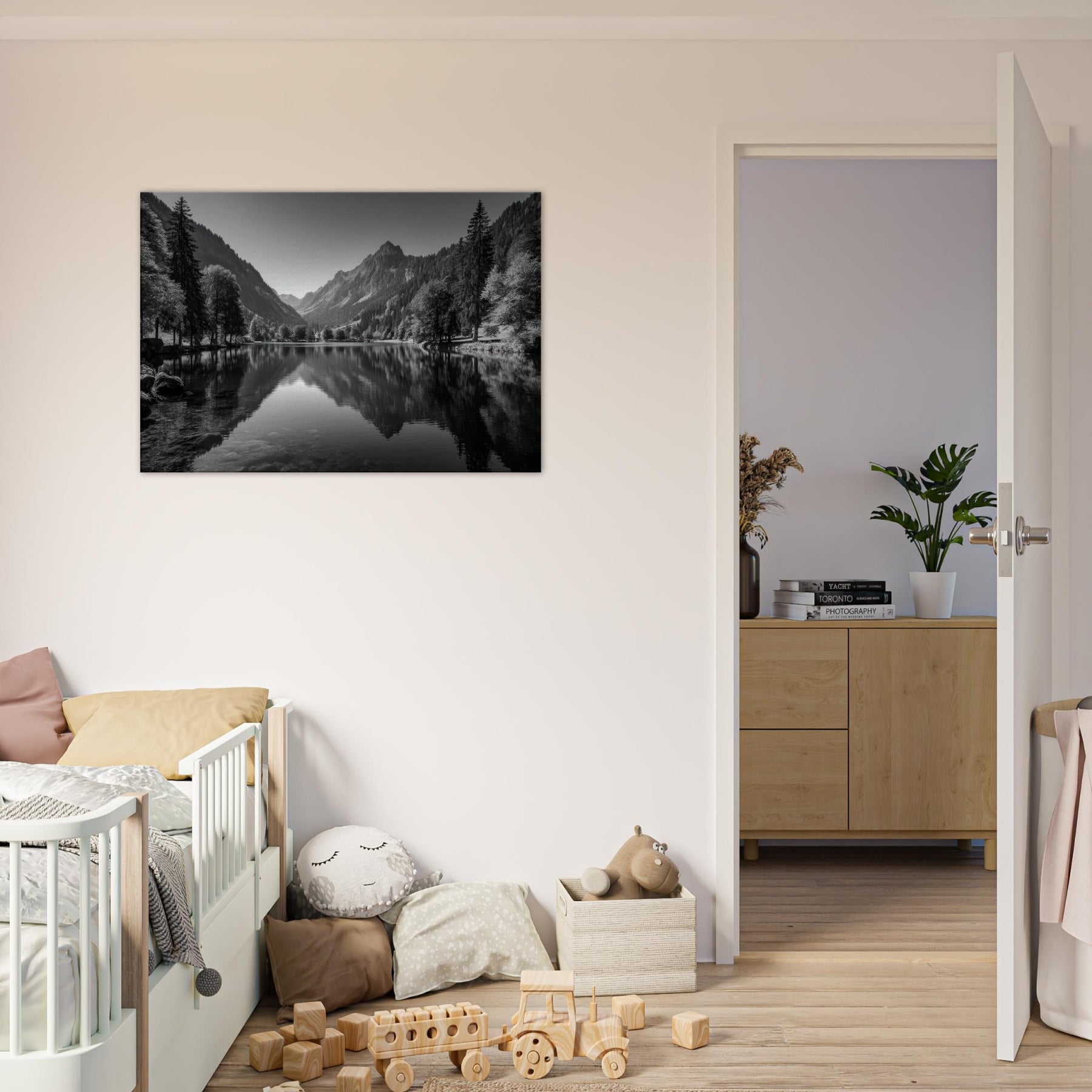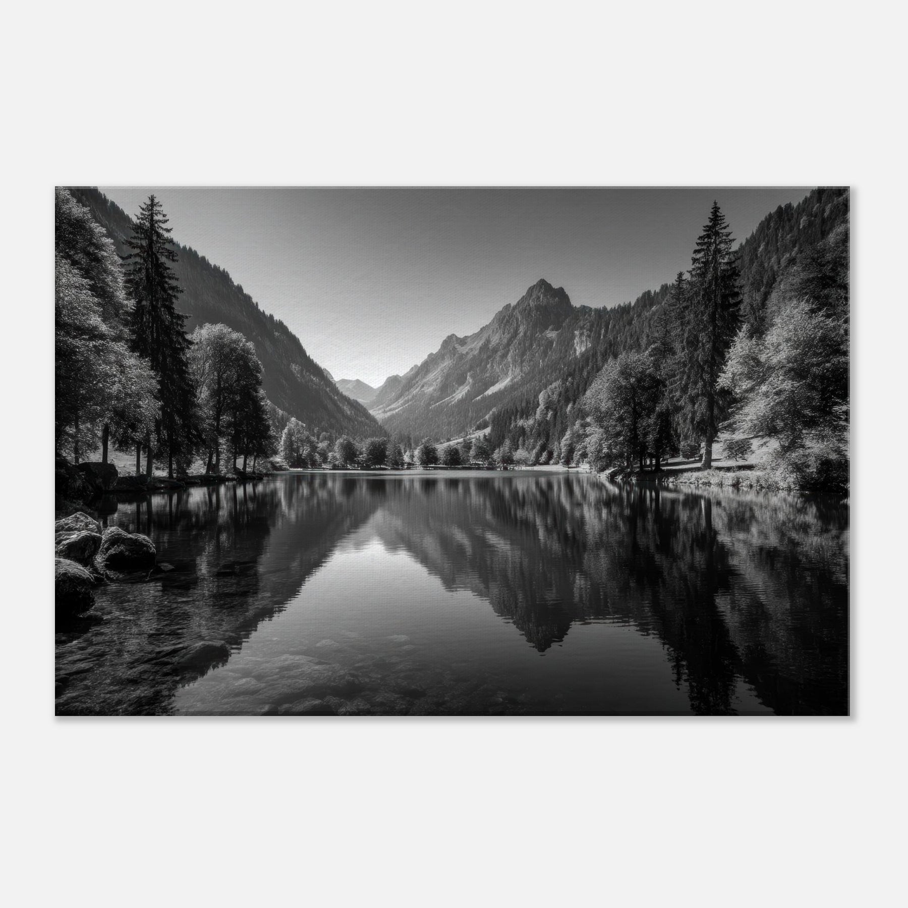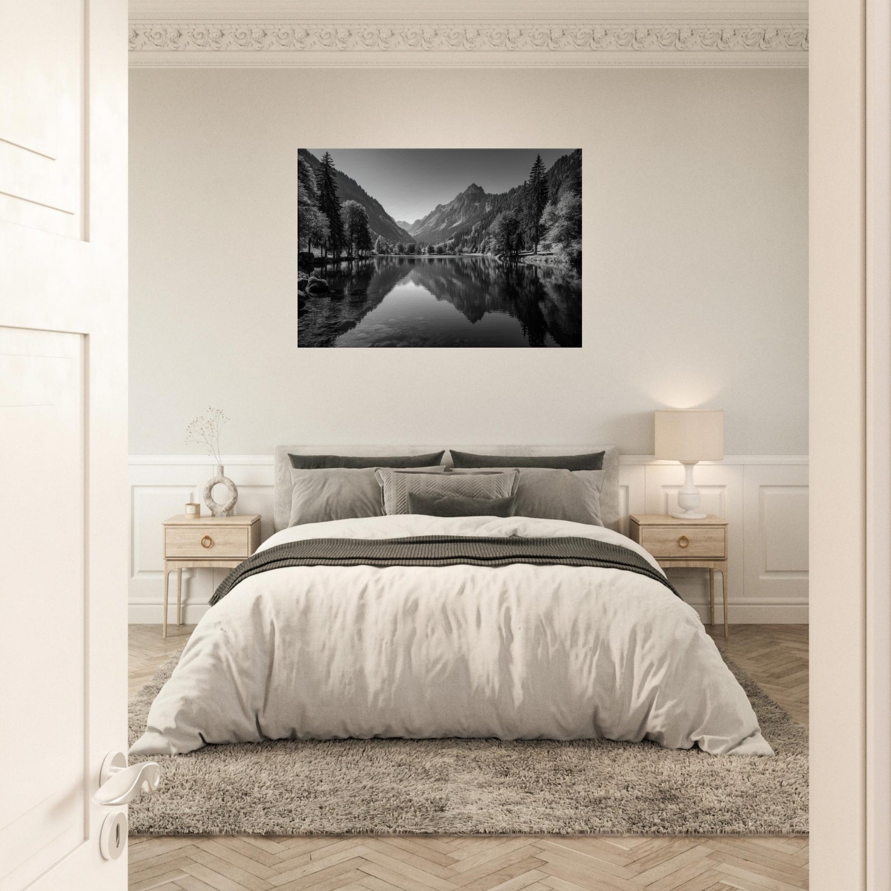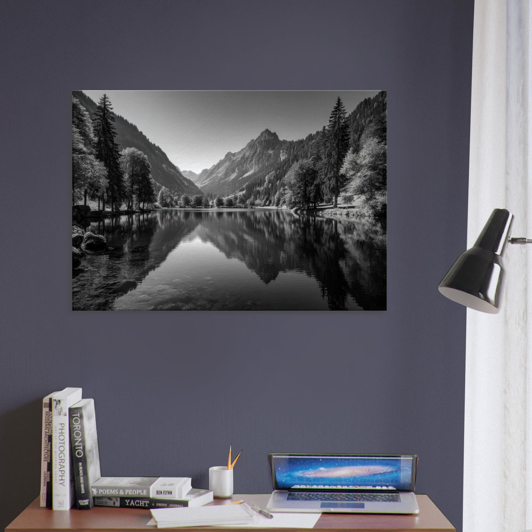In this black and white scene, the lake lays calm like a mirror to the surrounding pines and jagged mountains. The hush of water and the soft ripples invite quiet contemplation, turning any room into a sanctuary of clarity and balance. The Primary Subject Lake stands at the center, its still surface coaxing light to linger, inviting warm toned memories while the monochrome palette heightens texture: stone, foliage, and wind swept mountain peaks. Hang this piece to invite serenity, depth, and a touch of nature's grandeur.