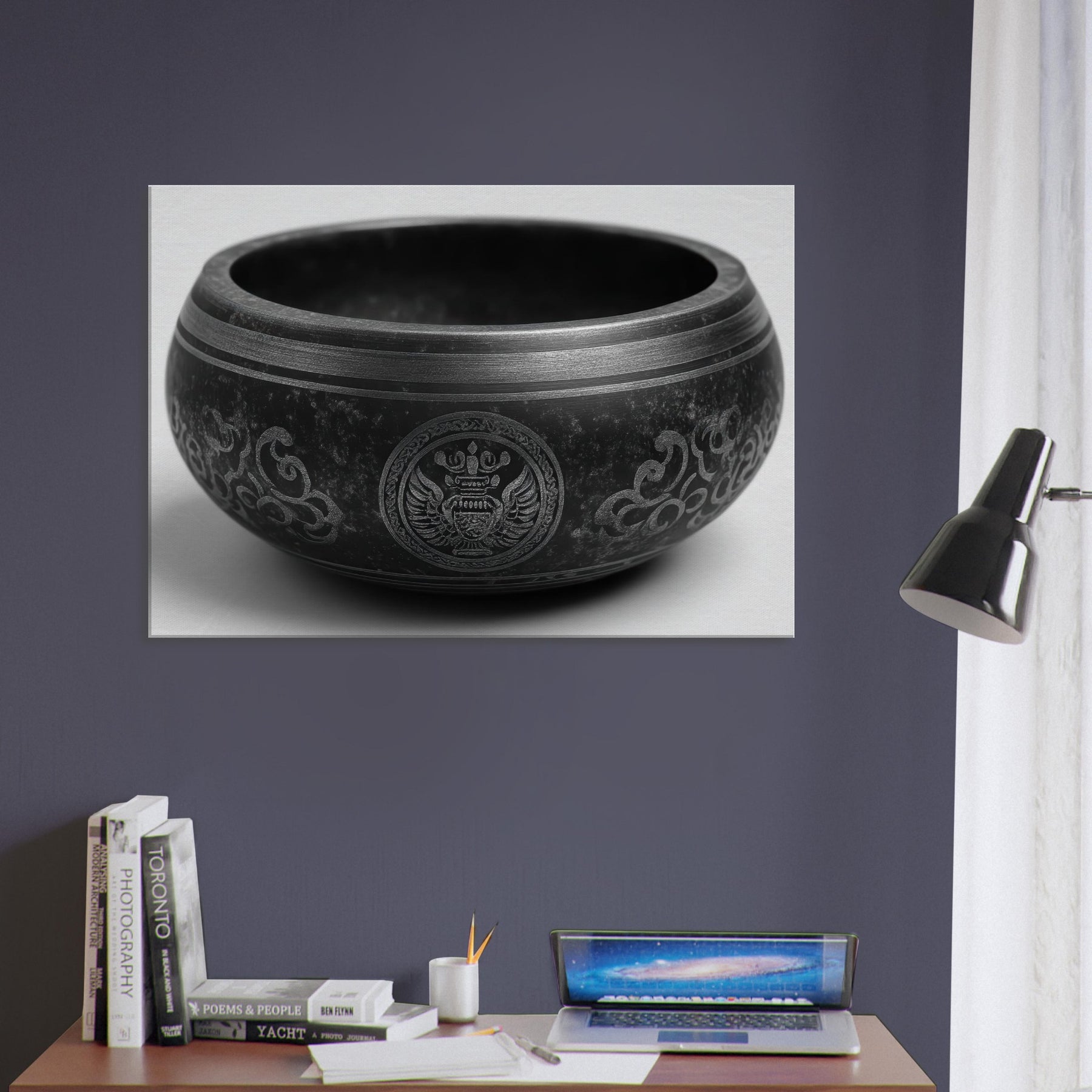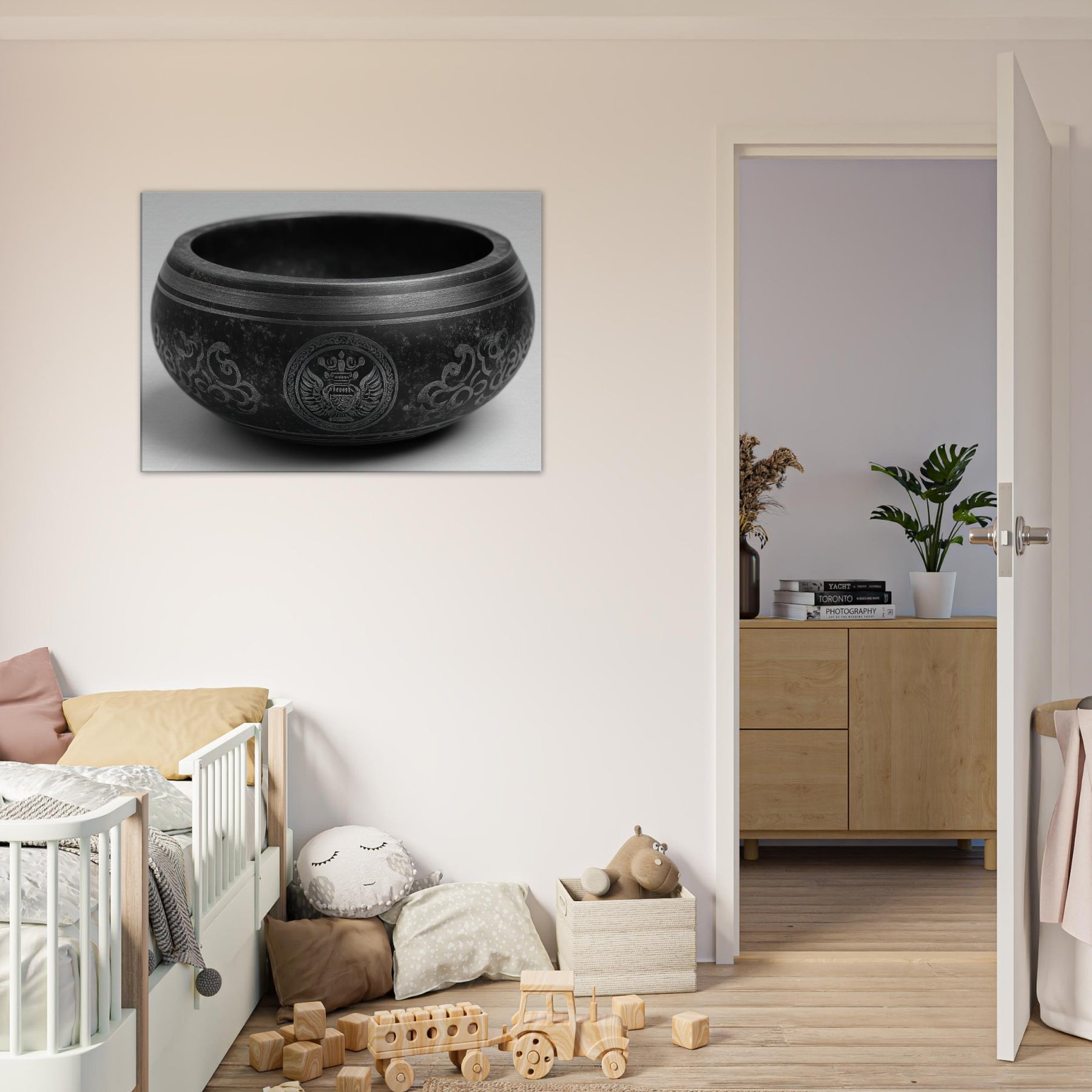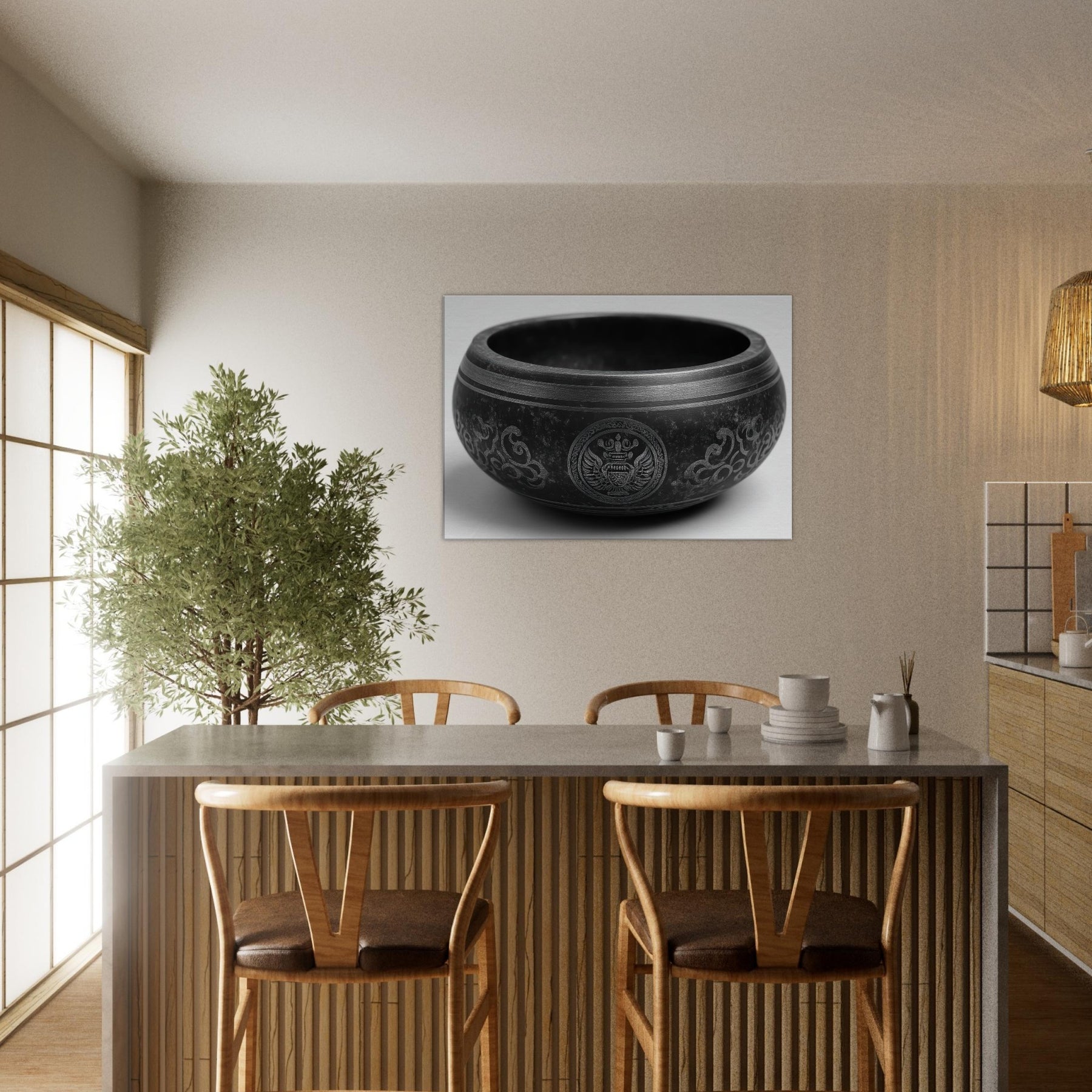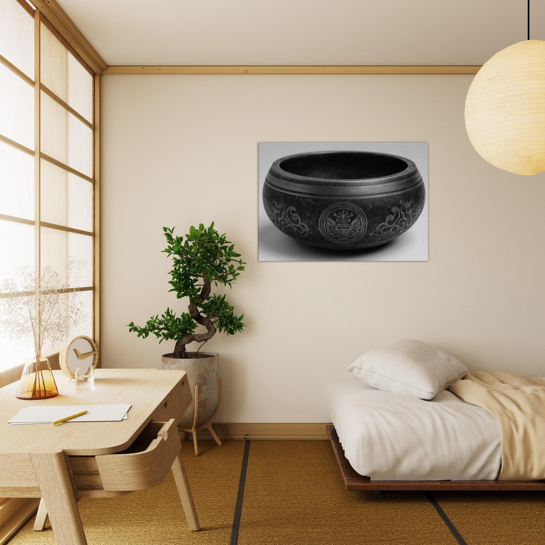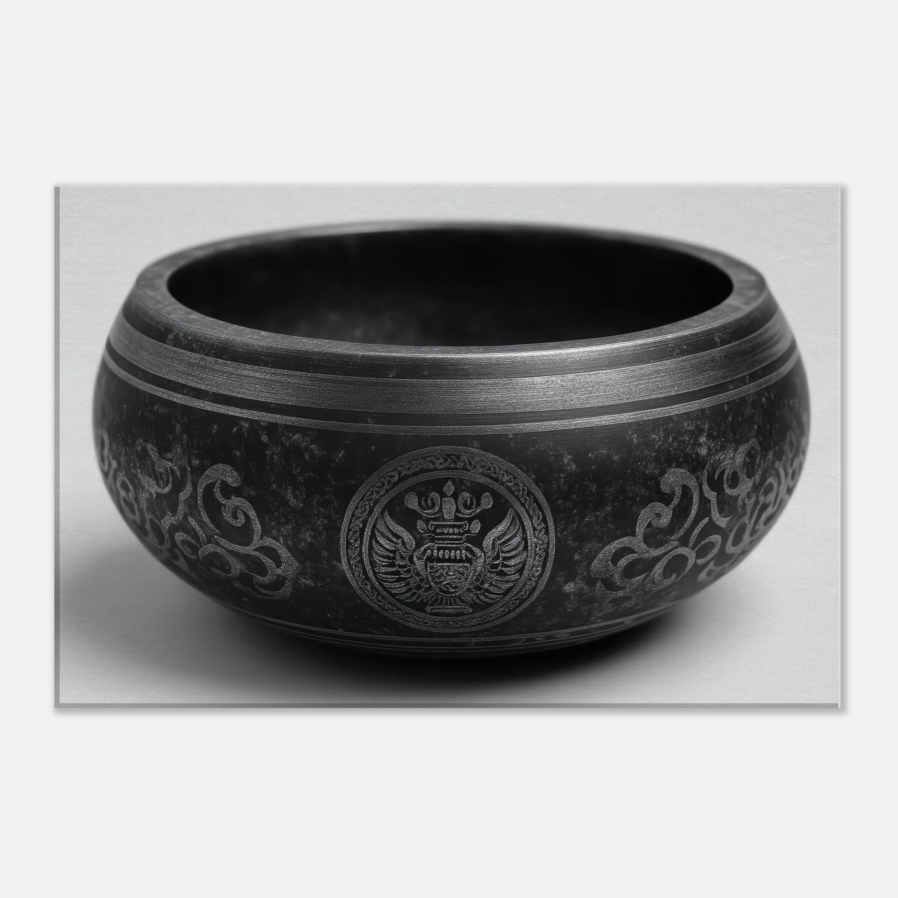 A mystical, monochrome study of a Singing Bowl rendered in black and white, this piece exudes quiet resonance. The sweeping curves and engraved motifs drift across the surface like a nocturnal chant, inviting stillness and contemplation. Hang it where soft light can kiss the silvered bands, and let the bowl’s solemn glow slow the room’s pace, turning a modern living space into a sanctuary of breath, rhythm, and reverent mood.
