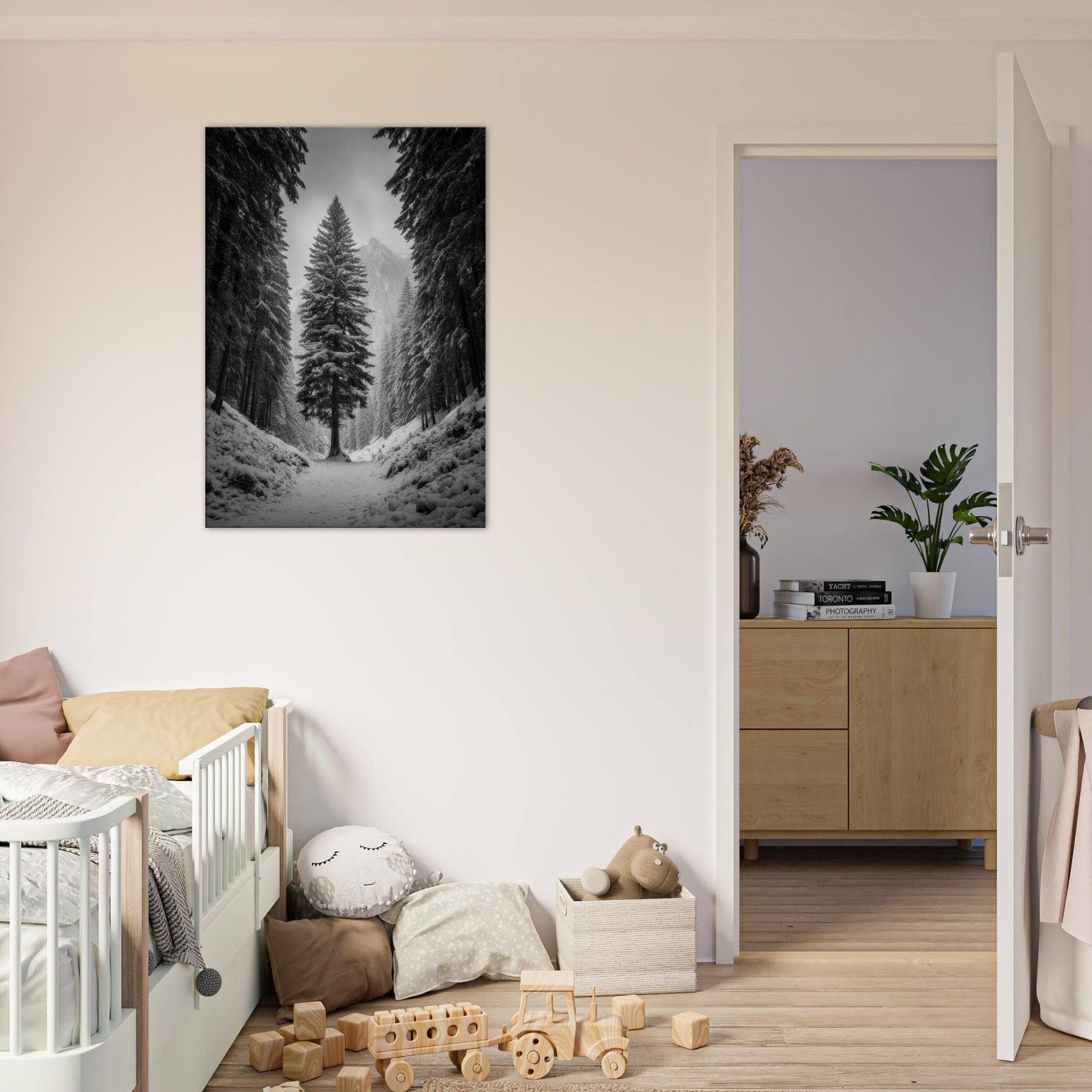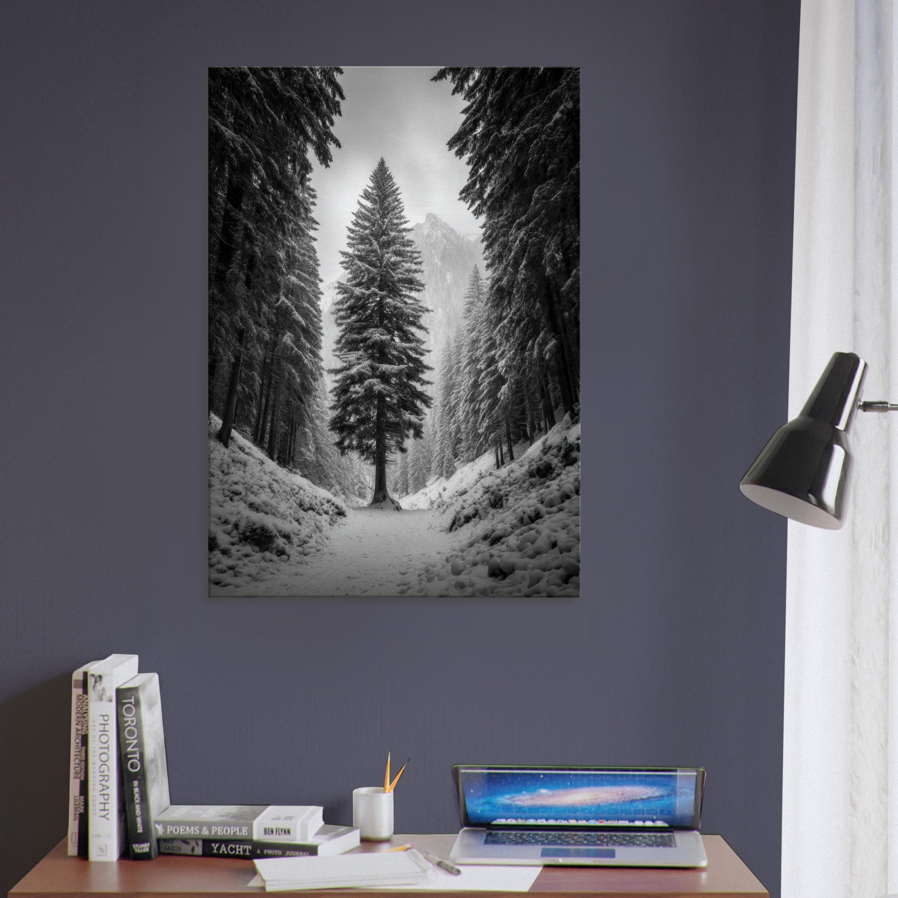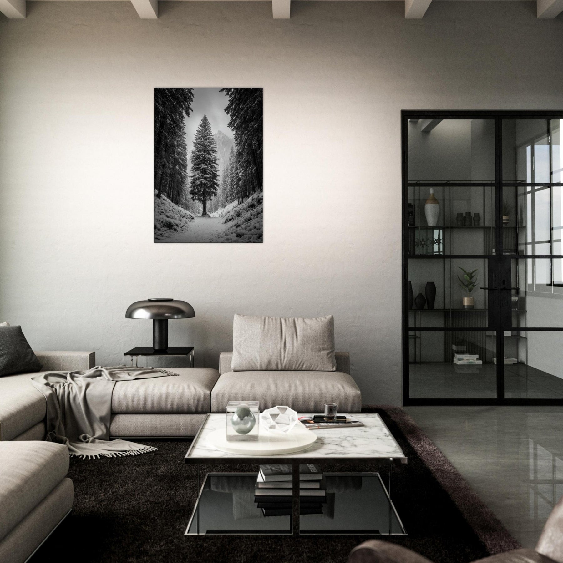 Step into a tranquil winter corridor where a lone tree stands timeless amidst towering pines. The Snowy Forest unfolds in monochrome, every branch dusted with frost, the air almost audible with quiet. This scene invites calm, a living room breathing space that slows time and gathers gentle light. Hang it to anchor a seating area with texture and depth, letting the stark contrast carve focus and mood. A natural escape you can live with every day.