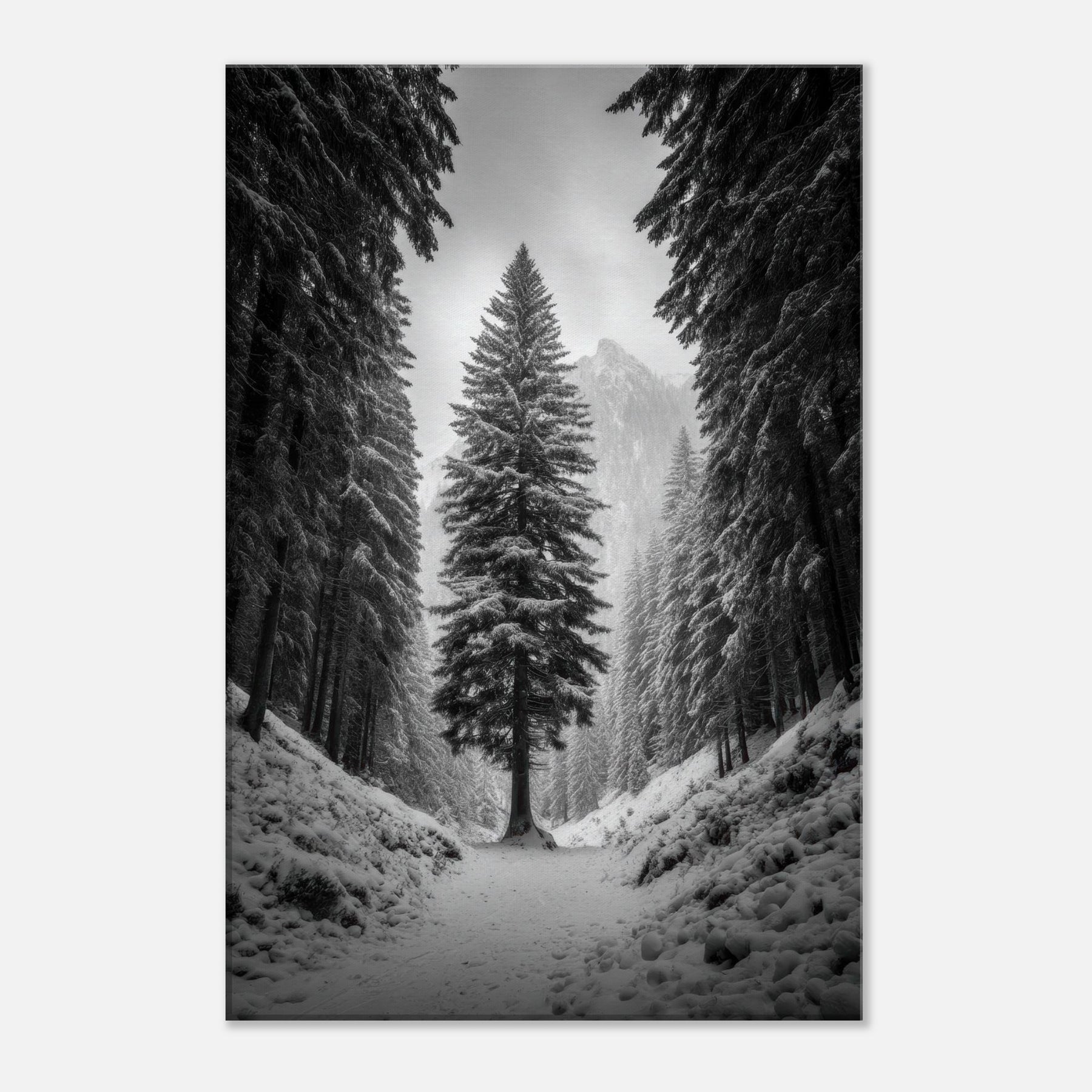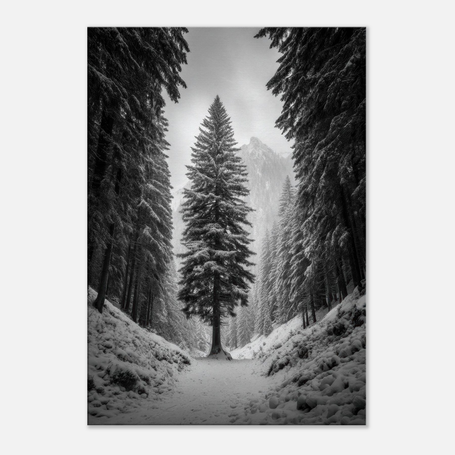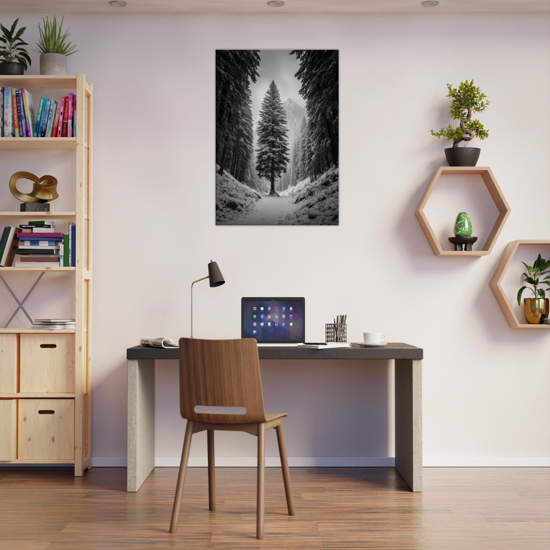 Step into a tranquil winter corridor where a lone tree stands timeless amidst towering pines. The Snowy Forest unfolds in monochrome, every branch dusted with frost, the air almost audible with quiet. This scene invites calm, a living room breathing space that slows time and gathers gentle light. Hang it to anchor a seating area with texture and depth, letting the stark contrast carve focus and mood. A natural escape you can live with every day.