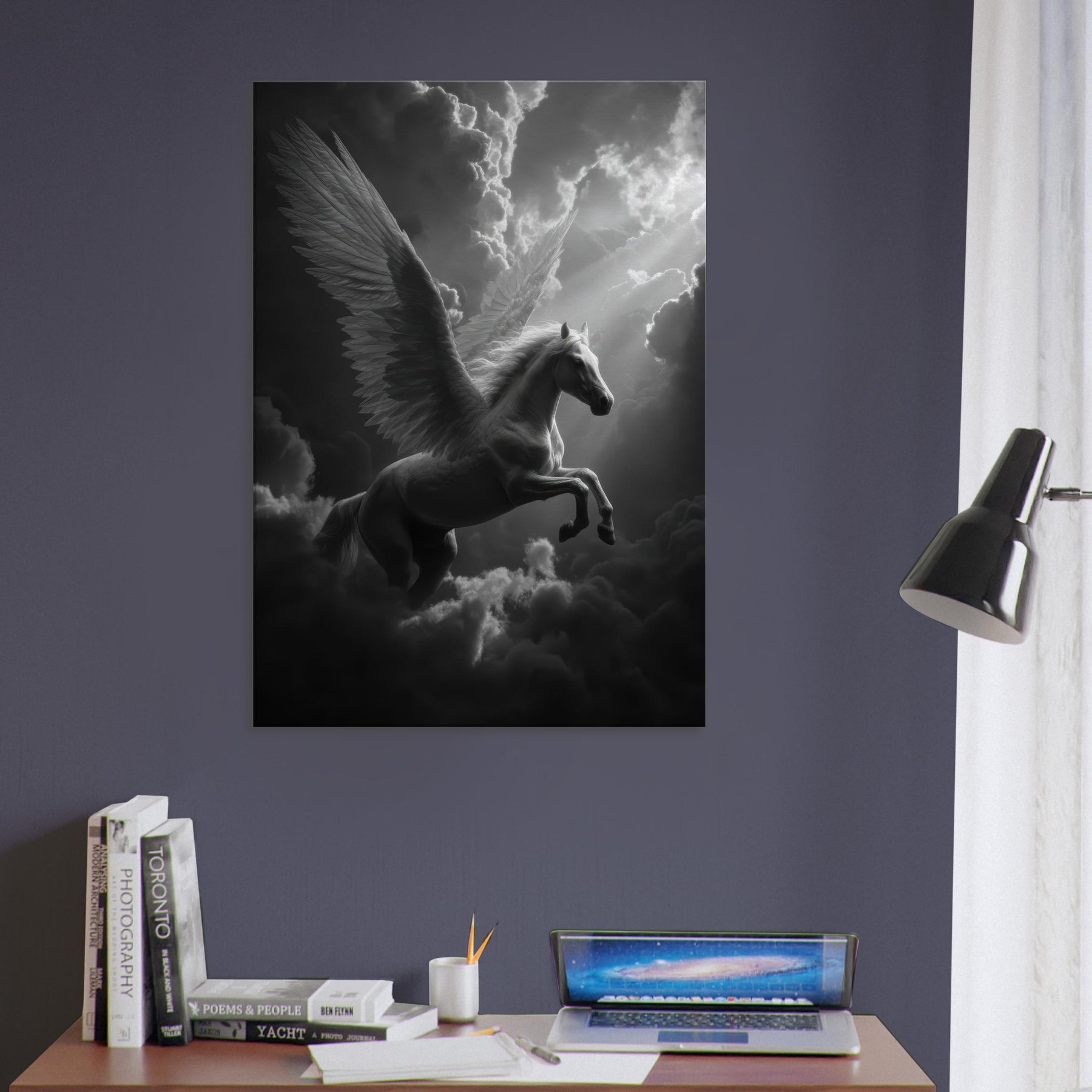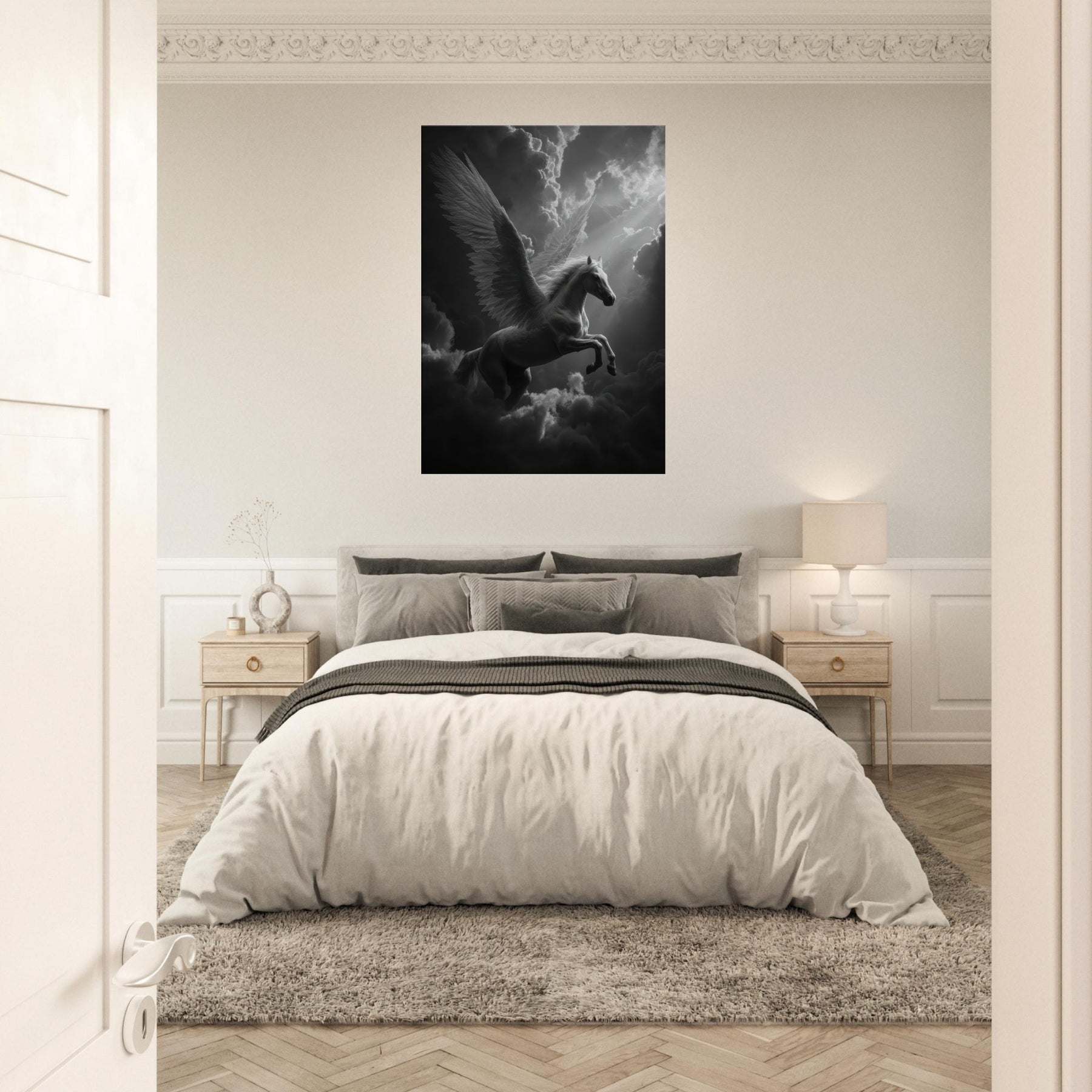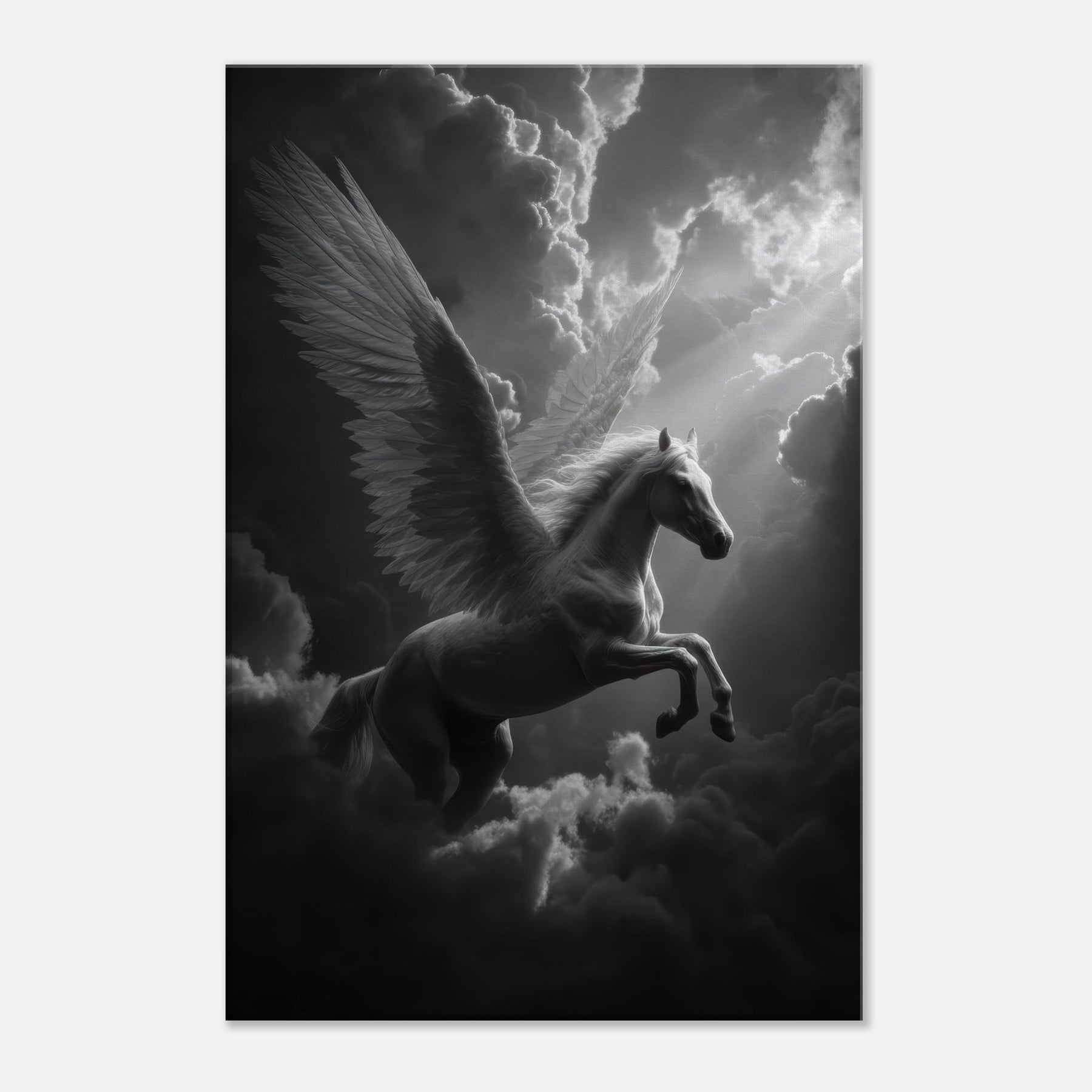 Immerse your space in a hush of light and shadow as the Celestial Pegasus flying through clouds glides across the frame. In black and white, every feather and muscle is etched with soft precision, turning movement into a still, luminous dream. This wall art adds a whisper of myth to a modern room, inviting quiet reflection and subtle drama; perfect above a sofa, in a study, or beside a bed where imagination takes flight.