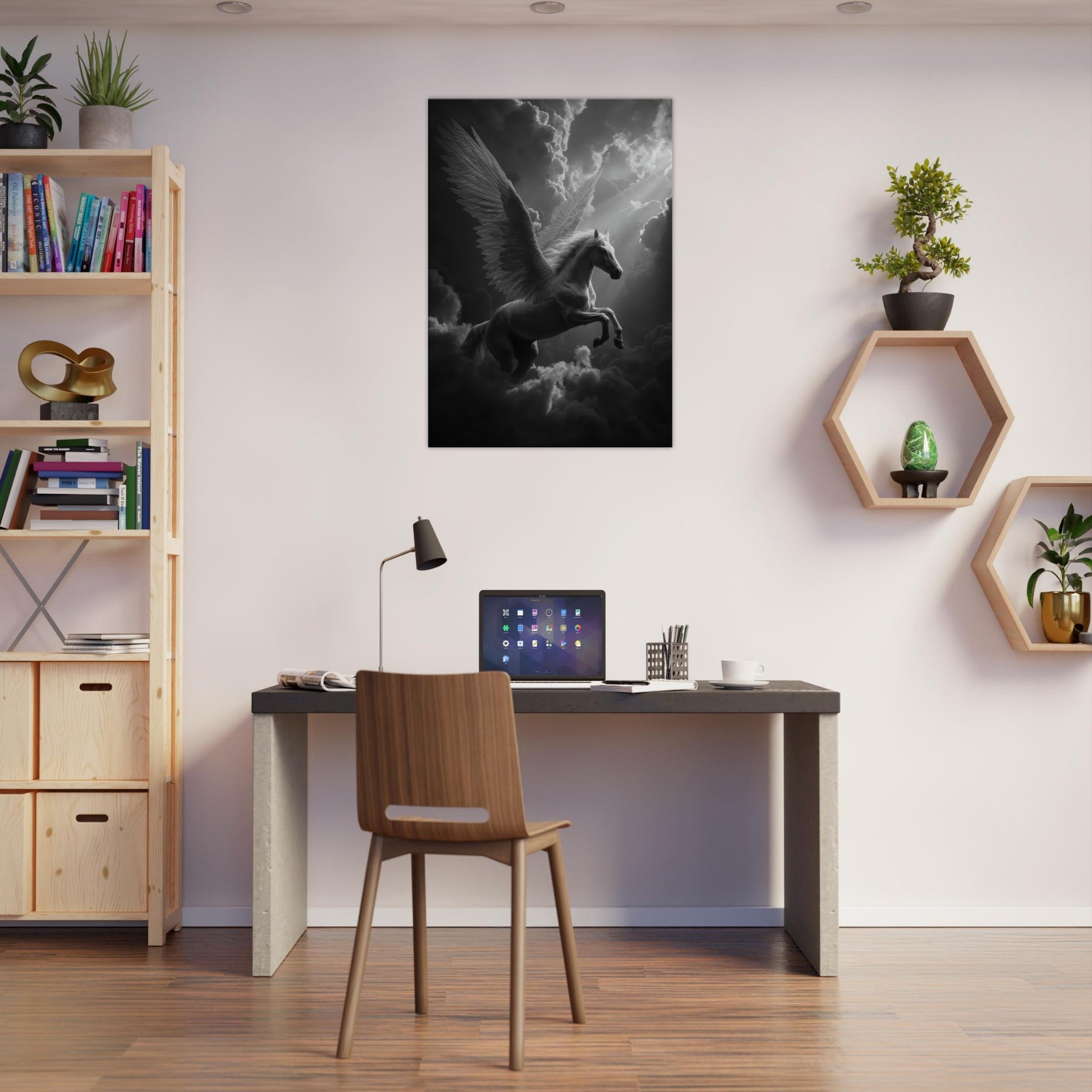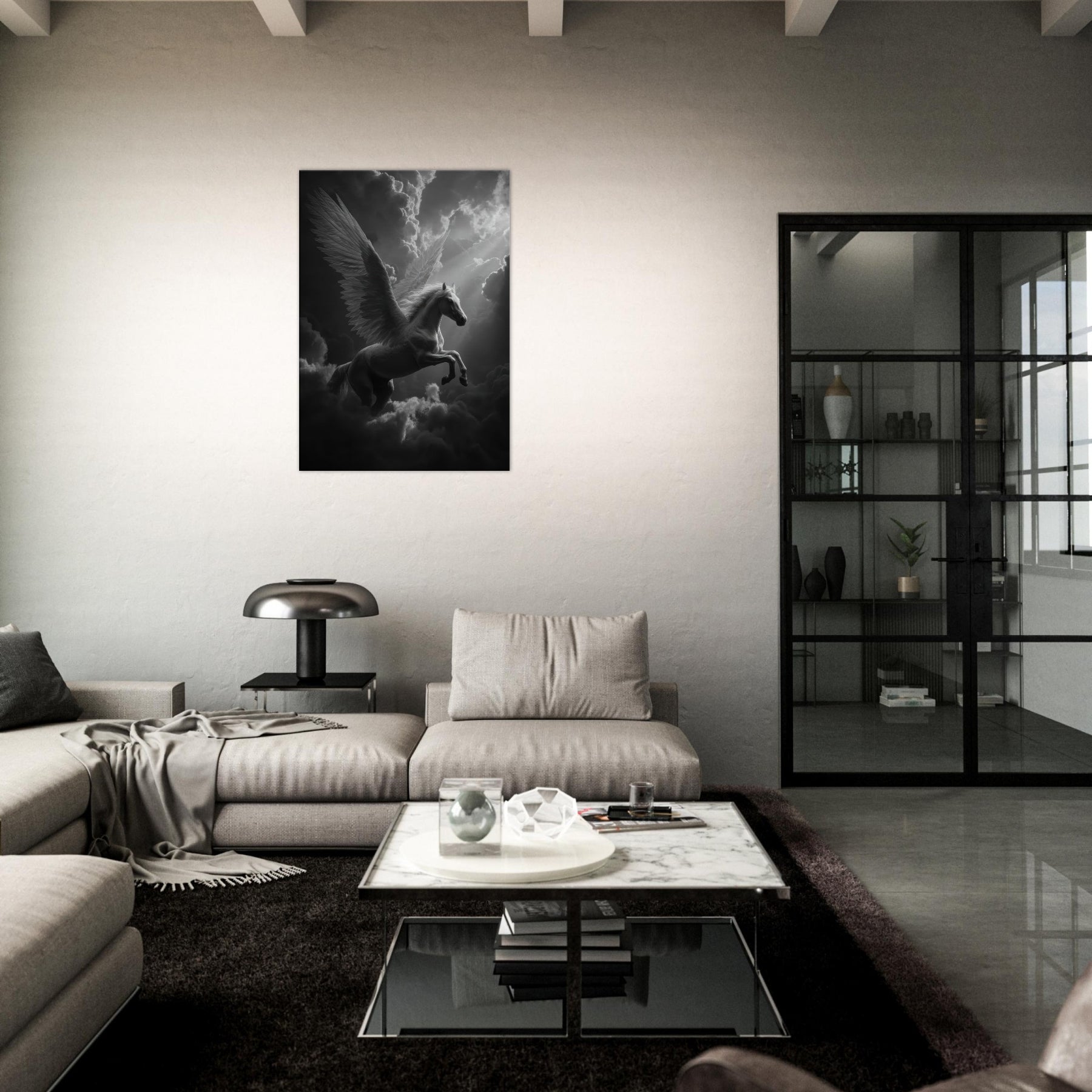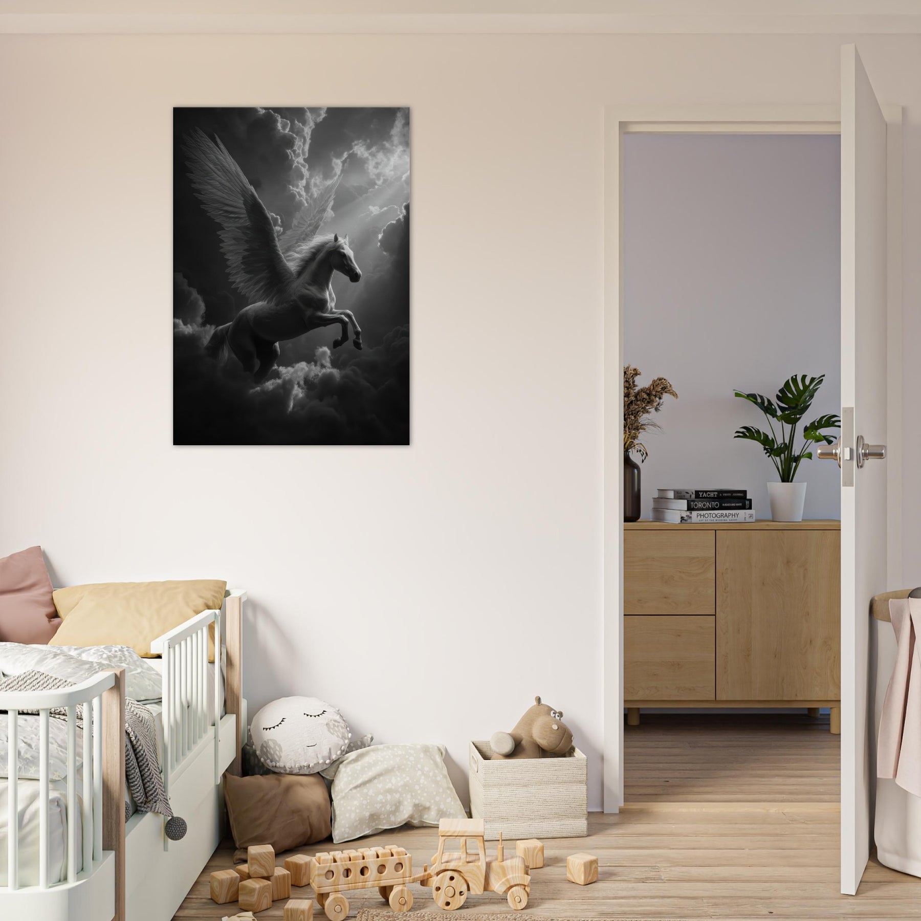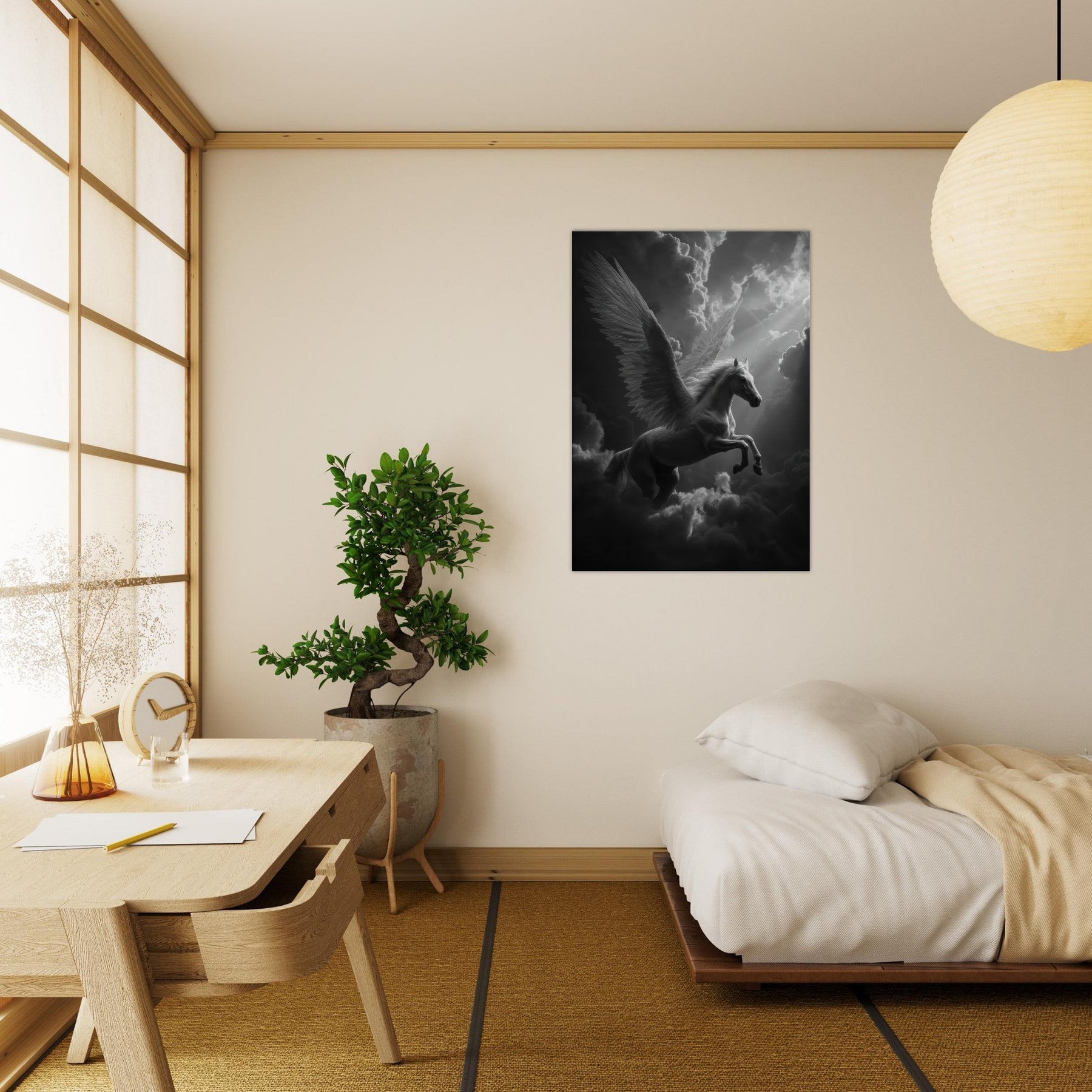 Immerse your space in a hush of light and shadow as the Celestial Pegasus flying through clouds glides across the frame. In black and white, every feather and muscle is etched with soft precision, turning movement into a still, luminous dream. This wall art adds a whisper of myth to a modern room, inviting quiet reflection and subtle drama; perfect above a sofa, in a study, or beside a bed where imagination takes flight.