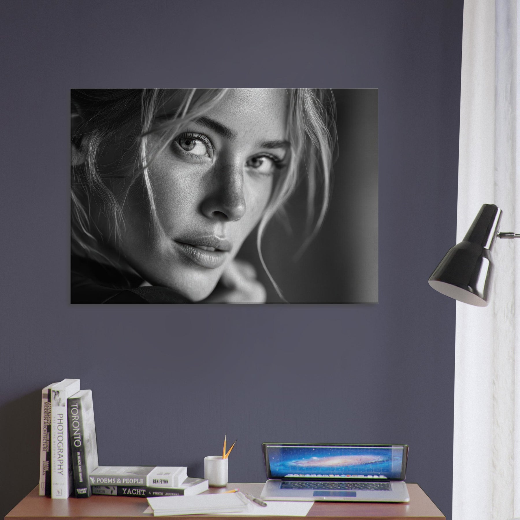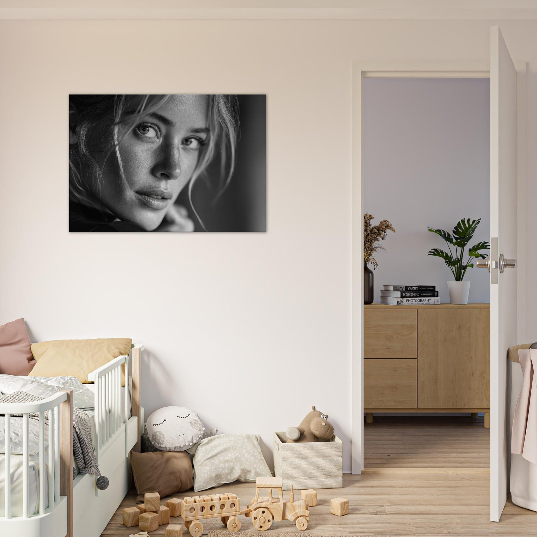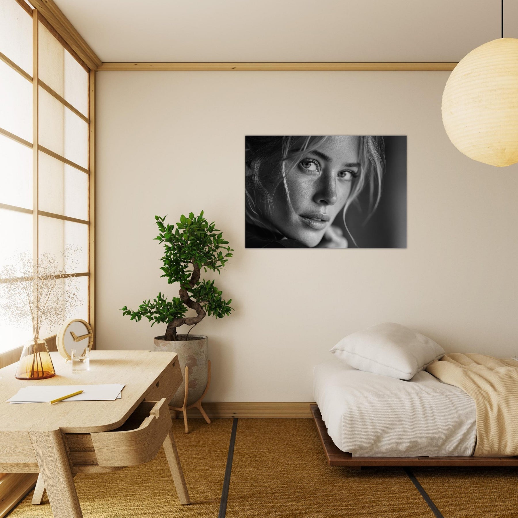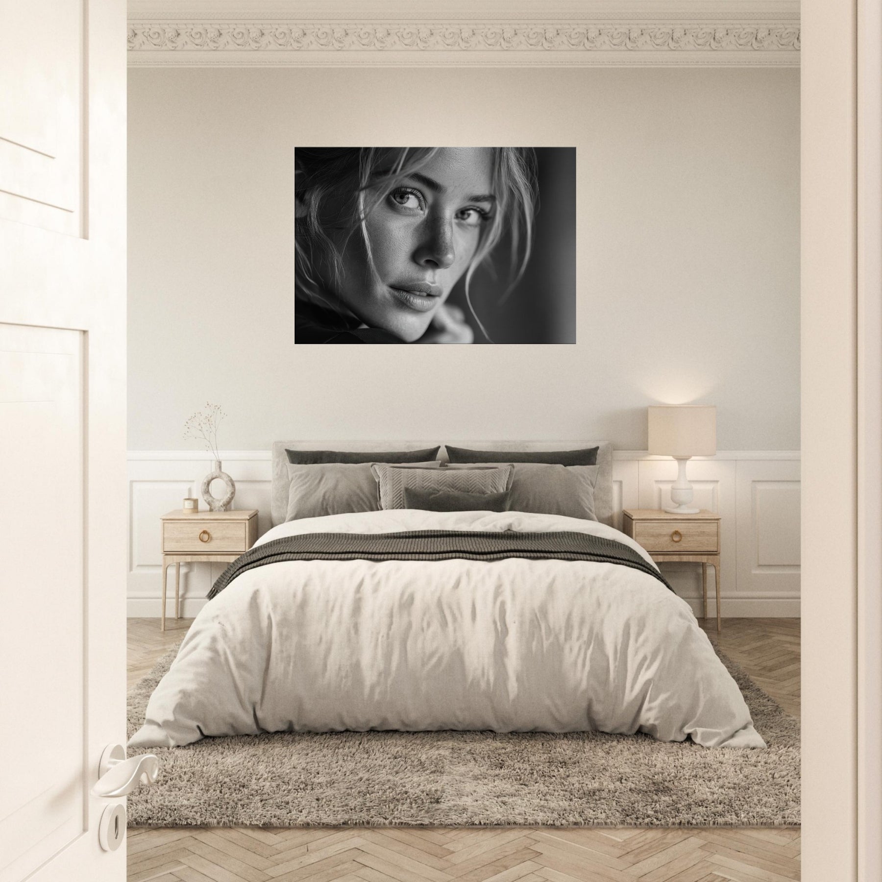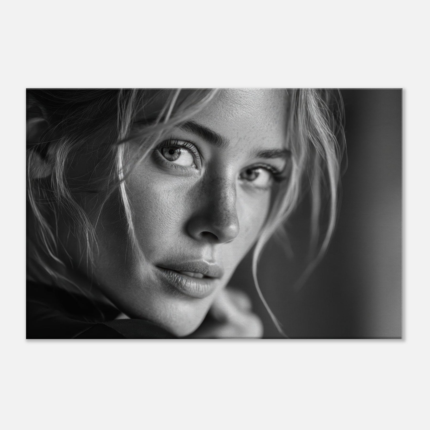 European Woman in black and white, this print speaks in quiet contrasts: skin like porcelain, hair a shadowed web, eyes glimmering with memory. The atmosphere is intimate, cinematic, and endlessly versatile, inviting a calm, reflective mood to any living space. Framed in soft light, it pairs beautifully with minimalist interiors or moody palettes, adding depth, texture, and a whisper of narrative. A timeless statement piece that enhances a wall with grace, warmth, and a refined elegance.