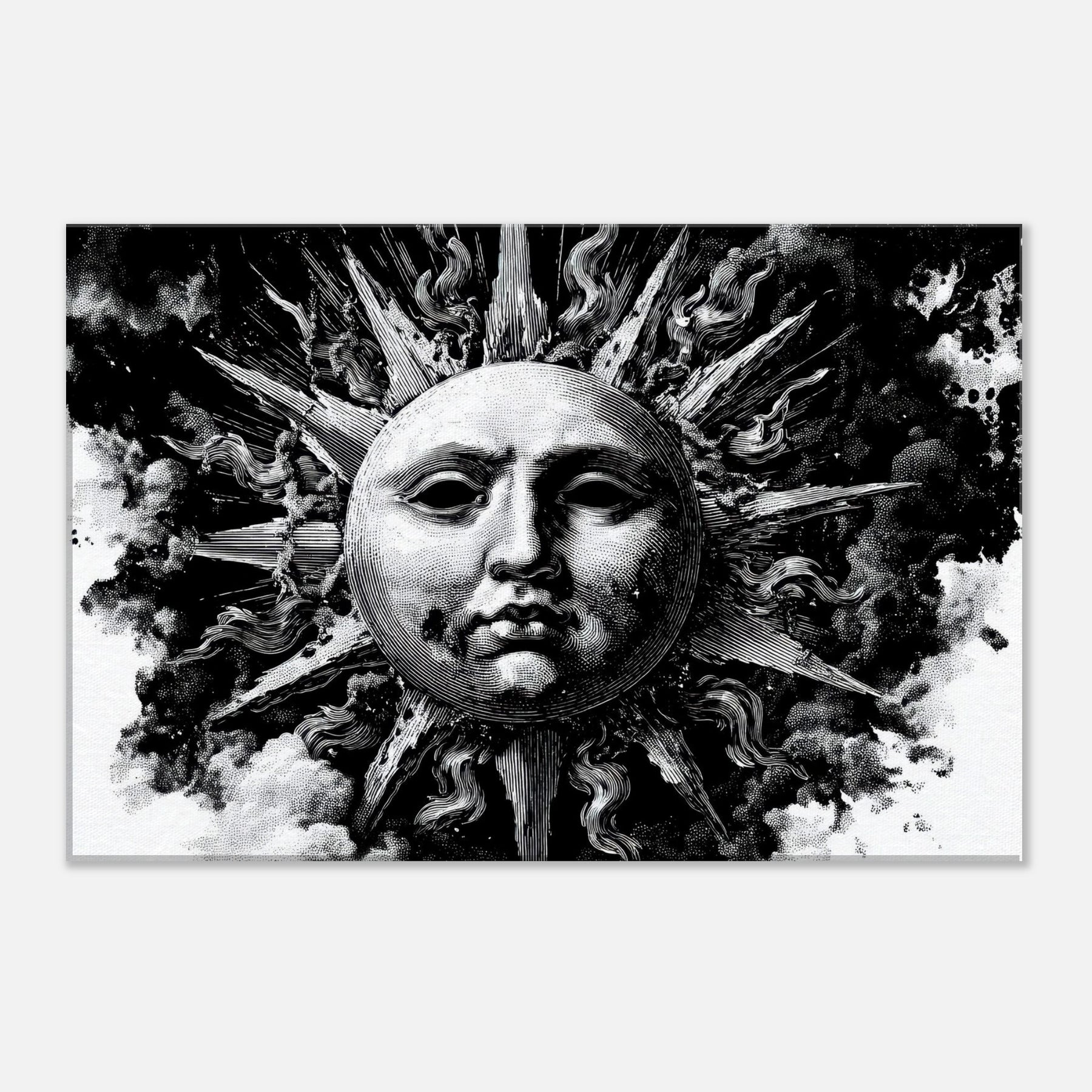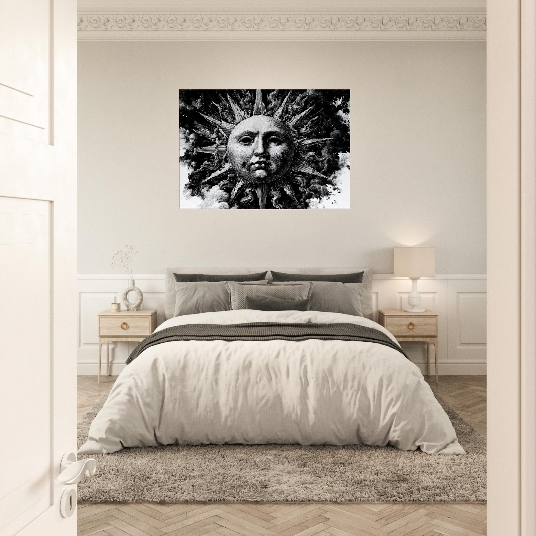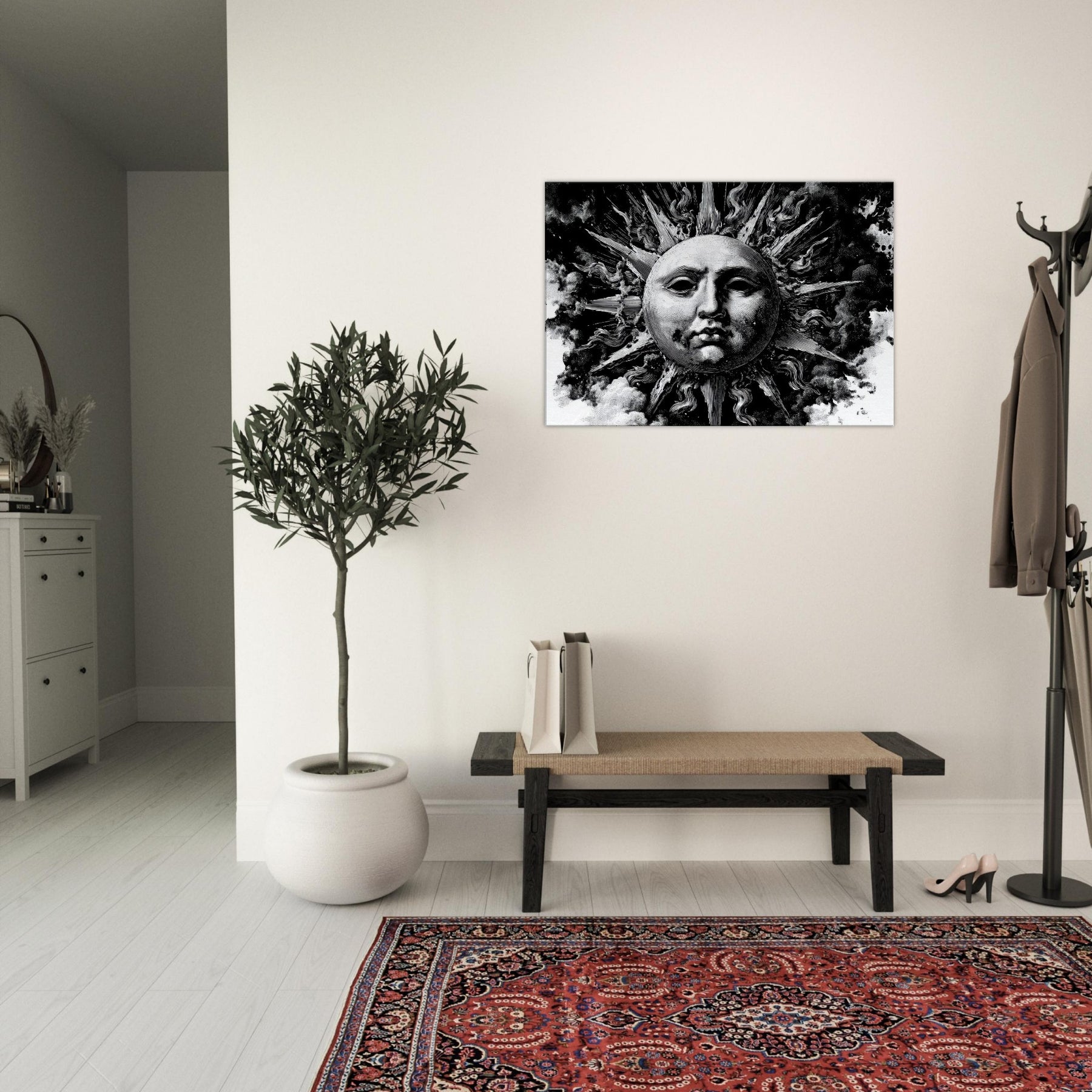 Immerse your room in a sacred hush where the Sun radiates as a celestial compass, carved in bold blacks and luminous whites. This mystical artwork gathers dusk and dawn into one quiet horizon, the face of the Sun calm, timeless, almost ceremonial. The high contrast linework and sunbursts cast a disciplined glow across a living room or study, inviting reflection, focus, and a cinematic mood. Hang it above a sofa or console to anchor conversations with the energy of a nocturnal sunrise.
