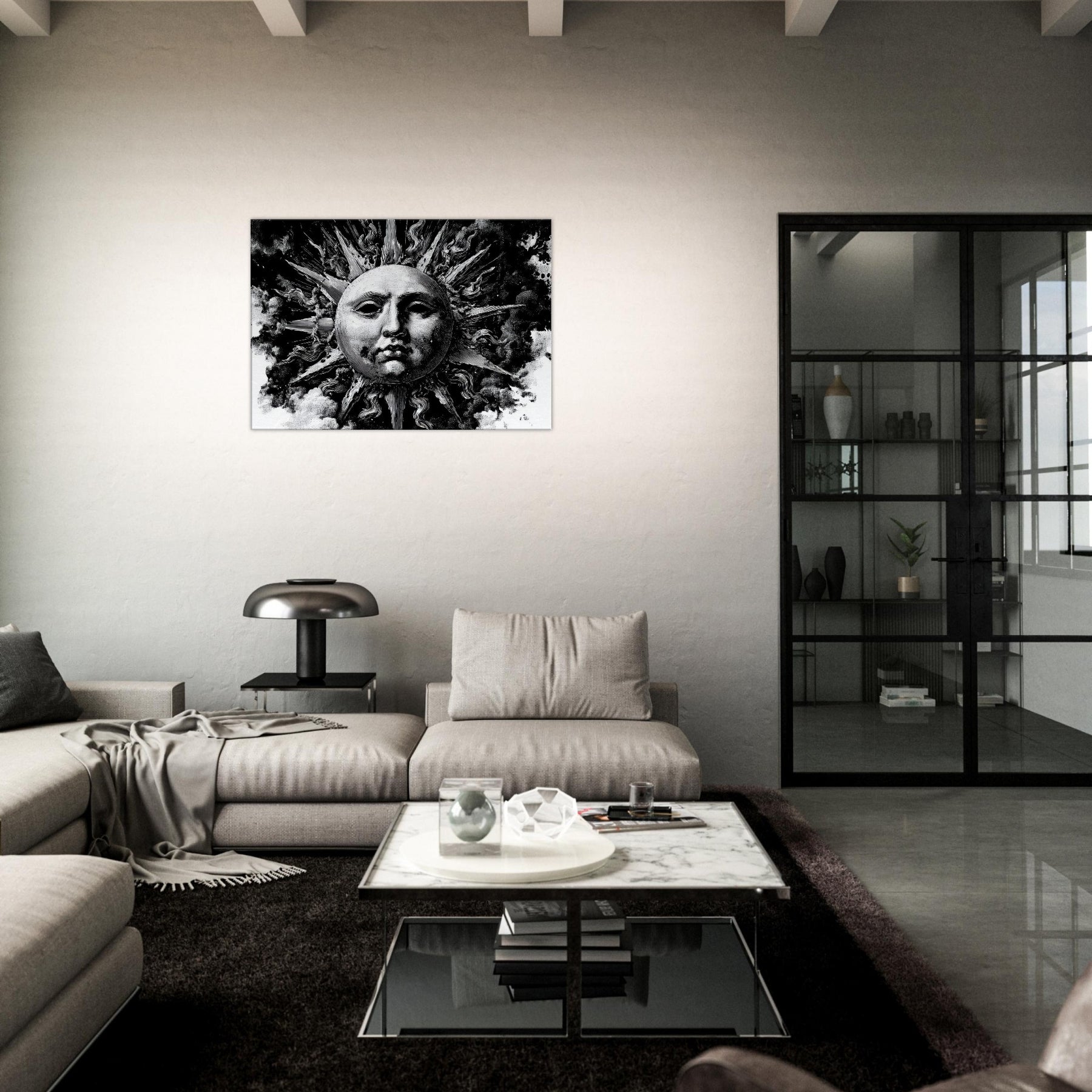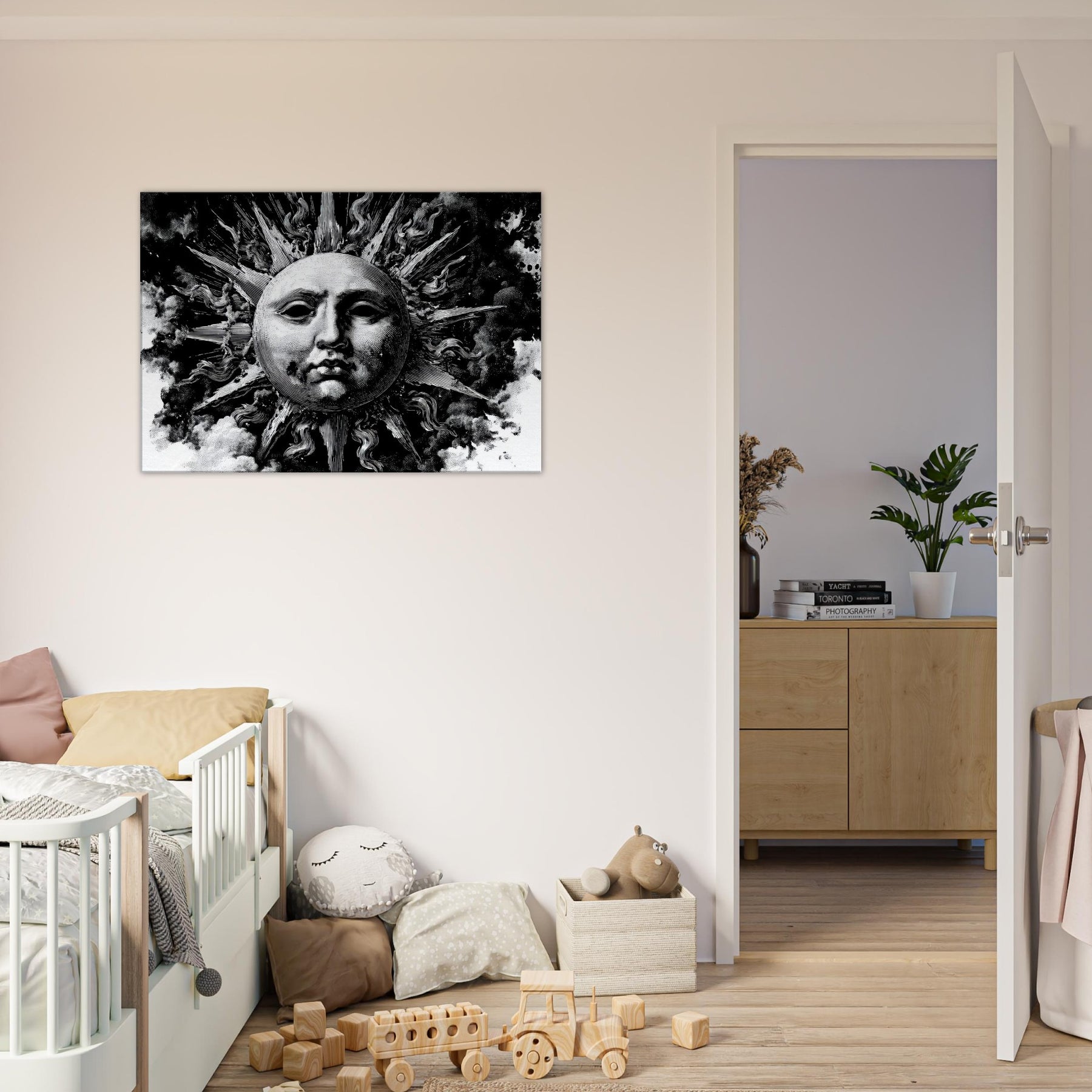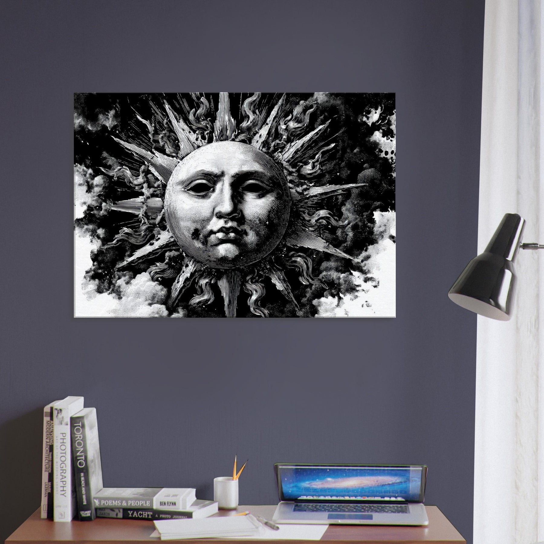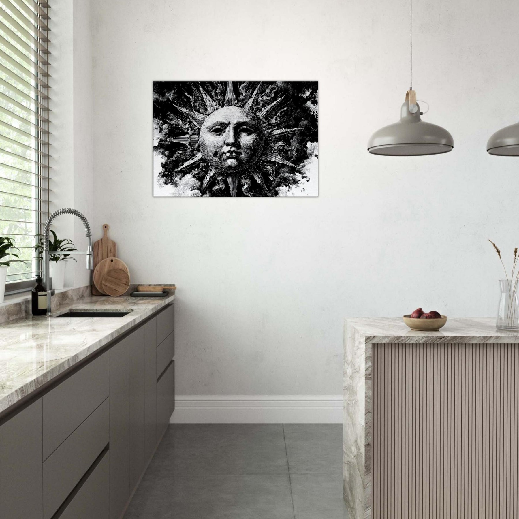 Immerse your room in a sacred hush where the Sun radiates as a celestial compass, carved in bold blacks and luminous whites. This mystical artwork gathers dusk and dawn into one quiet horizon, the face of the Sun calm, timeless, almost ceremonial. The high contrast linework and sunbursts cast a disciplined glow across a living room or study, inviting reflection, focus, and a cinematic mood. Hang it above a sofa or console to anchor conversations with the energy of a nocturnal sunrise.