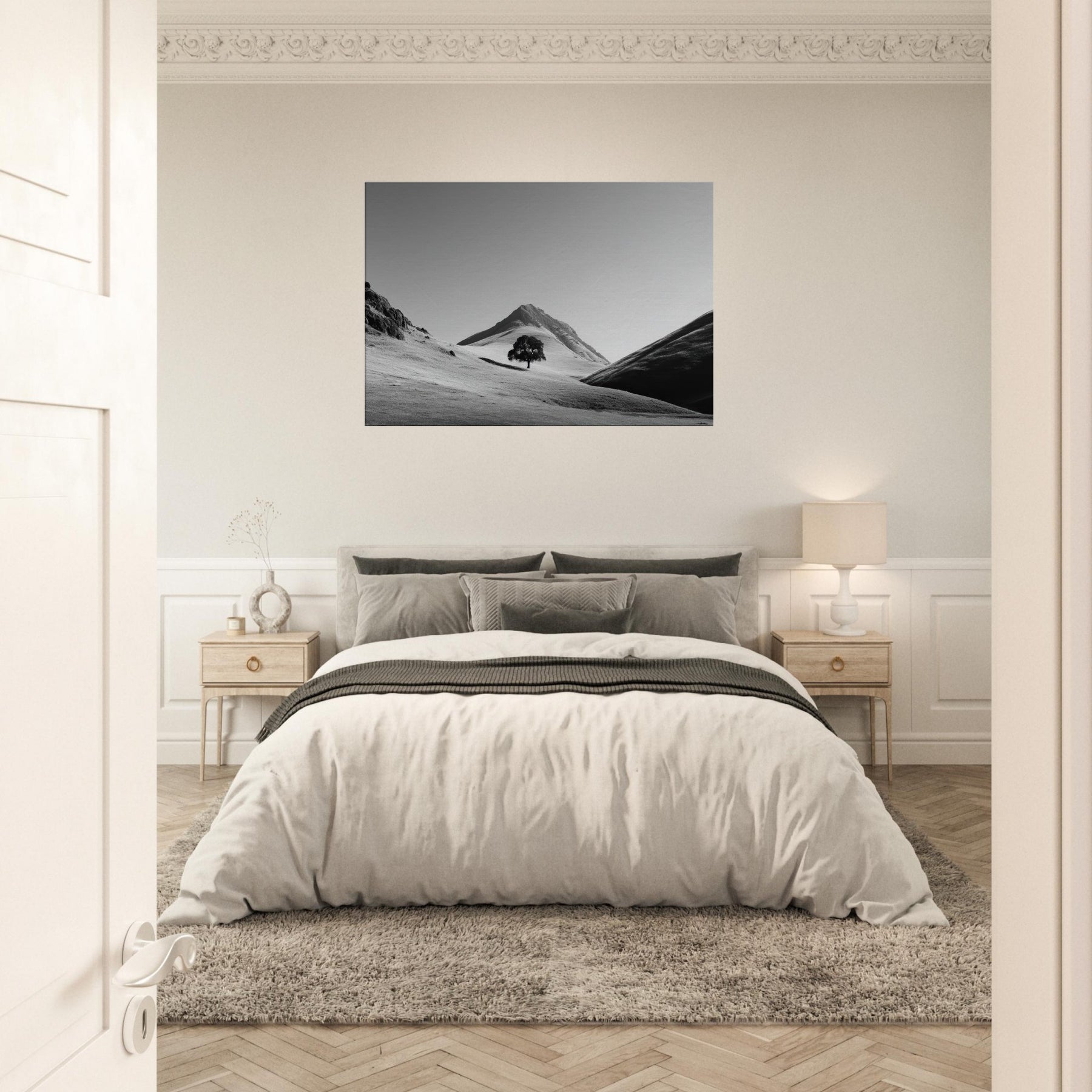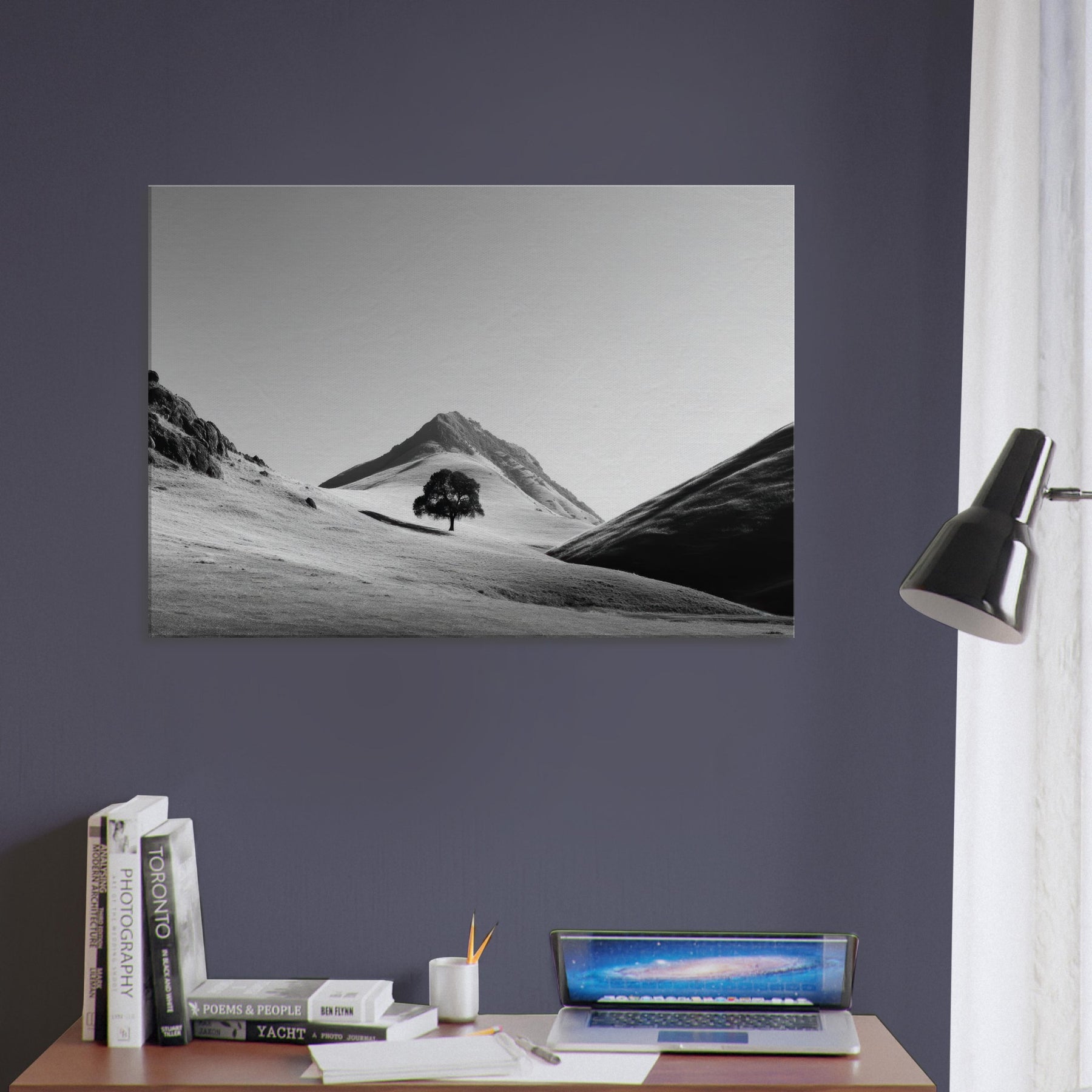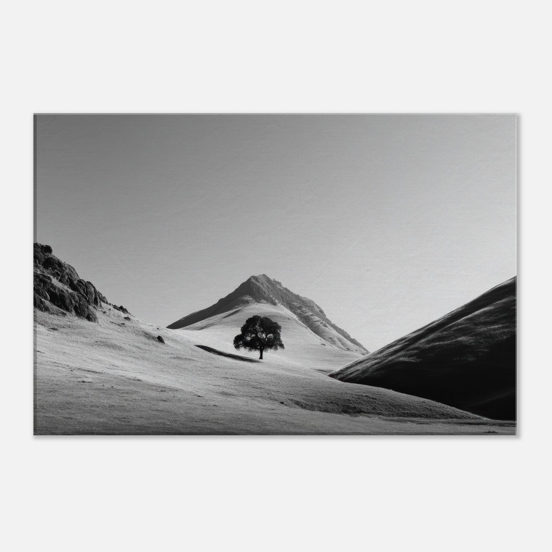 Through a restrained palette of black and white, this frame free invites quiet contemplation. A lone tree rests on the rolling hills, its dark silhouette a focal point against the sunlit expanse. The hills breathe vastness and solitude, as if time paused to listen to the wind across the loose snow and chalky slopes. Hang this piece in a living room or study to soften hard lines with soft shadows, to echo a calm dawn, and to invite everyday stillness into your space.