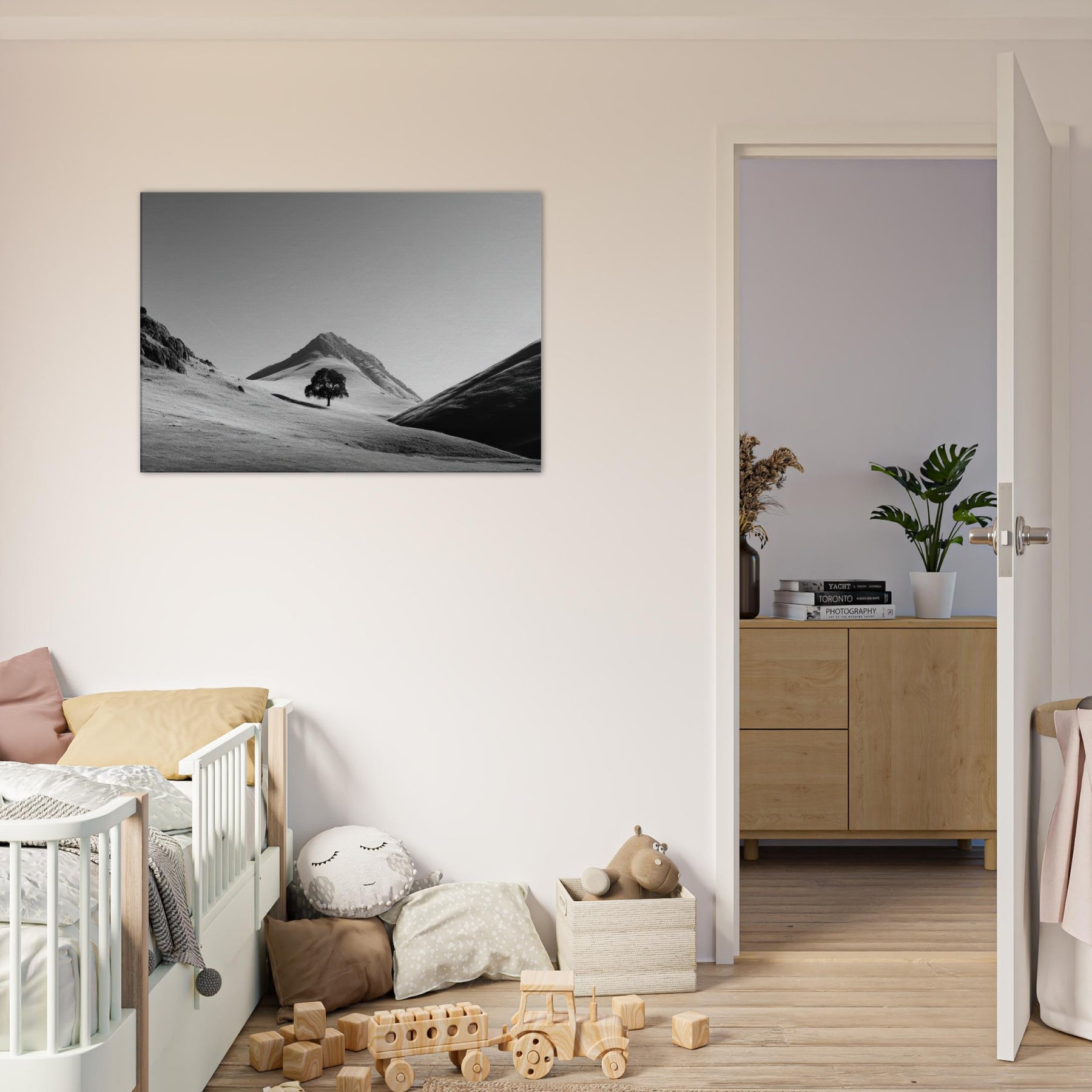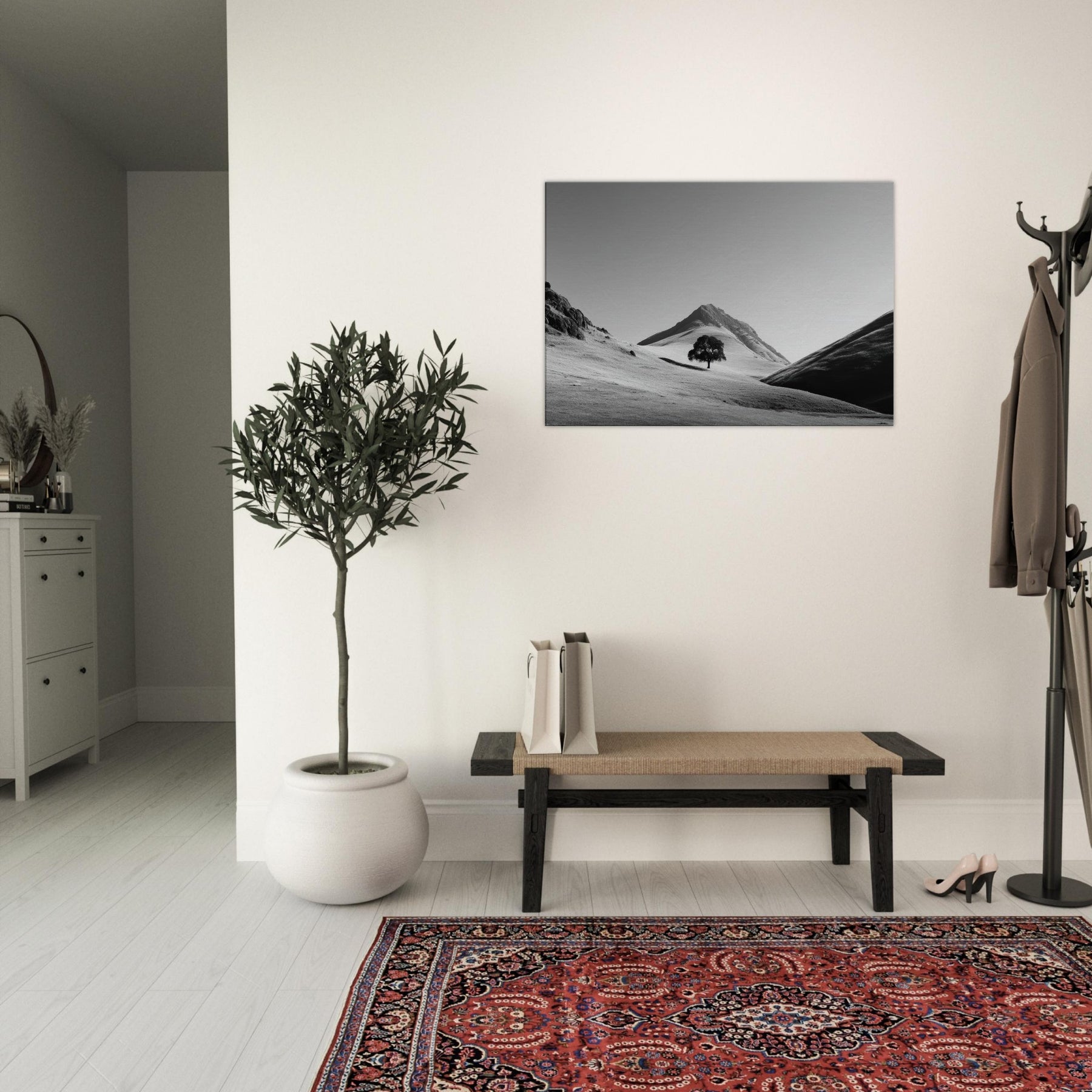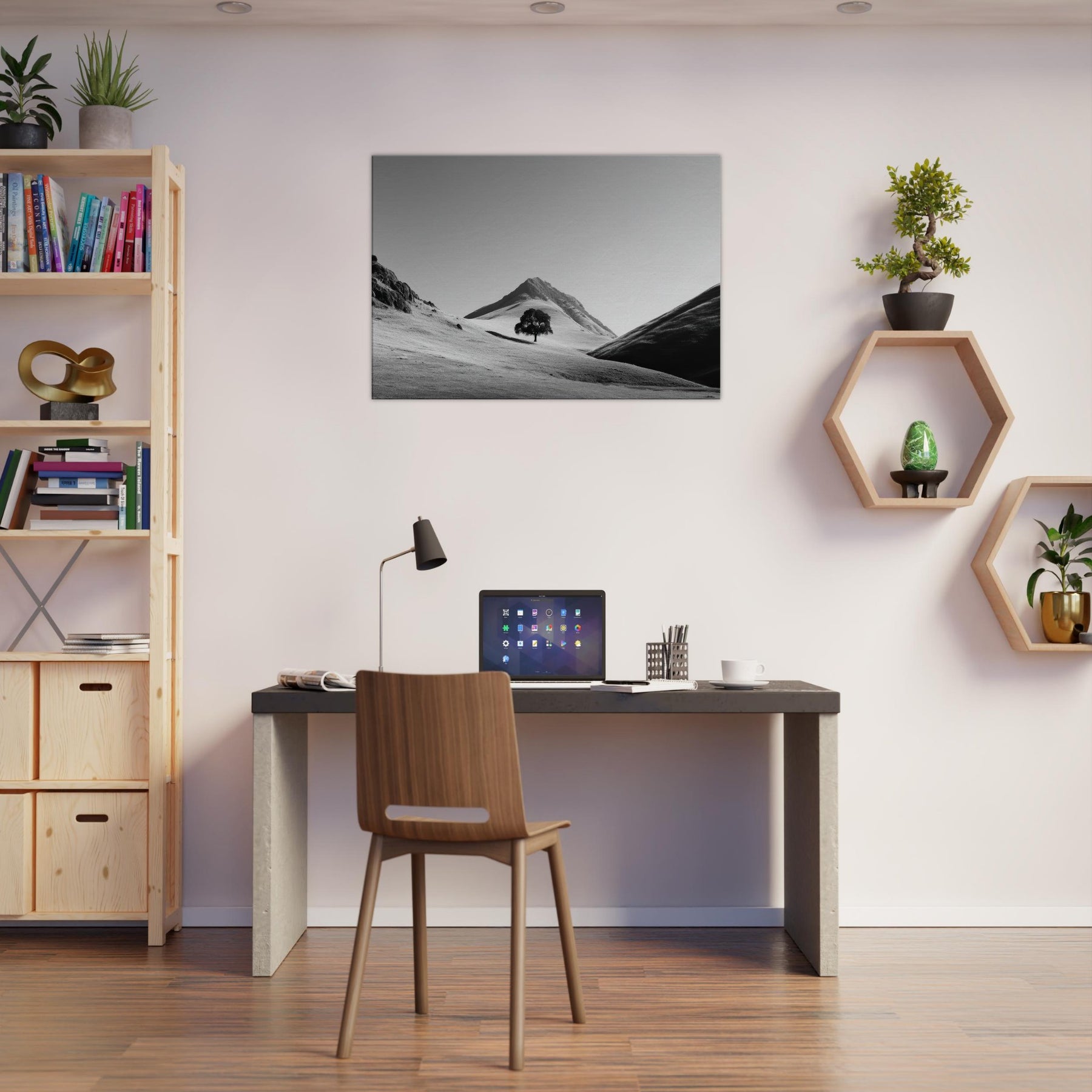 Through a restrained palette of black and white, this frame free invites quiet contemplation. A lone tree rests on the rolling hills, its dark silhouette a focal point against the sunlit expanse. The hills breathe vastness and solitude, as if time paused to listen to the wind across the loose snow and chalky slopes. Hang this piece in a living room or study to soften hard lines with soft shadows, to echo a calm dawn, and to invite everyday stillness into your space.