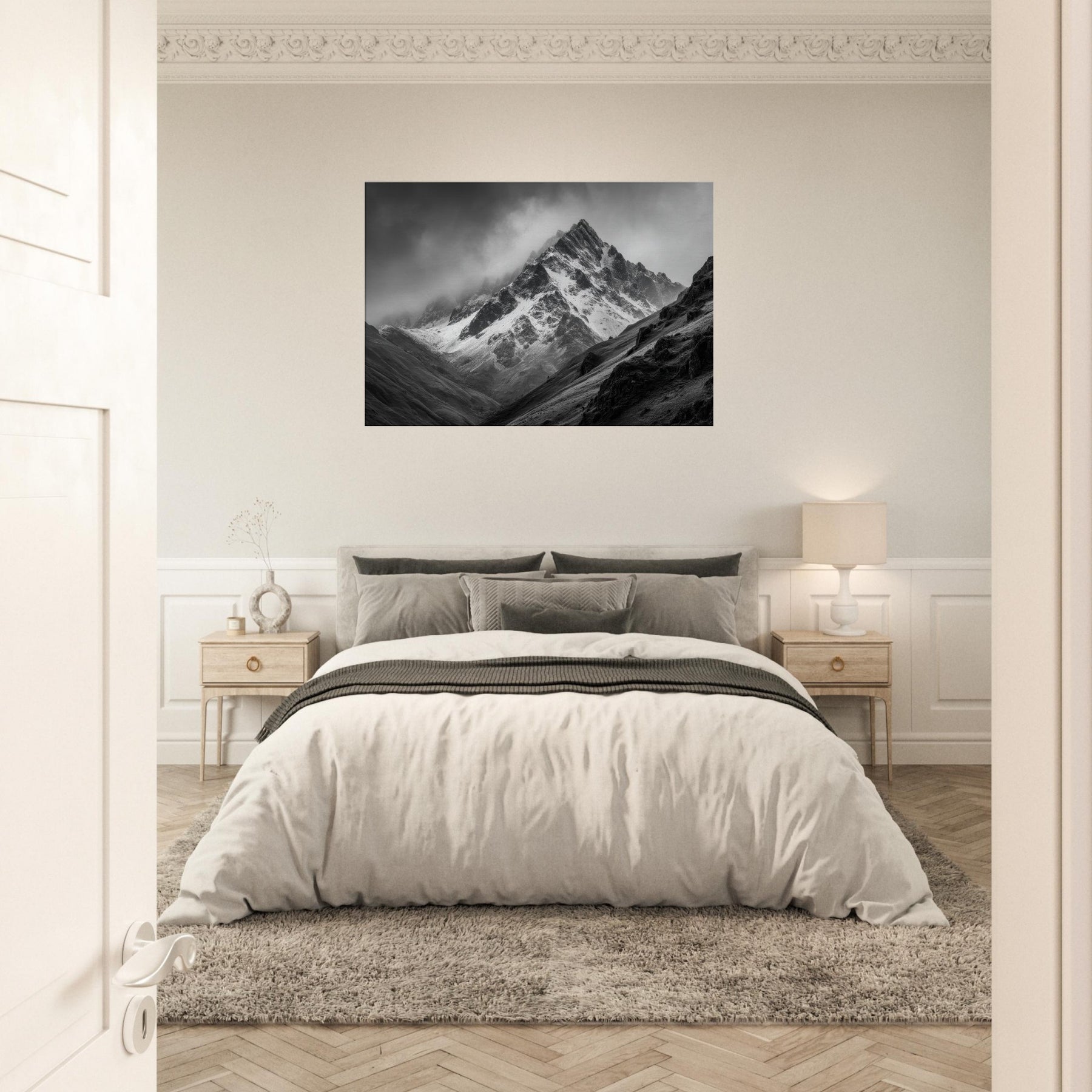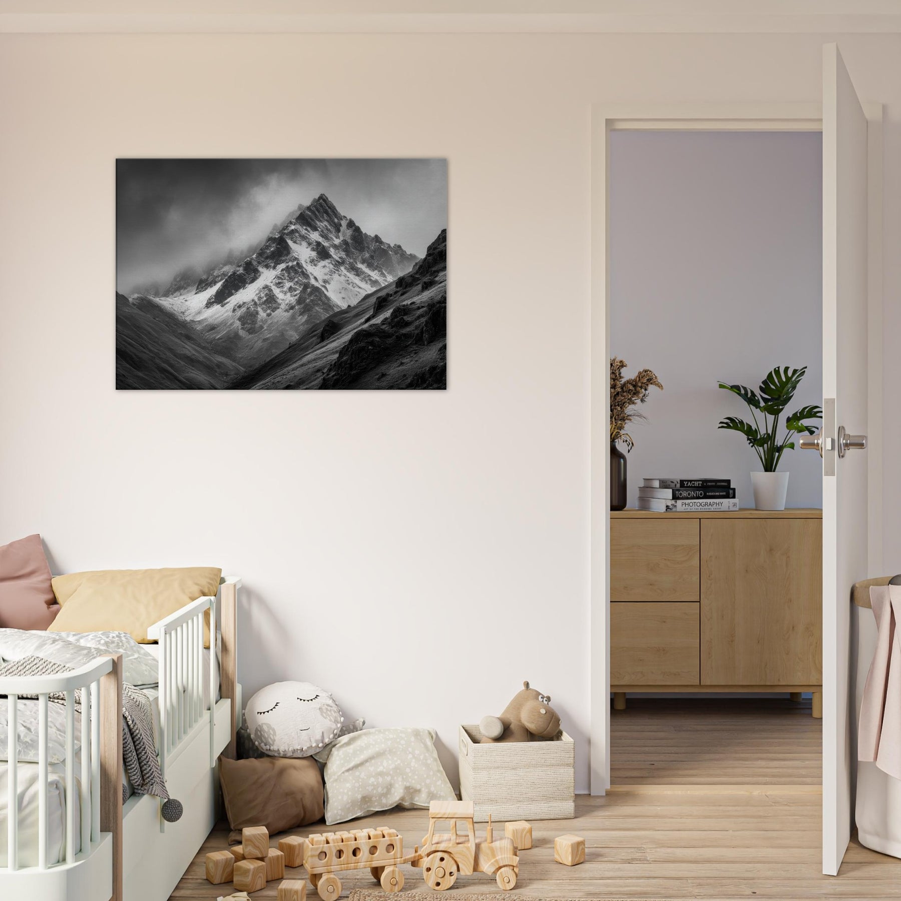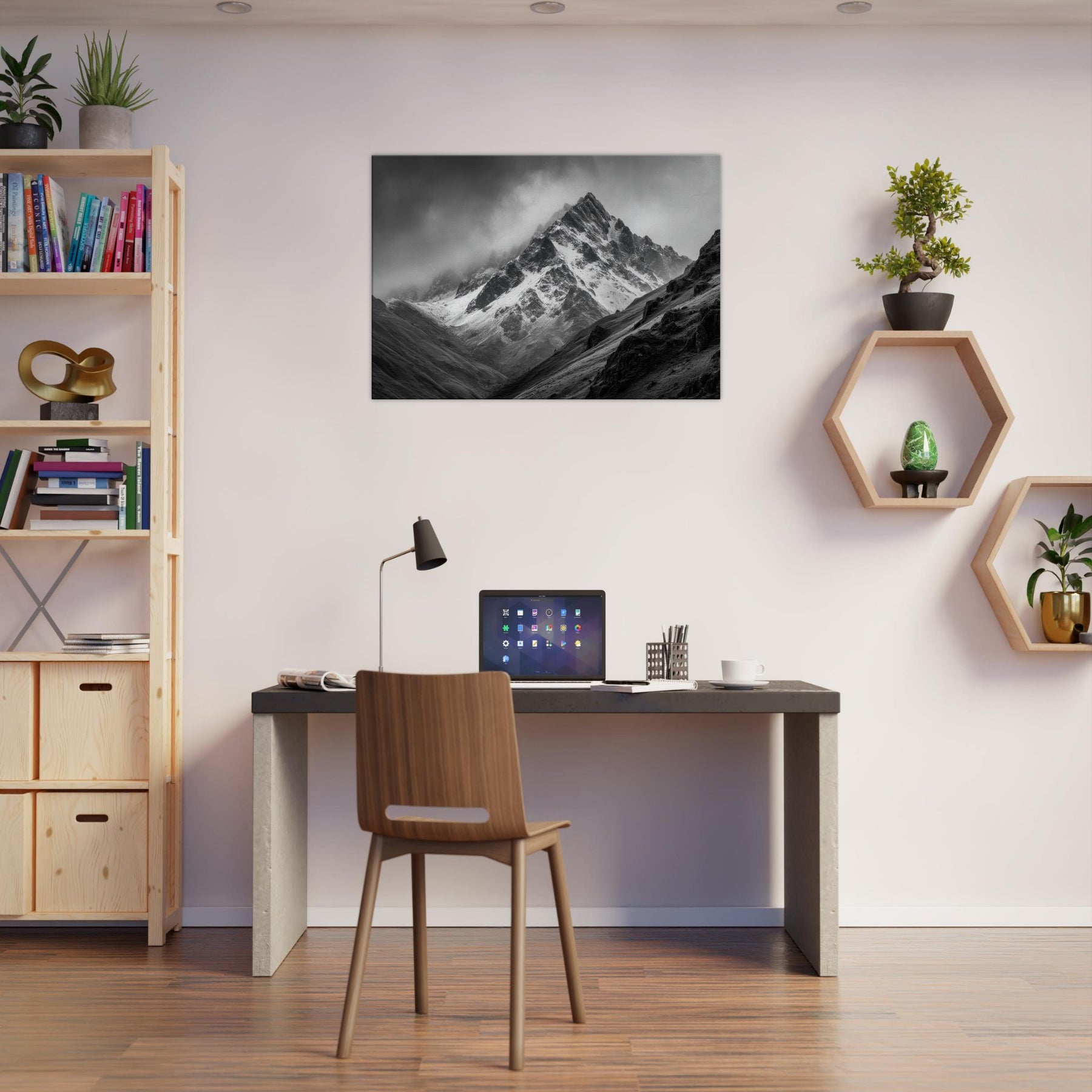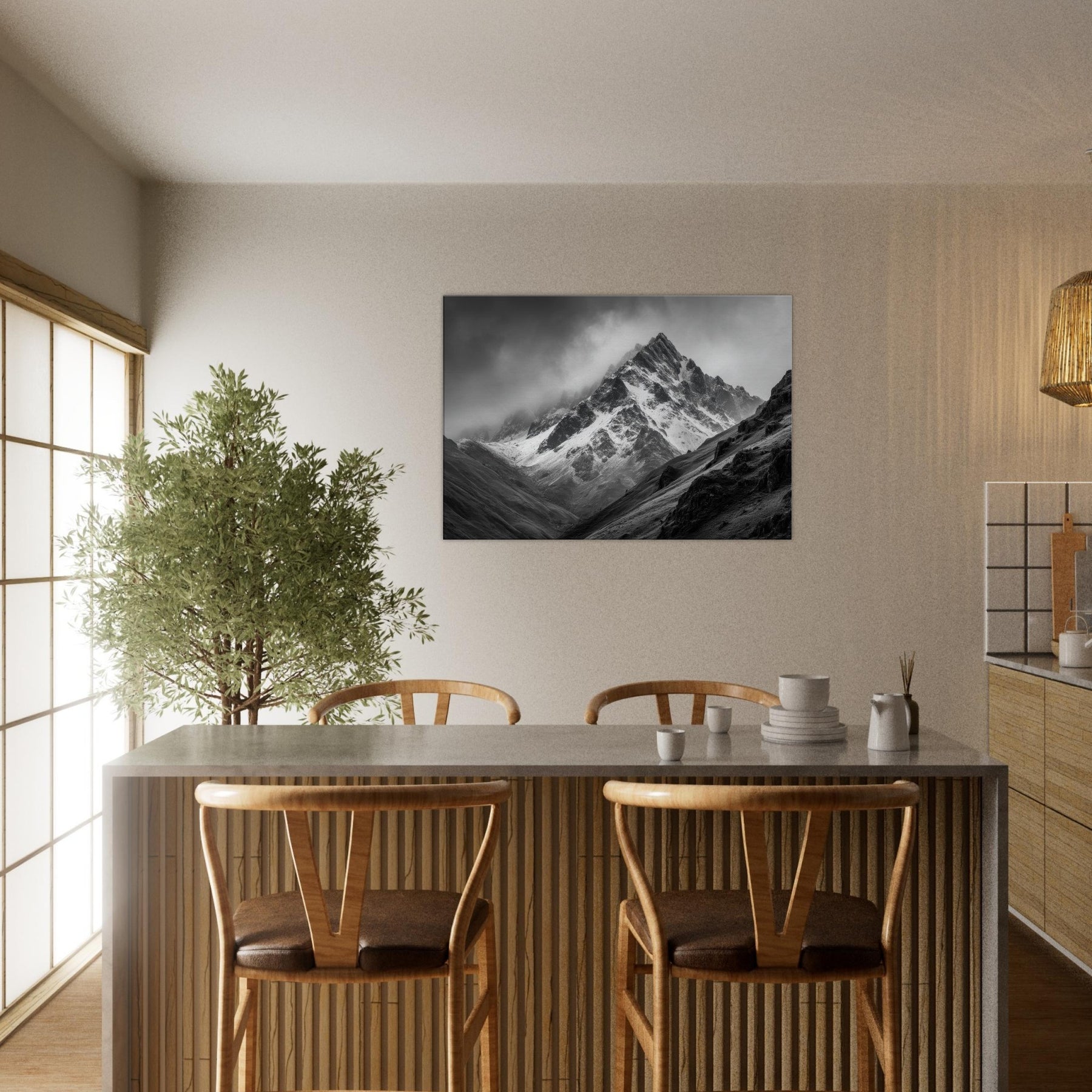 Let this monochrome ascent invite the room to breathe. The Mountains rise in stark contrast, their jagged silhouettes sculpting shadows across a quiet living space. Snow threads sparkle in soft light, while fog wraps the peaks in a hushed, timeless mood. This piece carries the discipline of winter and the poetry of scale, turning a wall into a window to the high country. It pairs with warm textures or cool minimal decor, creating depth, focus, and a calm, panoramic atmosphere.