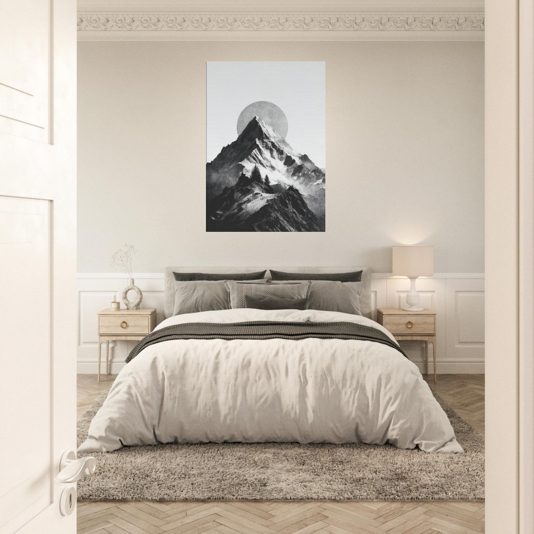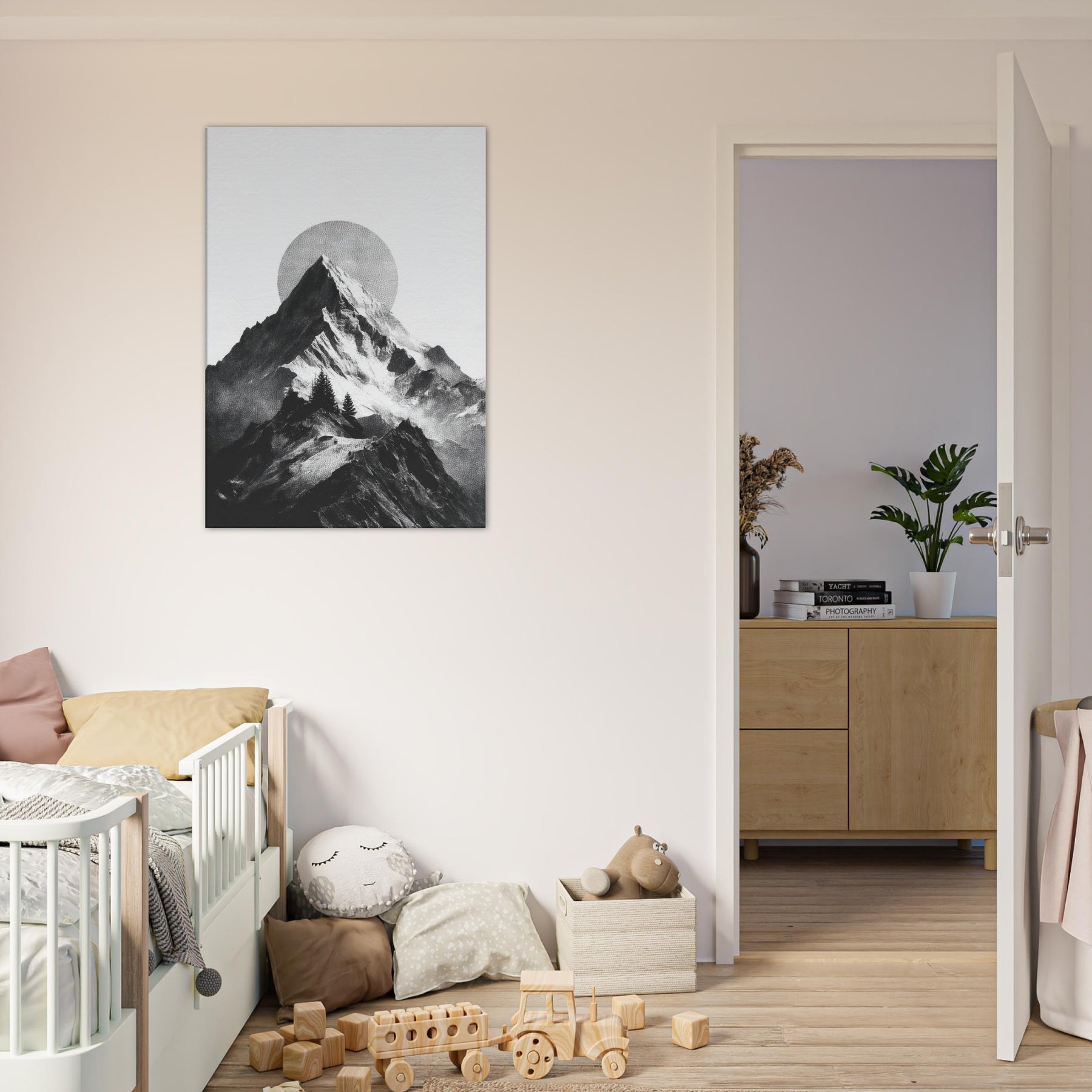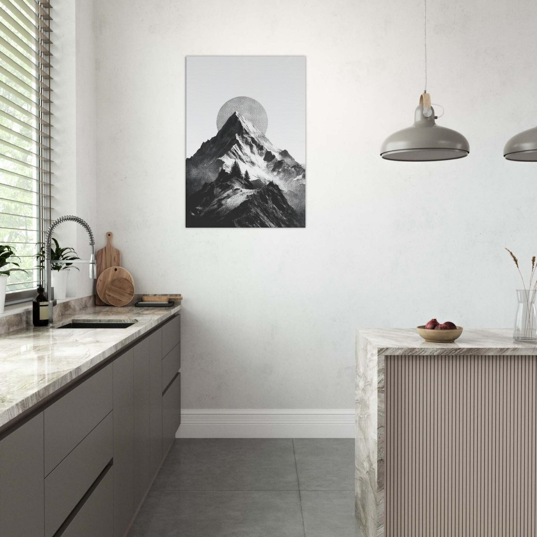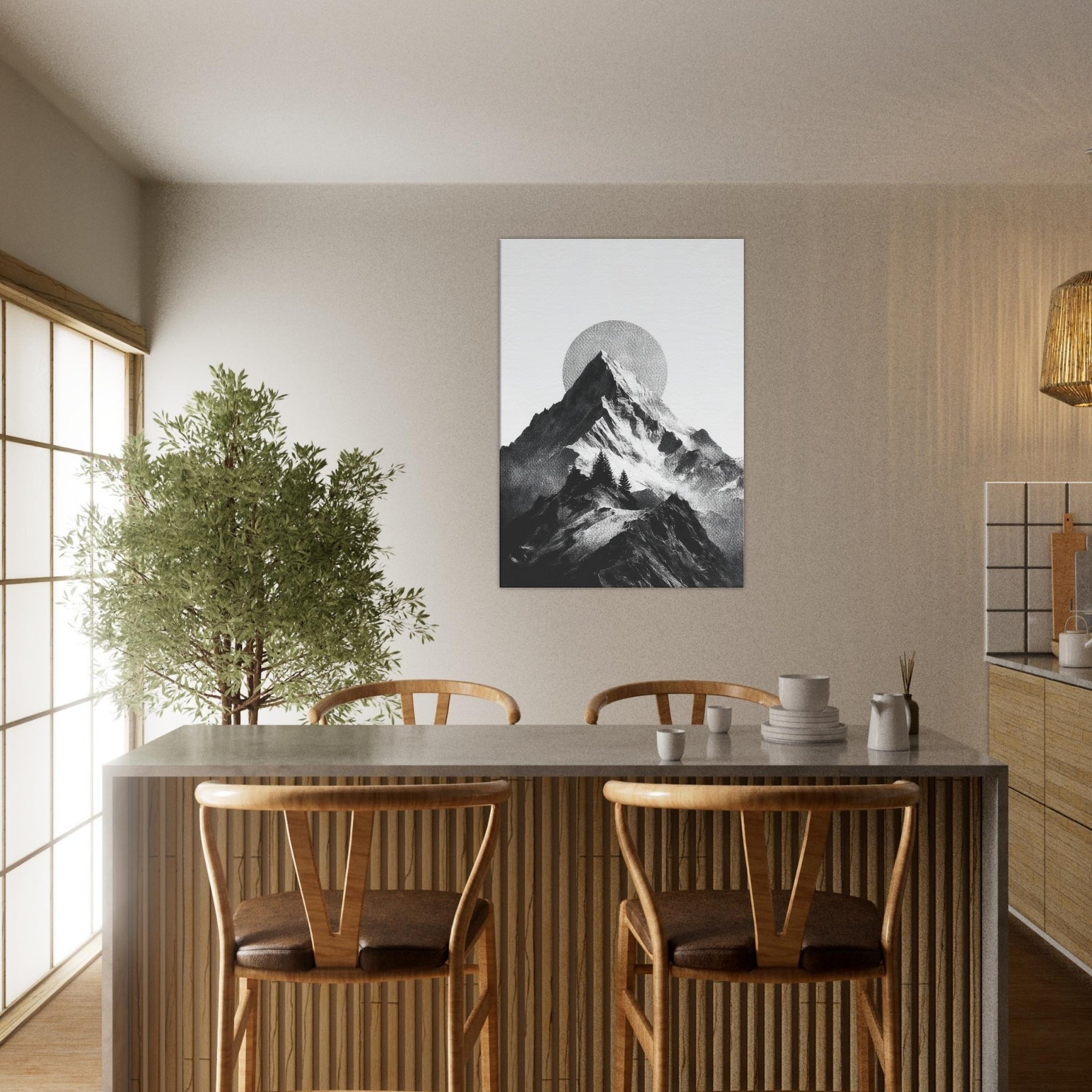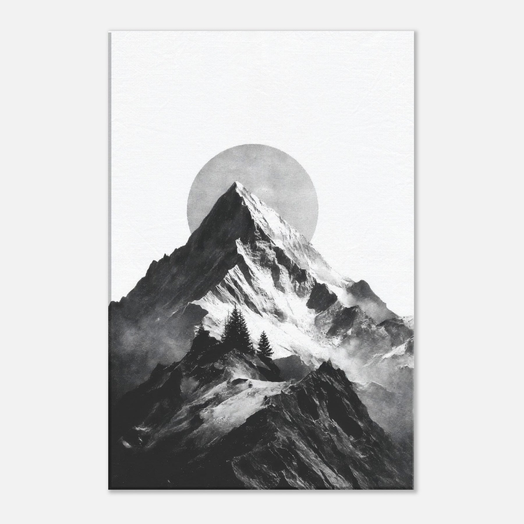Rainbow Minimal unfolds in monochrome, a serene skyline where jagged peaks cradle a pale, circular sun. The black and white contrast feels like breath across a quiet season, inviting calm into a living space. This nature inspired composition layers texture and negative space, turning walls into a horizon you can almost walk along. It pairs with soft neutrals and bold furnishings alike, lending a refined drama and a meditative mood that makes evenings feel more timeless.