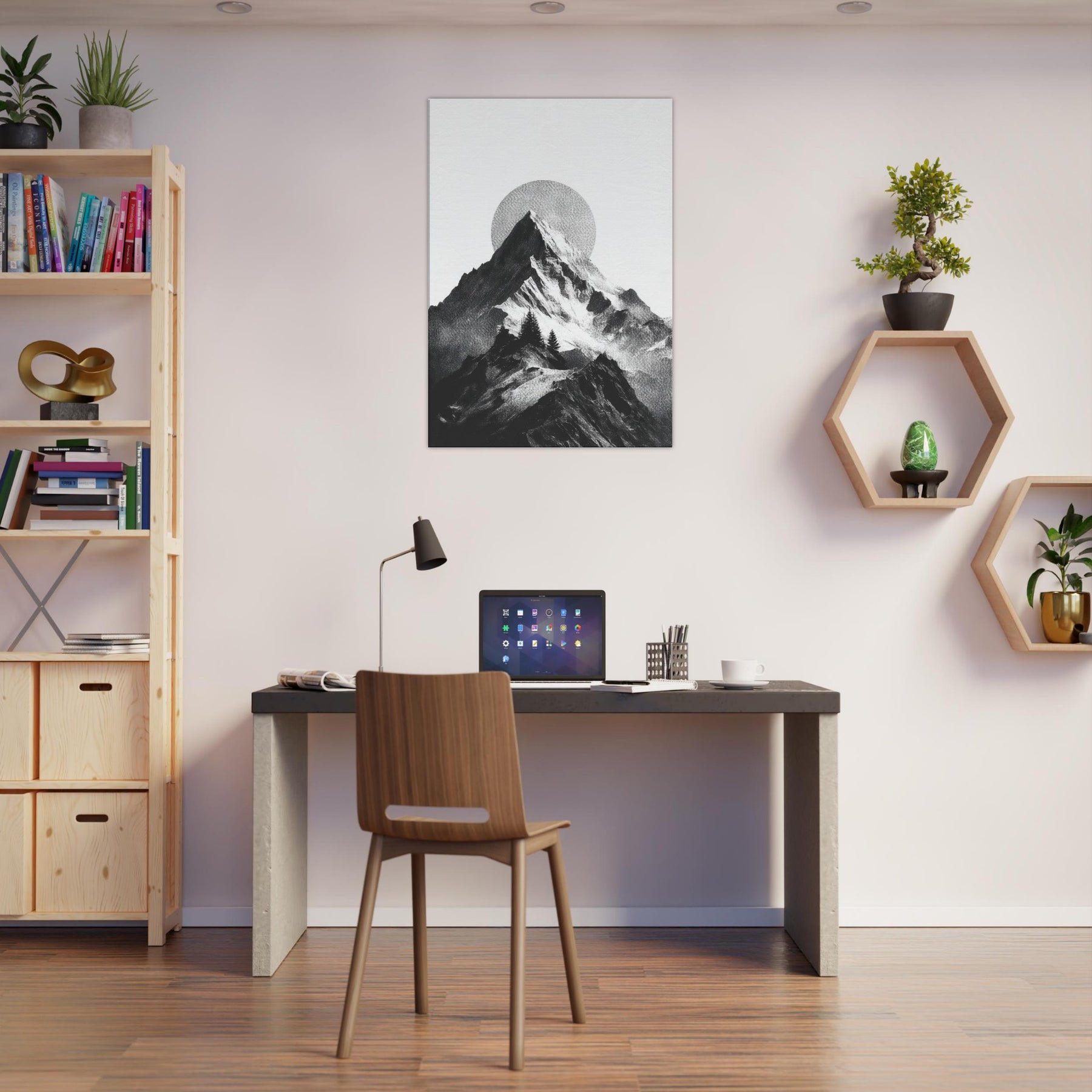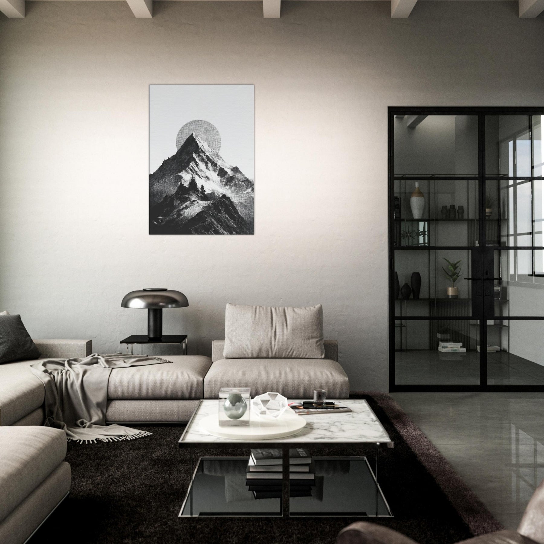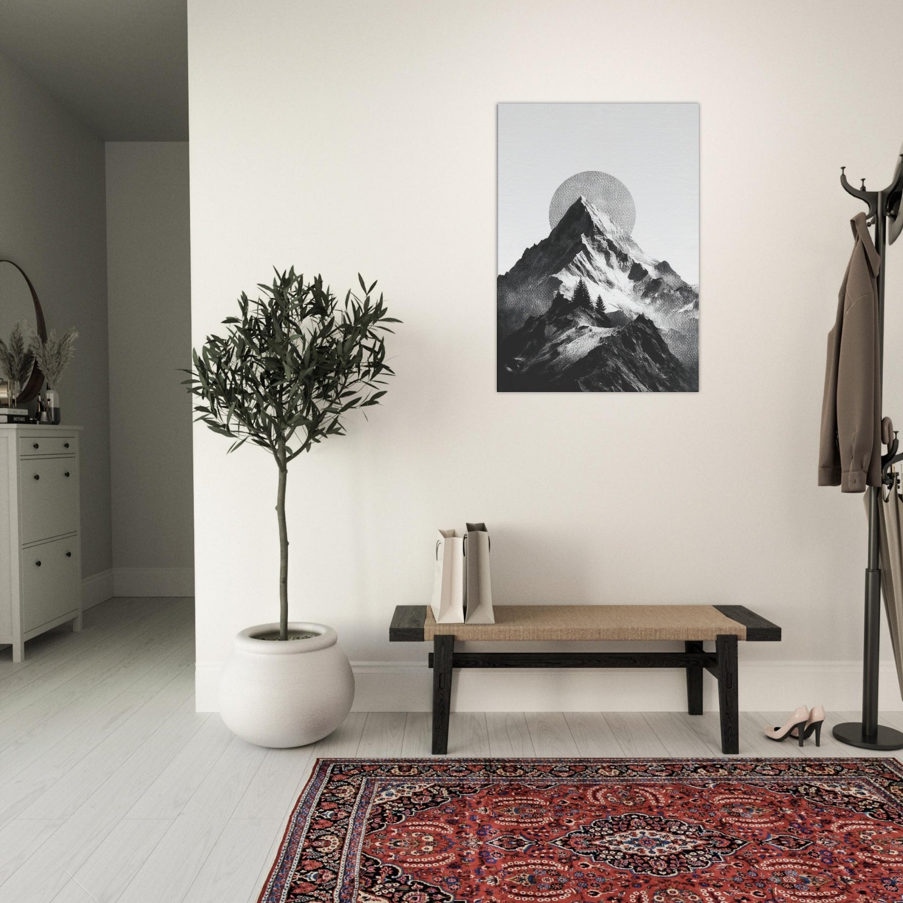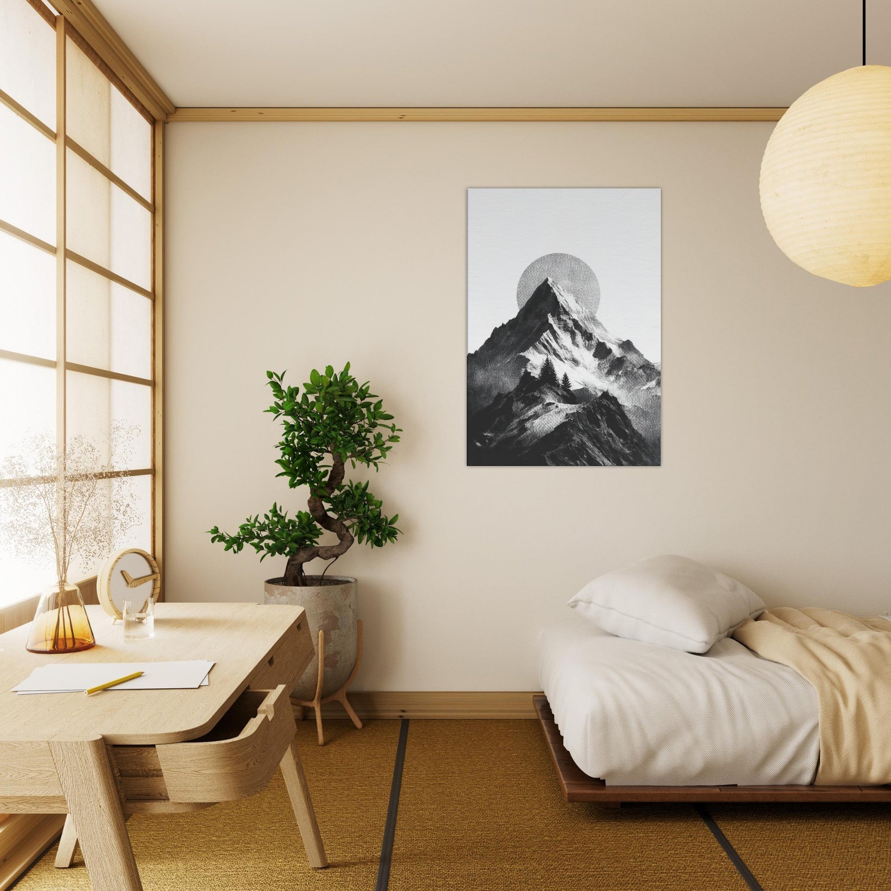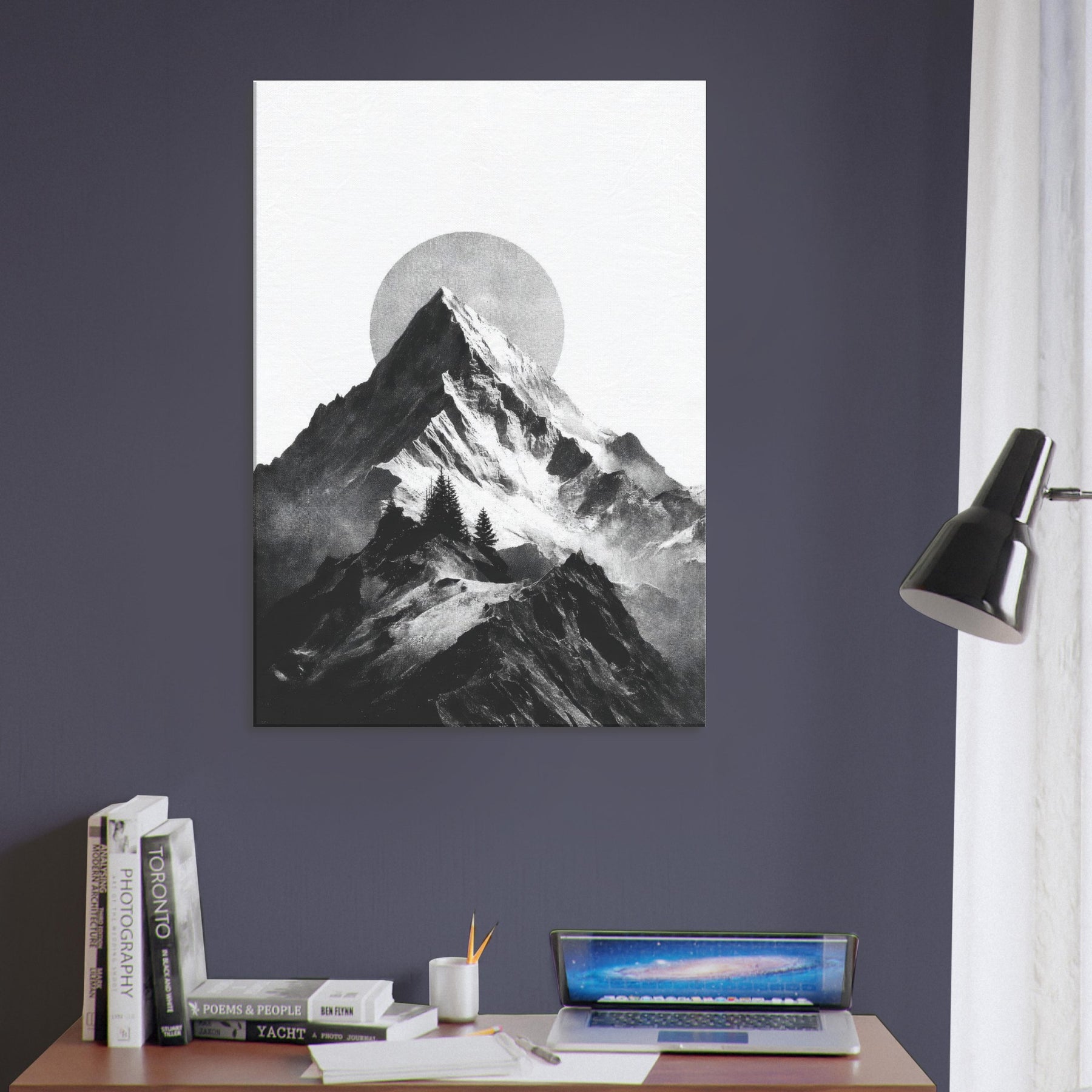 Rainbow Minimal unfolds in monochrome, a serene skyline where jagged peaks cradle a pale, circular sun. The black and white contrast feels like breath across a quiet season, inviting calm into a living space. This nature inspired composition layers texture and negative space, turning walls into a horizon you can almost walk along. It pairs with soft neutrals and bold furnishings alike, lending a refined drama and a meditative mood that makes evenings feel more timeless.