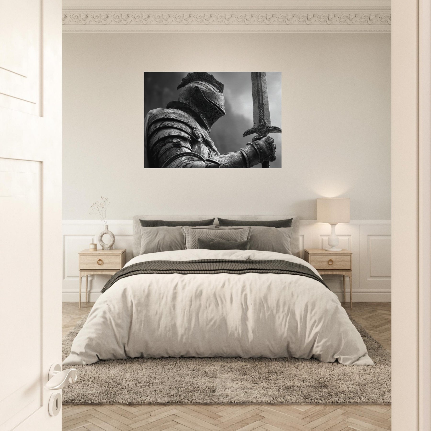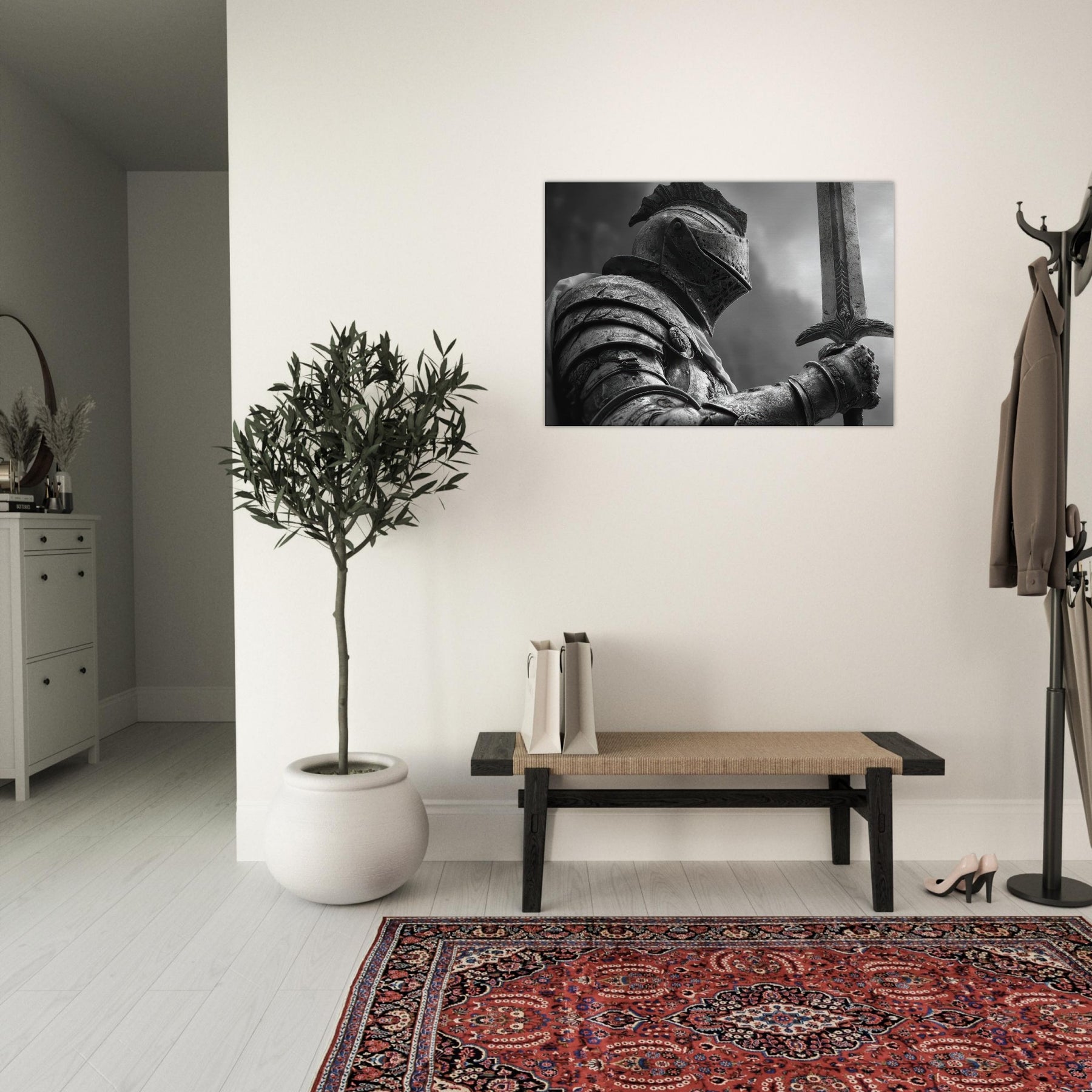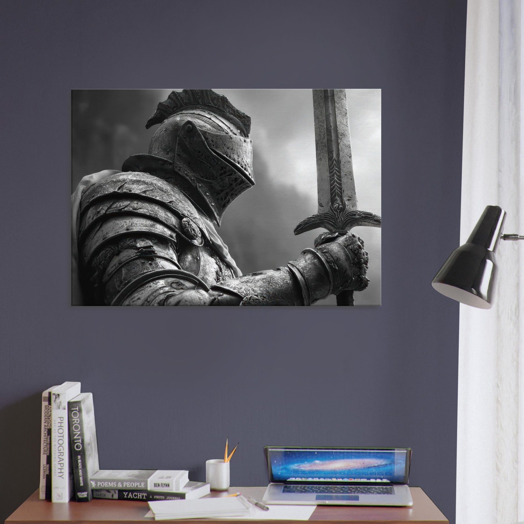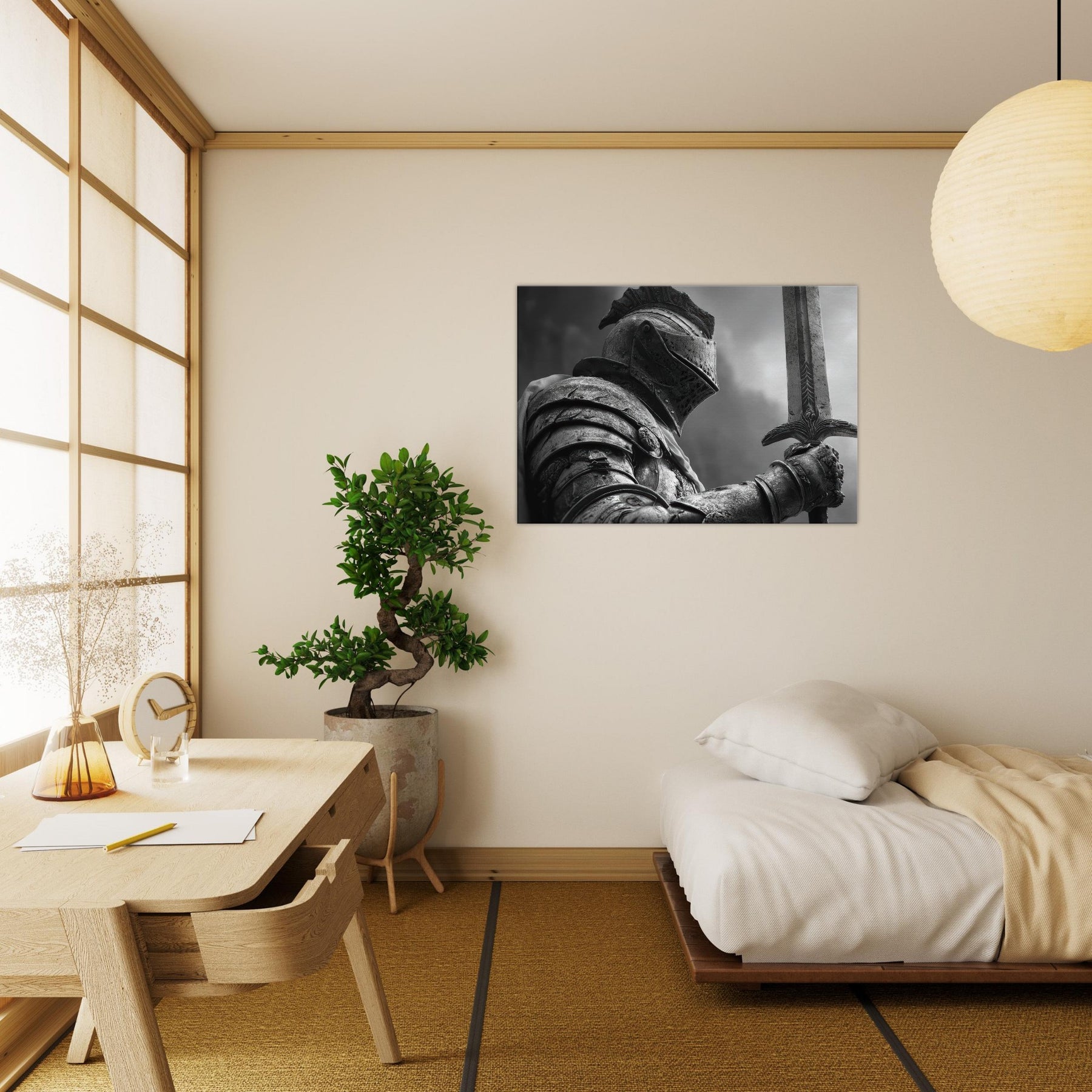 Step into a moment of quiet grandeur with this Black and White portrayal of Gallant Knight in shining armor. The image breathes with dusk lit steel, every ridge and plate catching a pale gleam as if the armor itself sings of courage. The sword stands upright, a beacon of resolve, while the cloak wraps the figure in shadow and light. Hang this in a living room or study to invite focus, reflection, and a noble, mythic energy that elevates every moment you pause to admire it.
