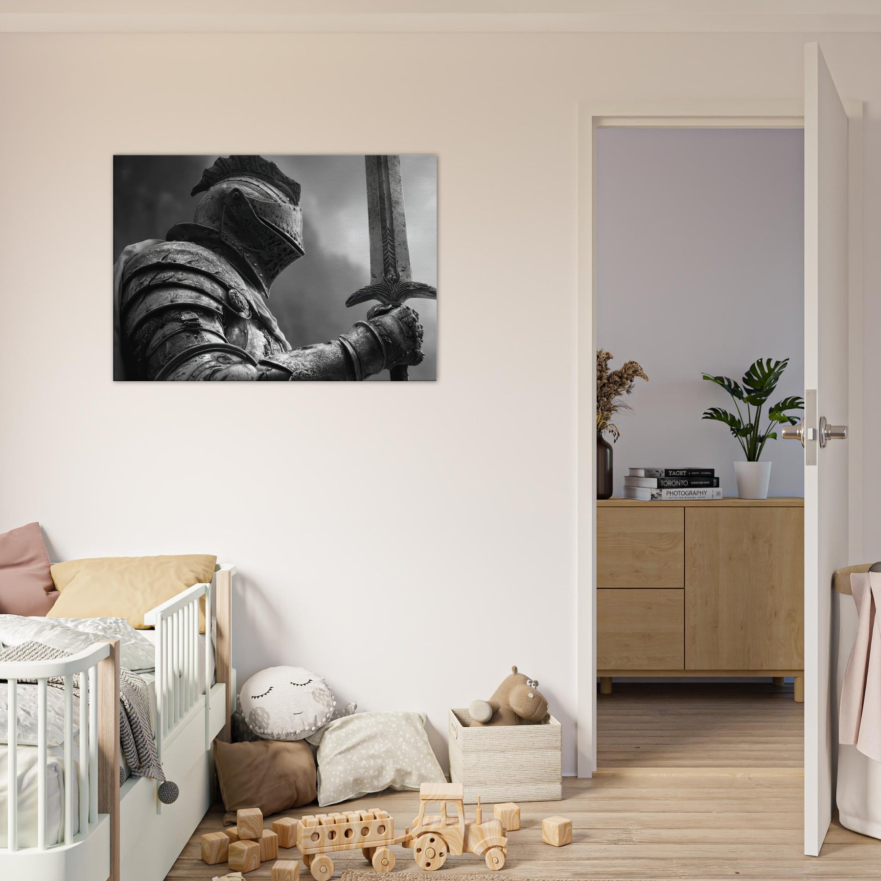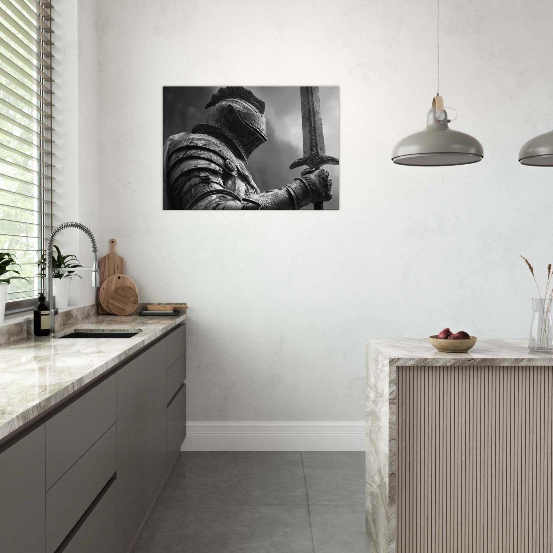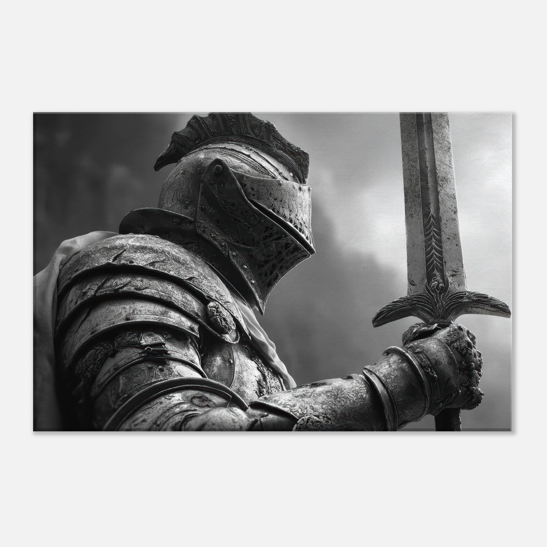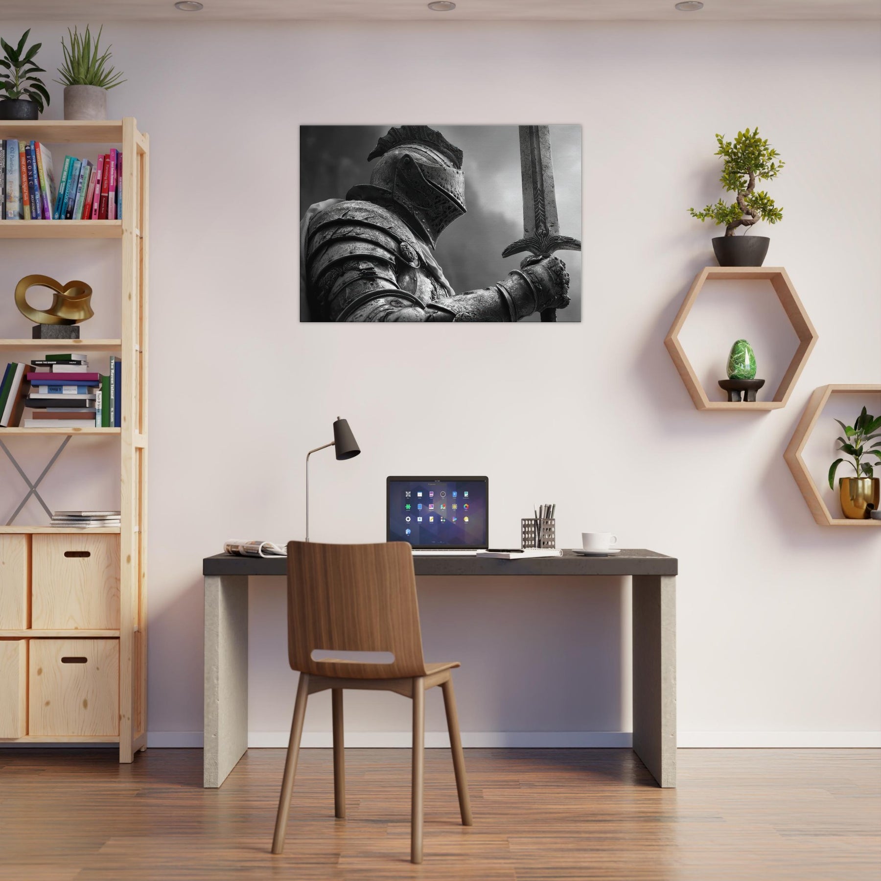 Step into a moment of quiet grandeur with this Black and White portrayal of Gallant Knight in shining armor. The image breathes with dusk lit steel, every ridge and plate catching a pale gleam as if the armor itself sings of courage. The sword stands upright, a beacon of resolve, while the cloak wraps the figure in shadow and light. Hang this in a living room or study to invite focus, reflection, and a noble, mythic energy that elevates every moment you pause to admire it.