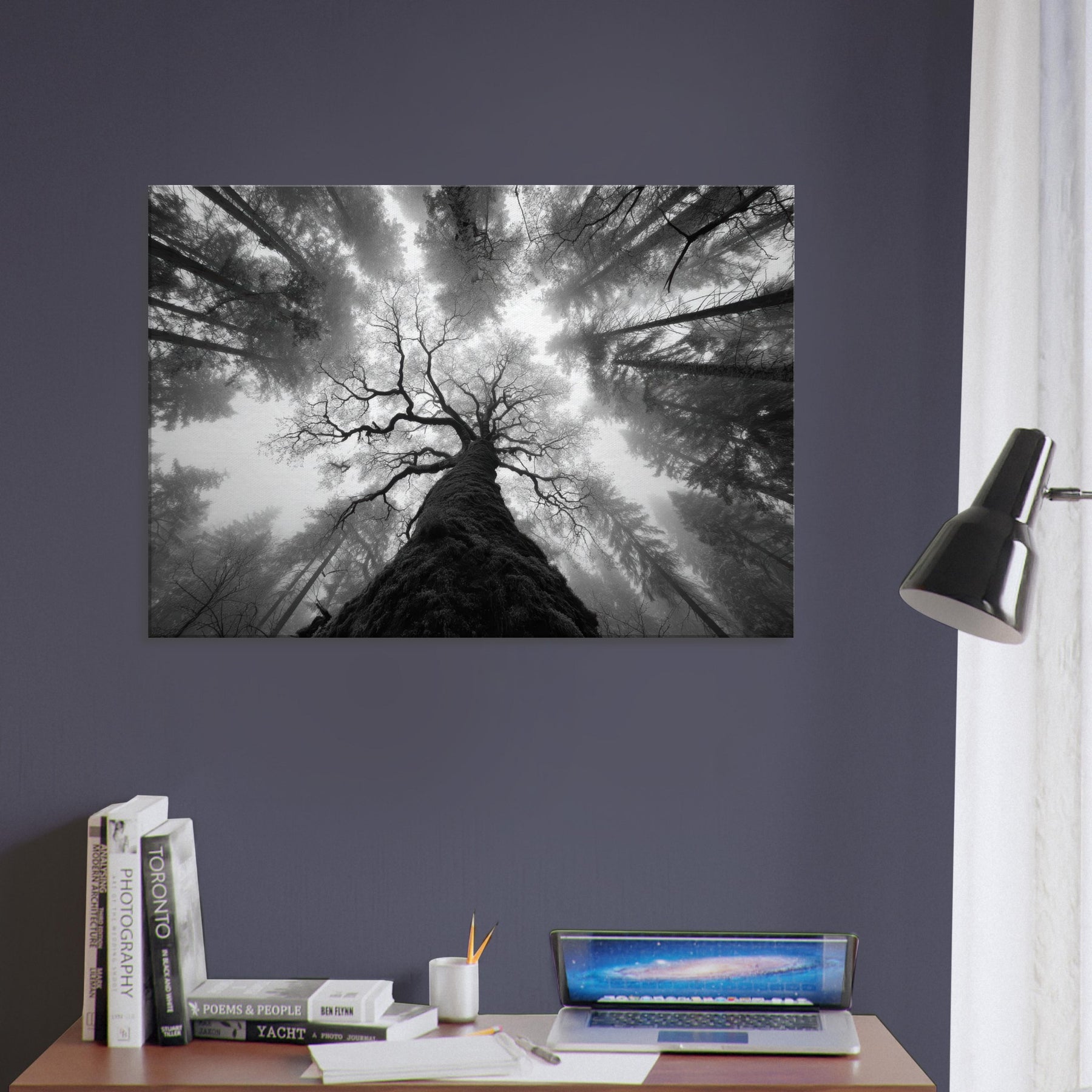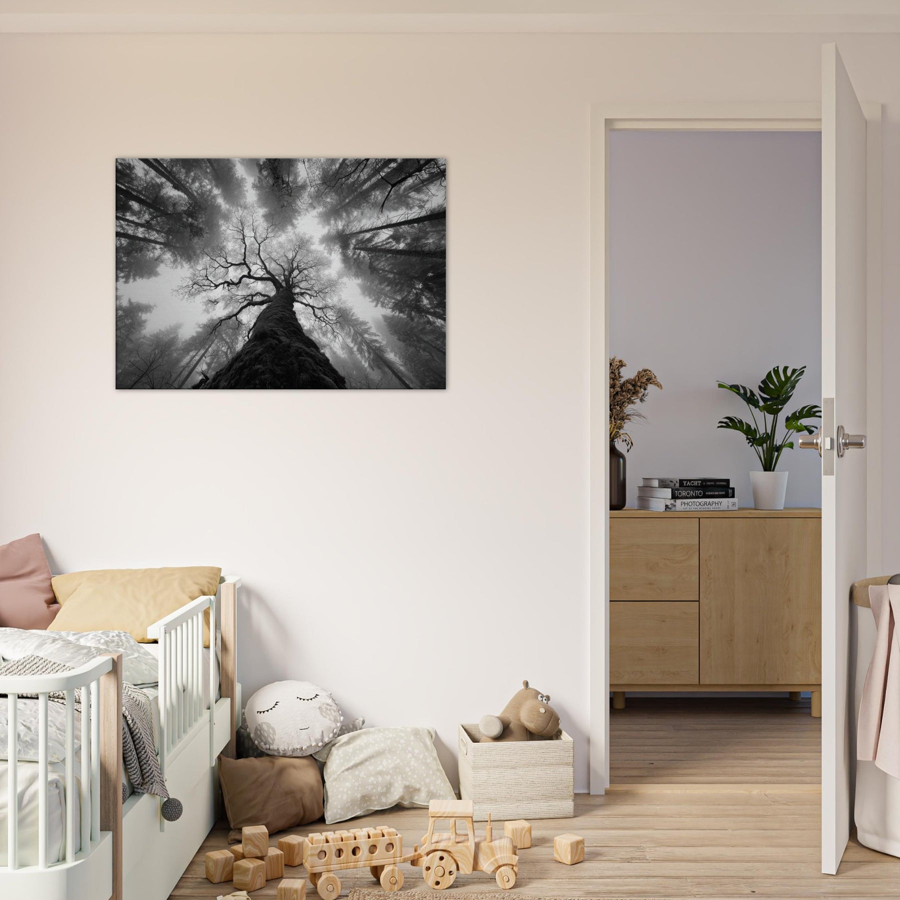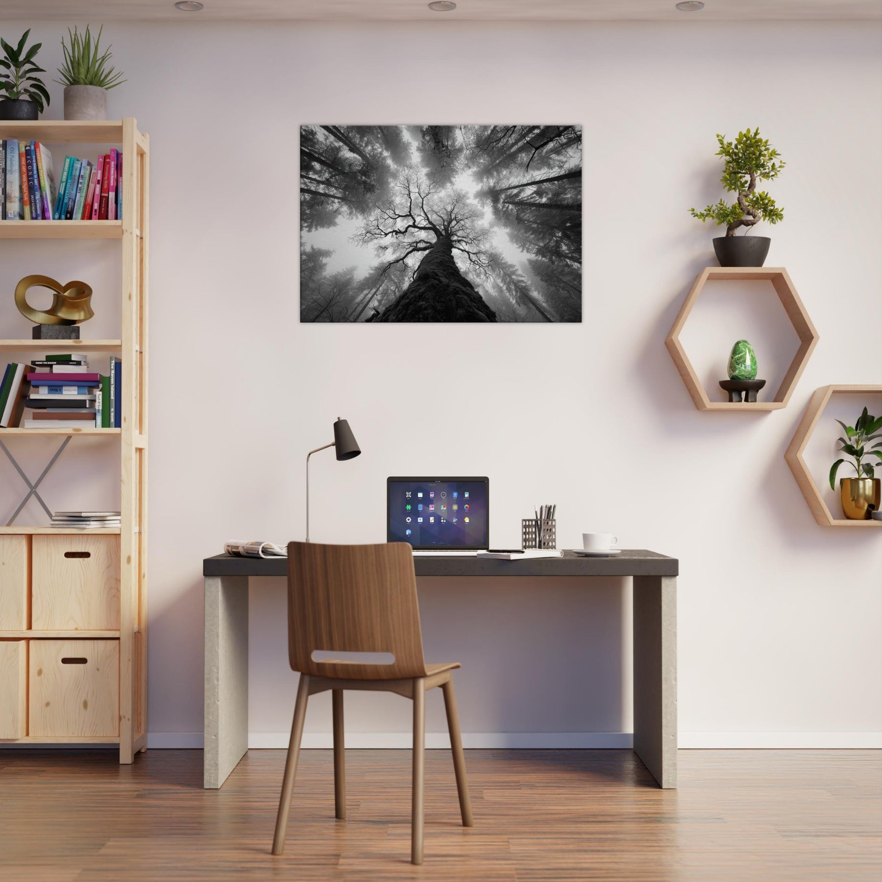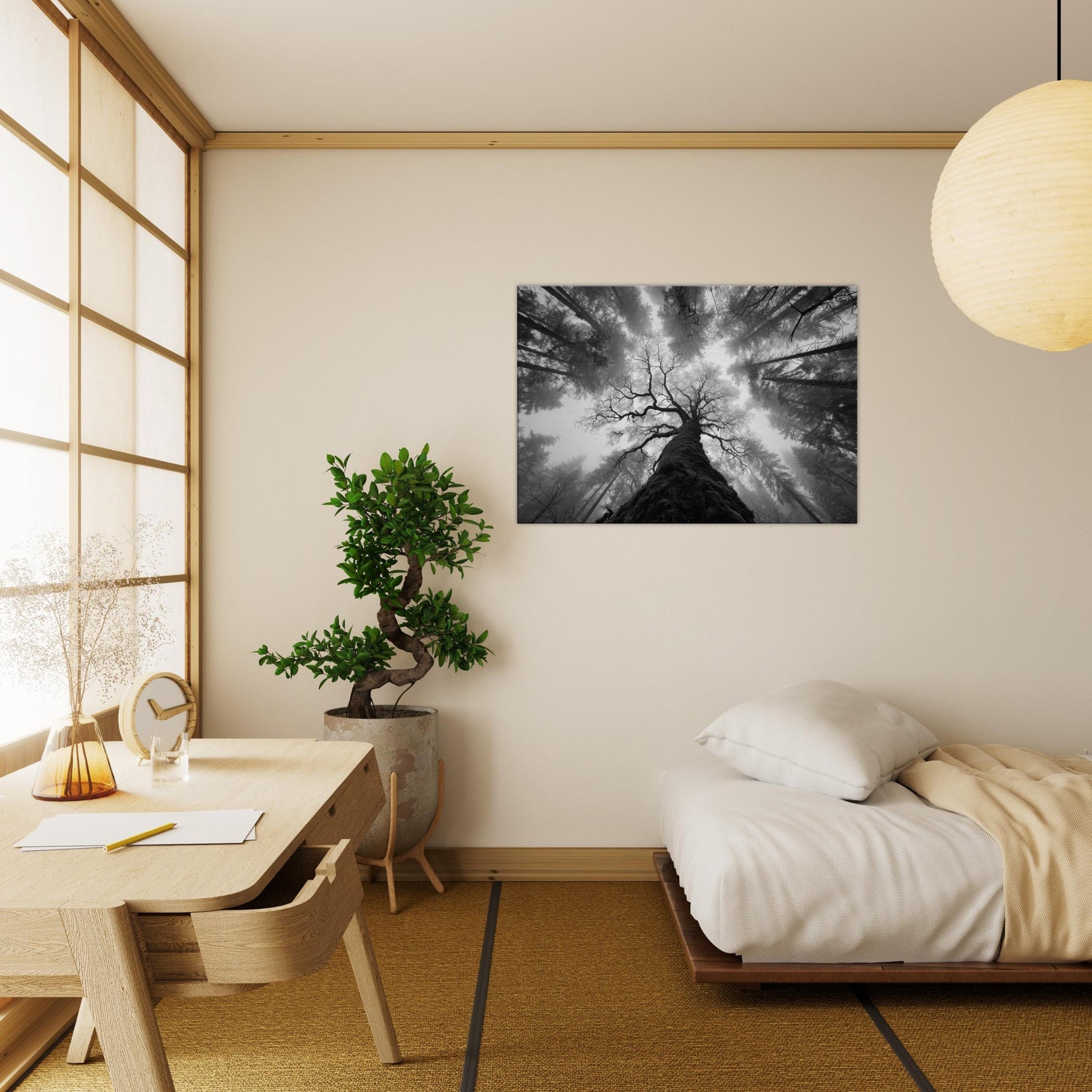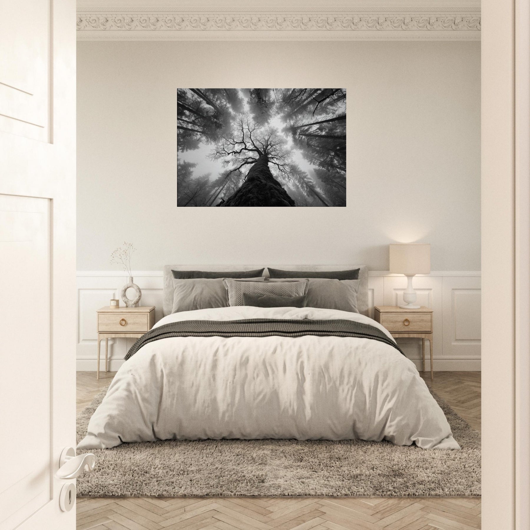 In this Boreal Forest study, a stark black and white leans into your space with quiet grandeur. The upward perspective invites the eye to travel along a sturdy trunk and out toward an ethereal canopy, where fog shows every branch in exquisite silhouette. It anchors a living room with calm, contemplative energy, elevating corners with timeless nature and a humane, tactile stillness that invites slow mornings and thoughtful evenings.