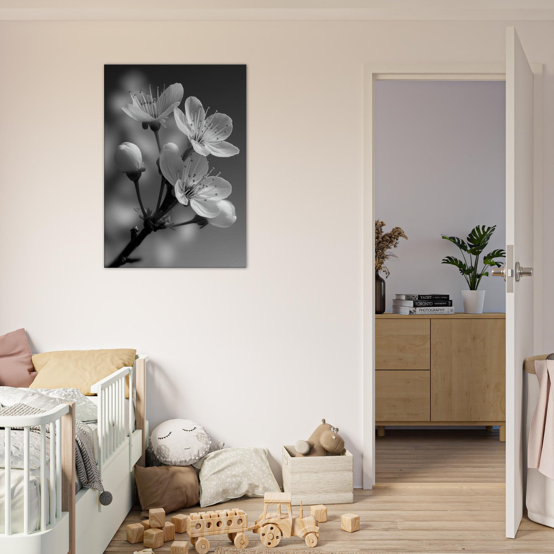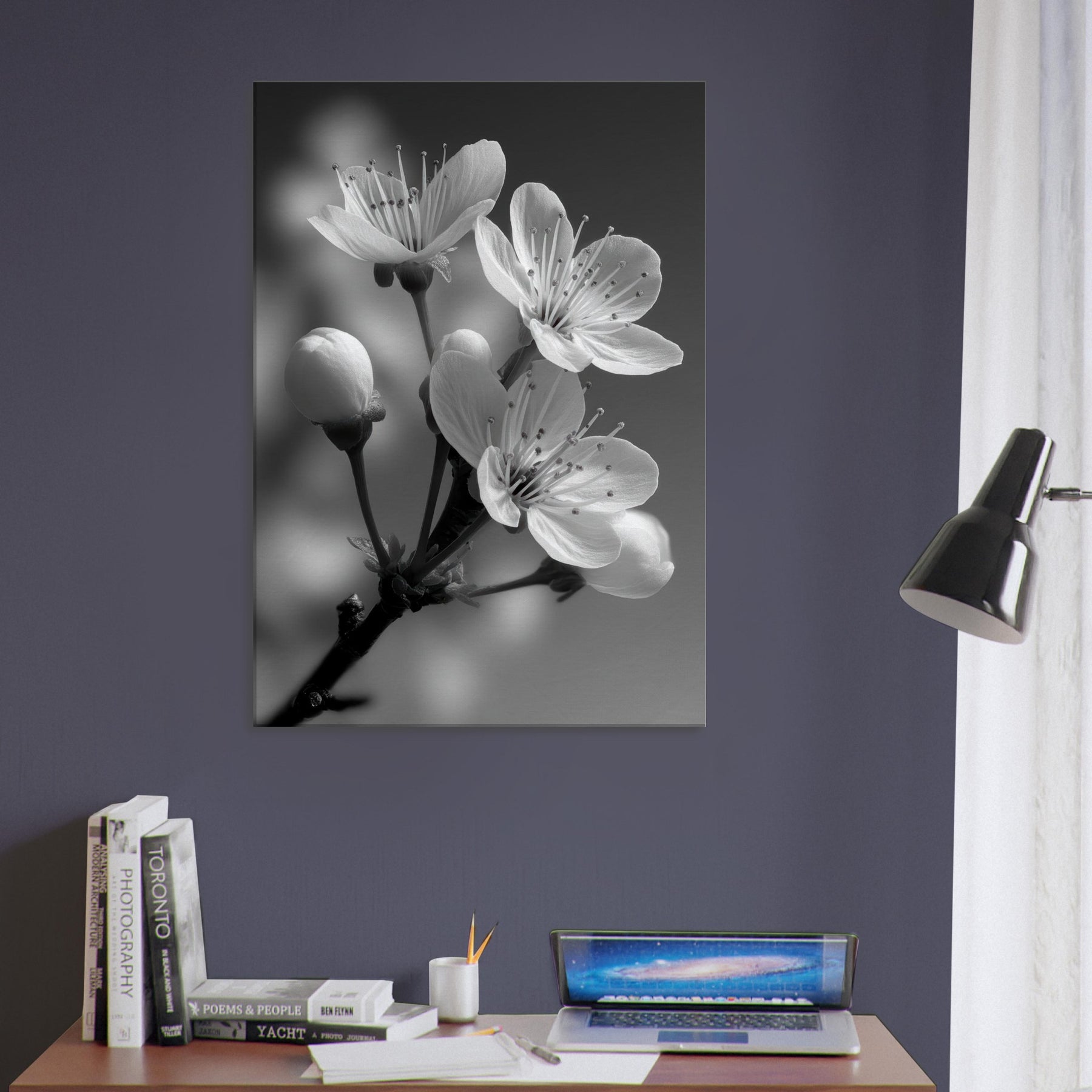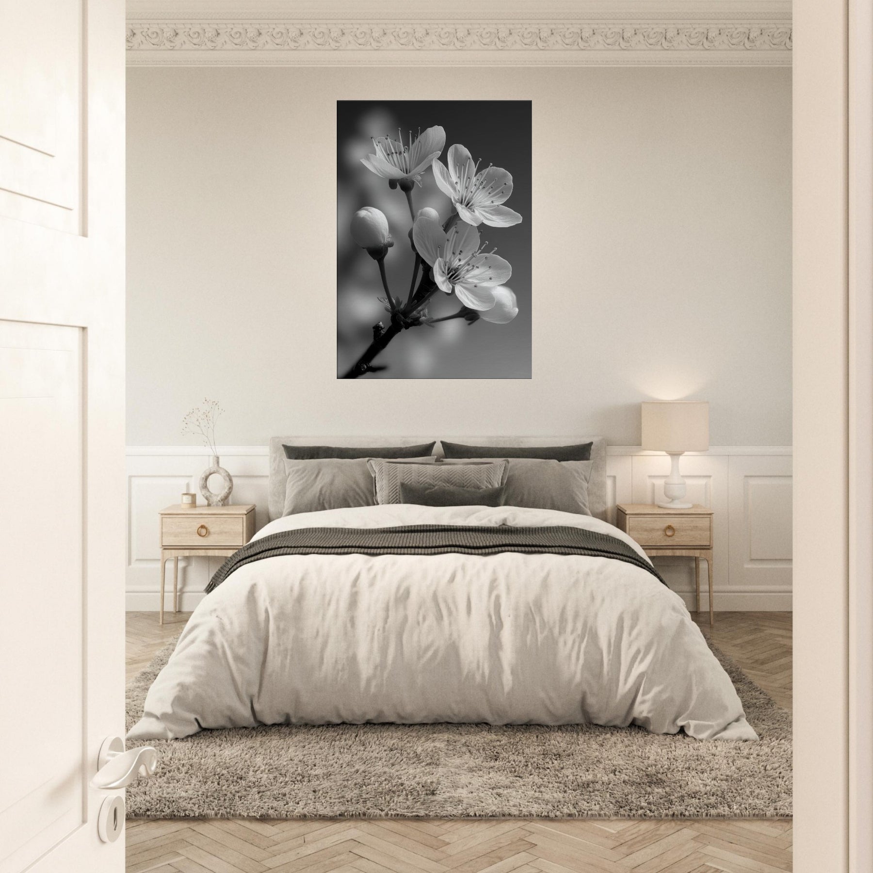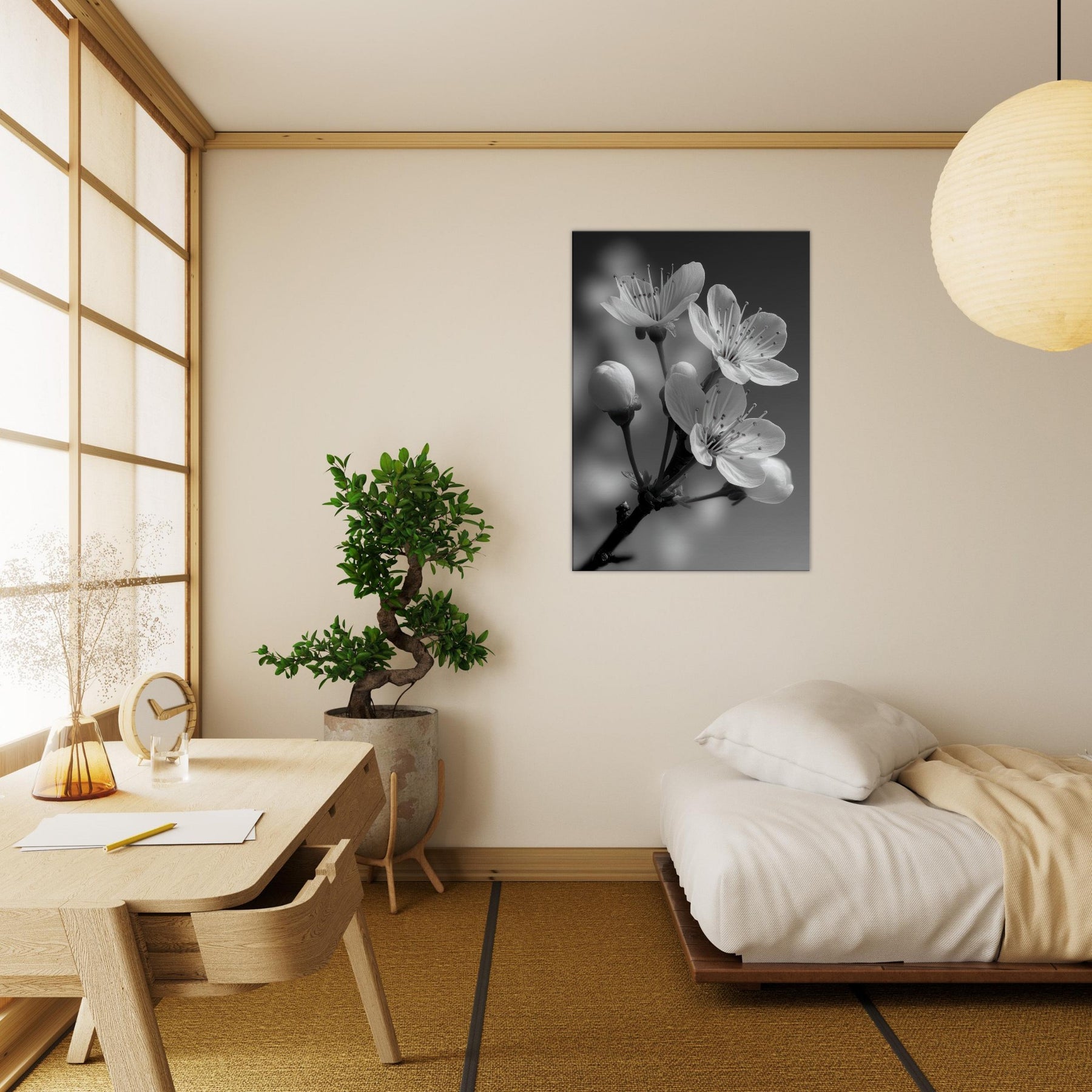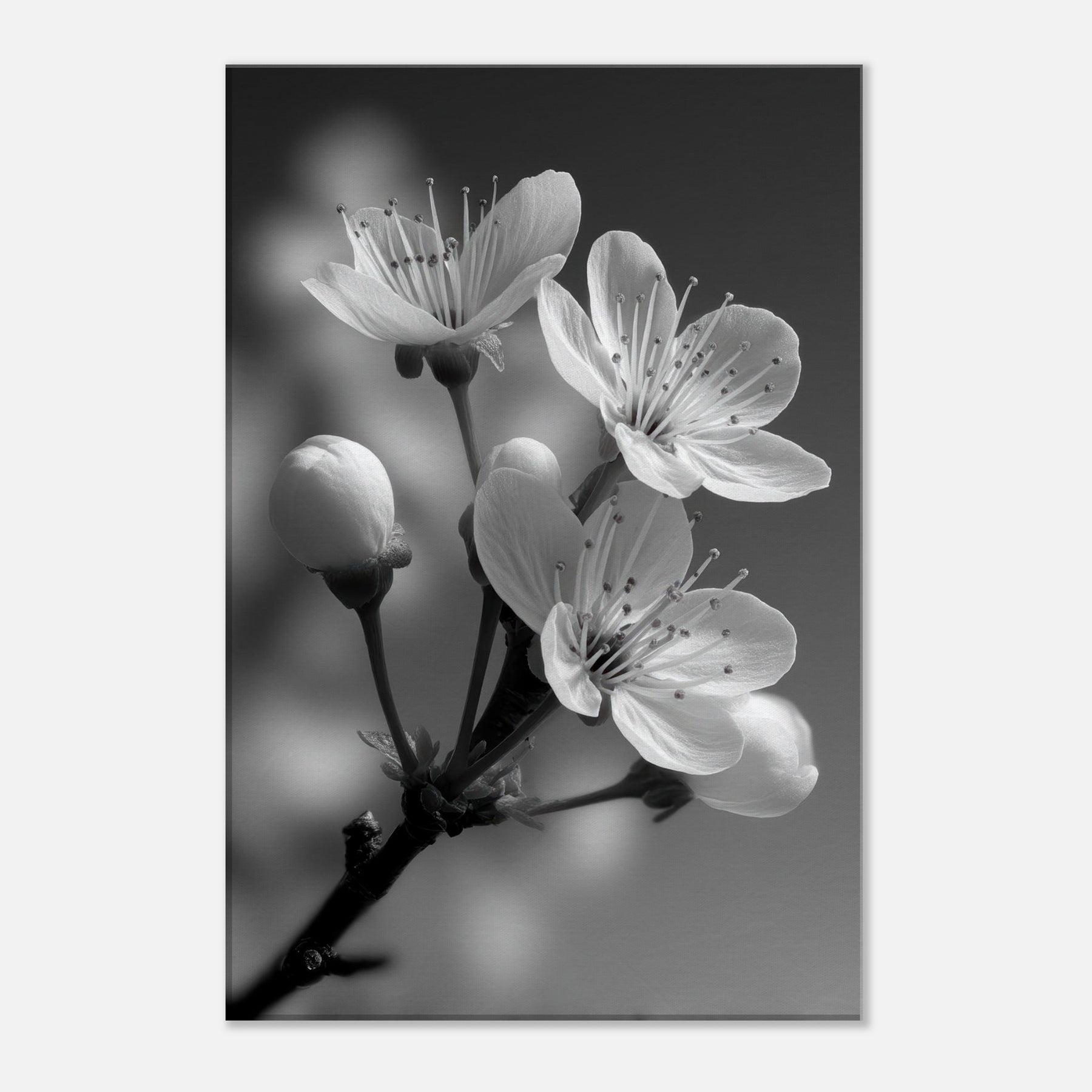 Plum Blossom presents a moment of quiet elegance in stark monochrome. The slender stems rise against a soft gradient, petals catching light with a delicate, almost whispered glow. This black and white capture invites reflection, turning everyday space into a serene sanctuary. In your living room or bedroom, the composition heightens texture and contrast, an organic counterpoint to modern furniture, a focal point that pairs with linen, wood, and metal. Plum Blossom becomes a timeless, contemplative accent.