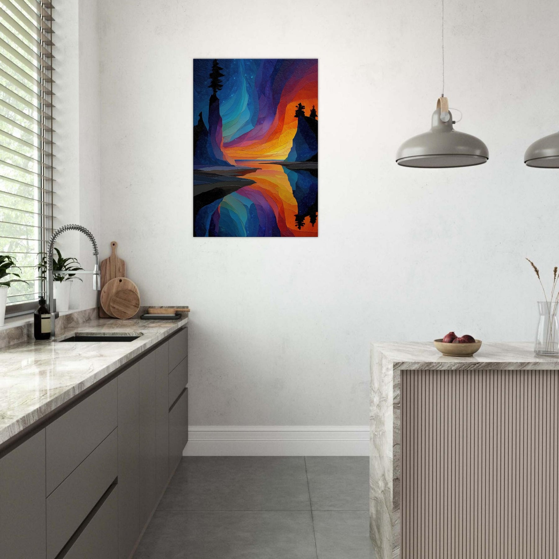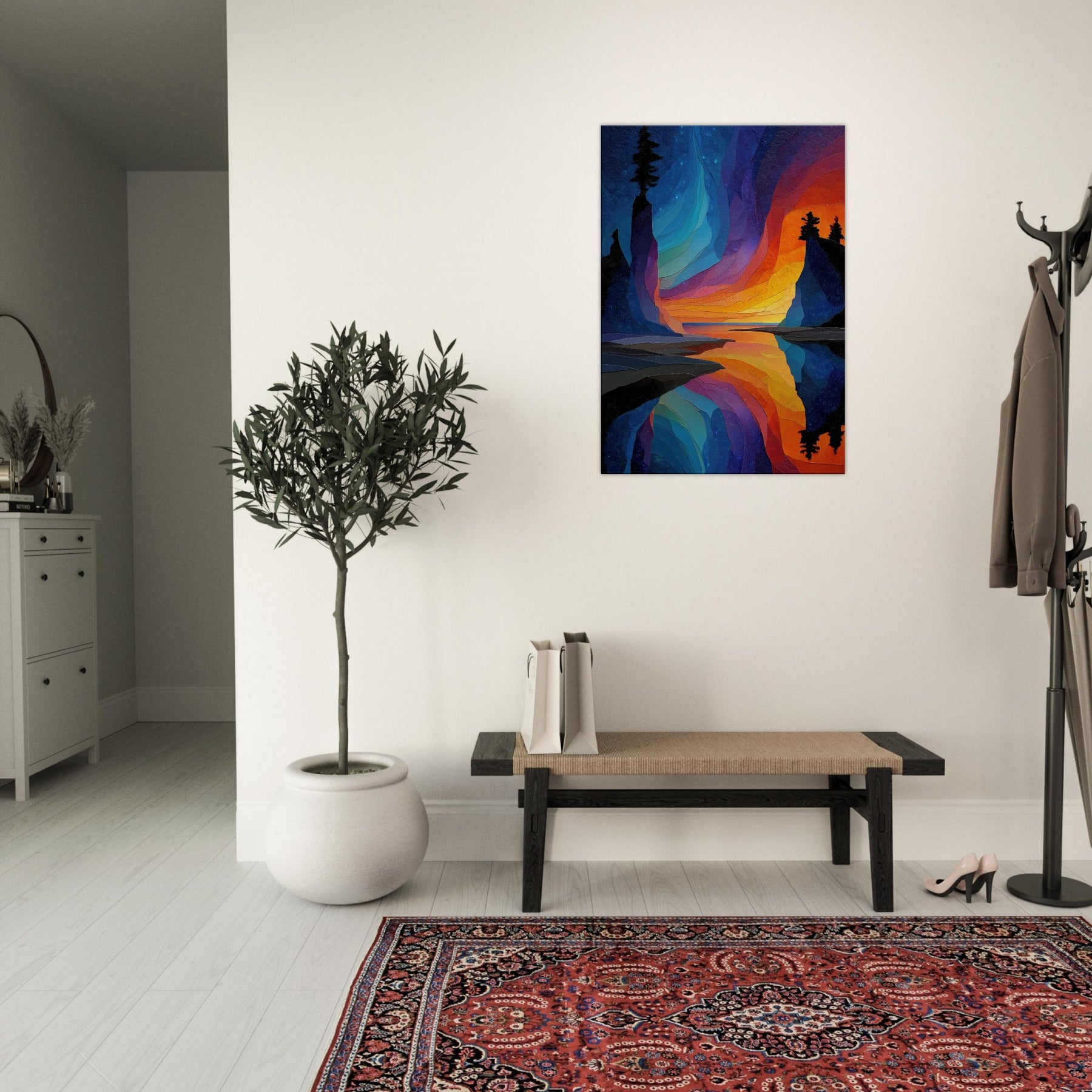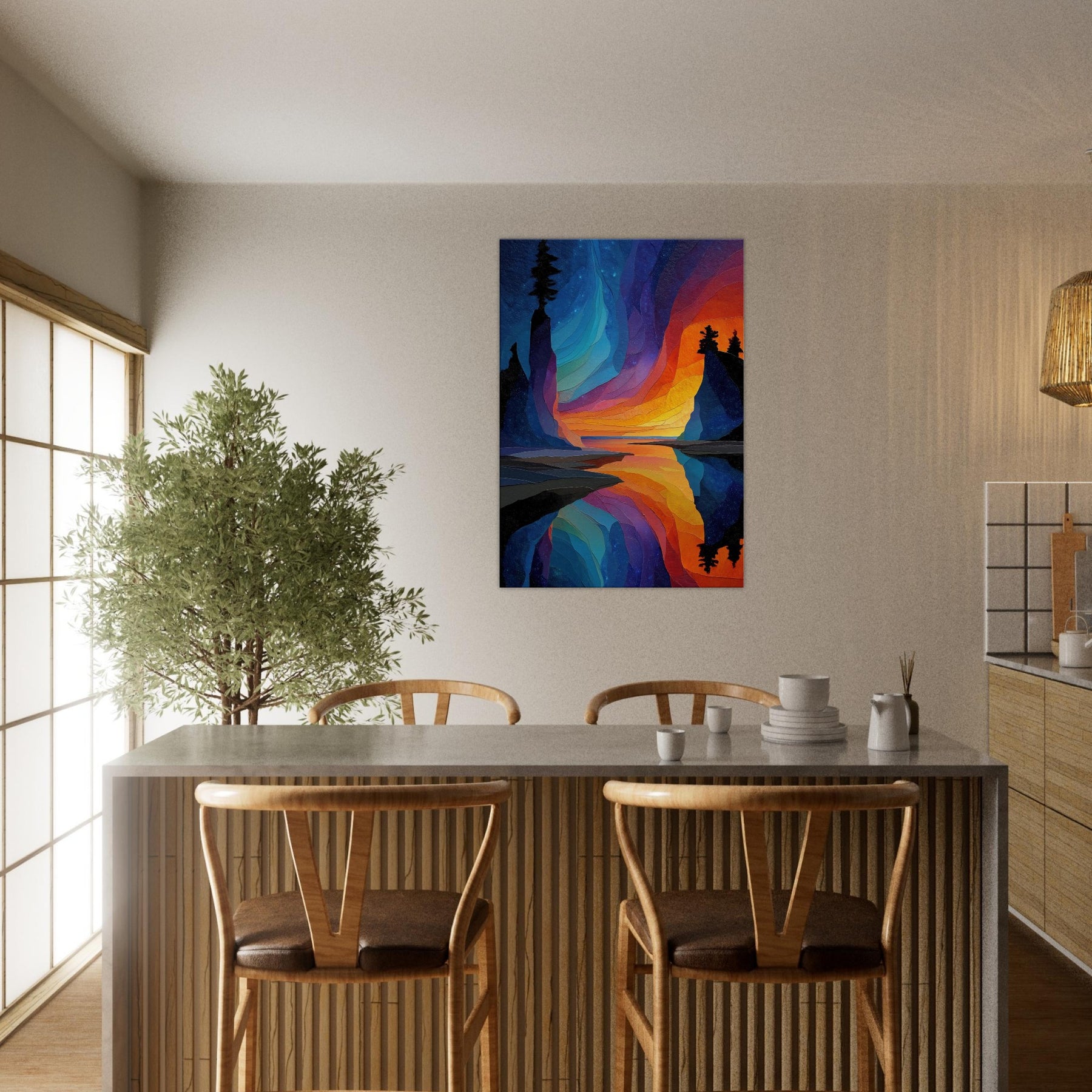 Enter a realm where light folds into color, where the Aurora Borealis becomes a quiet, radiant companion. This abstract dissolves sky and water into sweeping bands of dusk and dawn, inviting calm, wonder, and a touch of the extraordinary. Its luminous gradients glow softly in the room, shifting with the day and the mood, enhancing a living space with dreamlike depth. Perfect over a sofa or in a hallway, it creates a contemplative refuge for everyday moments.