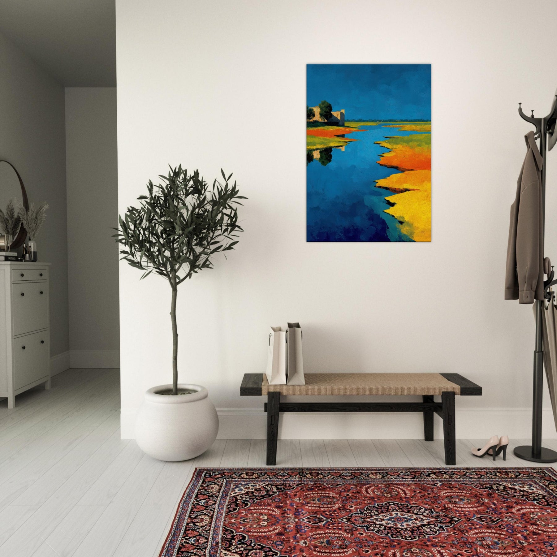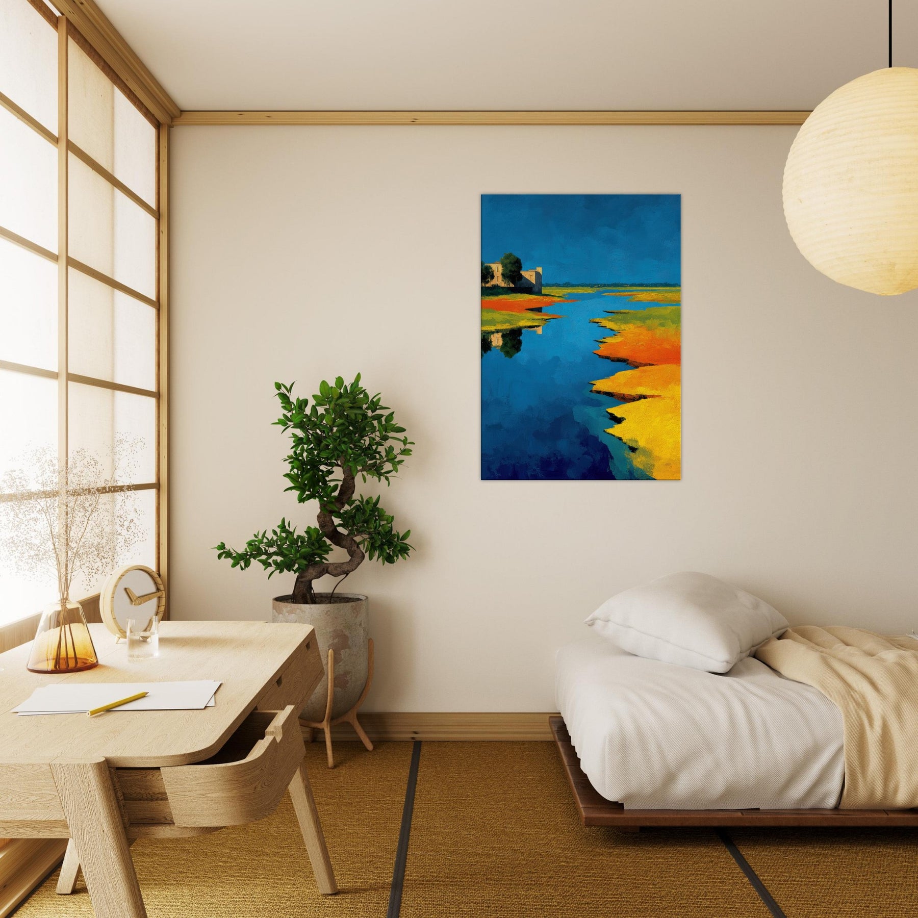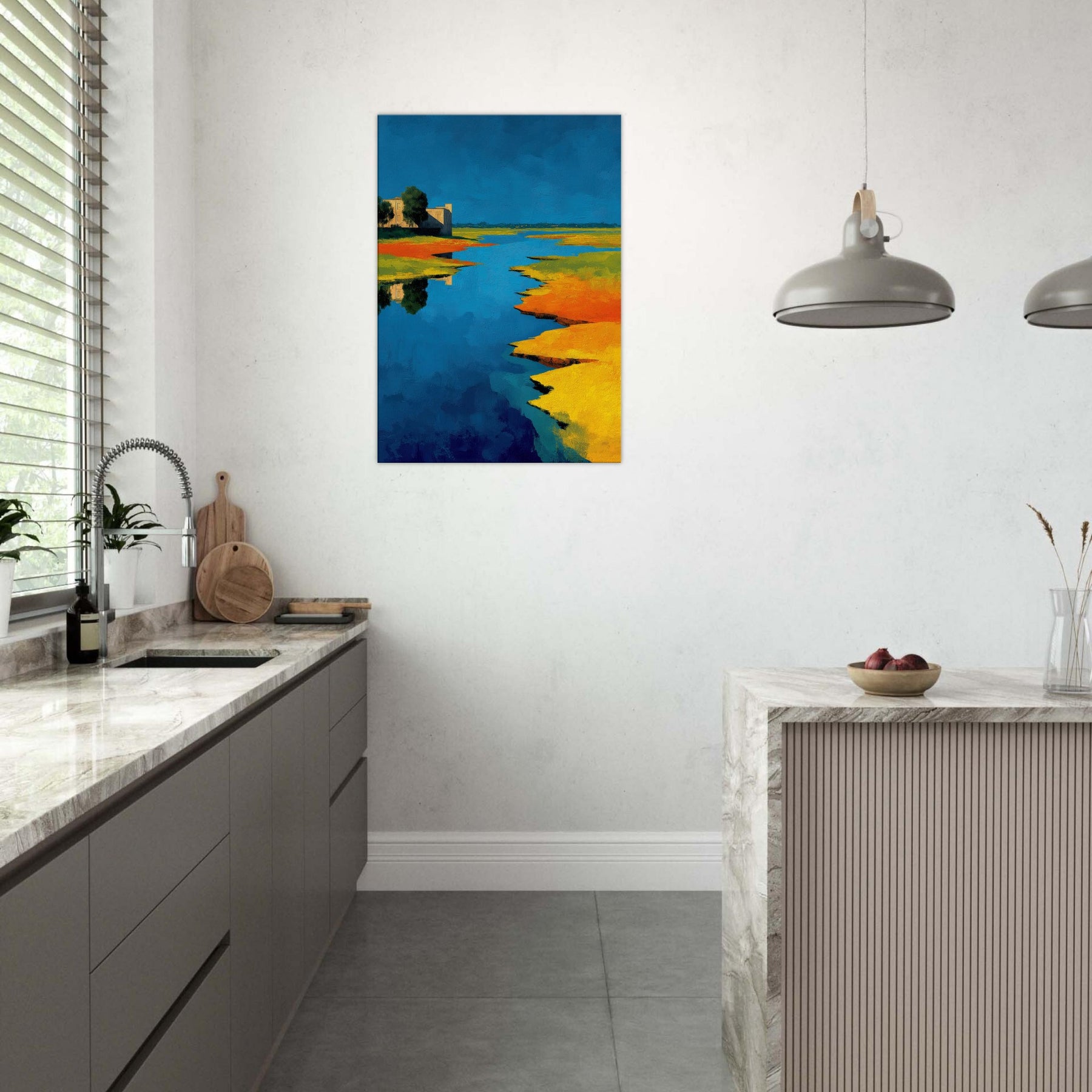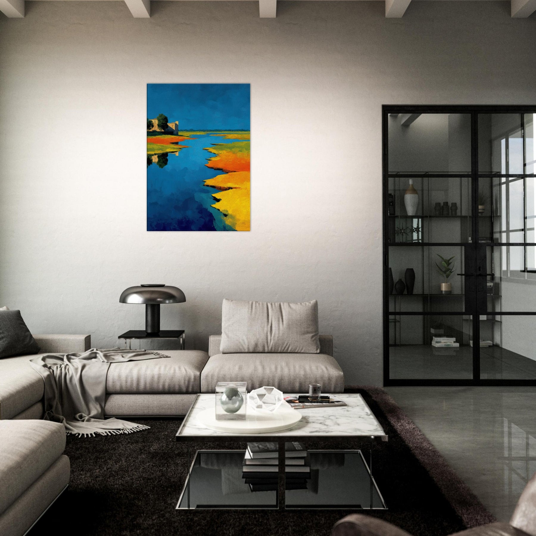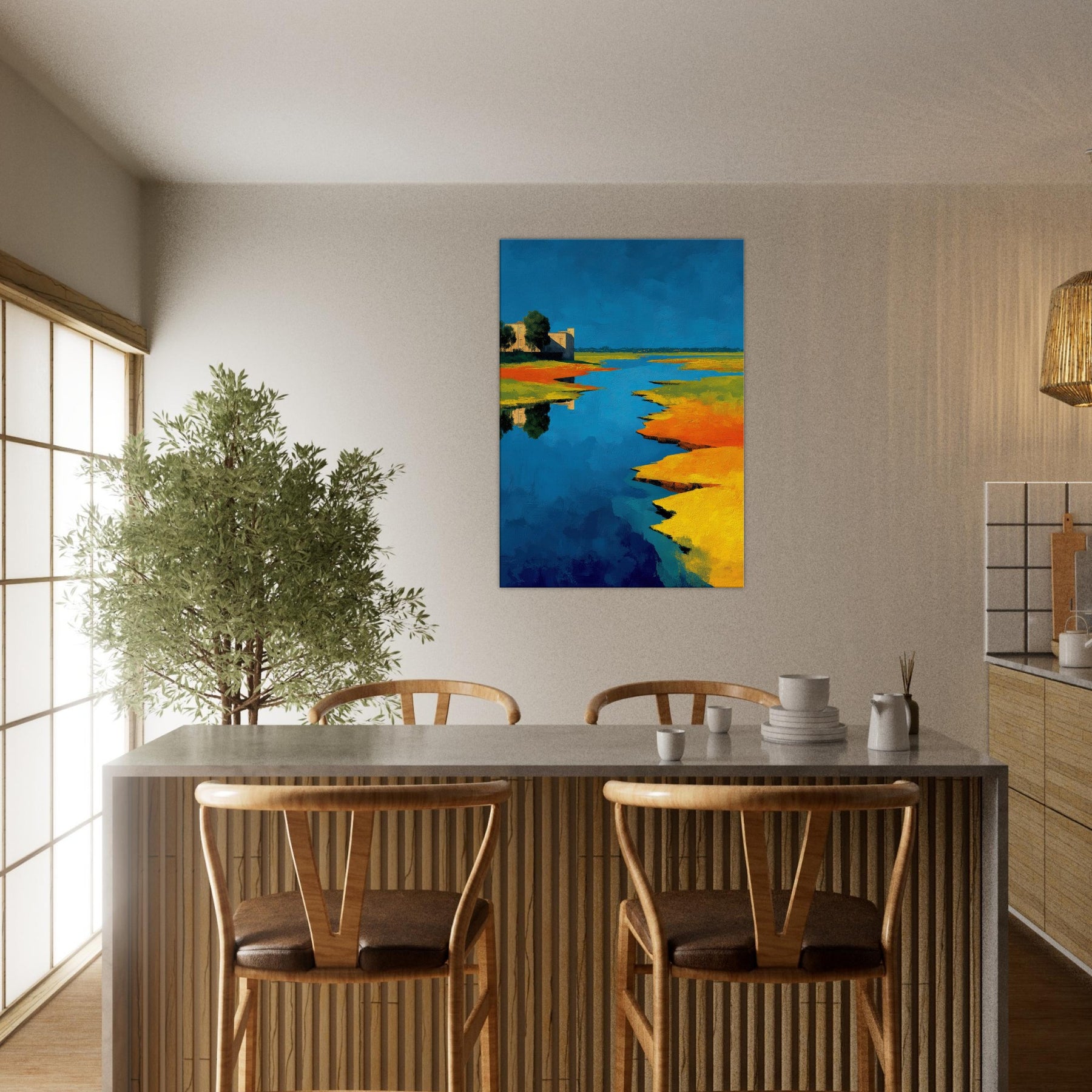 Lake unfolds in a luminous, dreamlike field where water and sky dissolve into color. This abstract invites a gentle, meditative mood: cobalt depths ripple into turquoise, while ribbons of sunlit gold kiss the shore. A lone building and tree anchor the scene, yet form softens into memory, turning space into atmosphere. Hang it in a living room, study, or hallway to invite calm, reflect light, and evoke coastal serenity without diminishing the room’s modern edge.