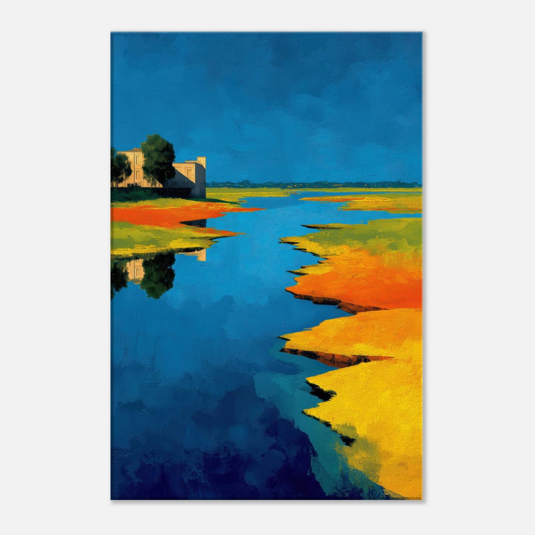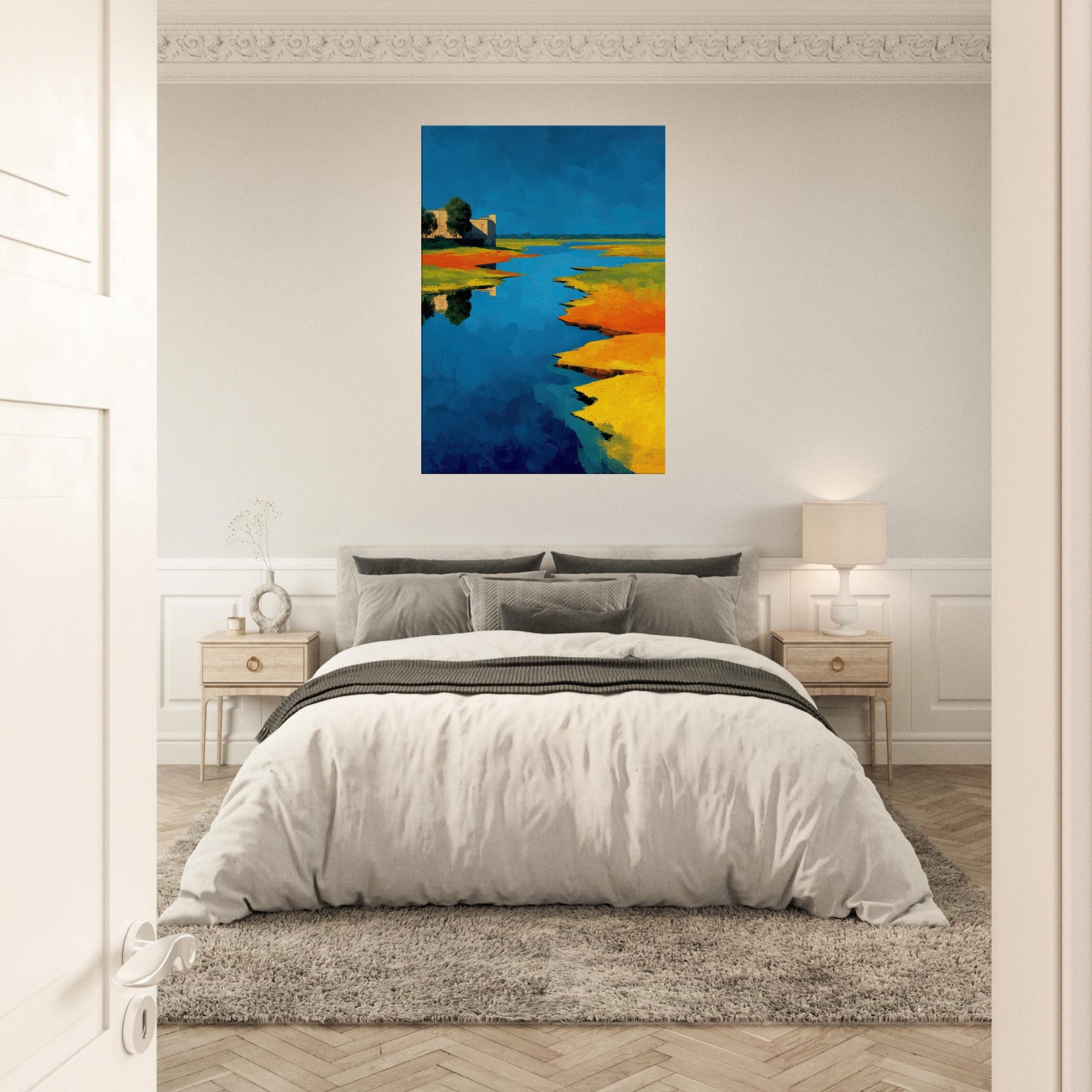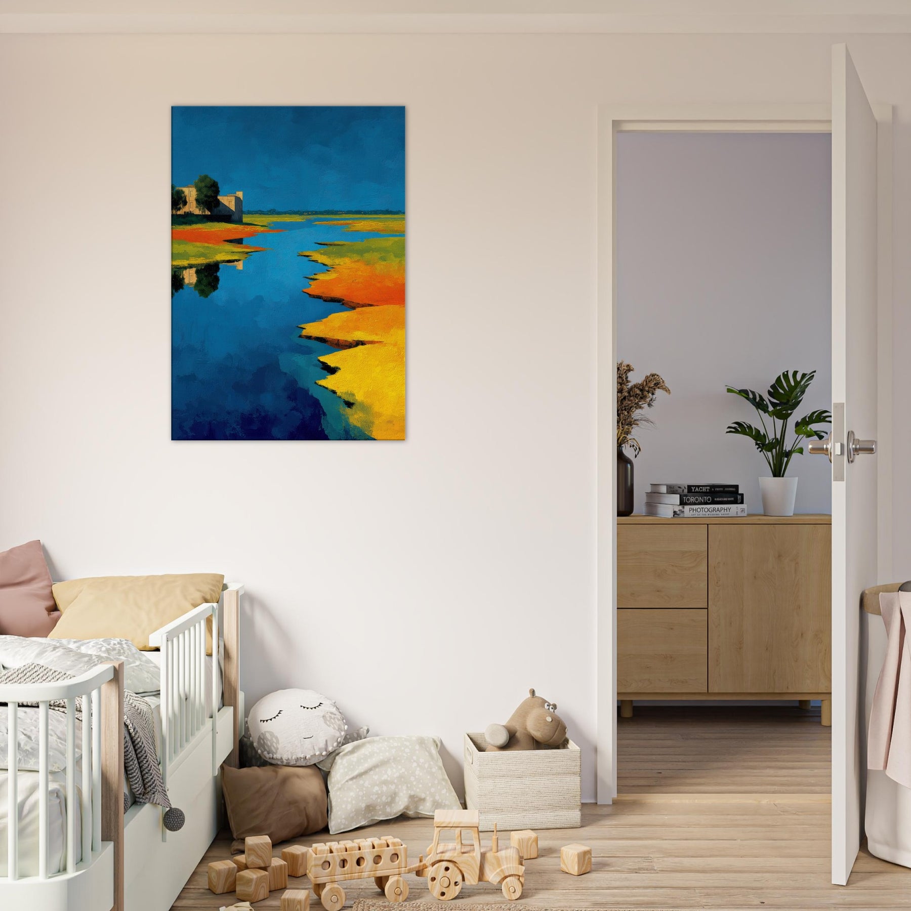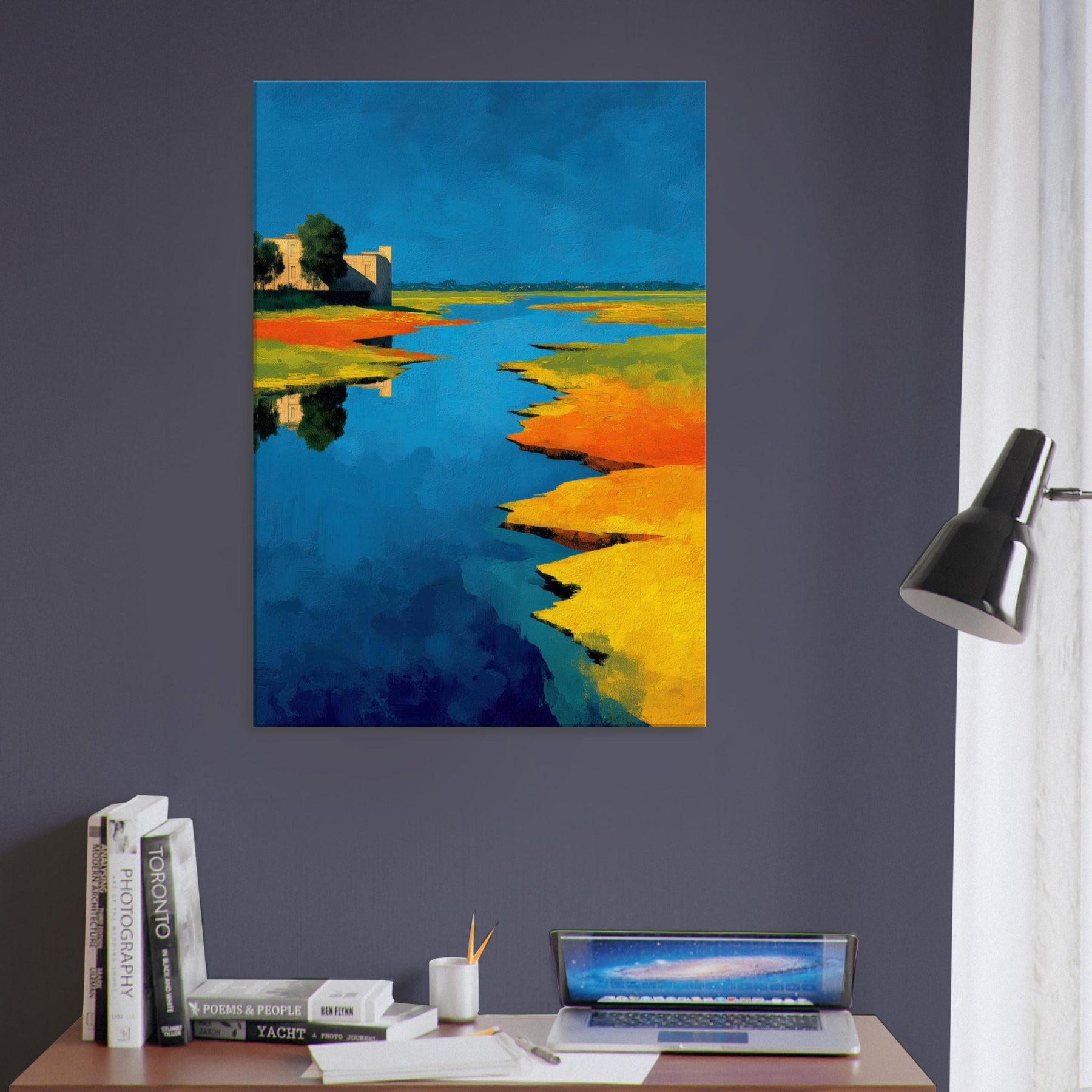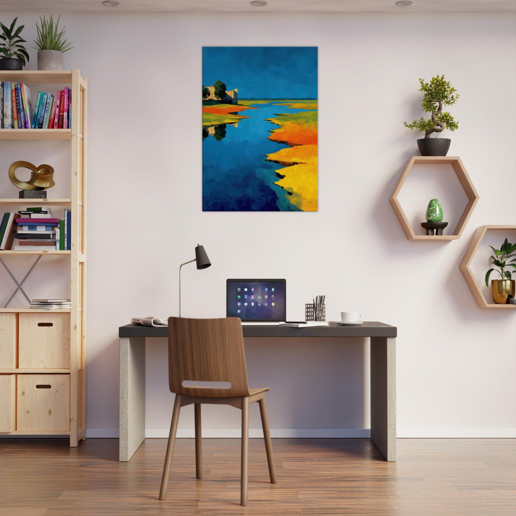 Lake unfolds in a luminous, dreamlike field where water and sky dissolve into color. This abstract invites a gentle, meditative mood: cobalt depths ripple into turquoise, while ribbons of sunlit gold kiss the shore. A lone building and tree anchor the scene, yet form softens into memory, turning space into atmosphere. Hang it in a living room, study, or hallway to invite calm, reflect light, and evoke coastal serenity without diminishing the room’s modern edge.