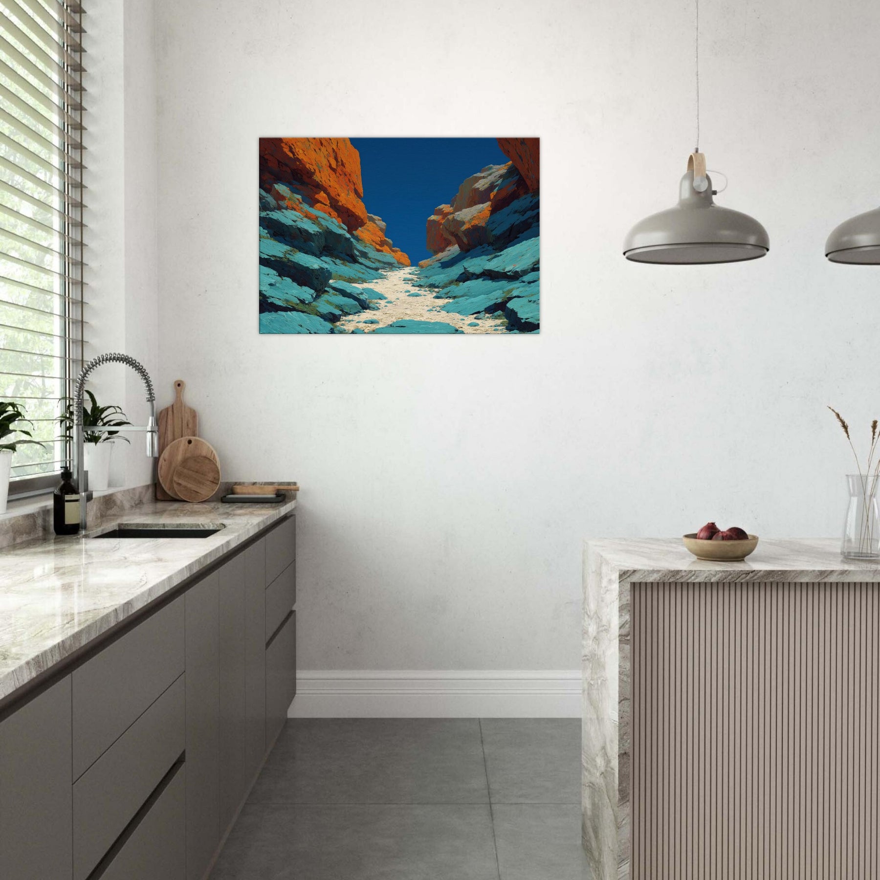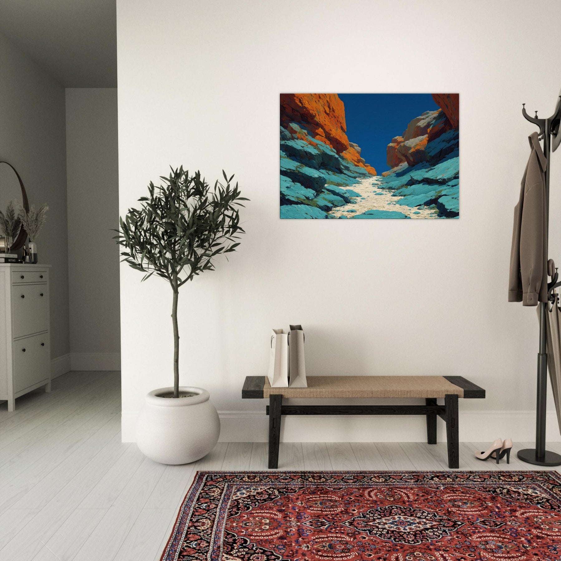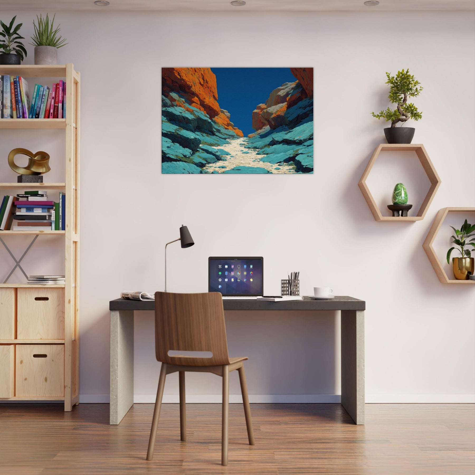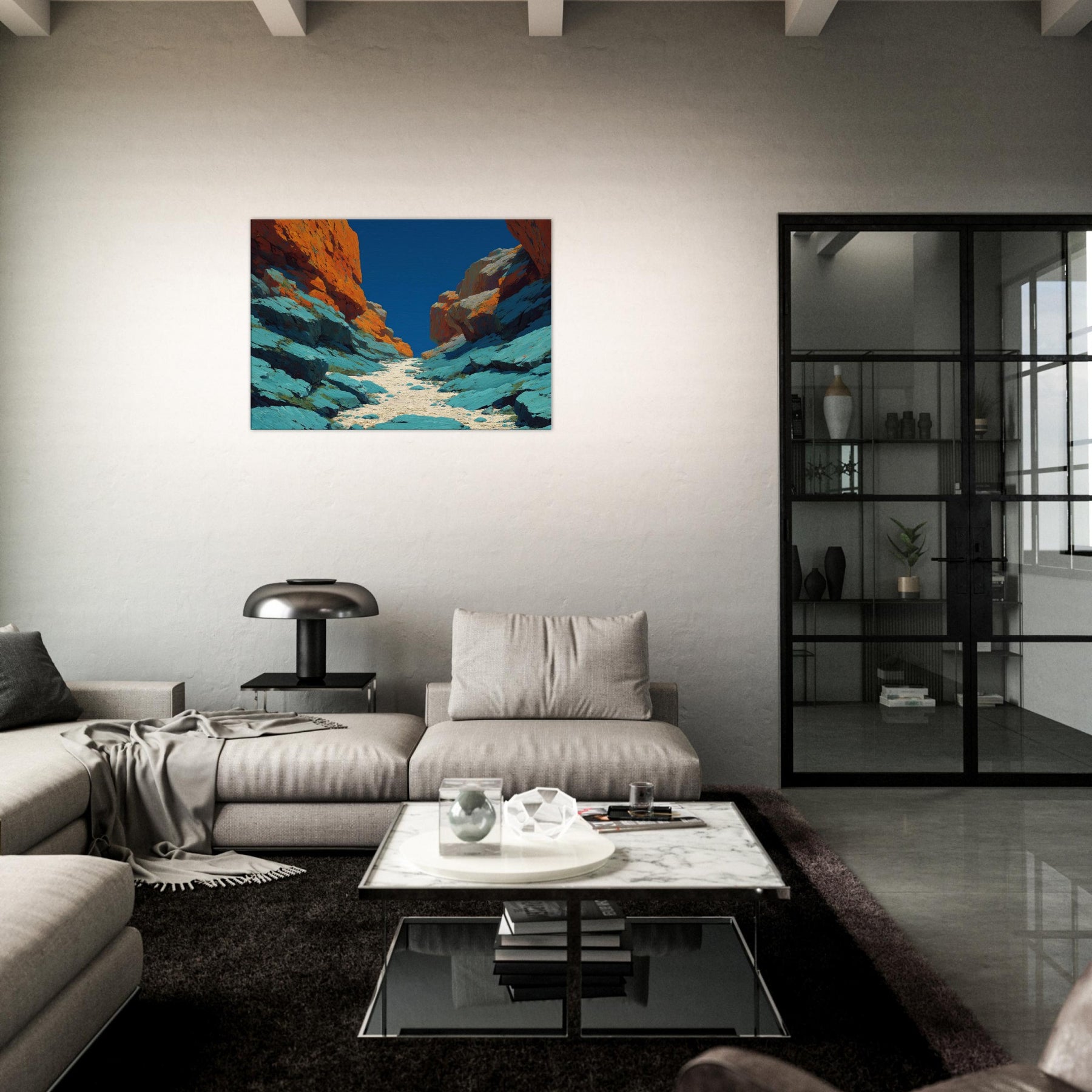 Step into a sunlit chasm where Canyon walls unfold in bold, mineral tones. This abstract hums with heat and quiet, inviting your space to breathe and dream. The turquoise crevices contrast with ember orange ridges, catching the light like a slow sunrise. The texture like strokes evoke weathered sandstone and shifting shadows, turning a wall into a doorway to the outdoors. Perfect for a living room or study, it frames conversation with nature’s grandeur while preserving a calm, sculptural elegance you can’t help but feel.