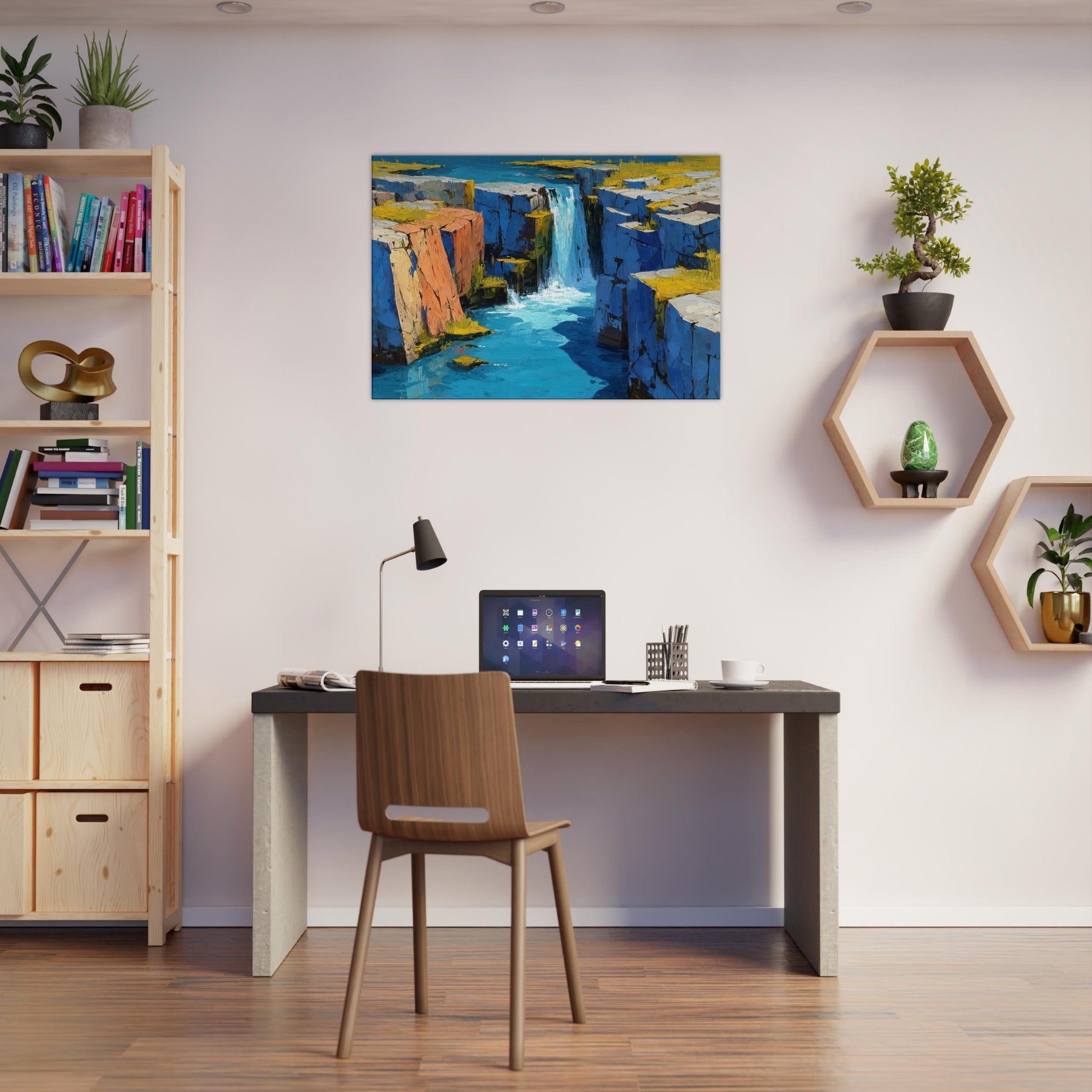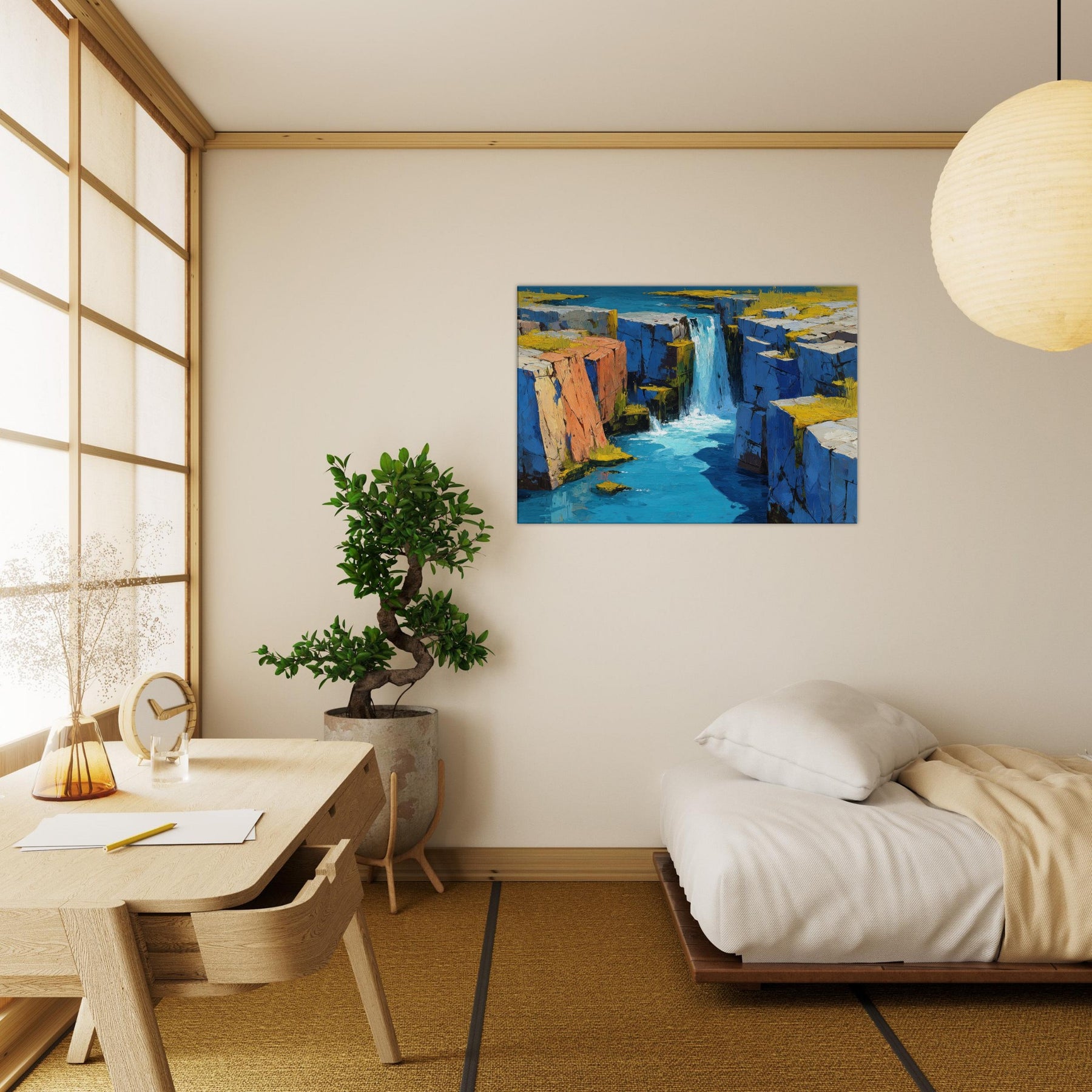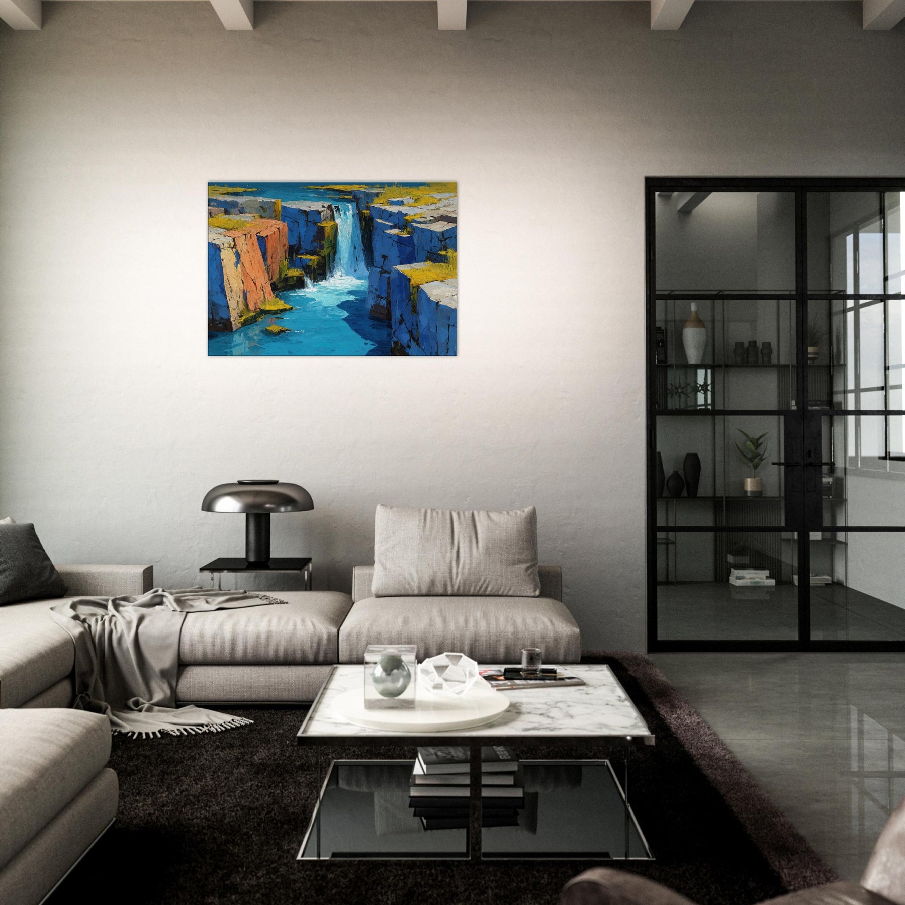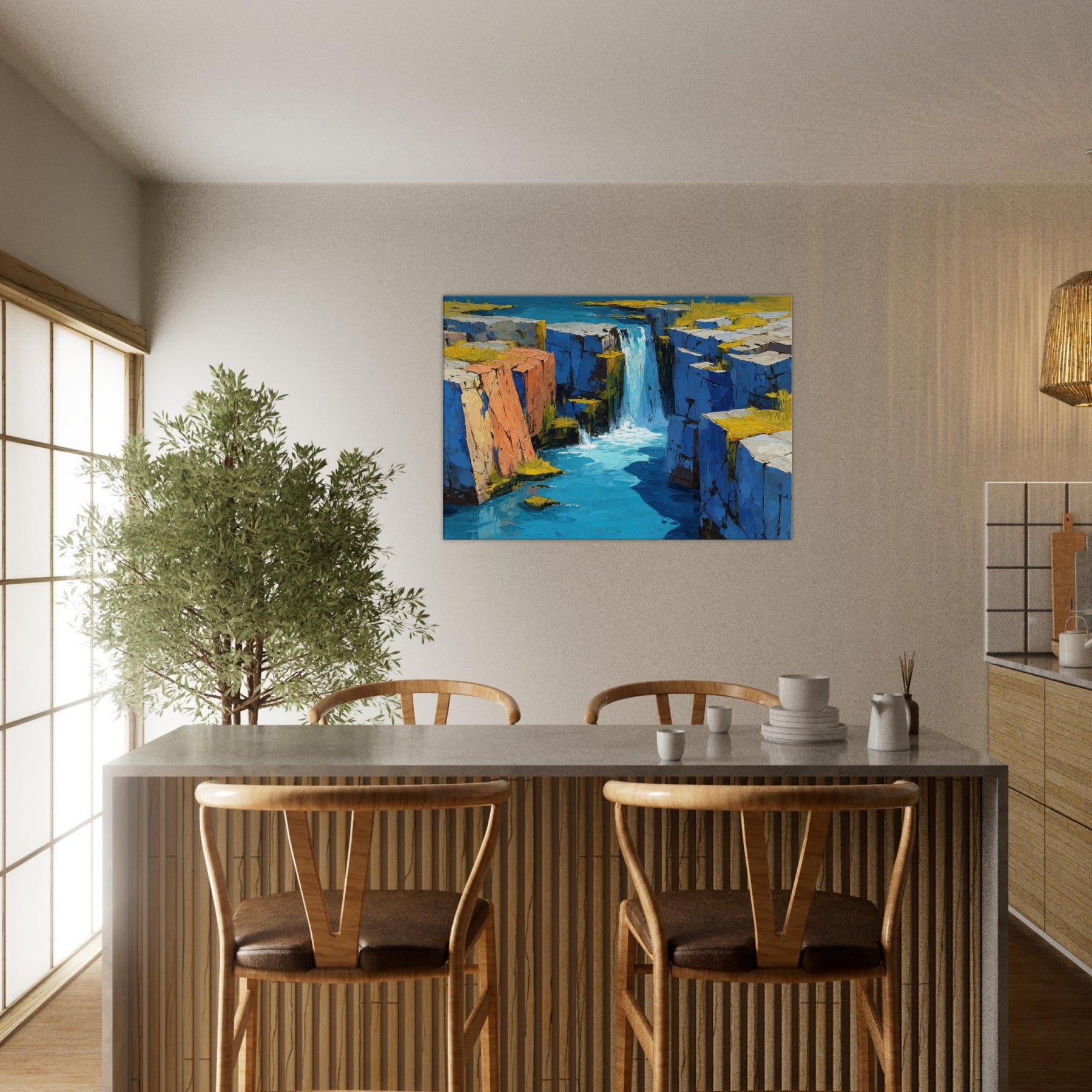 Waterfall drapes the room in momentum and mist, as abstract cliffs rise in bold blocks of blue, ochre, and teal. The Waterfall pours into a luminous pool that glimmers with movement, inviting quiet reflection. This piece turns a wall into a window its rhythm echoing in breathing space, the energy of nature softened into artful texture. In a living room or study, it anchors color, sparks conversation, and lends a serene, immersive atmosphere that makes every moment feel newly awakened.