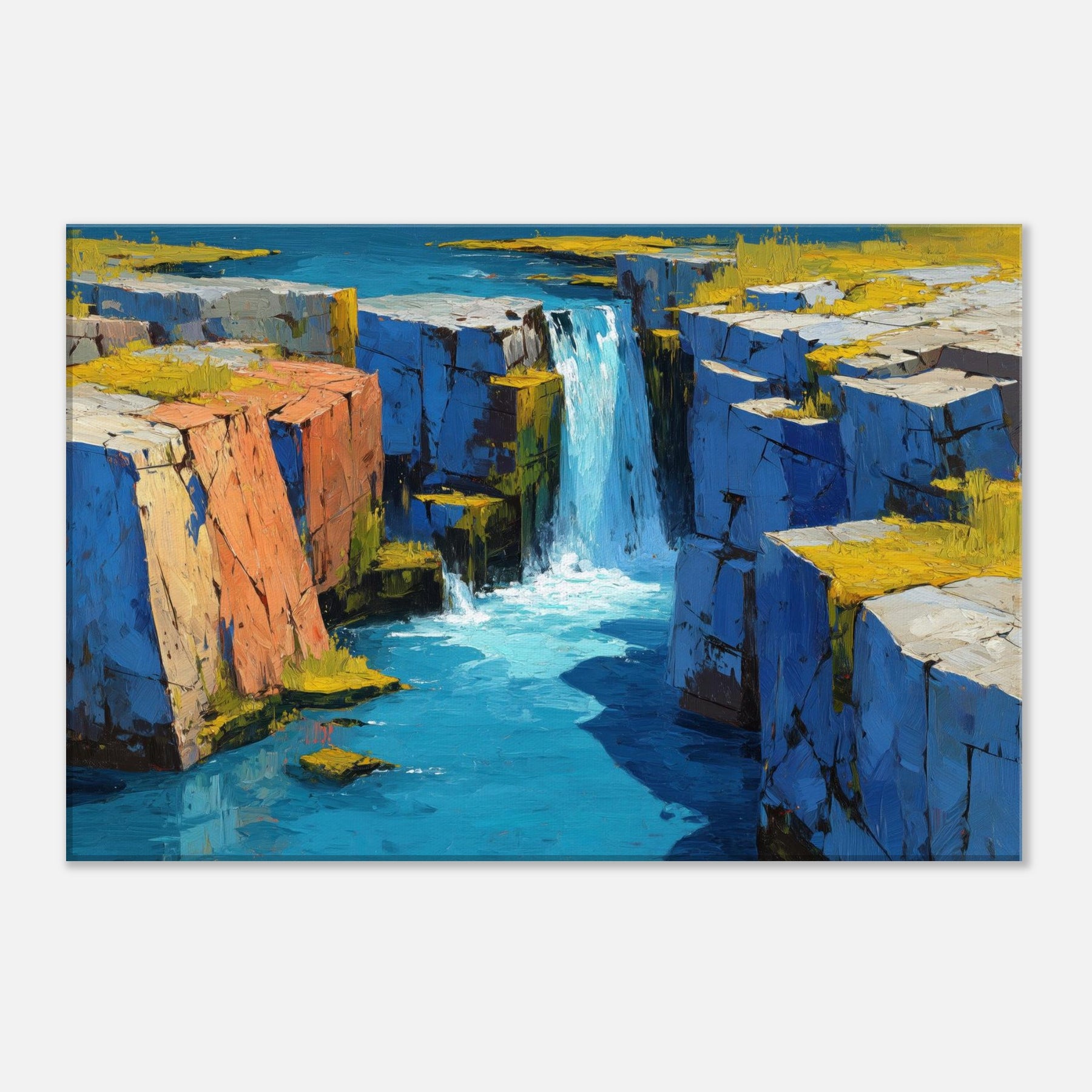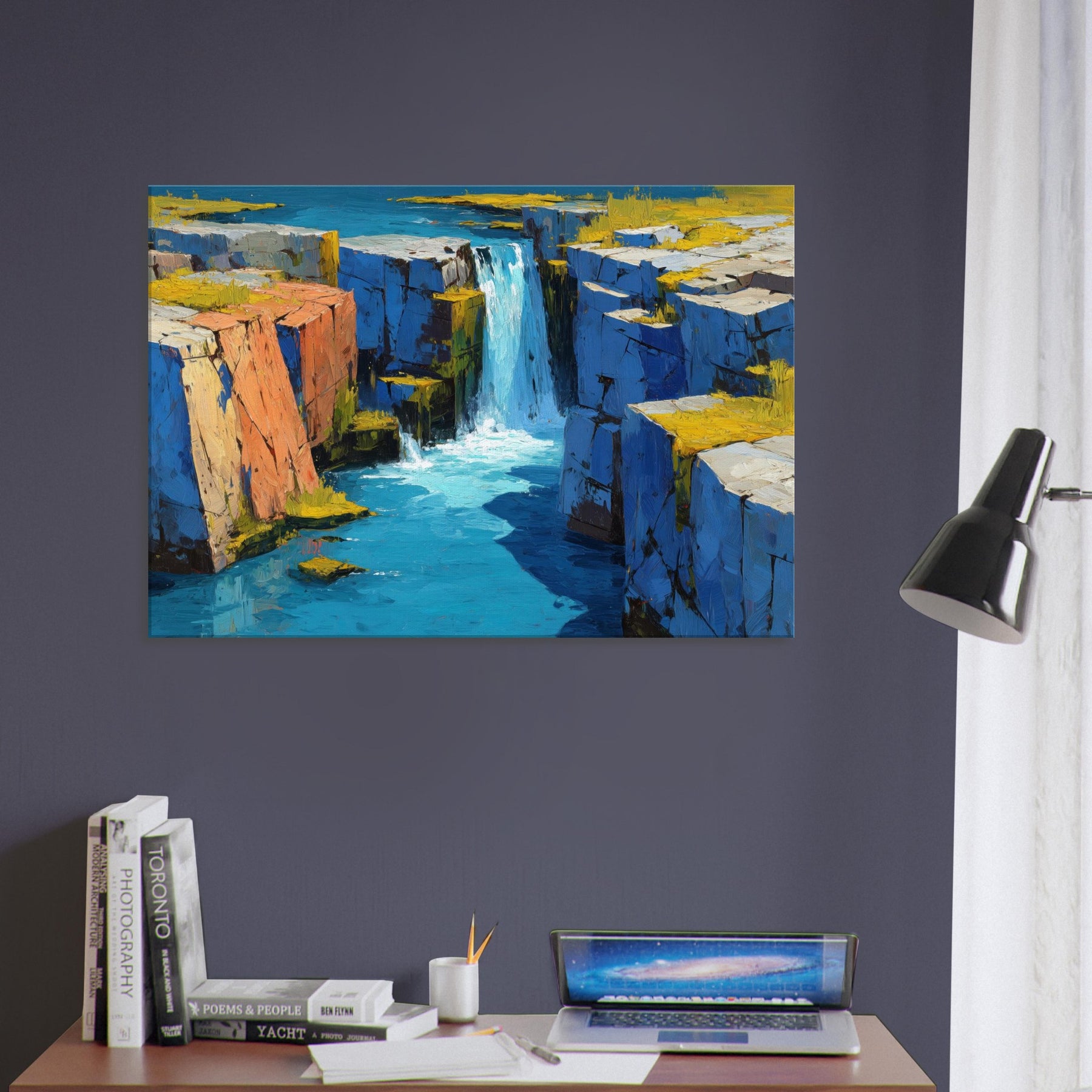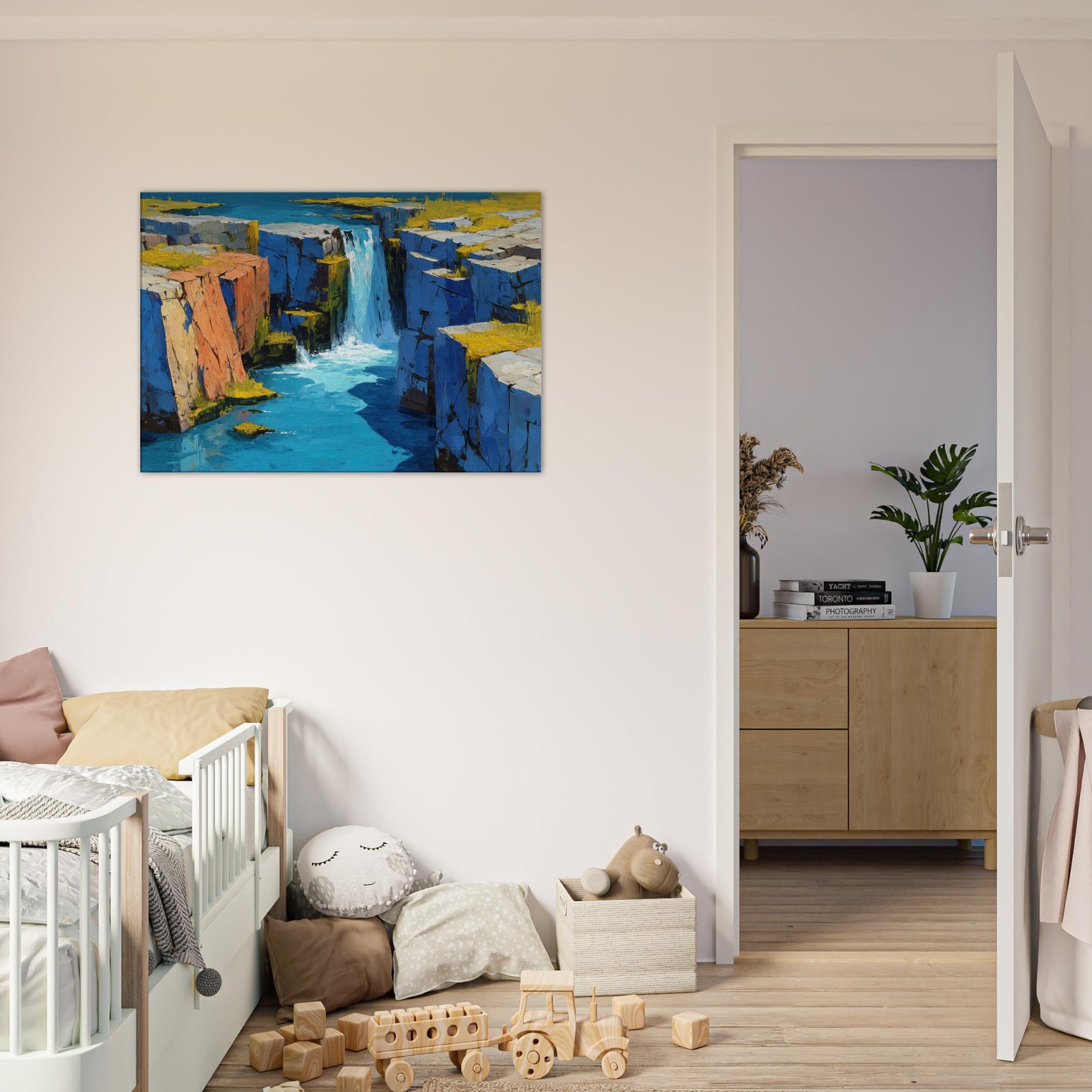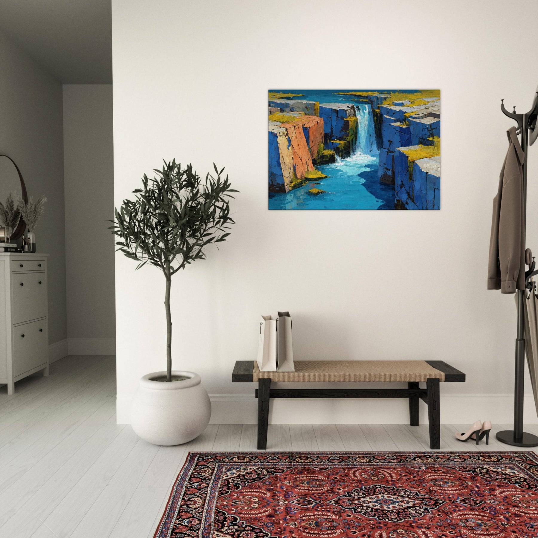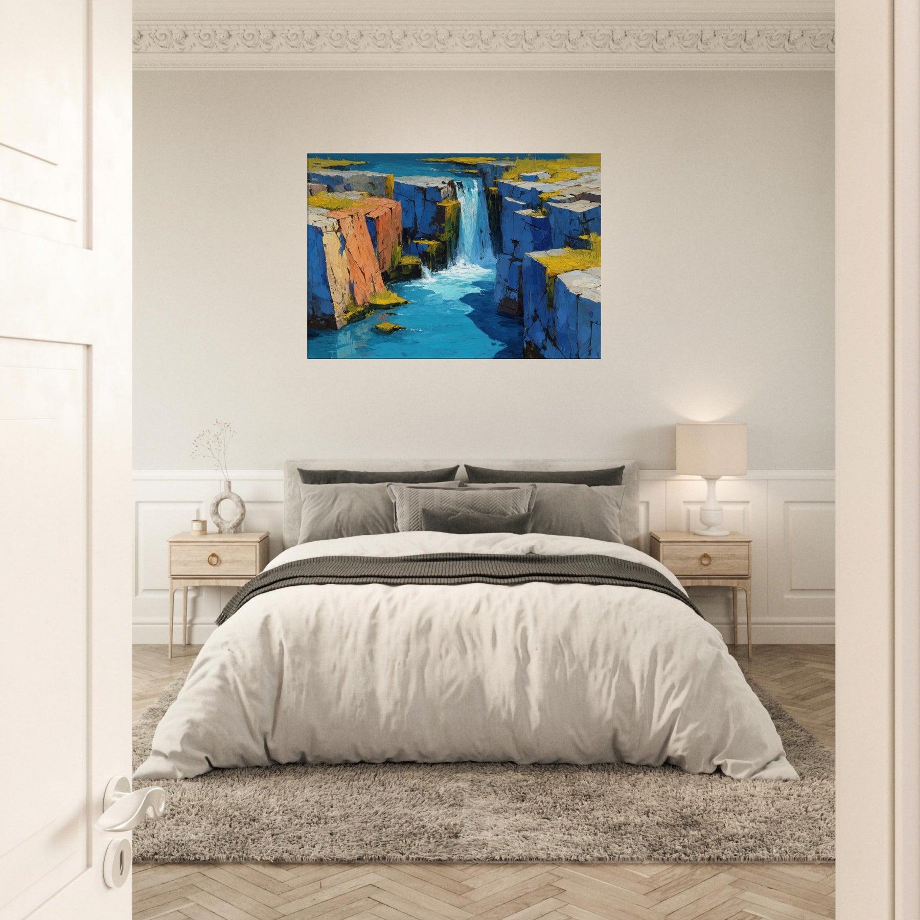Waterfall drapes the room in momentum and mist, as abstract cliffs rise in bold blocks of blue, ochre, and teal. The Waterfall pours into a luminous pool that glimmers with movement, inviting quiet reflection. This piece turns a wall into a window its rhythm echoing in breathing space, the energy of nature softened into artful texture. In a living room or study, it anchors color, sparks conversation, and lends a serene, immersive atmosphere that makes every moment feel newly awakened.