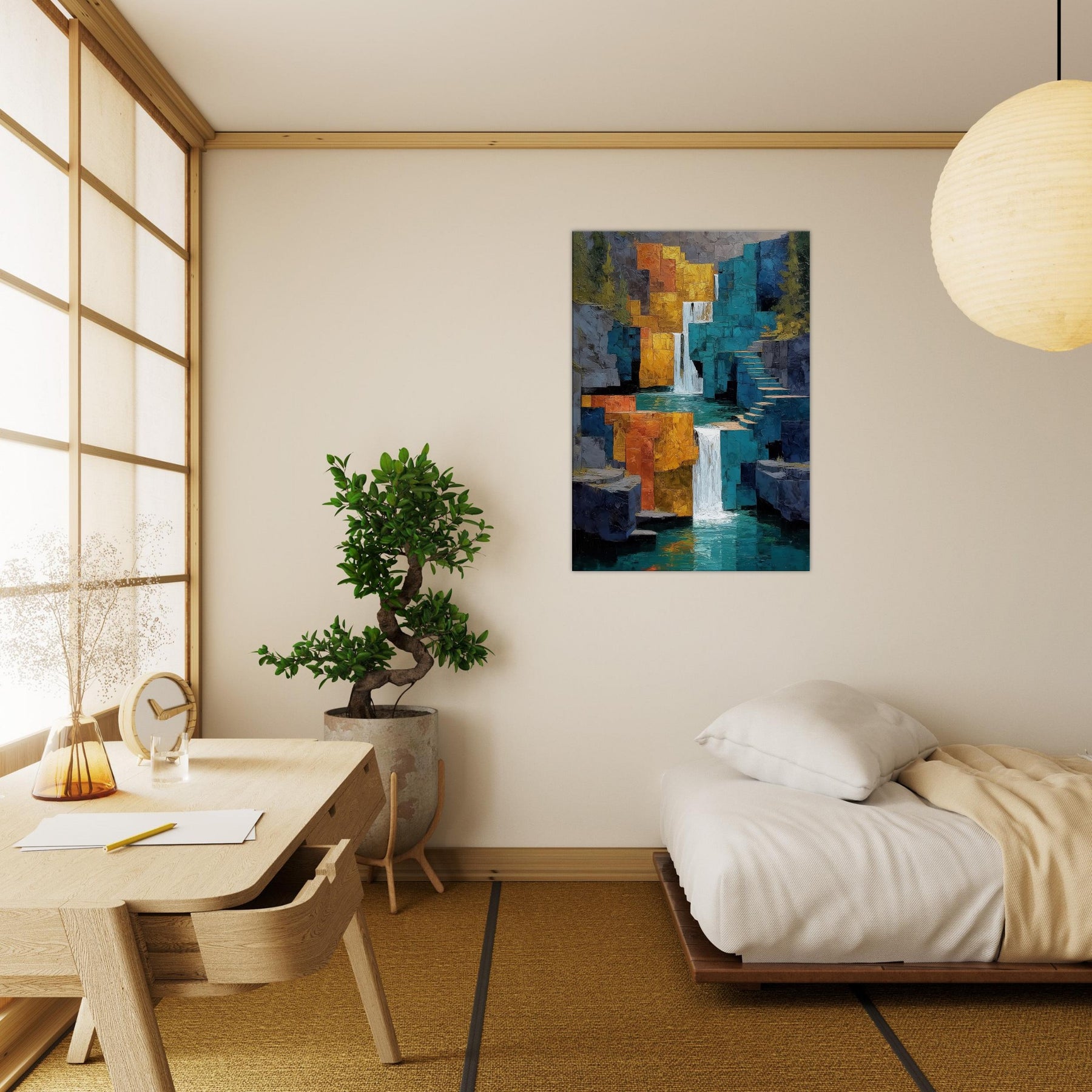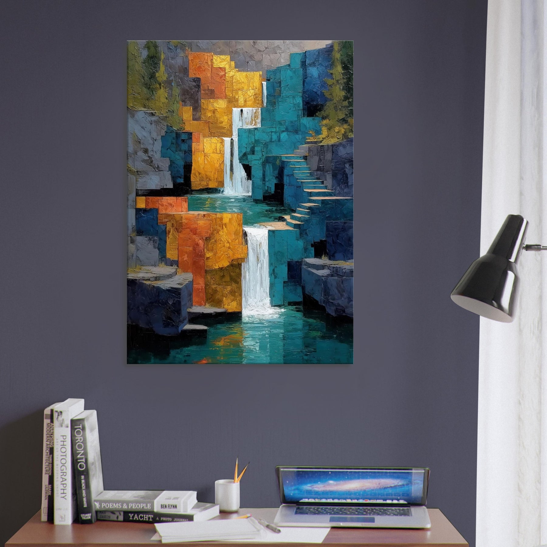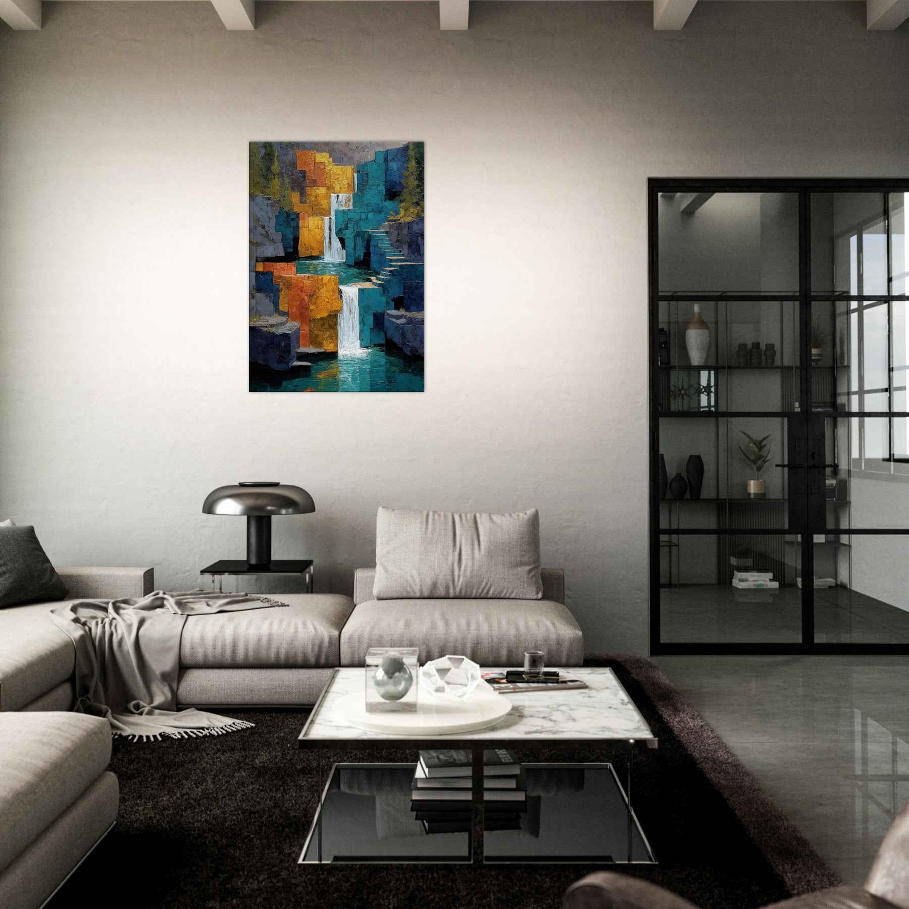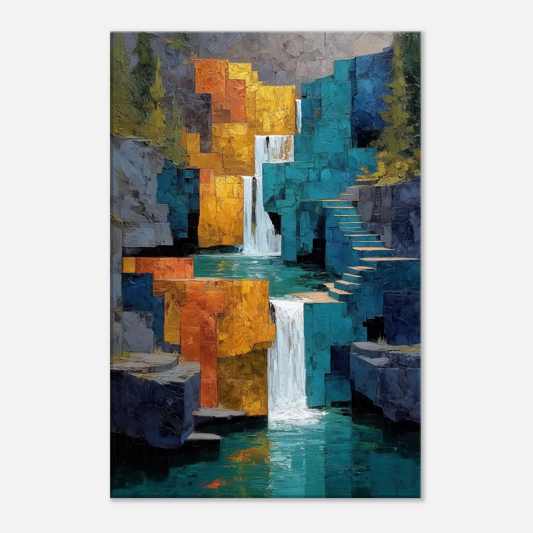 Let the Waterfall cascade through a staircase of architectural blocks, where warmth and cools collide in amber, turquoise, and cobalt. The painting radiates with sunlit warmth and a fresh, forest breeze, inviting a tranquil tension into your living room. The layered geometry creates a choreographed pulse you feel the spray on your skin as the water spills into a serene pool, mirrored by the teal reflections that anchor the space. A striking focal point that enhances calm, creativity, and conversation.