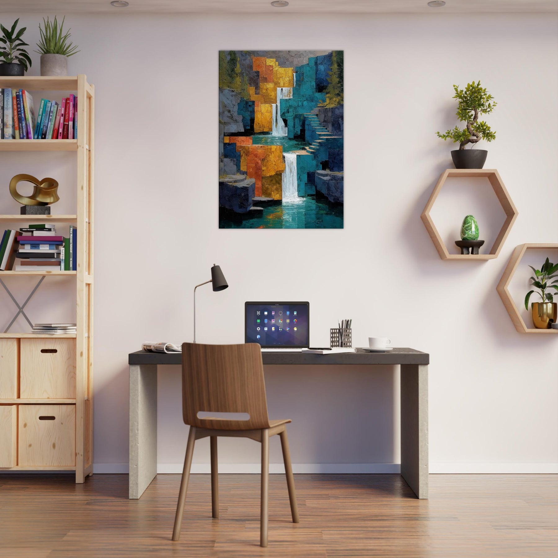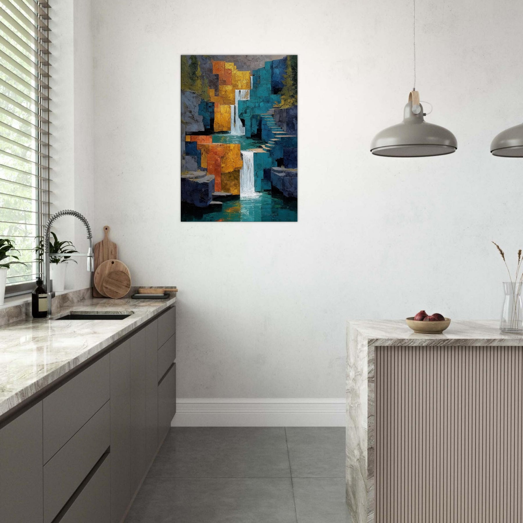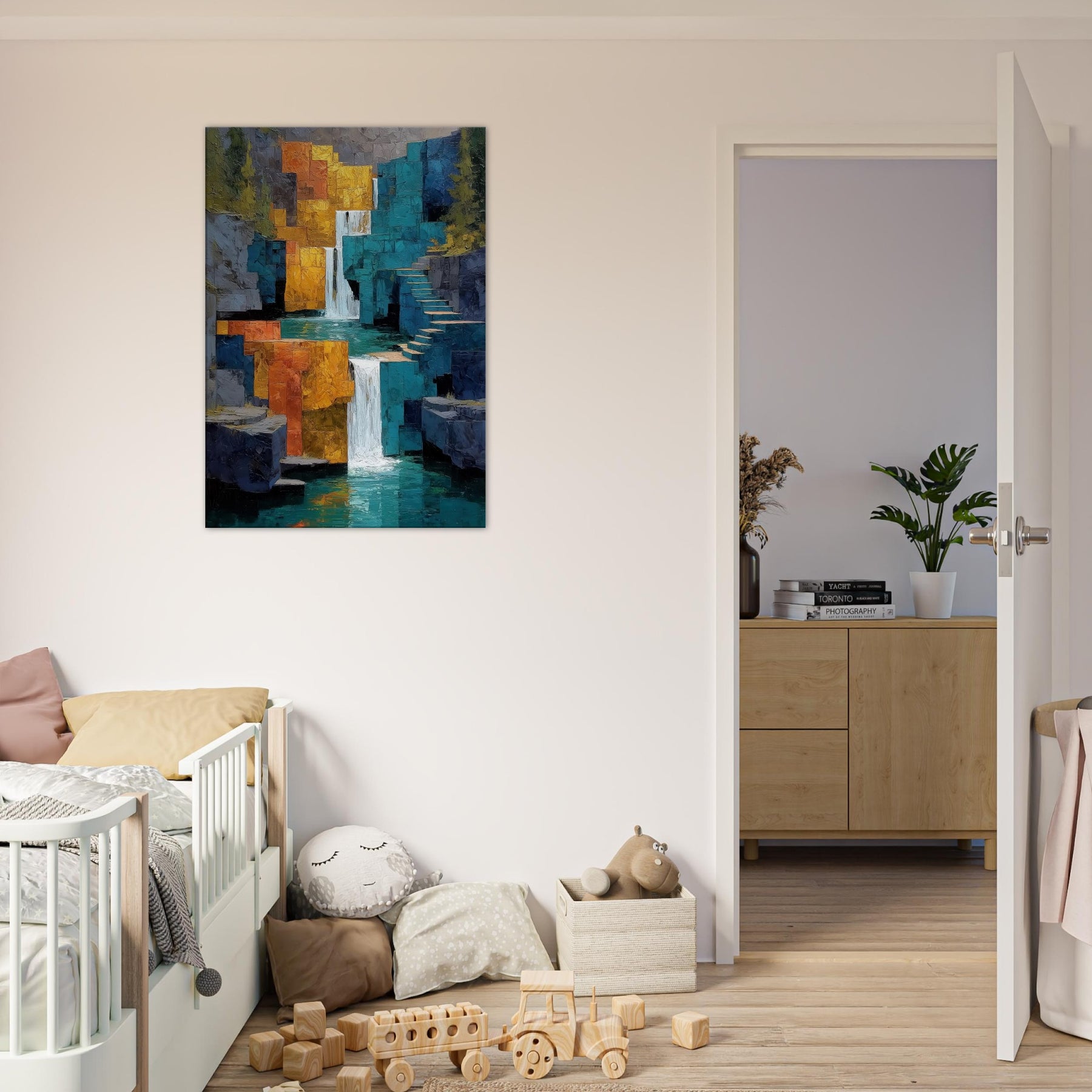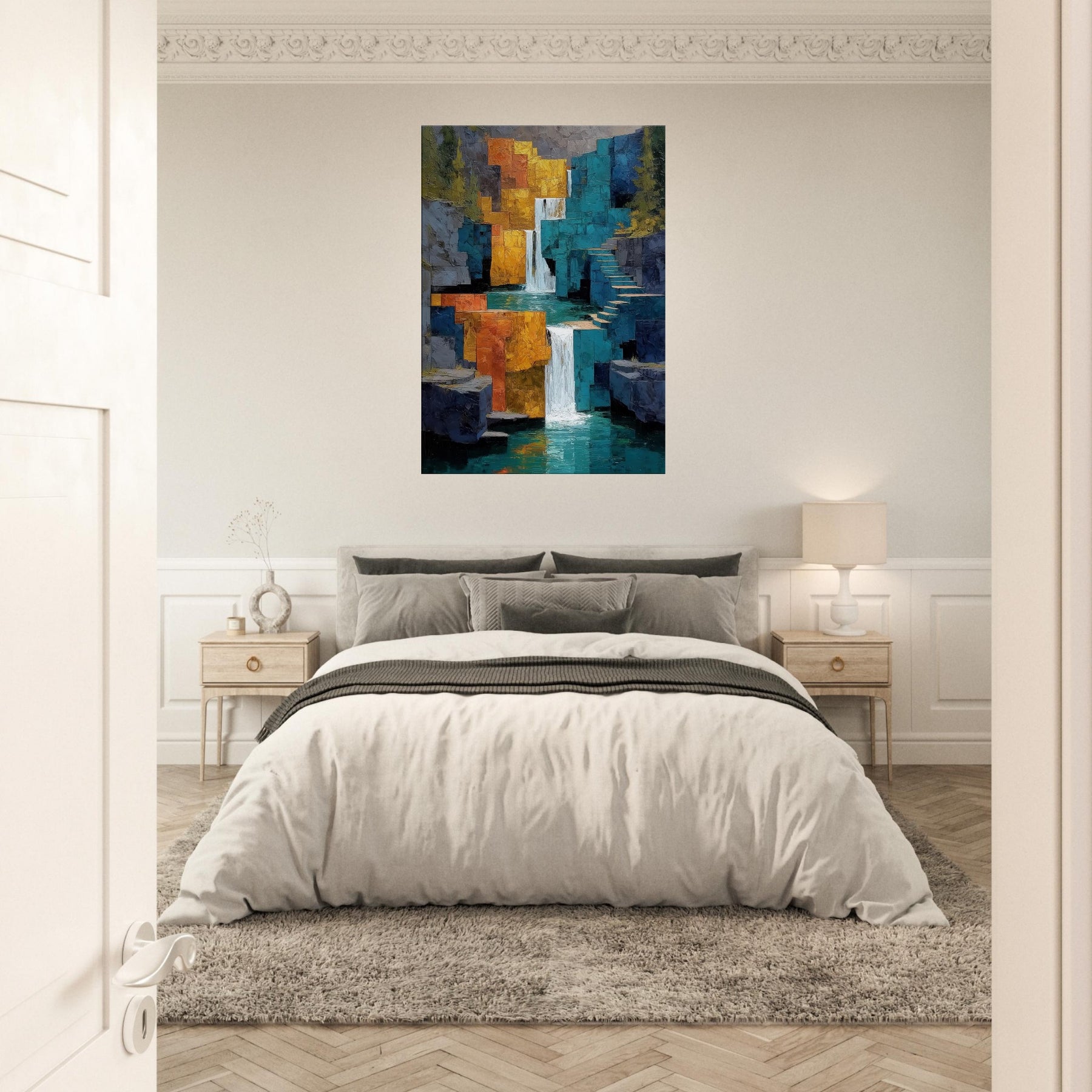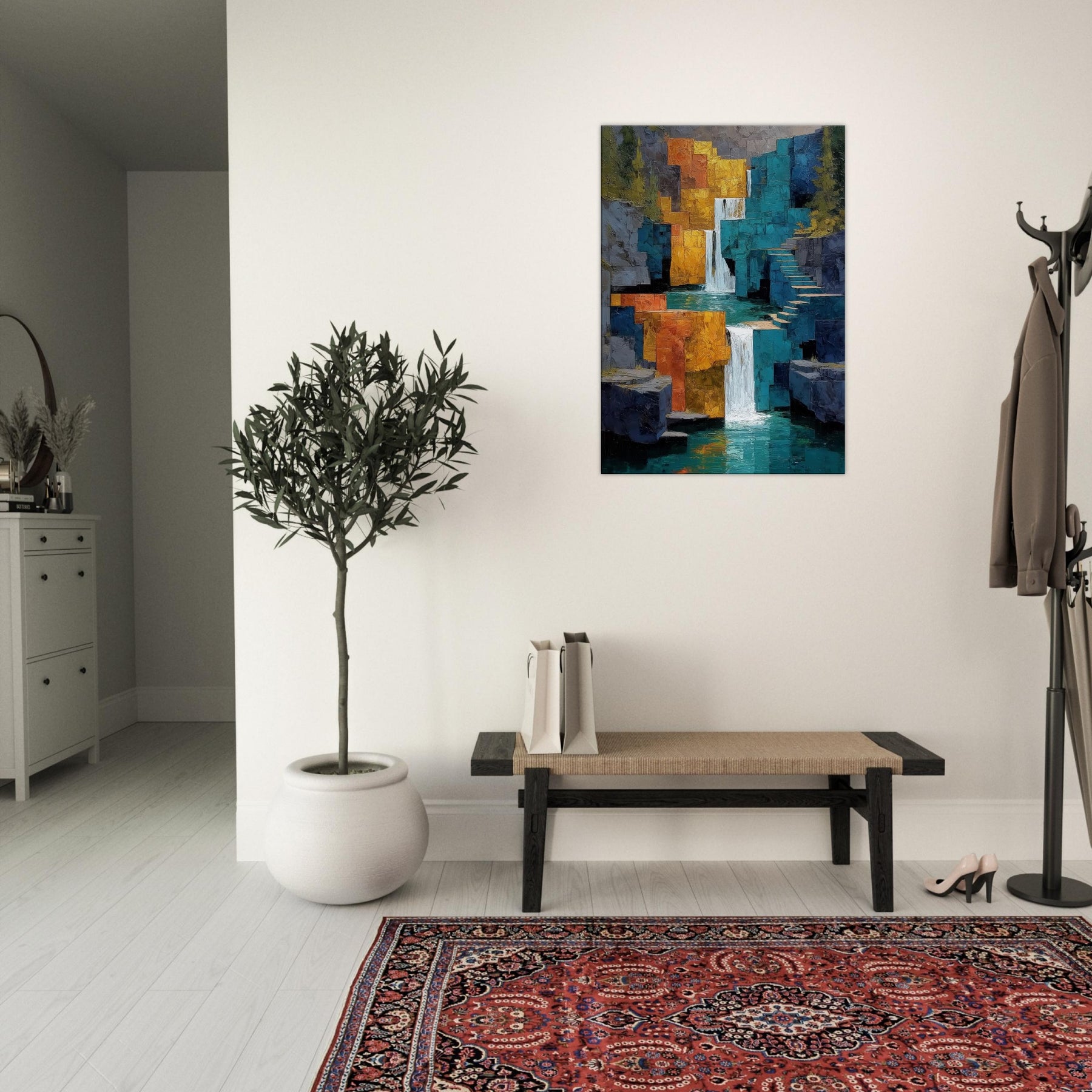 Let the Waterfall cascade through a staircase of architectural blocks, where warmth and cools collide in amber, turquoise, and cobalt. The painting radiates with sunlit warmth and a fresh, forest breeze, inviting a tranquil tension into your living room. The layered geometry creates a choreographed pulse you feel the spray on your skin as the water spills into a serene pool, mirrored by the teal reflections that anchor the space. A striking focal point that enhances calm, creativity, and conversation.