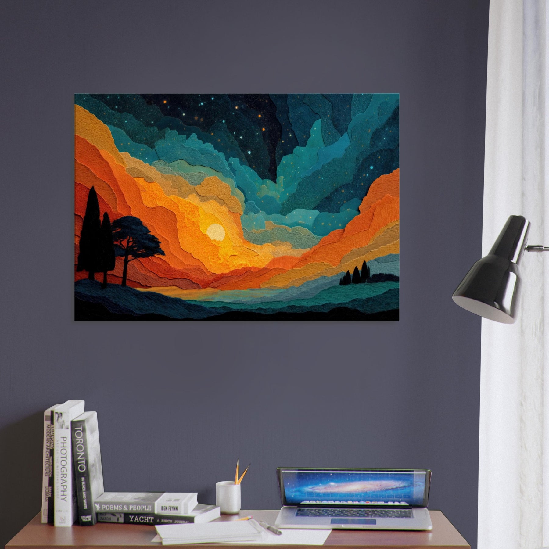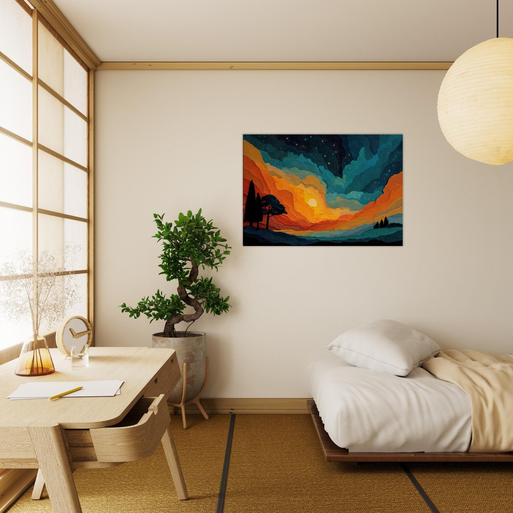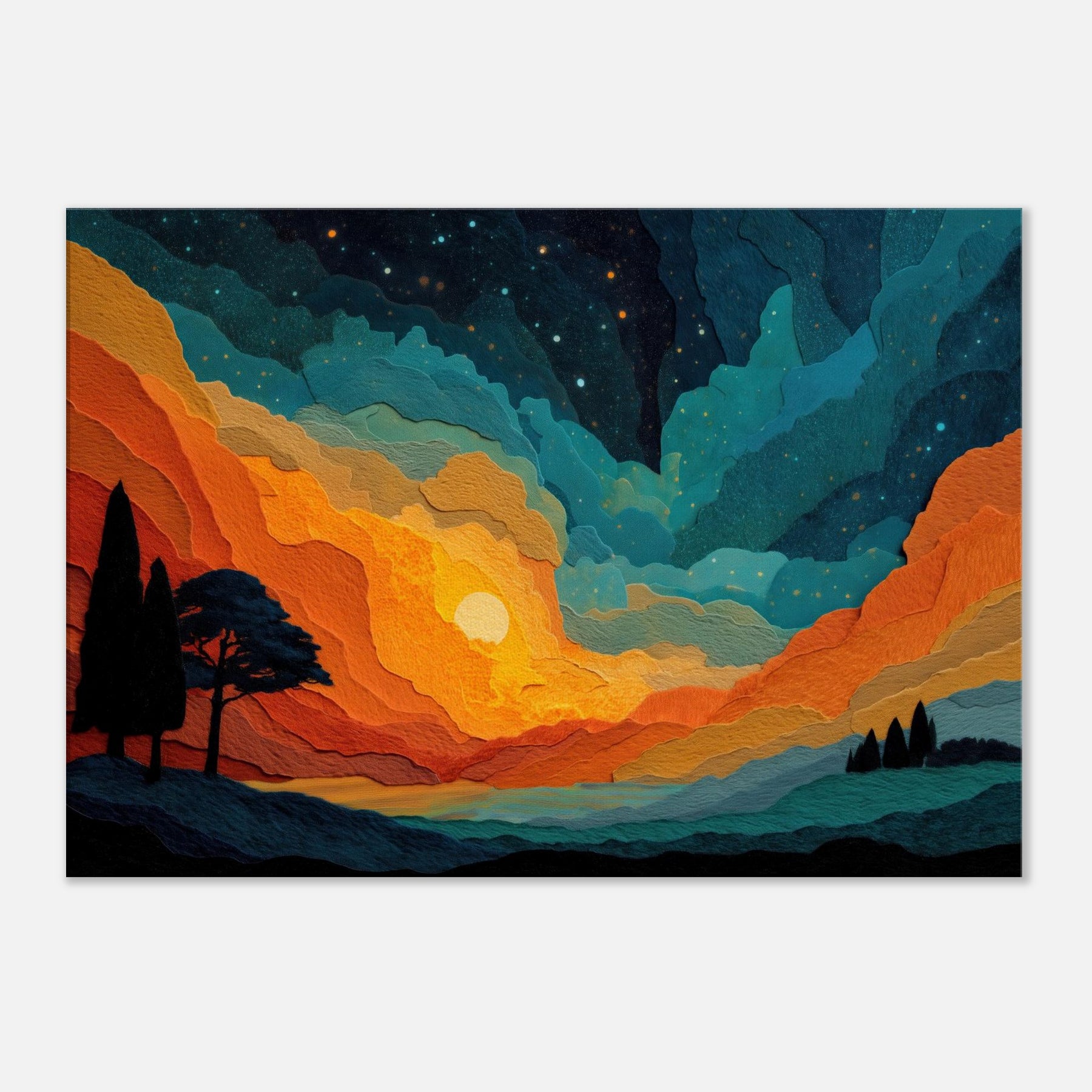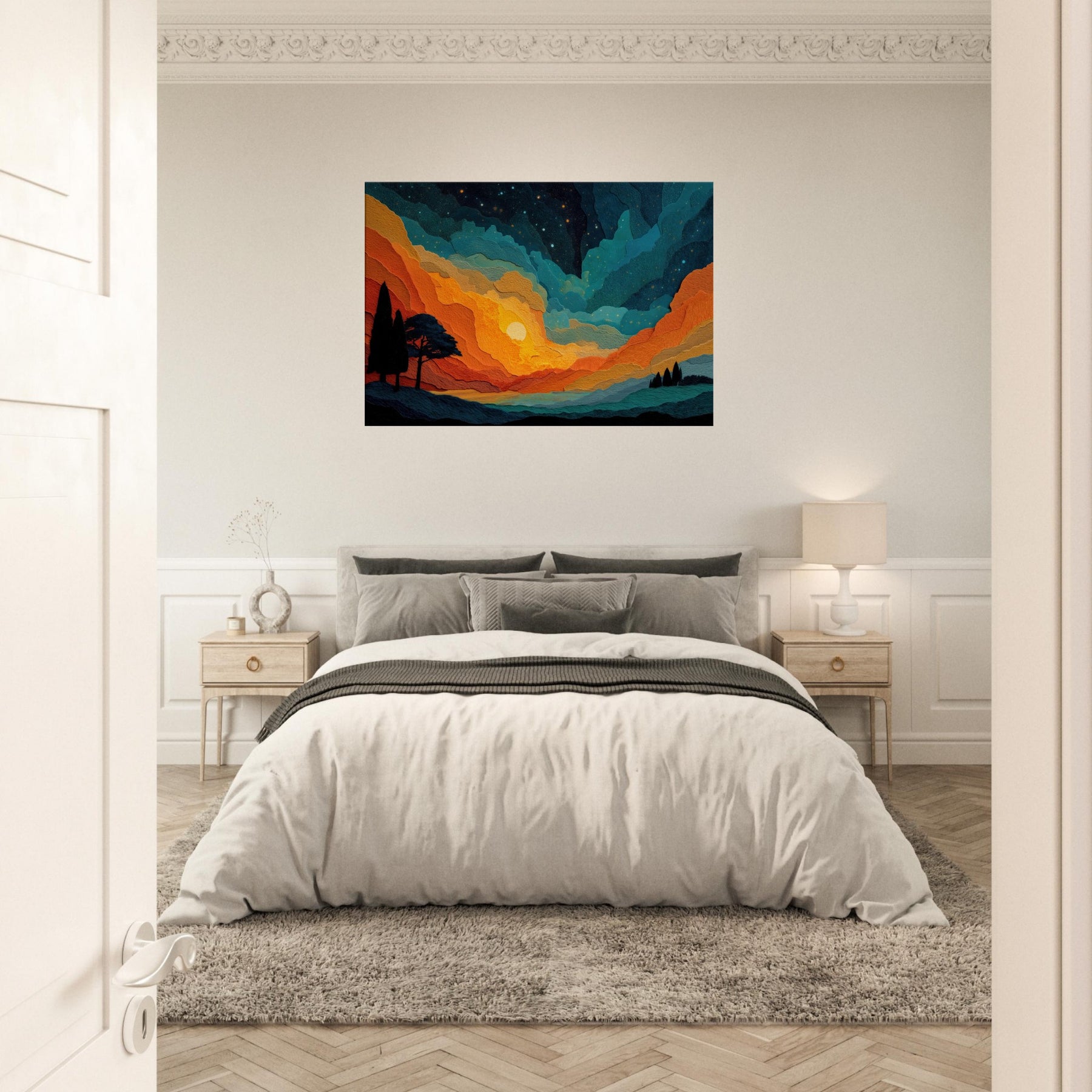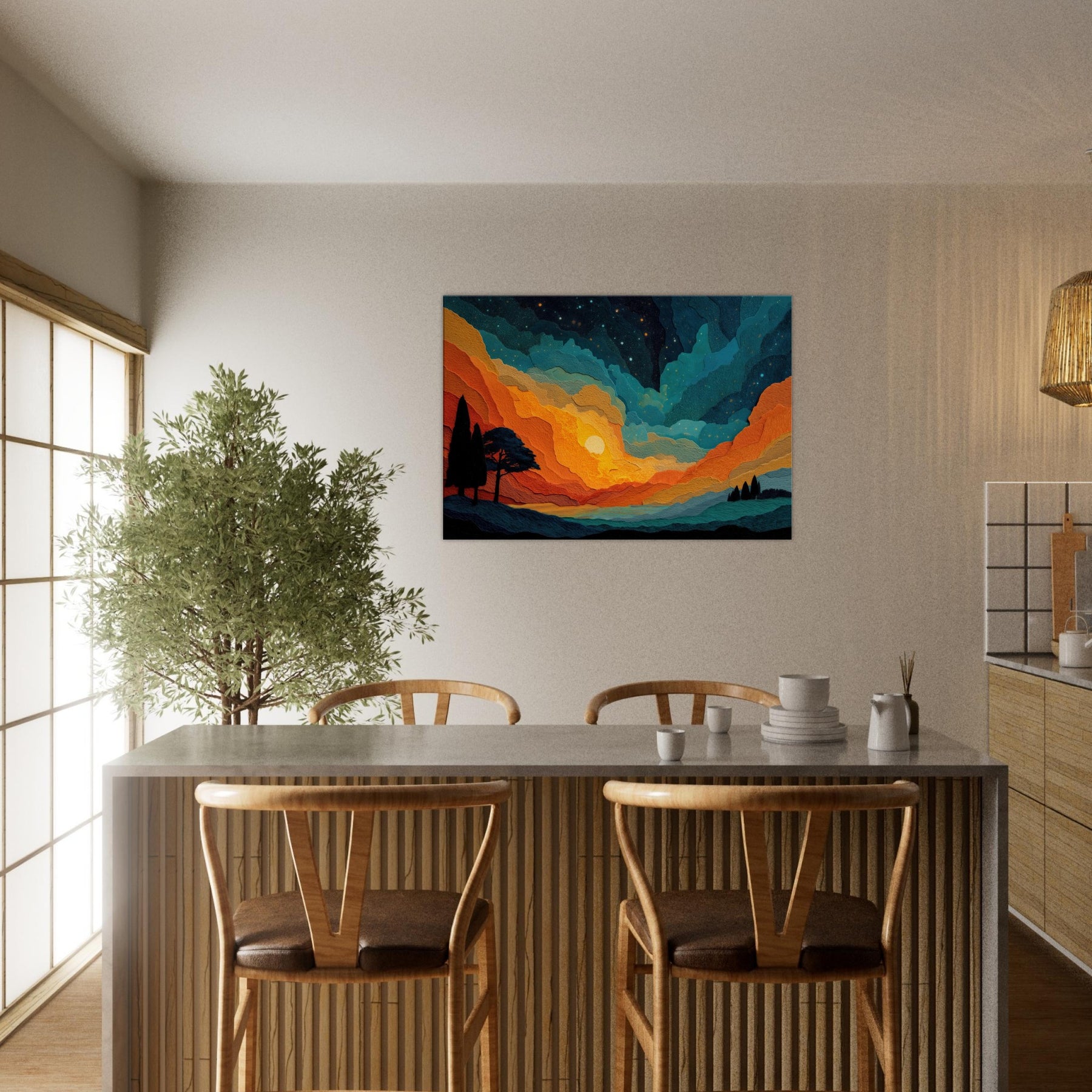 Starry Night unfolds as an intimate chorus of color and light across layered, paper thin hills. An orange sun halos the horizon while a cobalt sky spills into teal and indigo, inviting the eye to travel through texture and tone. The scene whispers of quiet wonder, turning ordinary walls into a window to nature's cycles. This piece brings warmth and depth to a living room or bedroom, shaping mood with a soft, cinematic glow that lingers long after dusk.