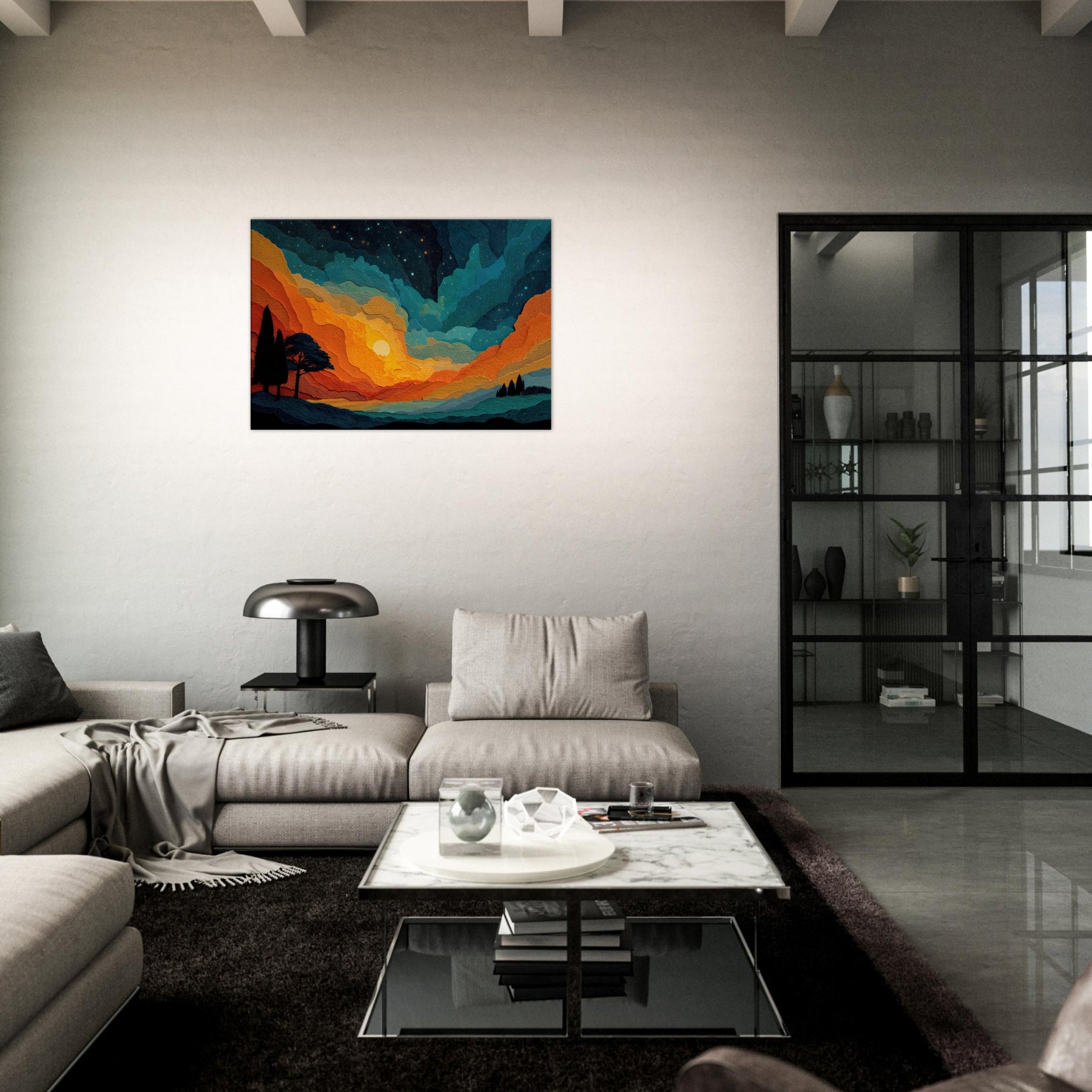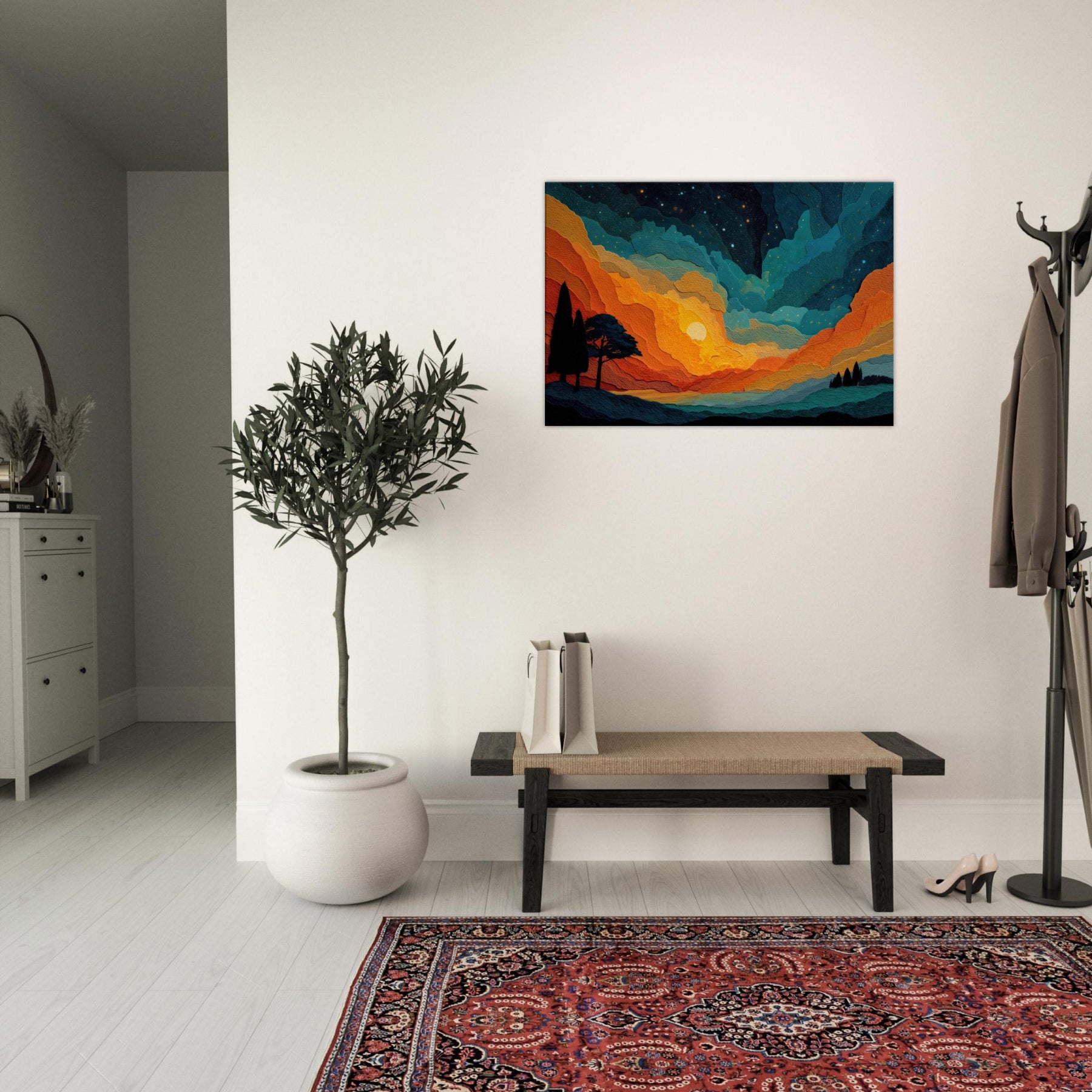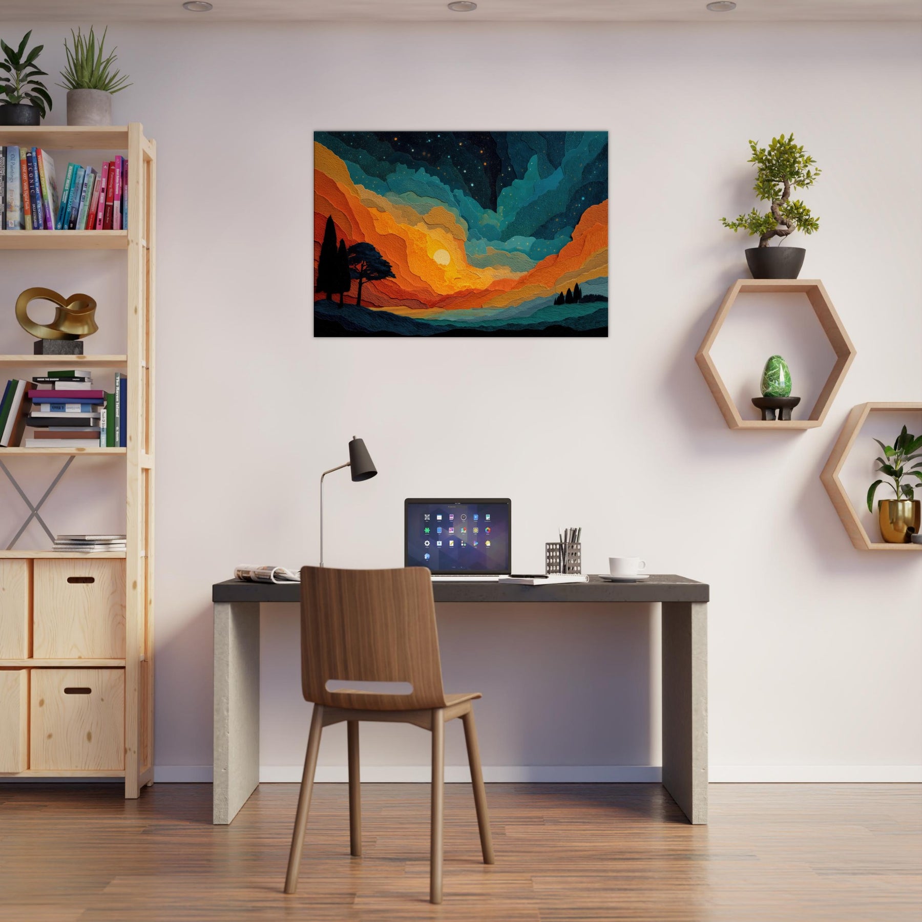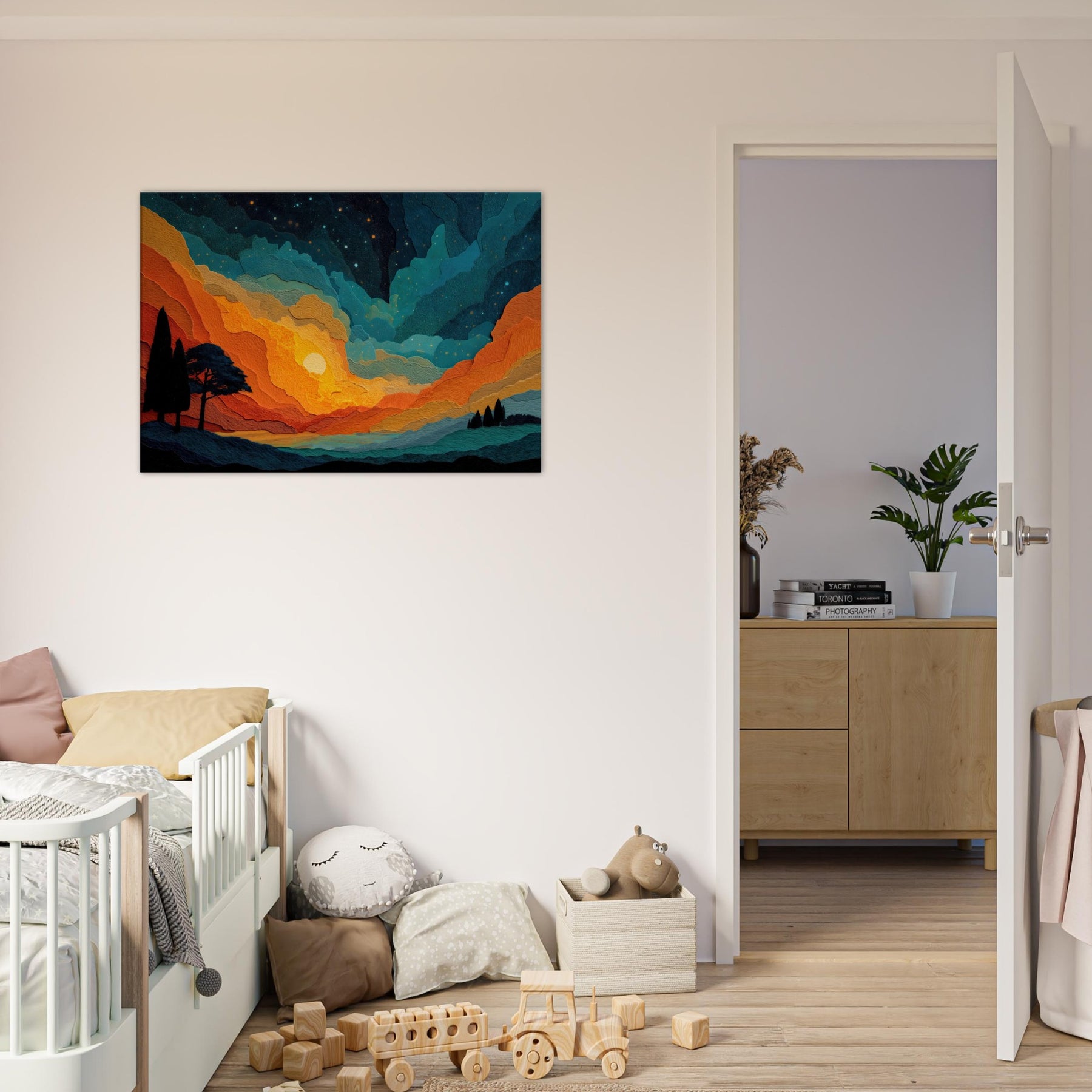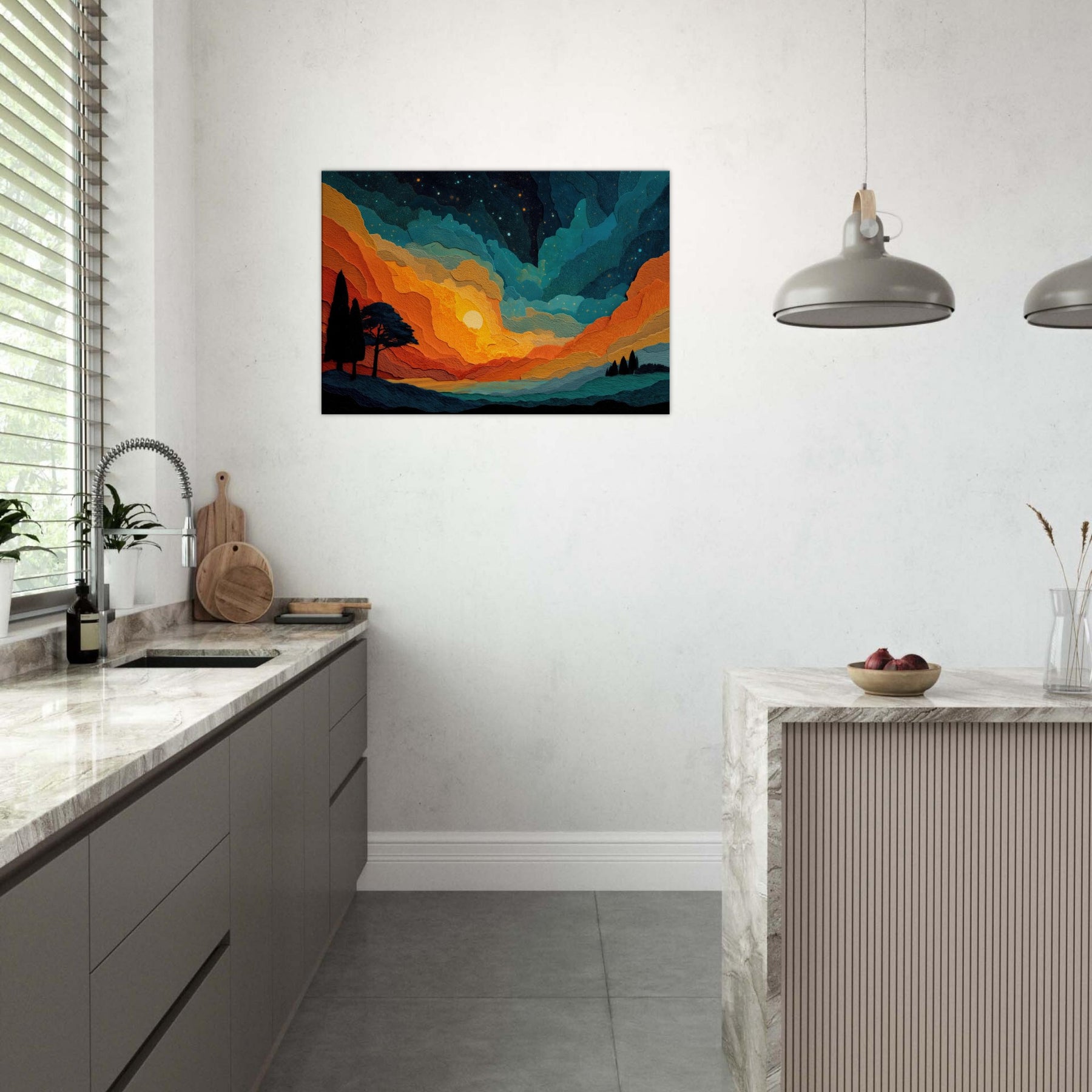 Starry Night unfolds as an intimate chorus of color and light across layered, paper thin hills. An orange sun halos the horizon while a cobalt sky spills into teal and indigo, inviting the eye to travel through texture and tone. The scene whispers of quiet wonder, turning ordinary walls into a window to nature's cycles. This piece brings warmth and depth to a living room or bedroom, shaping mood with a soft, cinematic glow that lingers long after dusk.