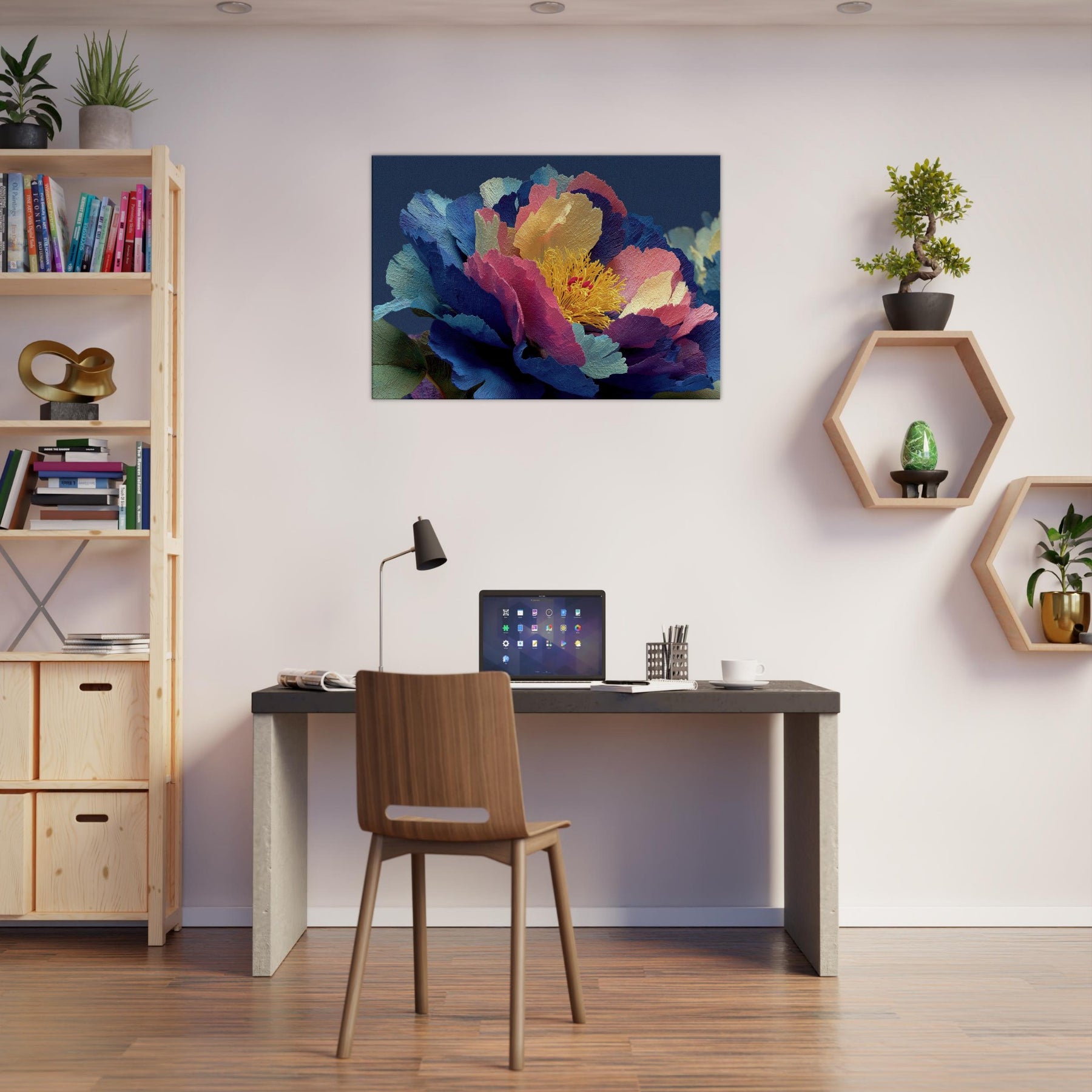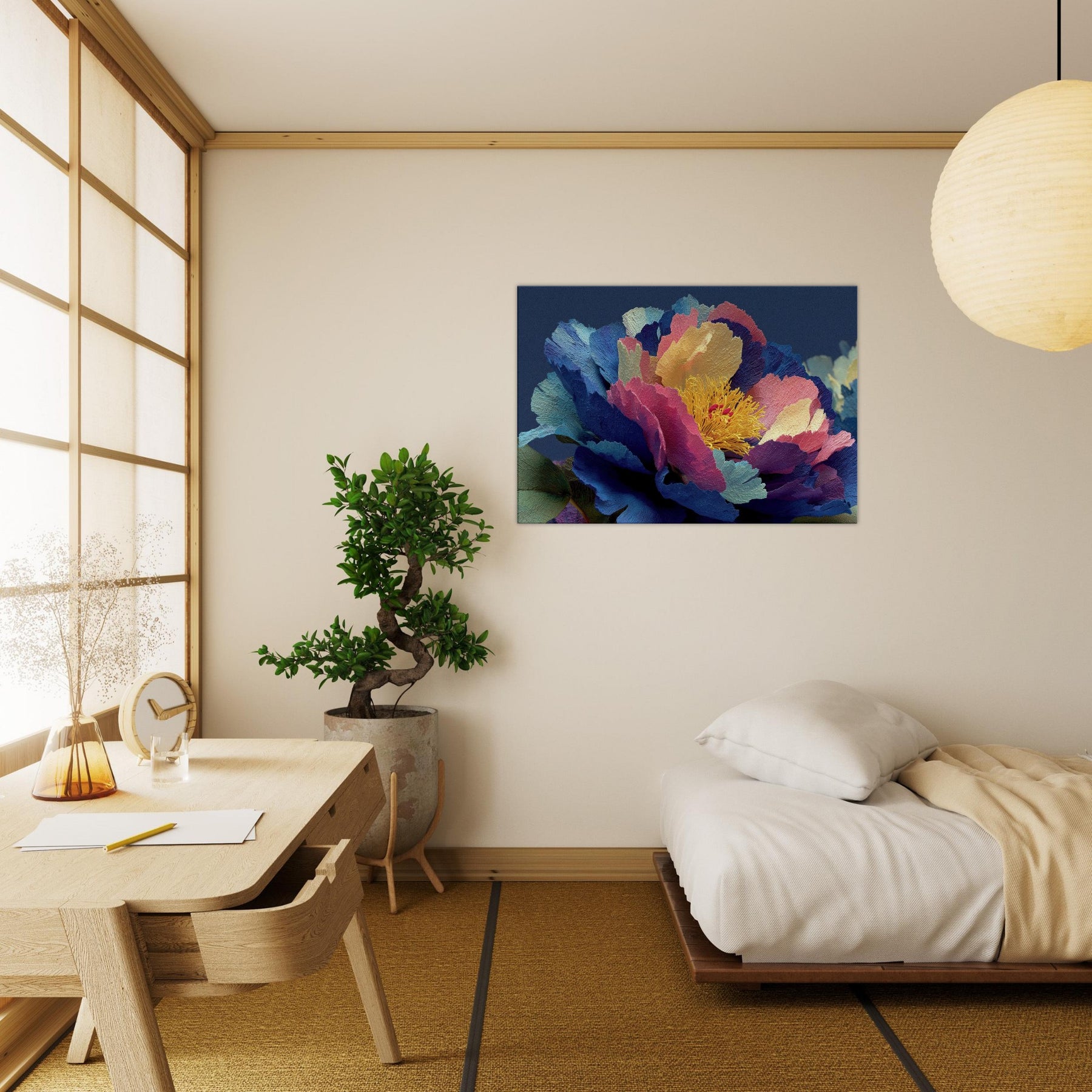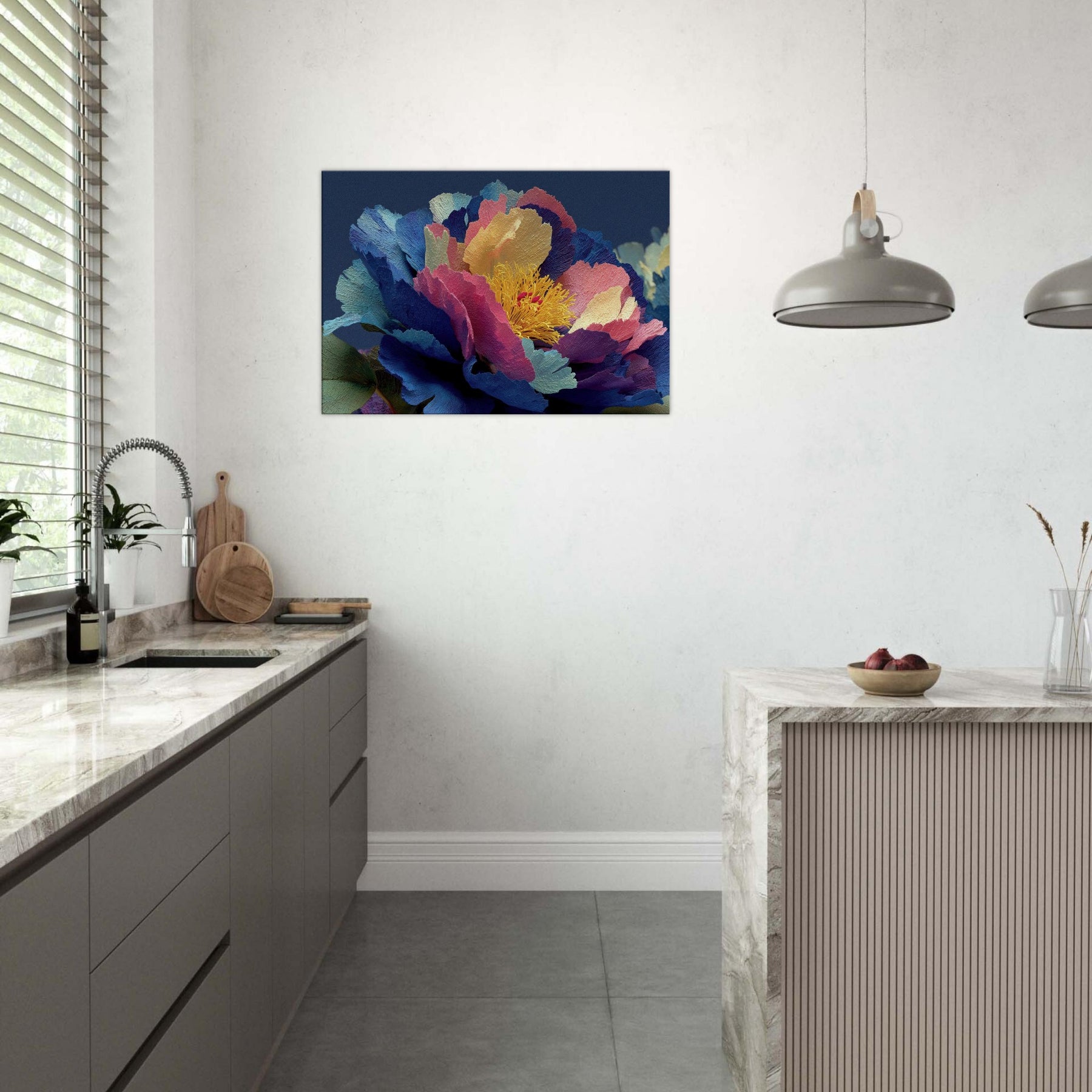 Immerse your room in the soft drama of a Peony transformed into an abstract garden of color. This wall piece pours light through candy bright petals pink, gold, blue, and violet against a moody dusk backdrop. The textured strokes invite a closer look, then release you into a calm, expansive mood that makes the living space feel larger, warmer, and more intimate. Perfect above a sofa or dining nook, it invites conversation and quiet wonder.