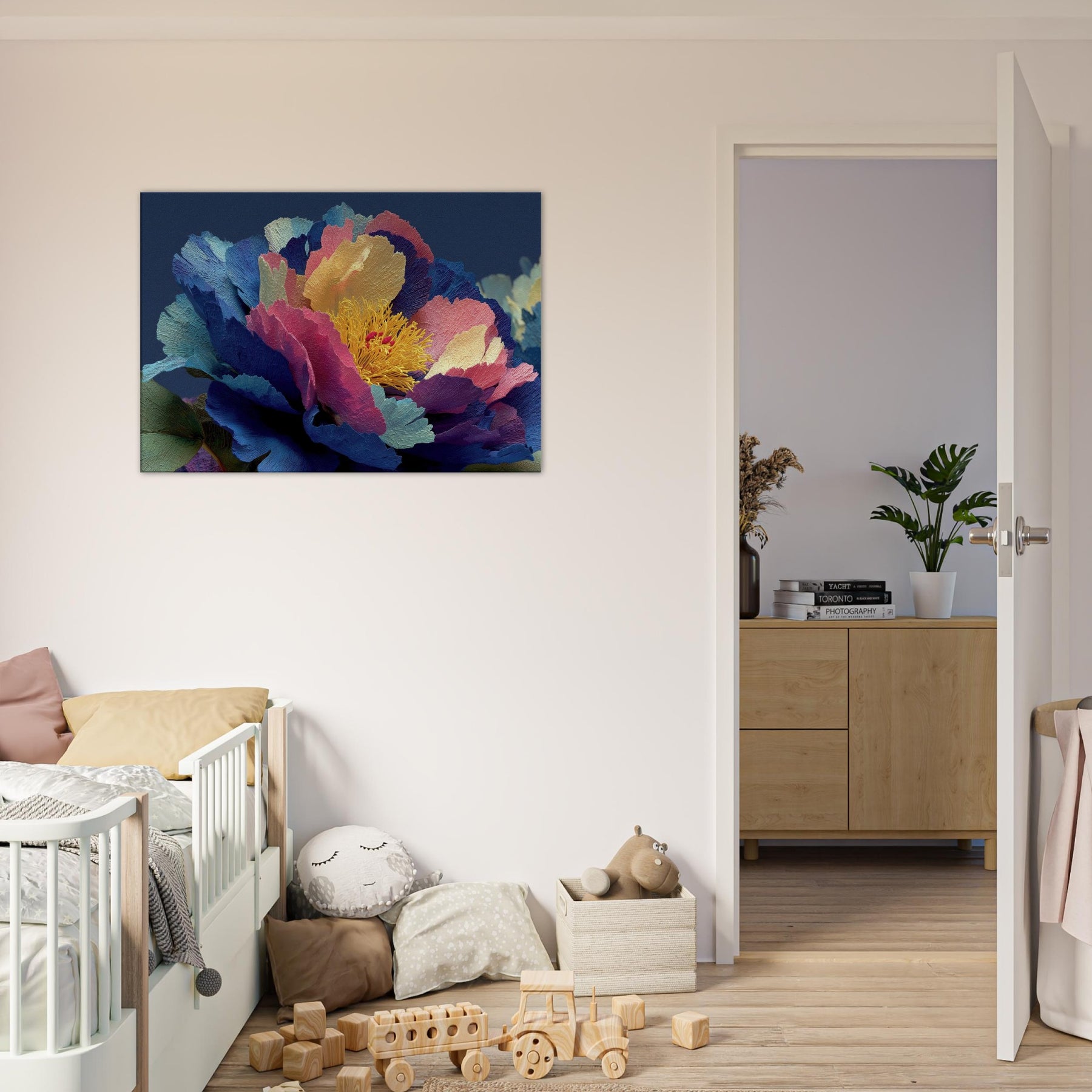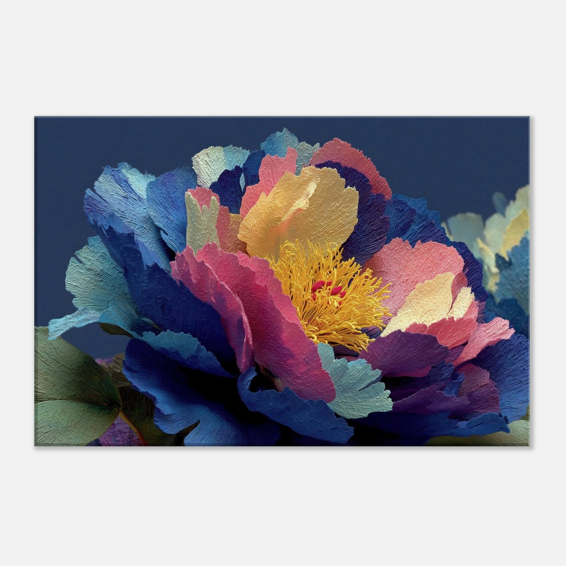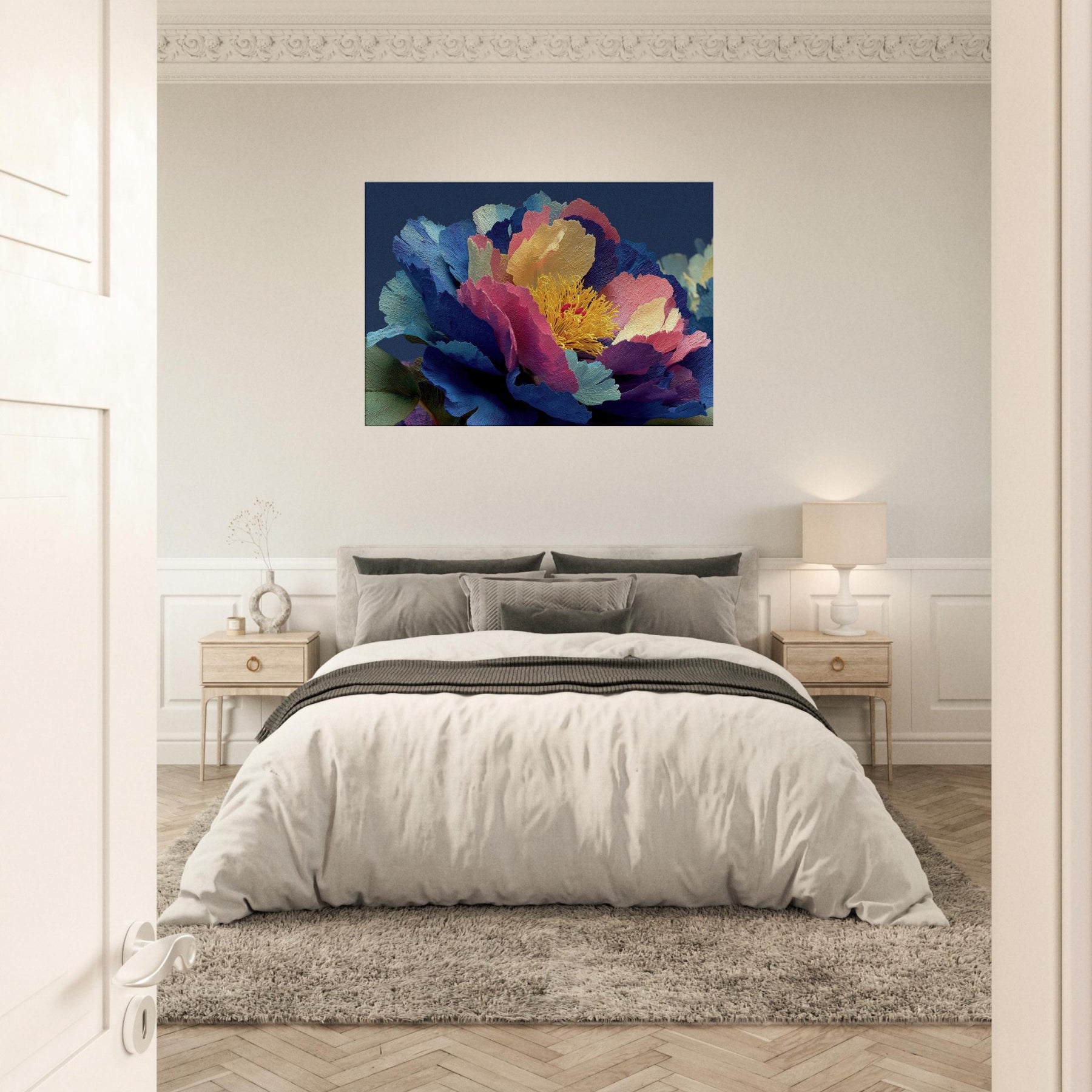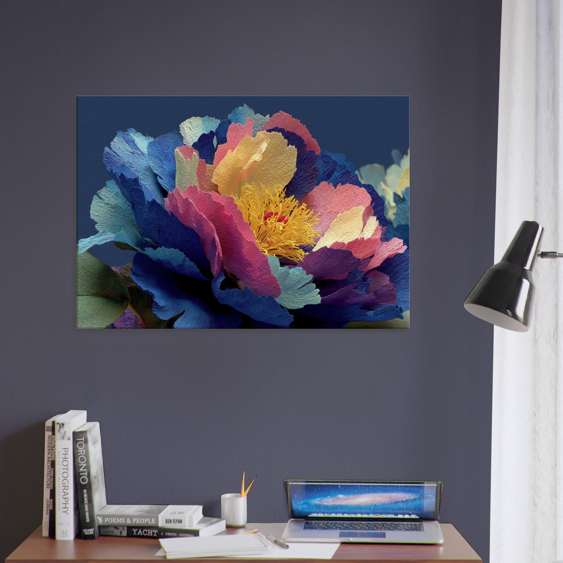 Immerse your room in the soft drama of a Peony transformed into an abstract garden of color. This wall piece pours light through candy bright petals pink, gold, blue, and violet against a moody dusk backdrop. The textured strokes invite a closer look, then release you into a calm, expansive mood that makes the living space feel larger, warmer, and more intimate. Perfect above a sofa or dining nook, it invites conversation and quiet wonder.