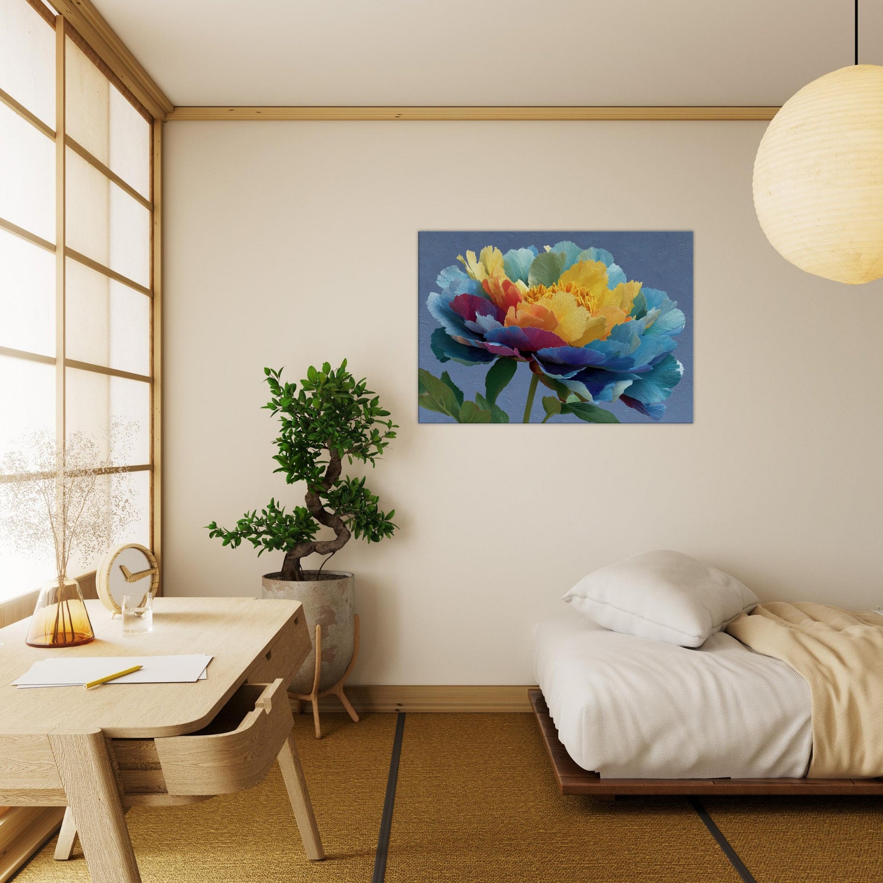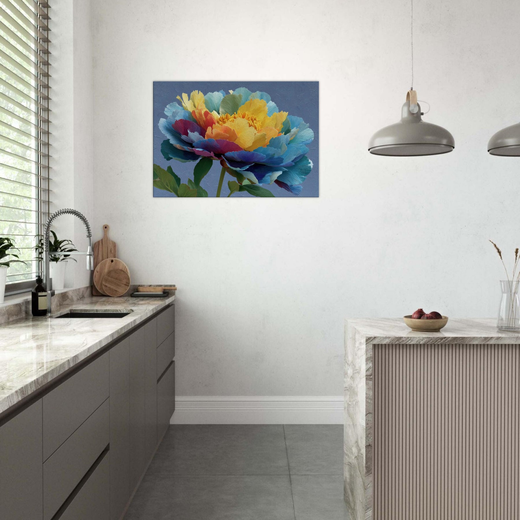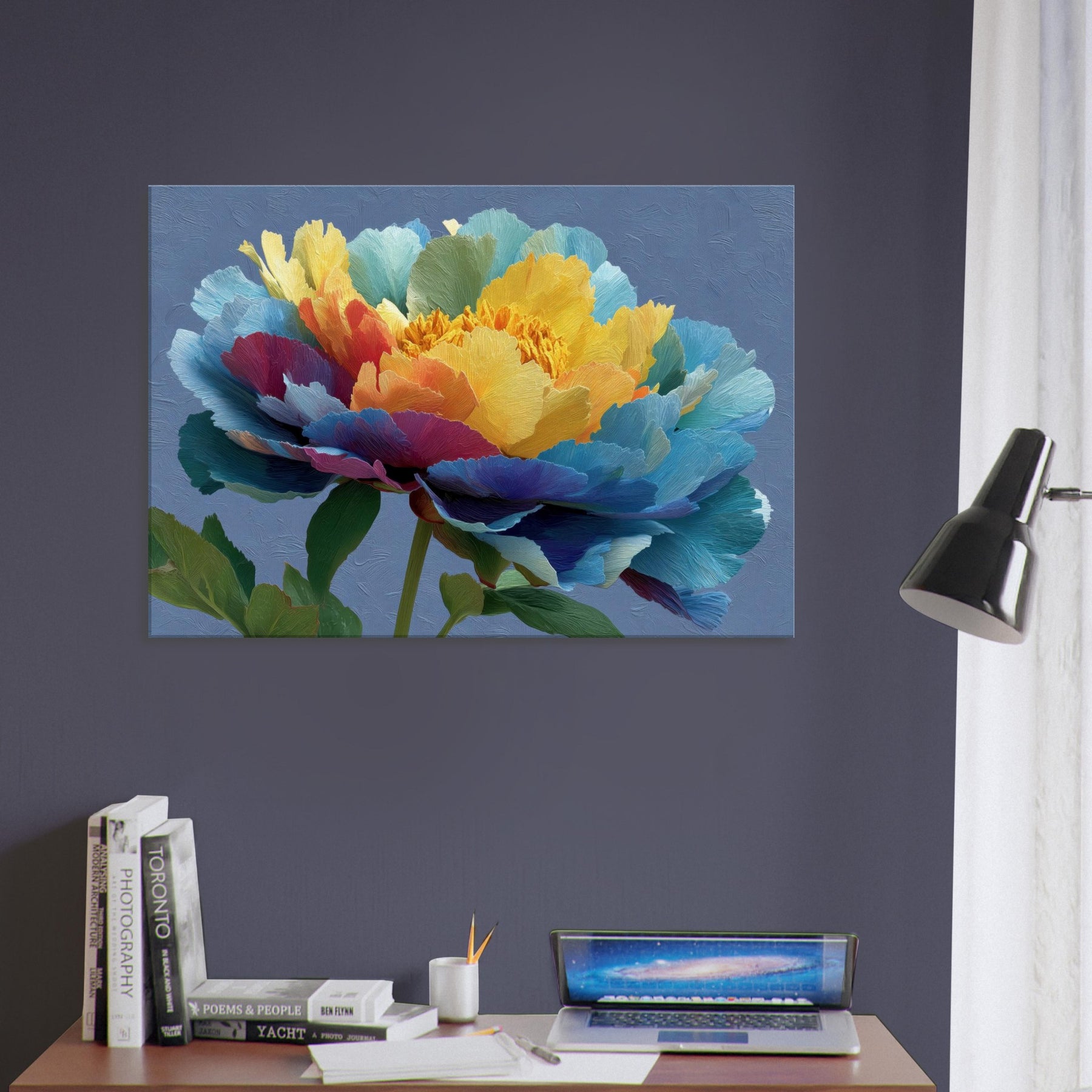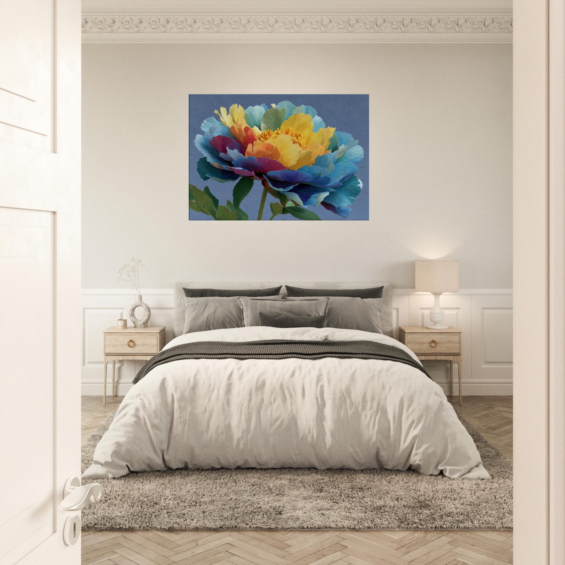 A luminous Peony unfurls across a storm of color, each petal brushed with sunrise and sea. This abstract homage to nature moves with soft motion, inviting the eye to wander through warm yellows and oranges, cooler blues and greens, and a tranquil lavender edge. The piece radiates energy and calm in equal measure, making a living room feel both vibrant and serene. Printed on archival canvas with a subtle texture, it anchors modern interiors while honoring the flower's quiet, resilient spirit and the beauty of nature's bloom.