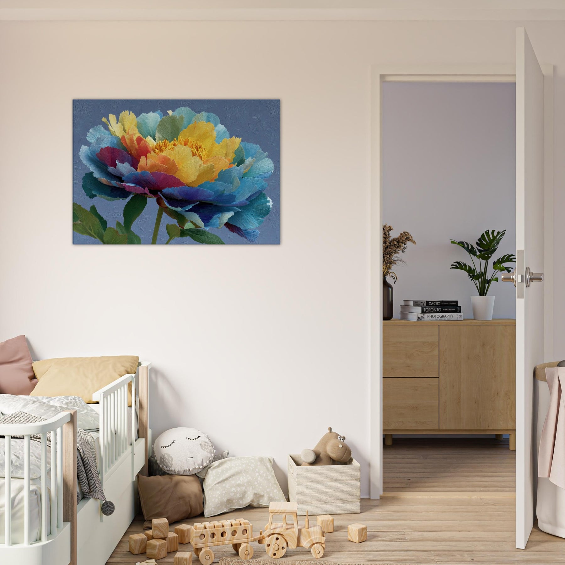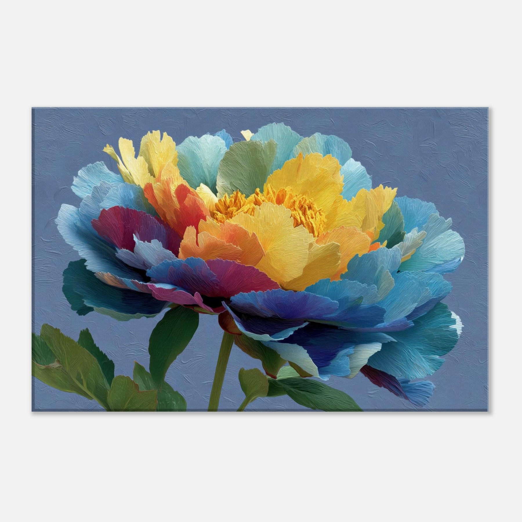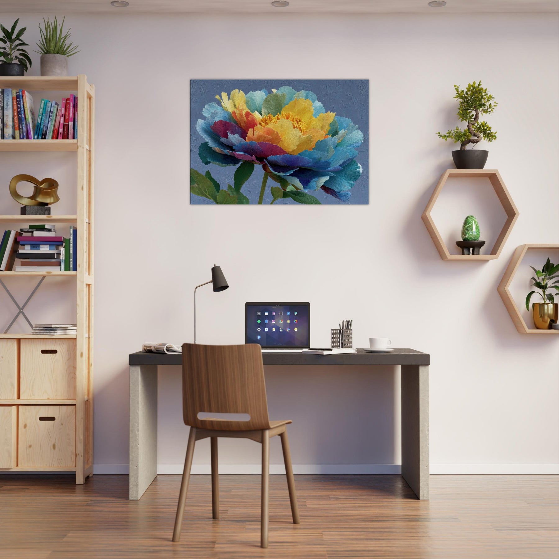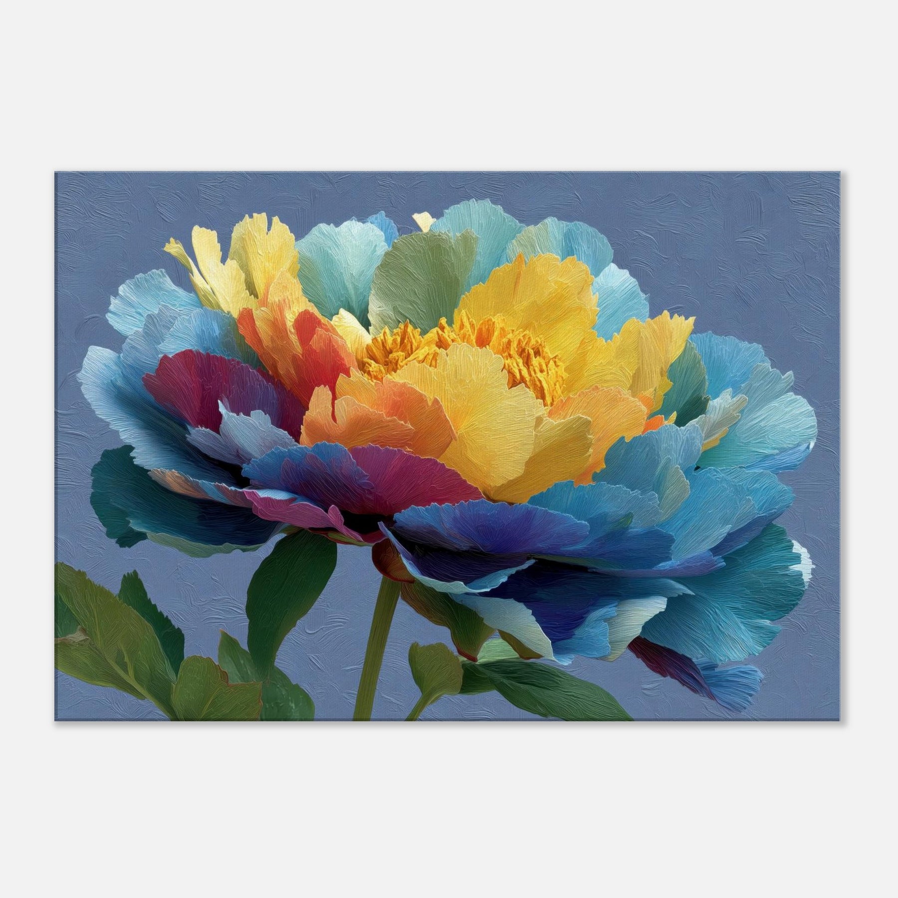 A luminous Peony unfurls across a storm of color, each petal brushed with sunrise and sea. This abstract homage to nature moves with soft motion, inviting the eye to wander through warm yellows and oranges, cooler blues and greens, and a tranquil lavender edge. The piece radiates energy and calm in equal measure, making a living room feel both vibrant and serene. Printed on archival canvas with a subtle texture, it anchors modern interiors while honoring the flower's quiet, resilient spirit and the beauty of nature's bloom.