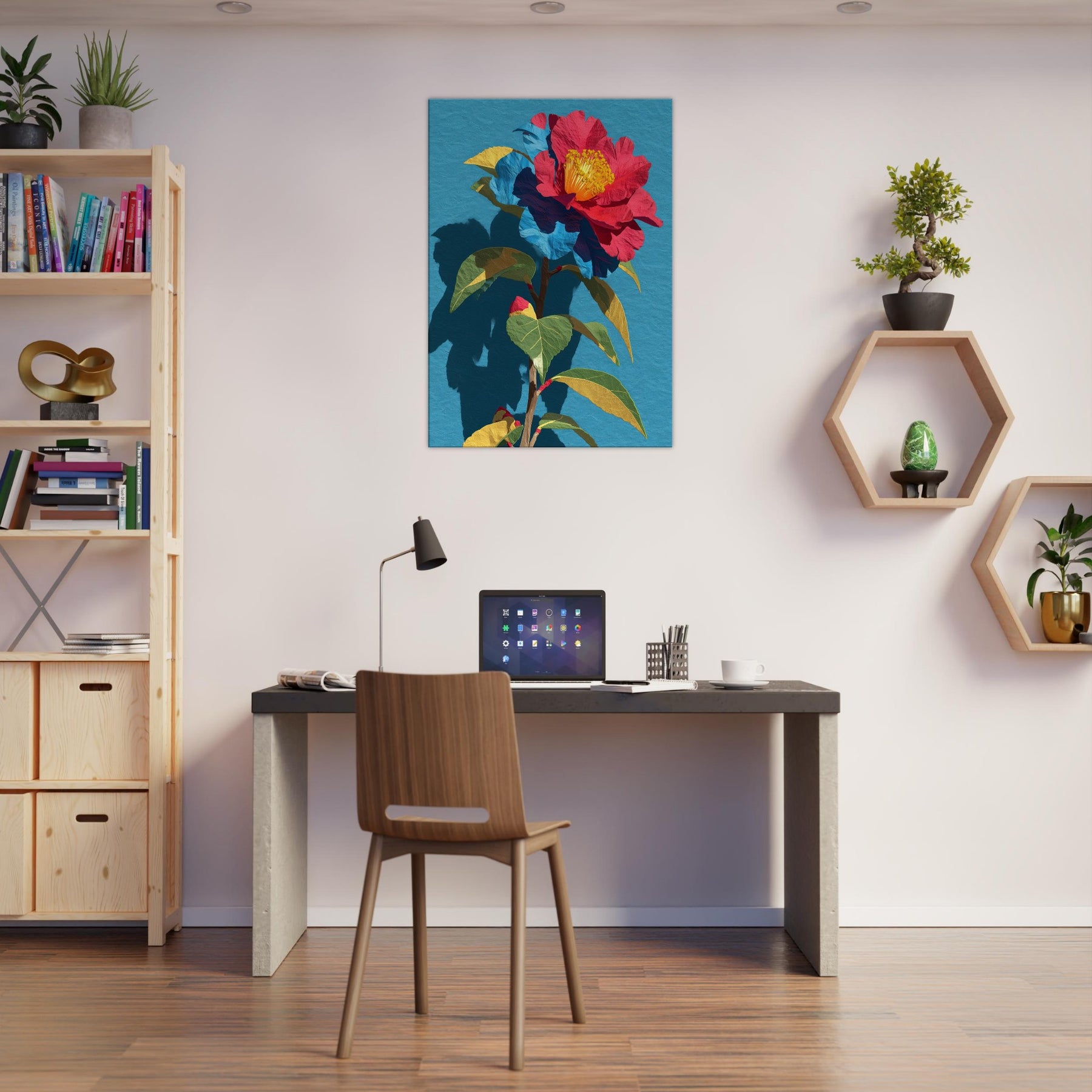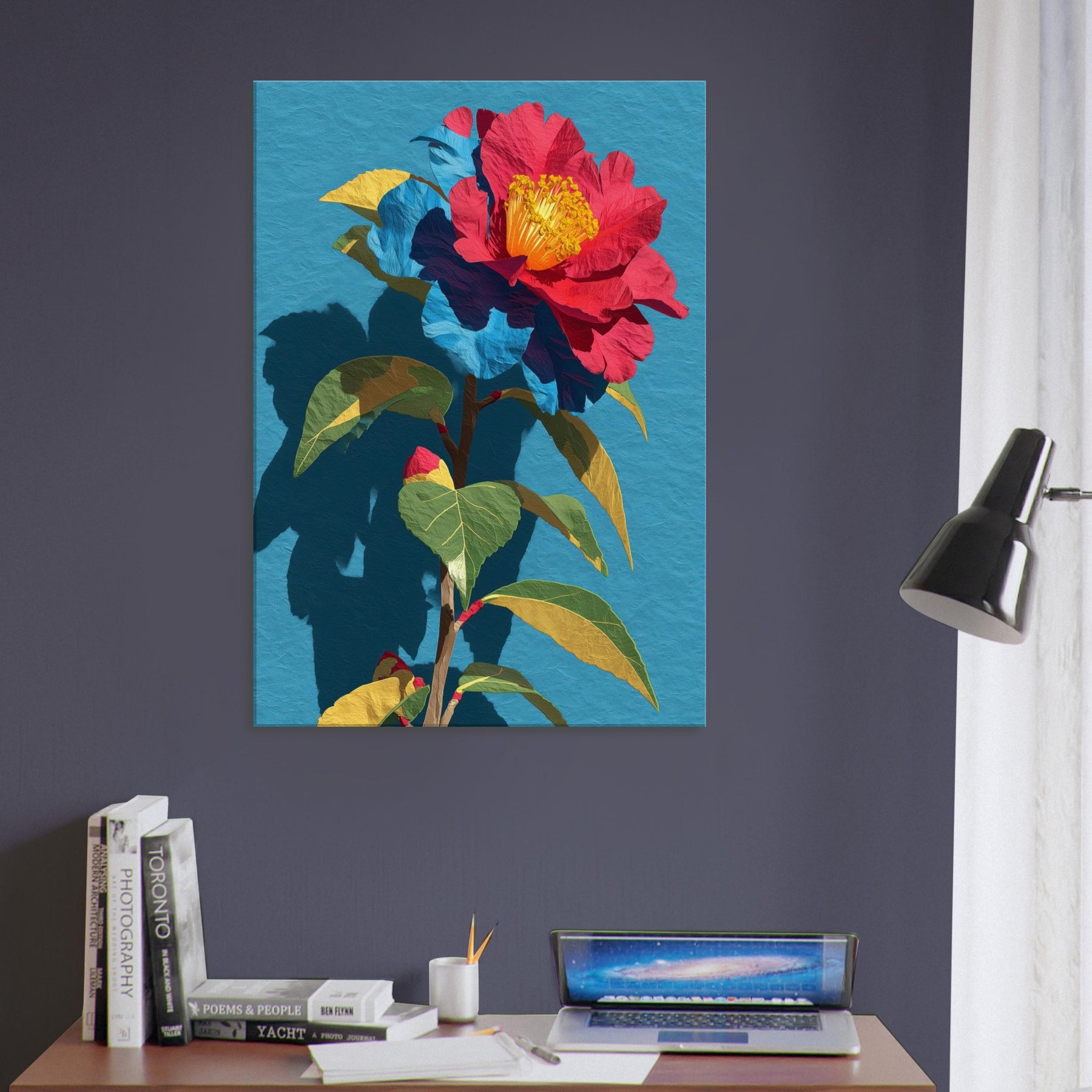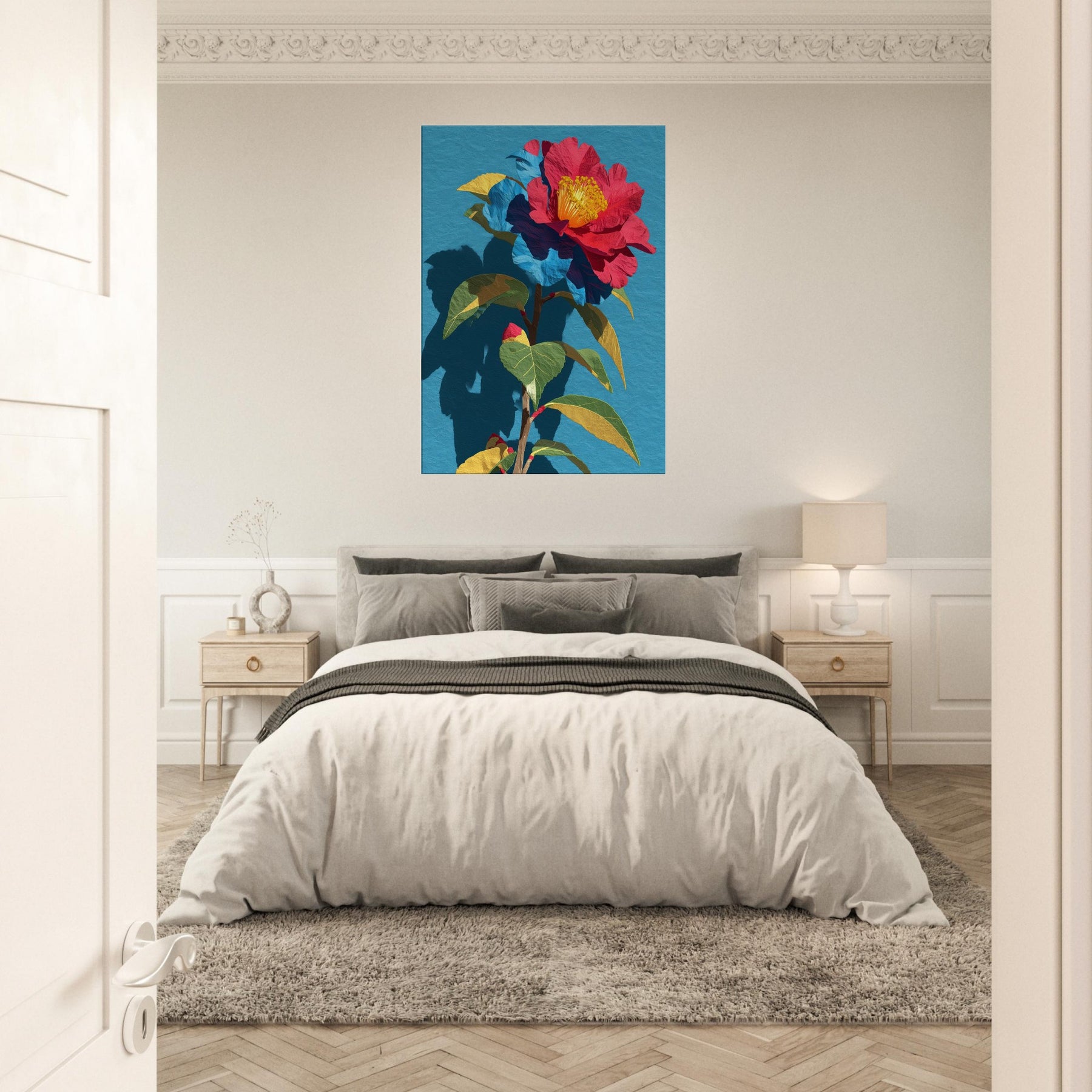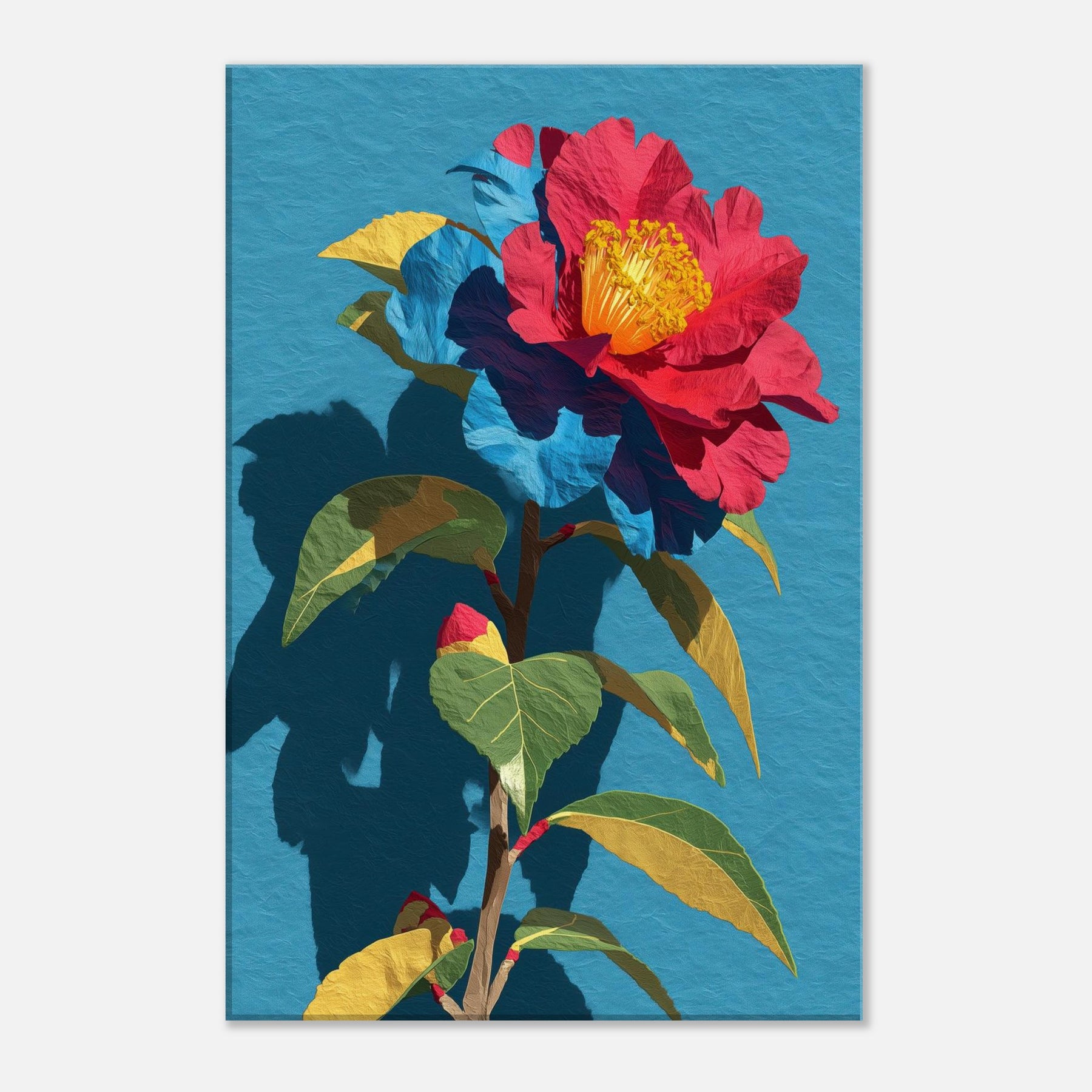 Camellia unfurls in a chorus of saturated reds, golds, and greens, set against a serene blue field. This abstract interpretation invites the eye to trace the flower’s delicate folds and the plant’s sturdy stem, as if the garden were receding into the room itself. The piece radiates warmth and quiet drama, pairing bold color with soft shadow to create depth and movement. In a living space it becomes a luminous focal point, inviting conversation and daily inspiration.