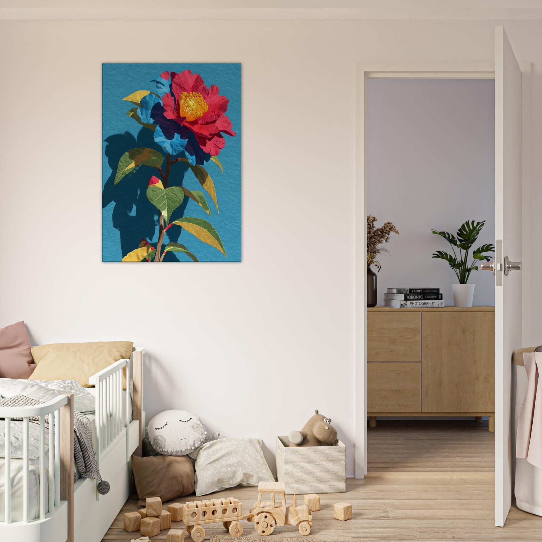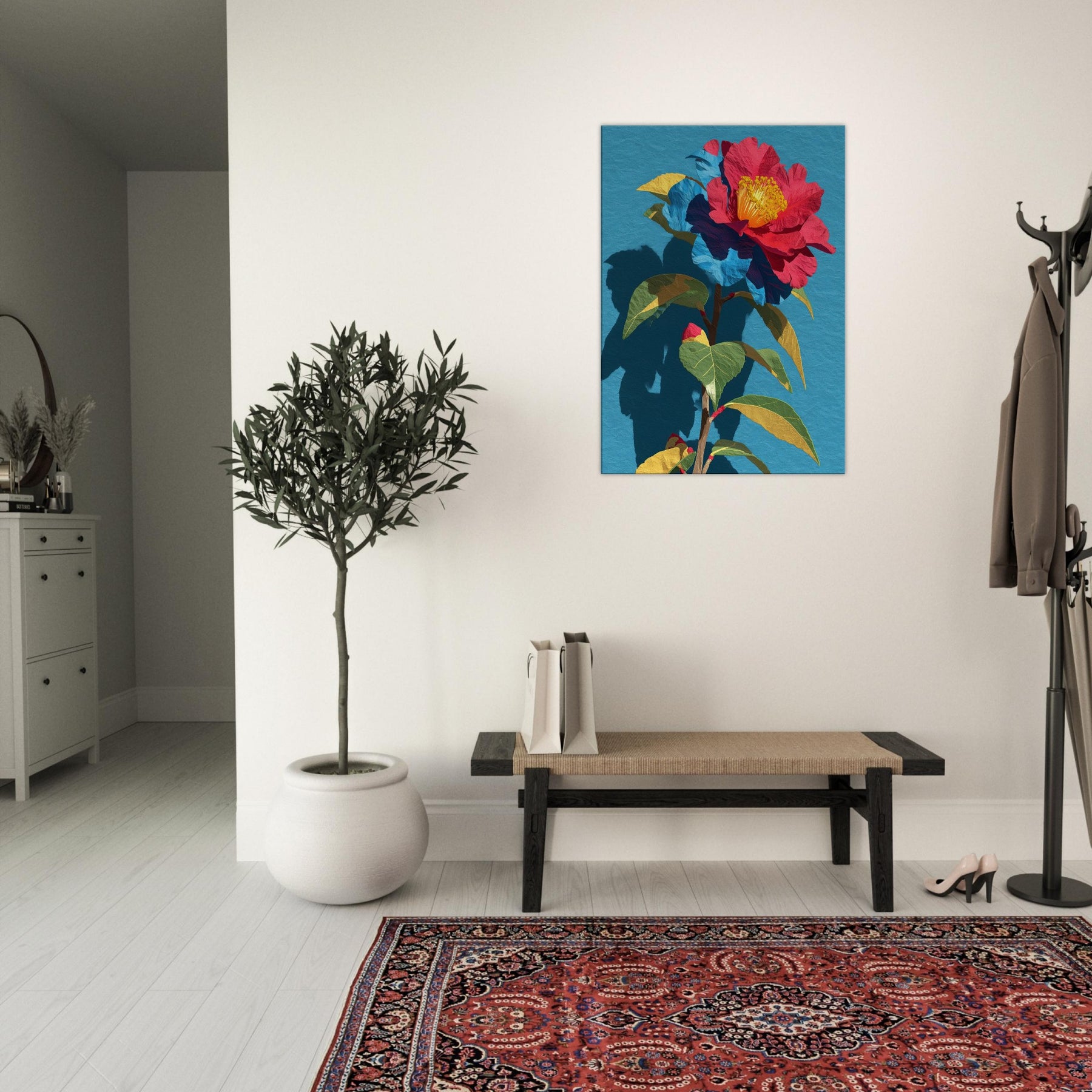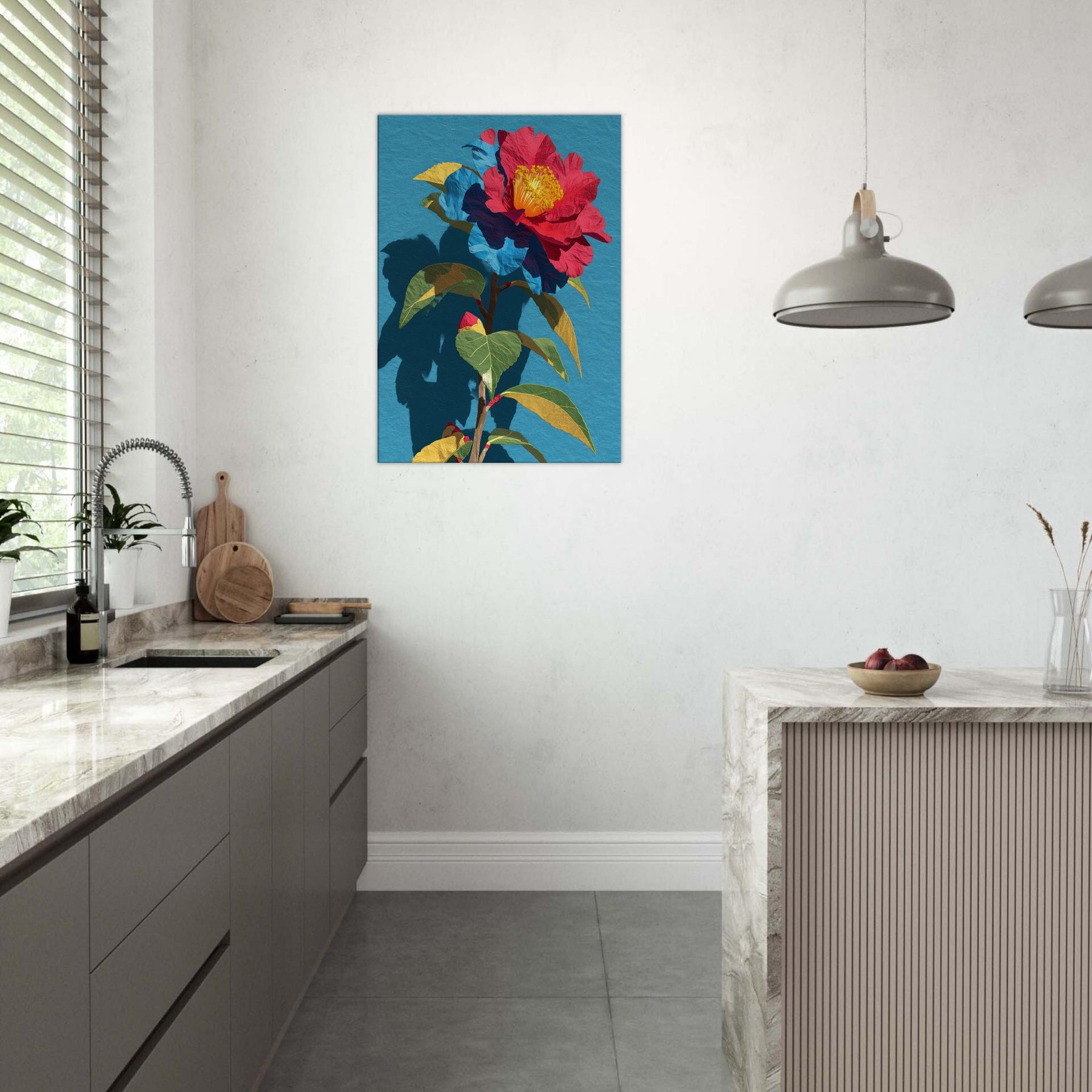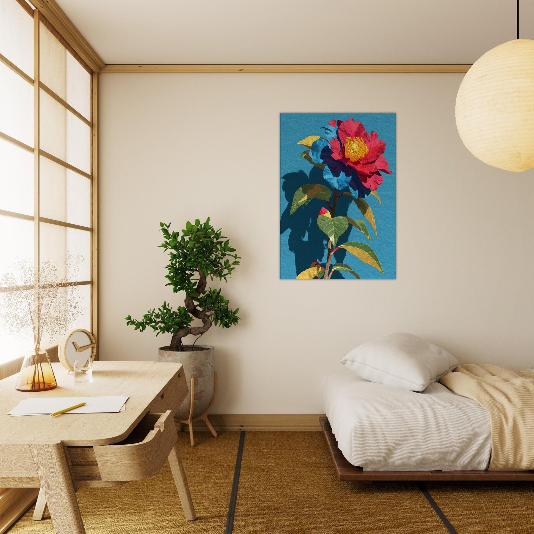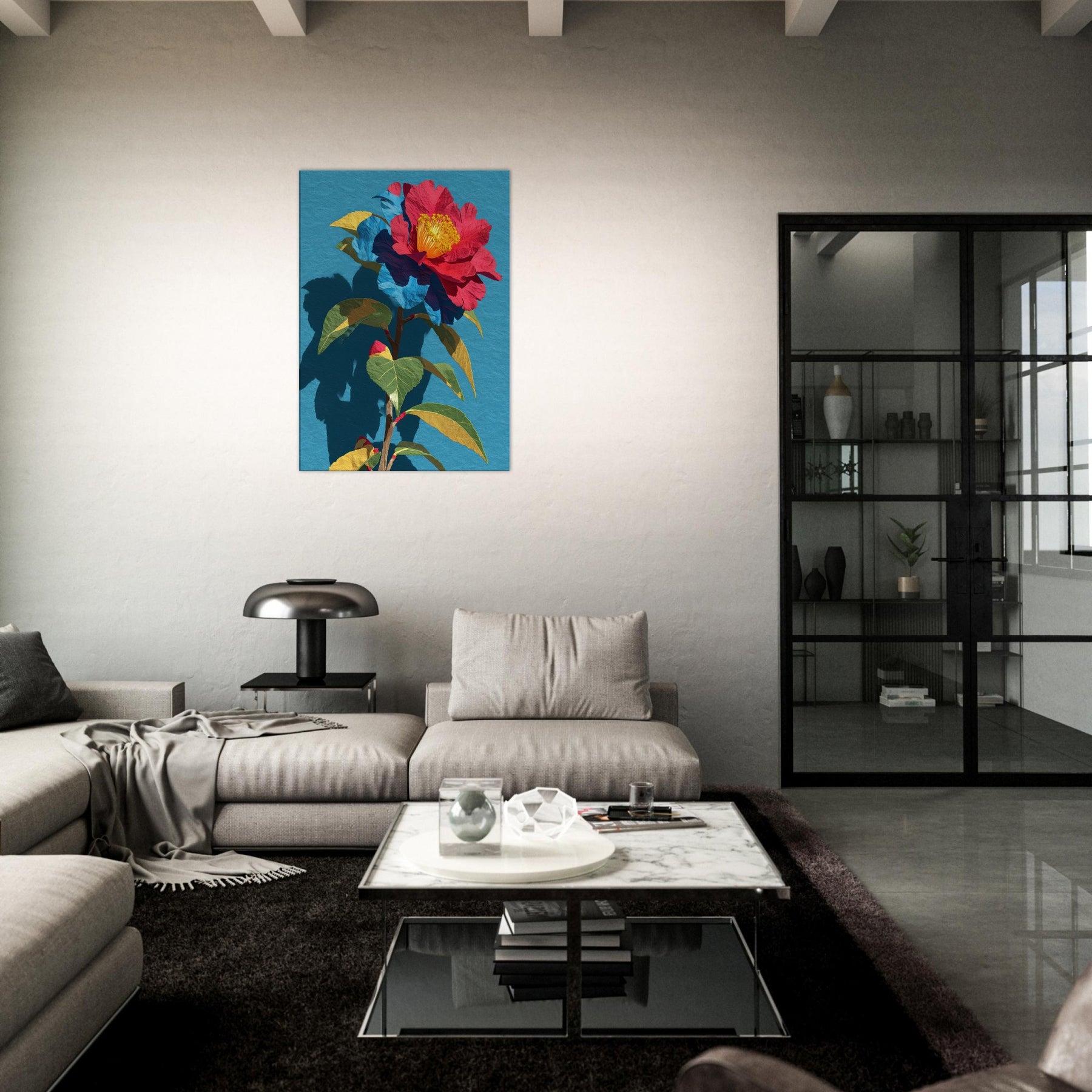 Camellia unfurls in a chorus of saturated reds, golds, and greens, set against a serene blue field. This abstract interpretation invites the eye to trace the flower’s delicate folds and the plant’s sturdy stem, as if the garden were receding into the room itself. The piece radiates warmth and quiet drama, pairing bold color with soft shadow to create depth and movement. In a living space it becomes a luminous focal point, inviting conversation and daily inspiration.