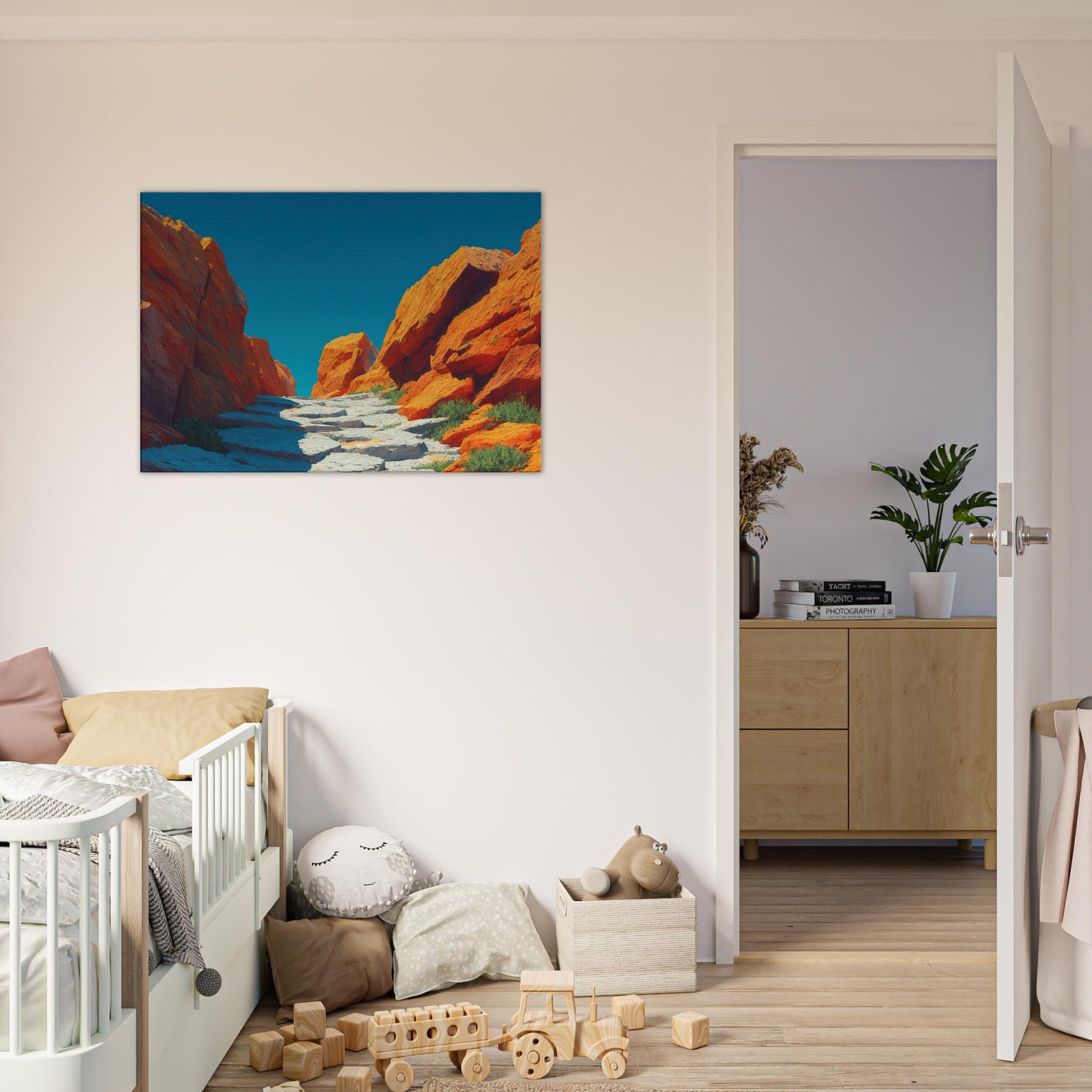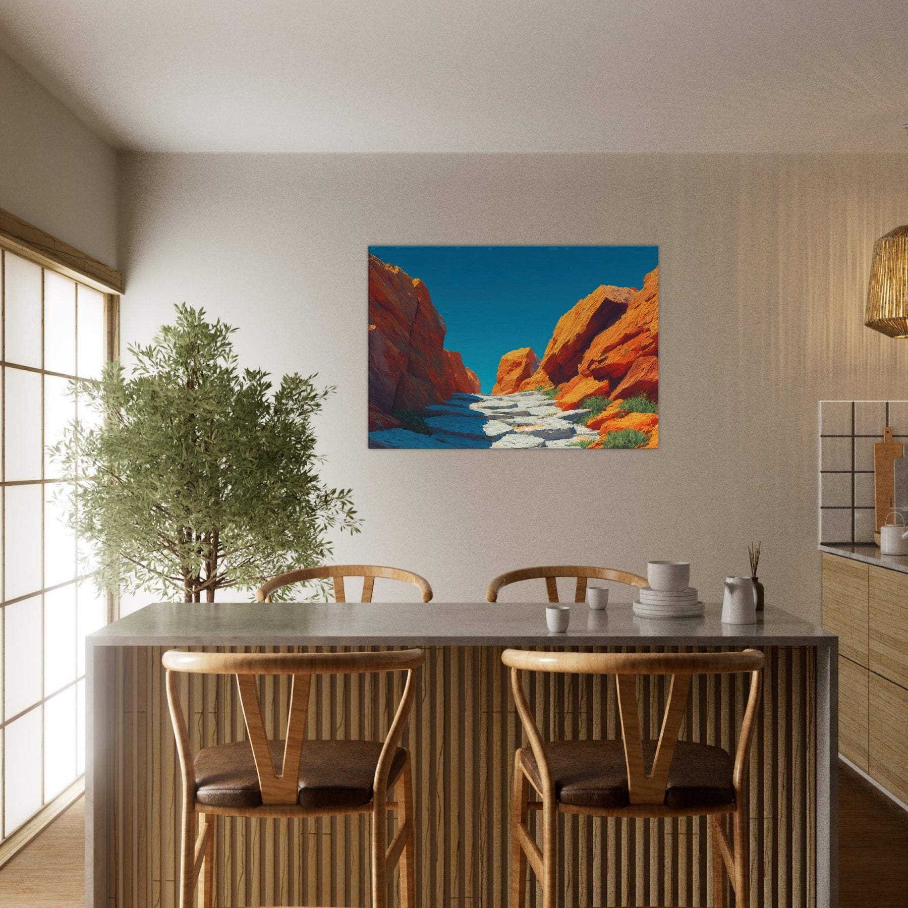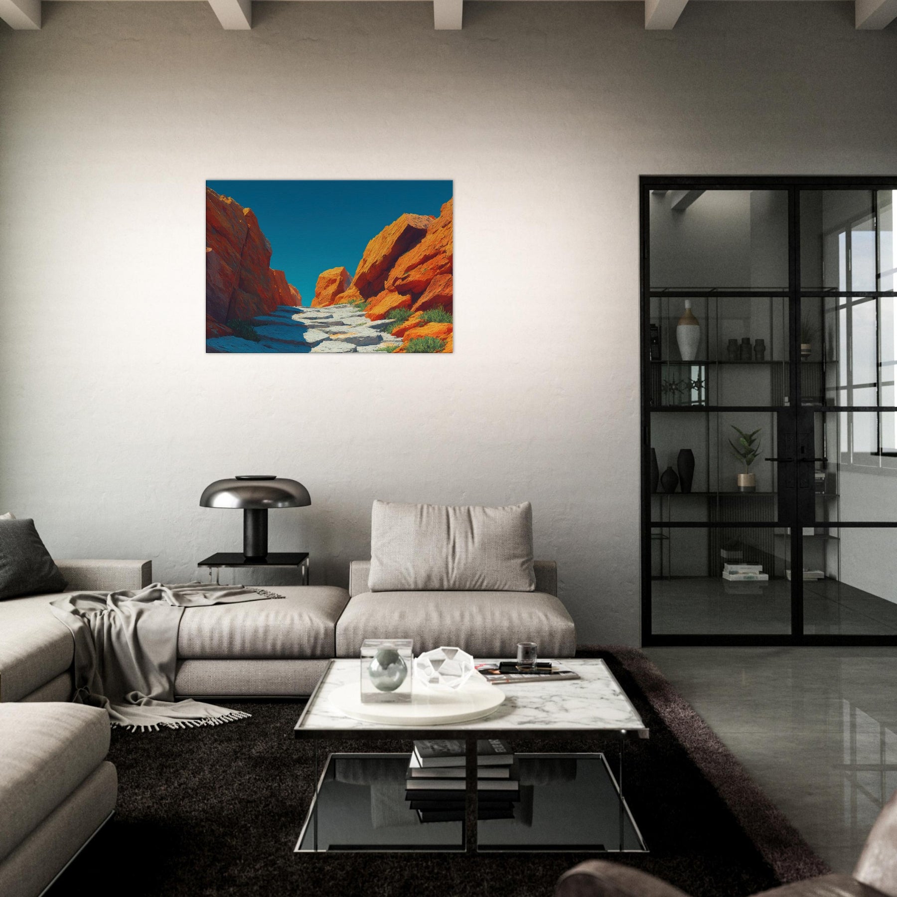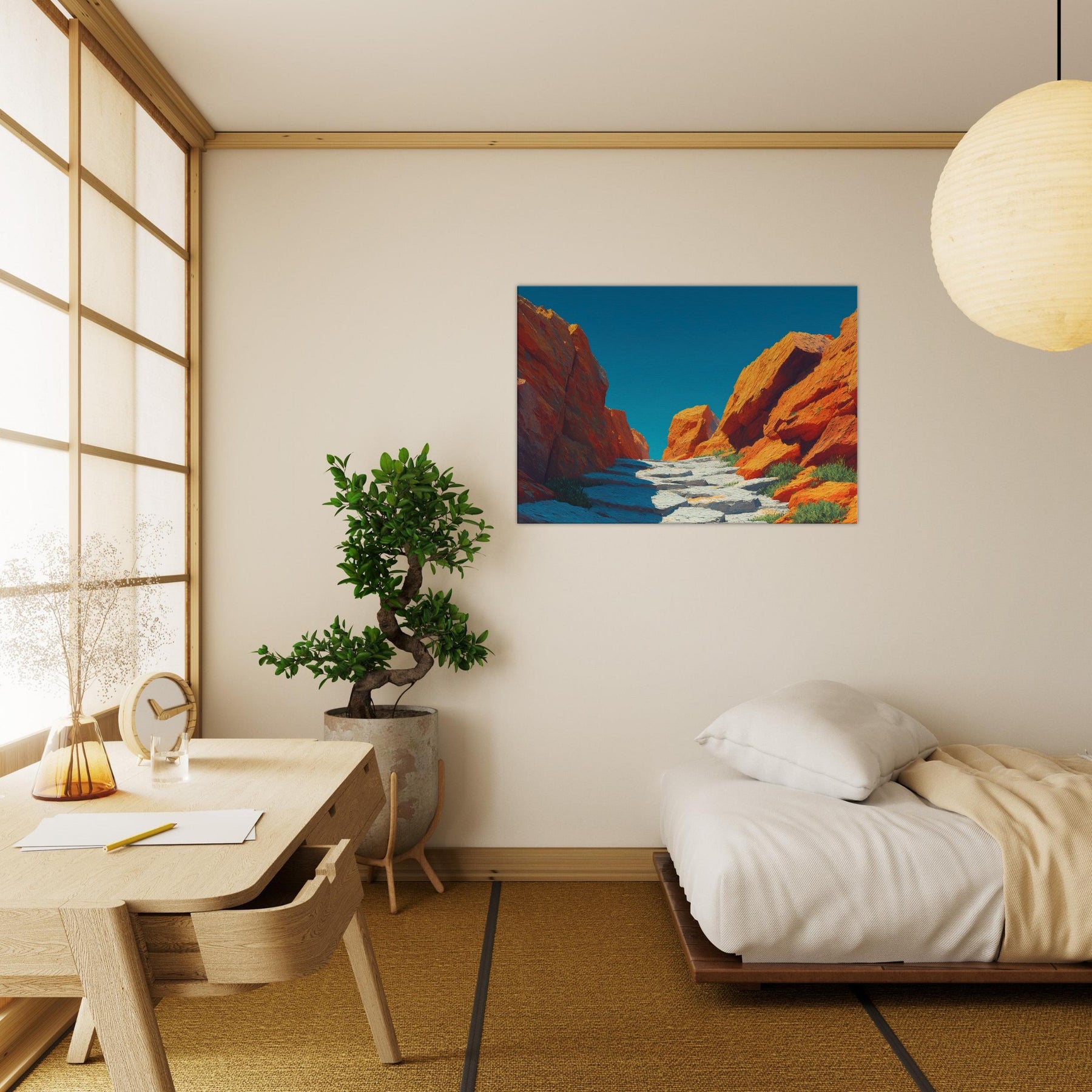 Canyon roars in quiet color. This abstract interpretation folds the rugged grandeur of a canyon into a breath of light and space, inviting the eye to wander along a stone path that seems to shimmer between warmth and shadow. The palette sunlit reds, orange ochre, cool sky blues evokes the canyon’s heartbeat and the wind’s whisper. Hung above a sofa or in a restful hallway, it creates a spacious mood, turning everyday moments into a quiet retreat and a daily reminder of nature’s vast beauty.