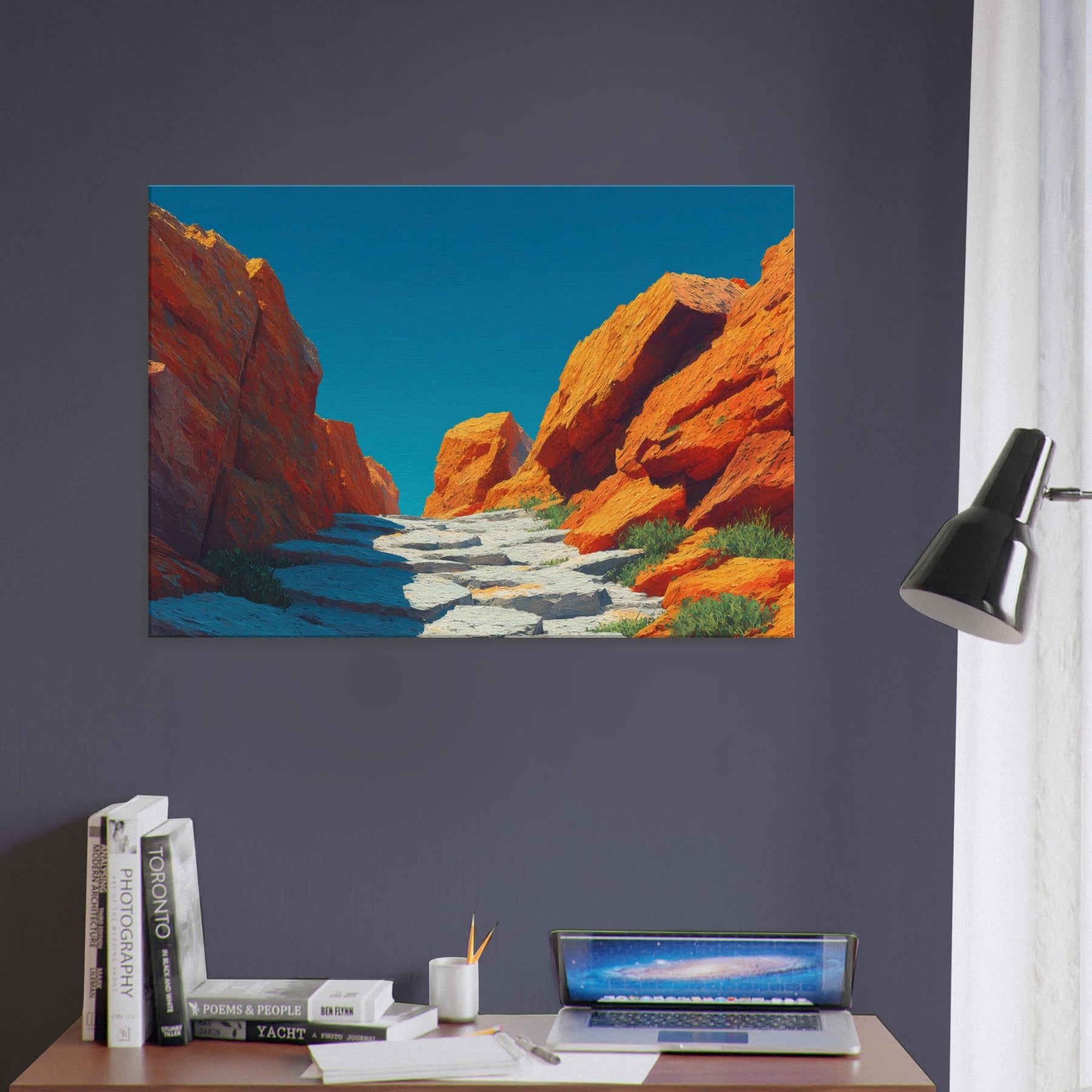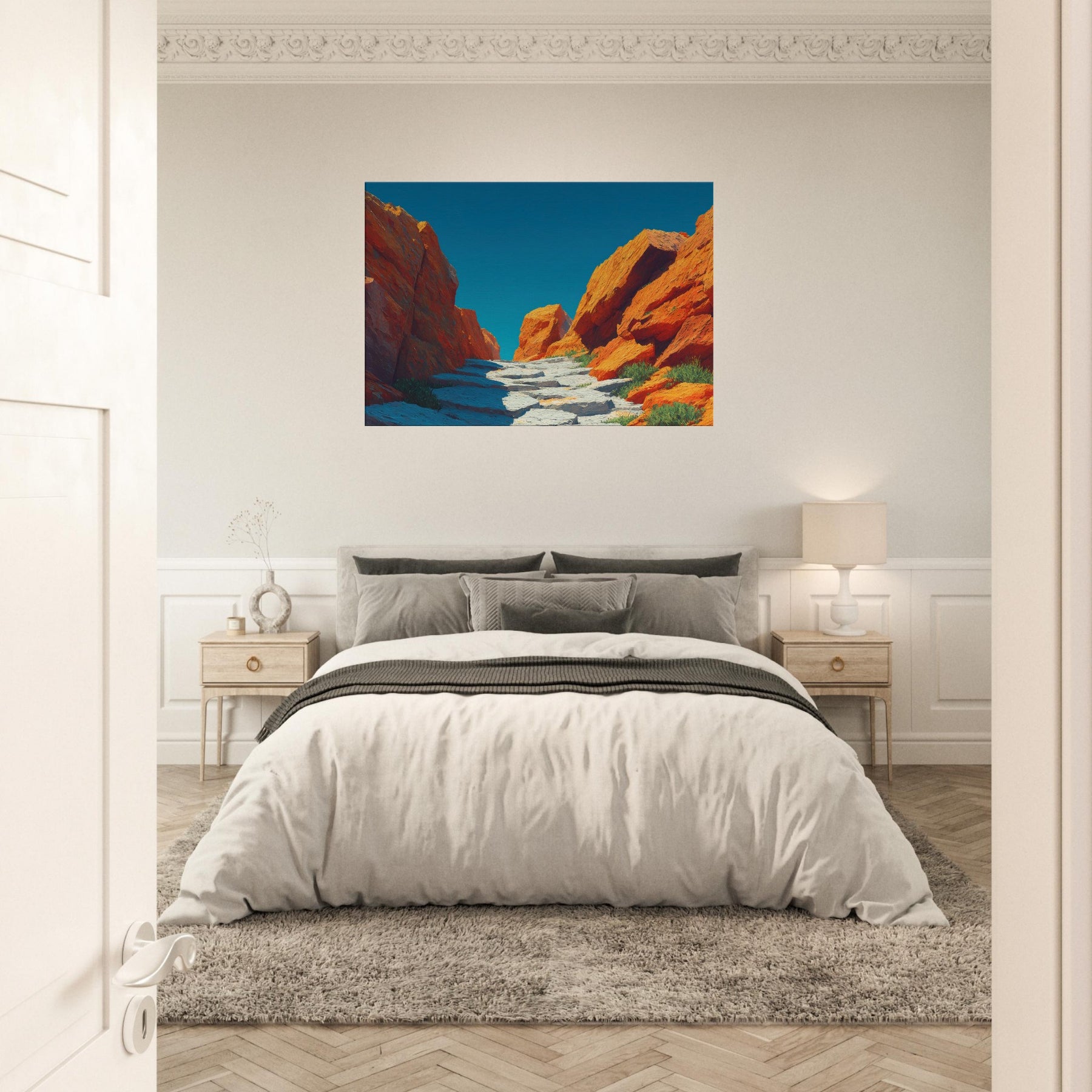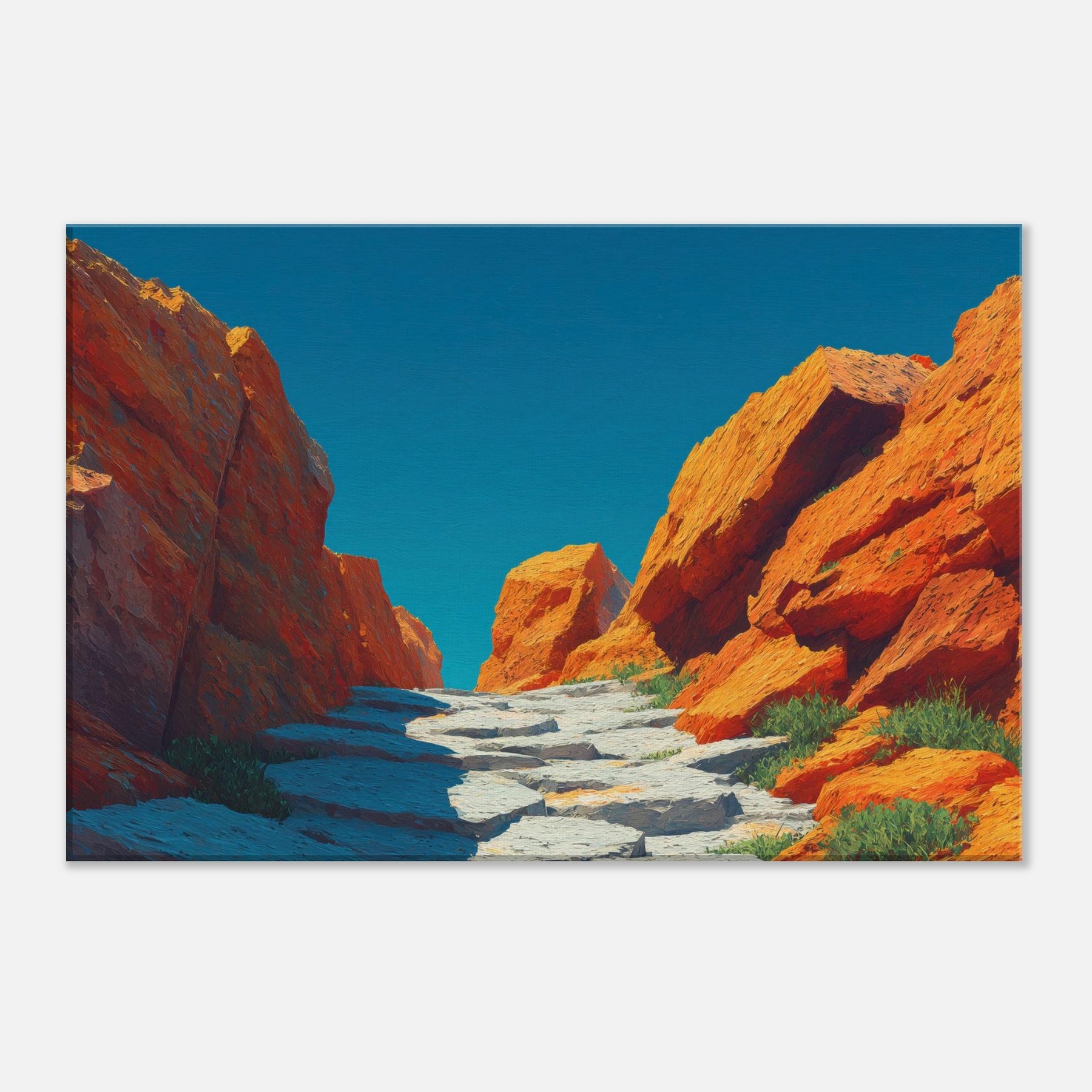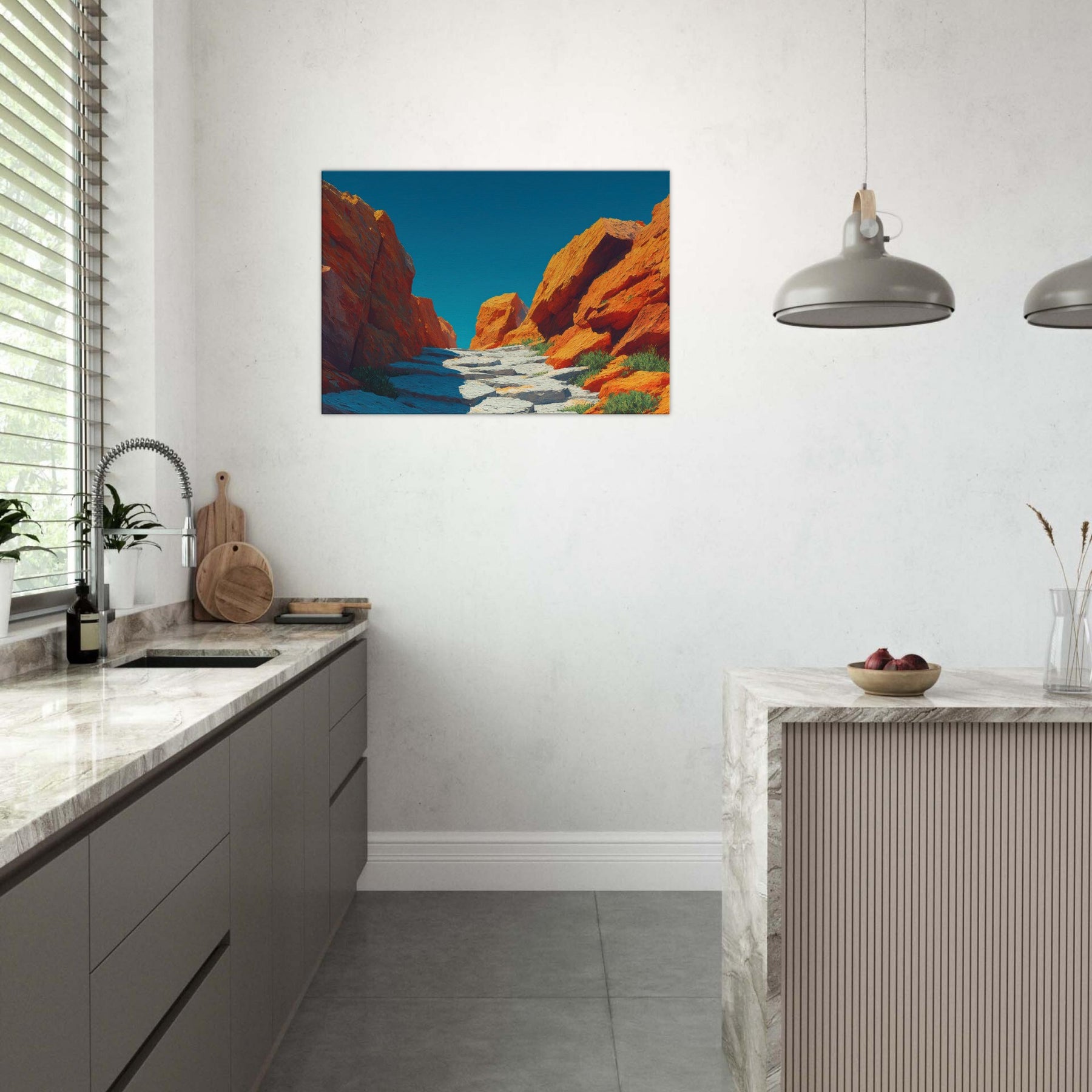 Canyon roars in quiet color. This abstract interpretation folds the rugged grandeur of a canyon into a breath of light and space, inviting the eye to wander along a stone path that seems to shimmer between warmth and shadow. The palette sunlit reds, orange ochre, cool sky blues evokes the canyon’s heartbeat and the wind’s whisper. Hung above a sofa or in a restful hallway, it creates a spacious mood, turning everyday moments into a quiet retreat and a daily reminder of nature’s vast beauty.