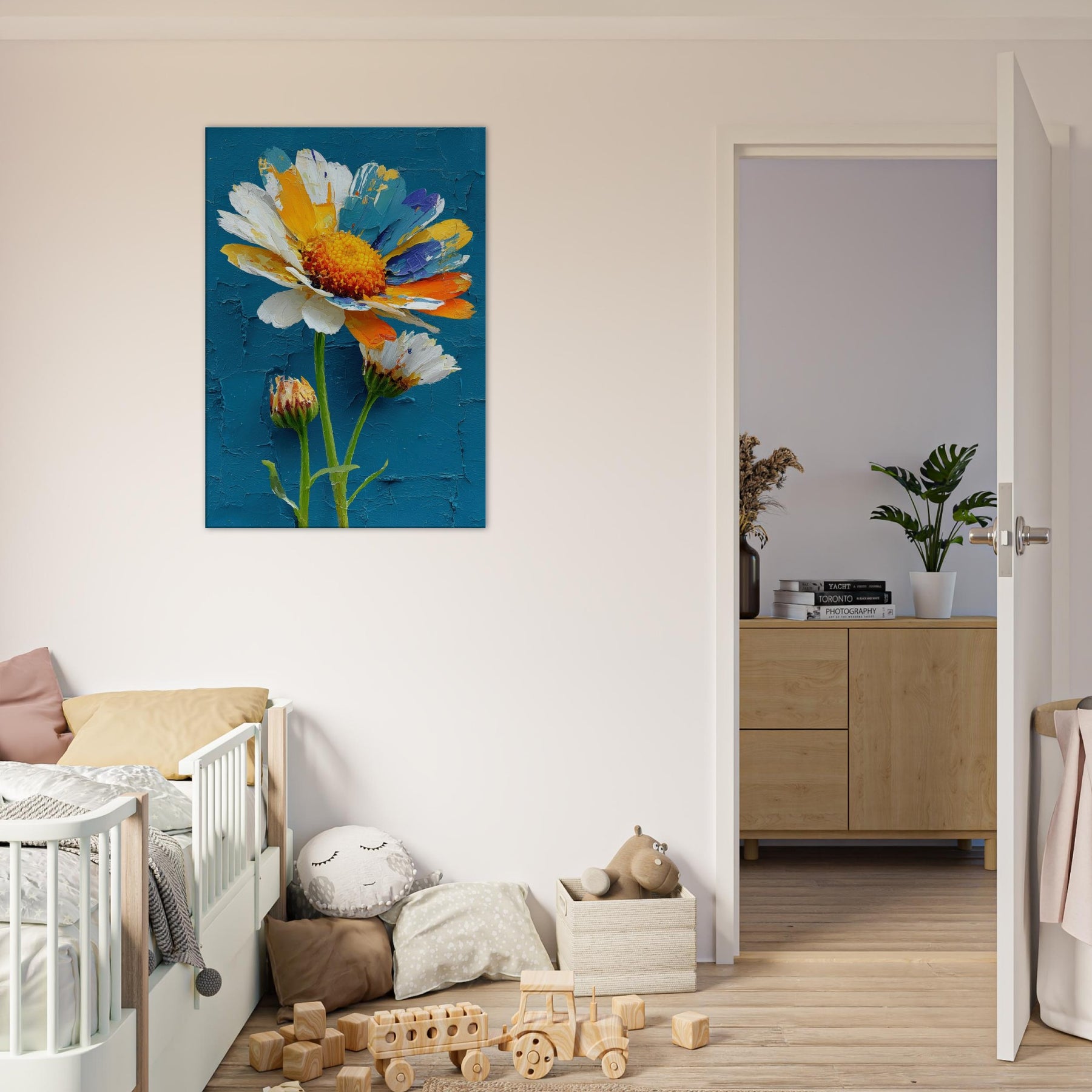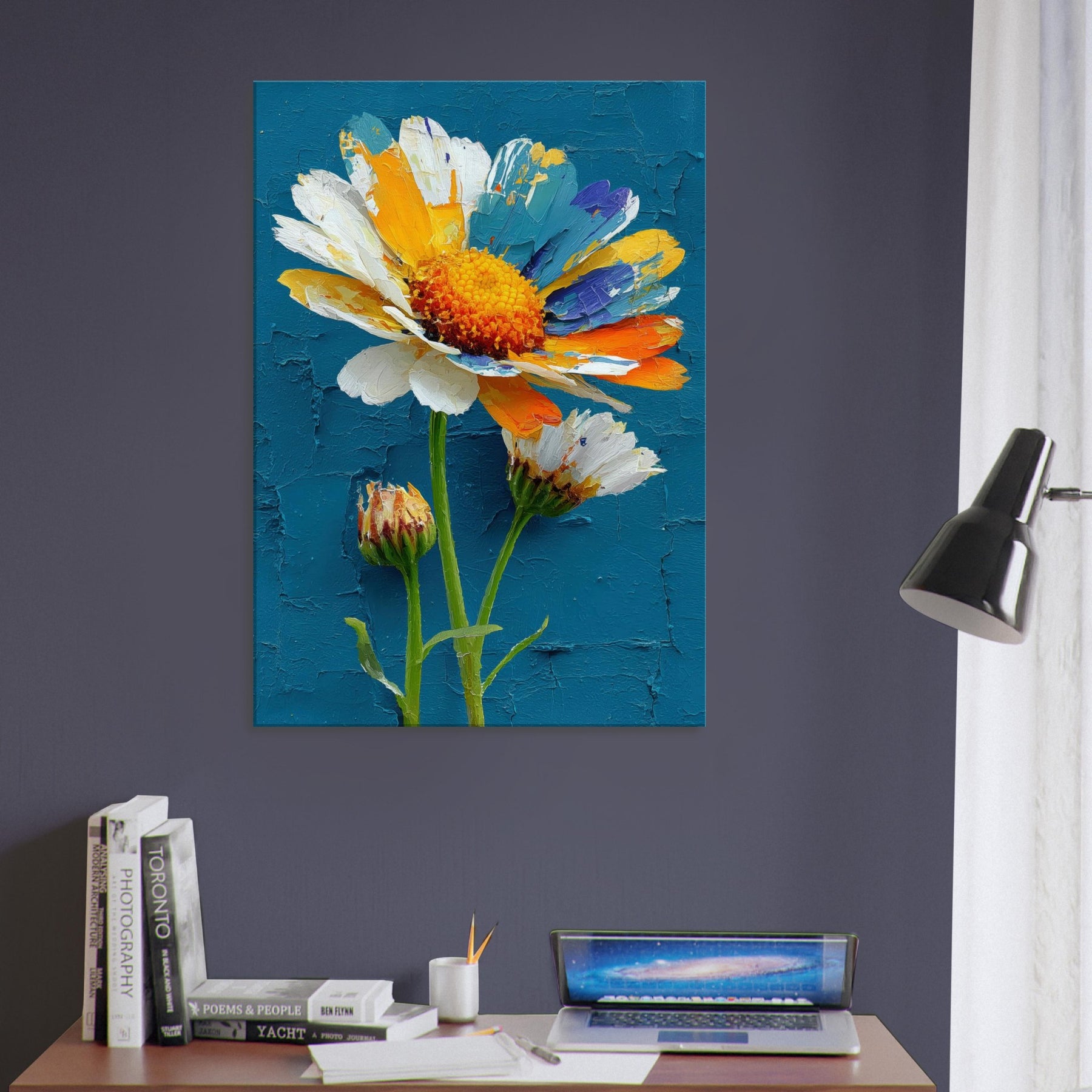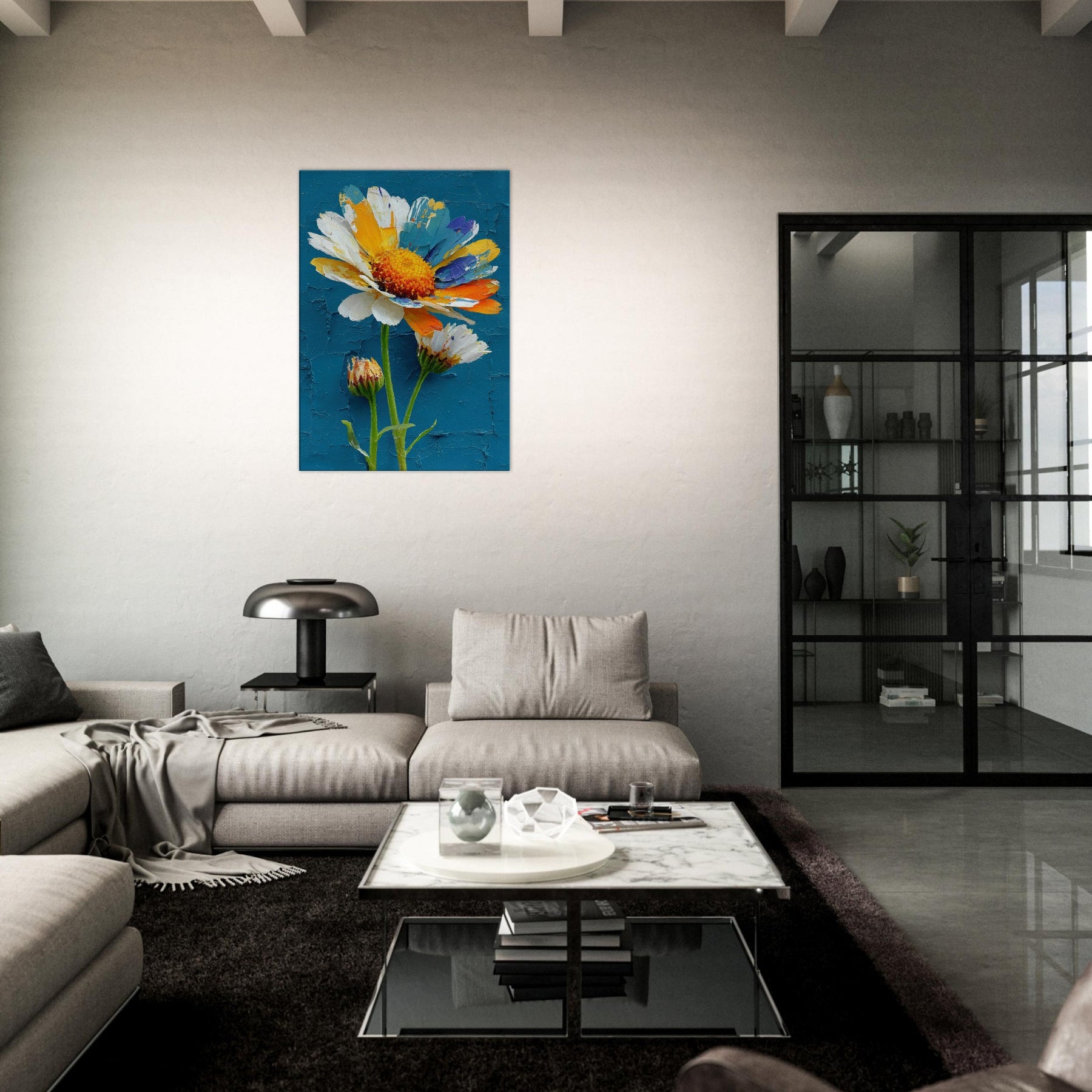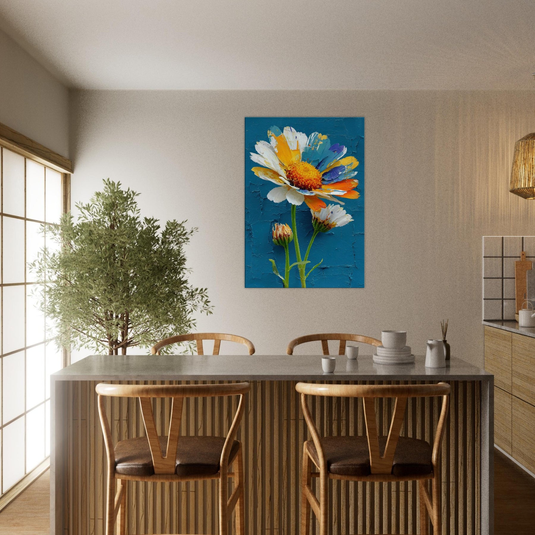 Let the Daisy bloom into your room with a chorus of color and texture. This abstract floral captures sunlight as it spills across petals white, yellow, orange, blue and purple set against a deep teal backdrop that anchors every gesture. The Daisy stands as a bright, living focal point, inviting warmth into a living room or bedroom, while the painterly surface adds tactile depth to your space. A contemporary ode to nature that feels both joyful and serene.