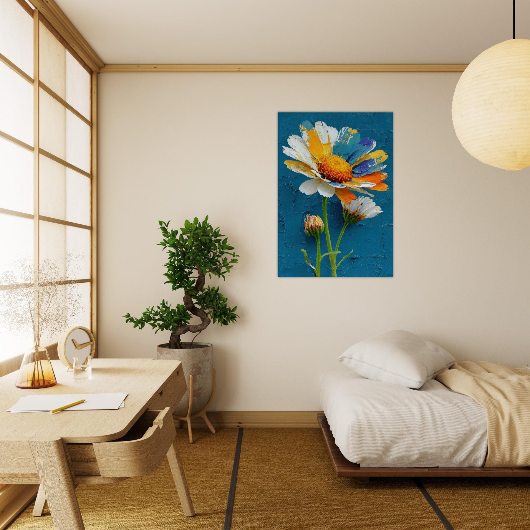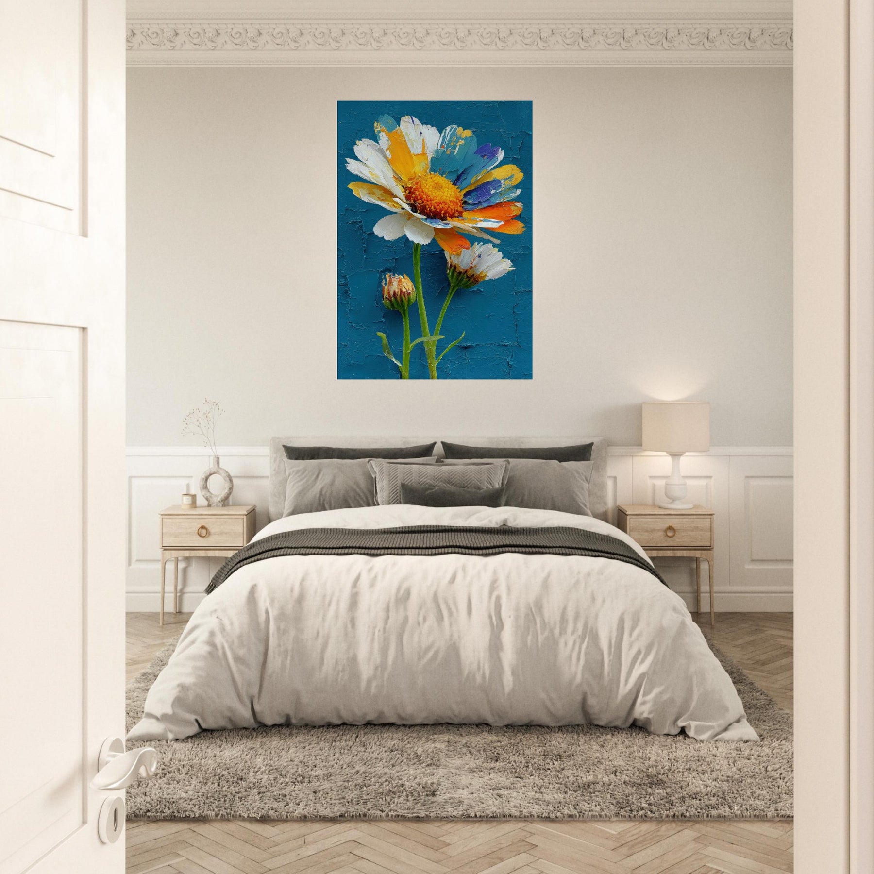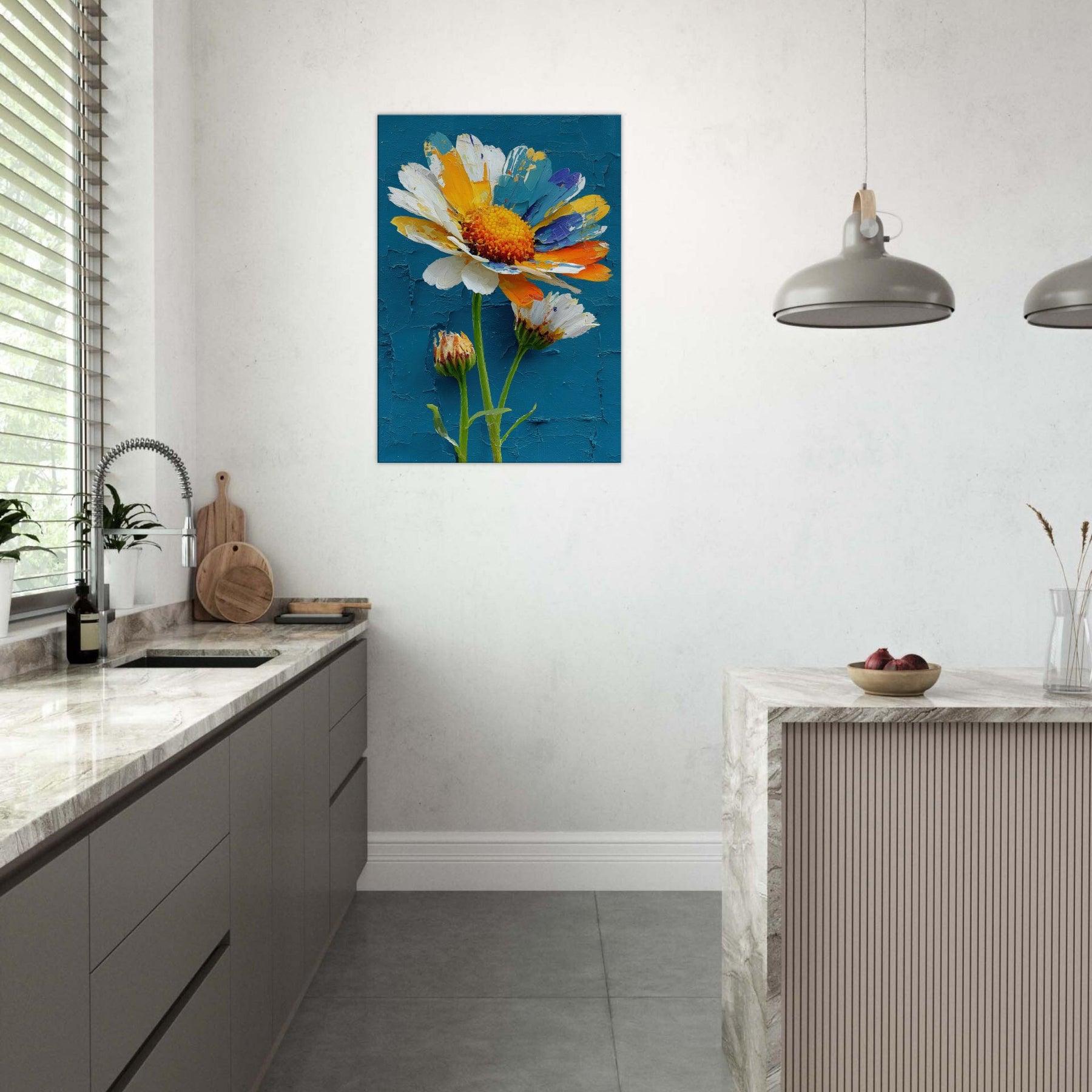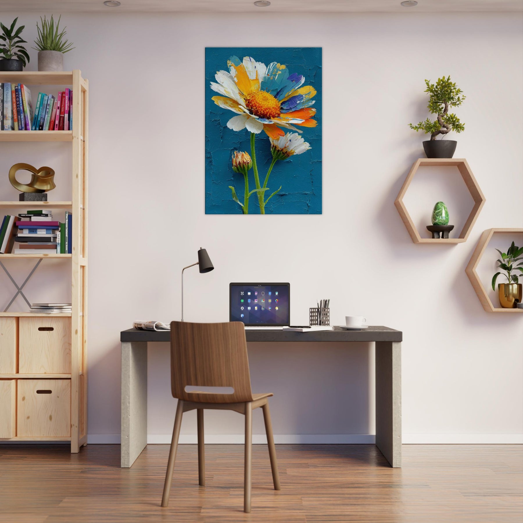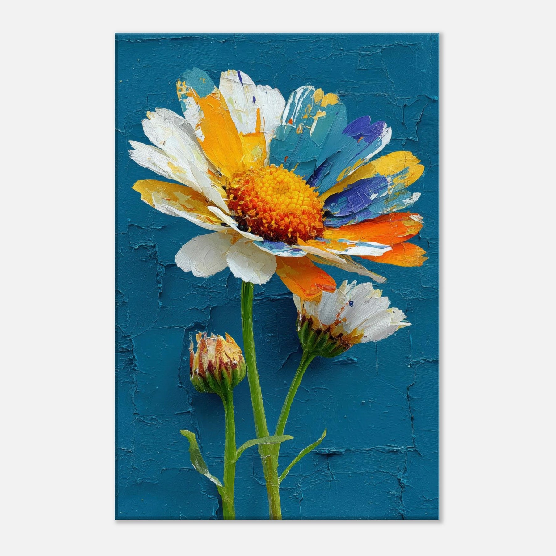 Let the Daisy bloom into your room with a chorus of color and texture. This abstract floral captures sunlight as it spills across petals white, yellow, orange, blue and purple set against a deep teal backdrop that anchors every gesture. The Daisy stands as a bright, living focal point, inviting warmth into a living room or bedroom, while the painterly surface adds tactile depth to your space. A contemporary ode to nature that feels both joyful and serene.