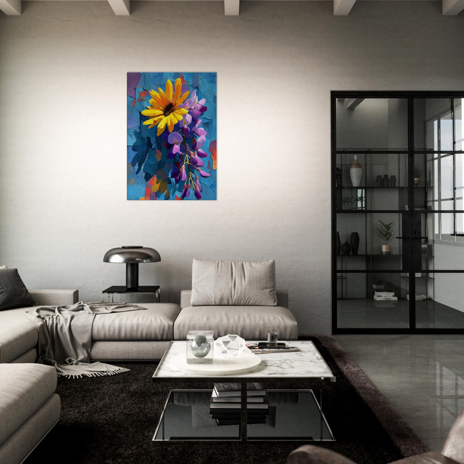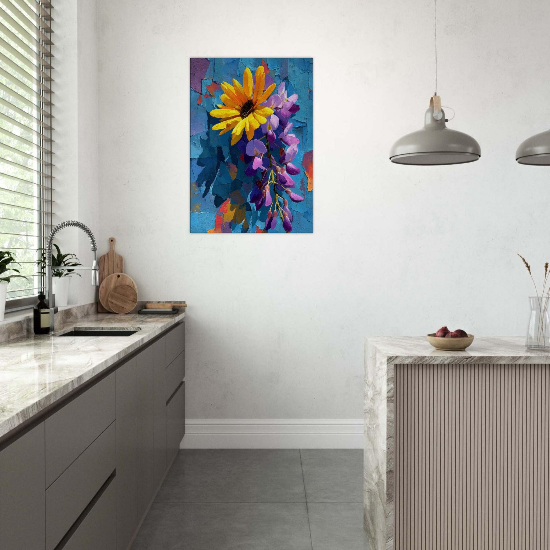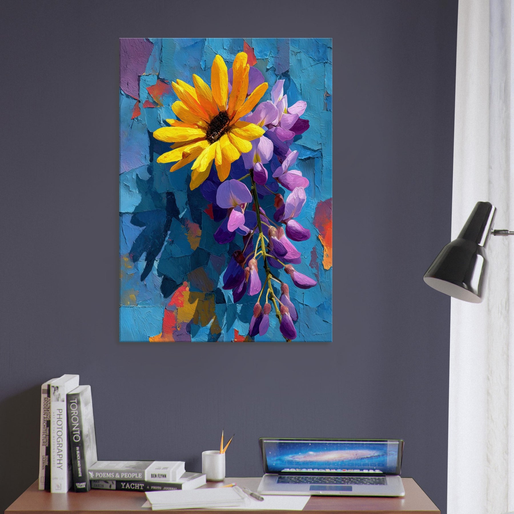 Wisteria bursts through an electric field of color in this abstract study, where a sun washed bloom anchors the composition and cobalt blues glow along the edges. The painterly textures invite a slow gaze, as lilac clusters drift beside vibrant, sun kissed petals. In your living space, the piece infuses a room with renewal, warmth, and quiet drama a natural, uplifting mood that elevates everyday moments and pairs beautifully with clean lines and soft neutrals.