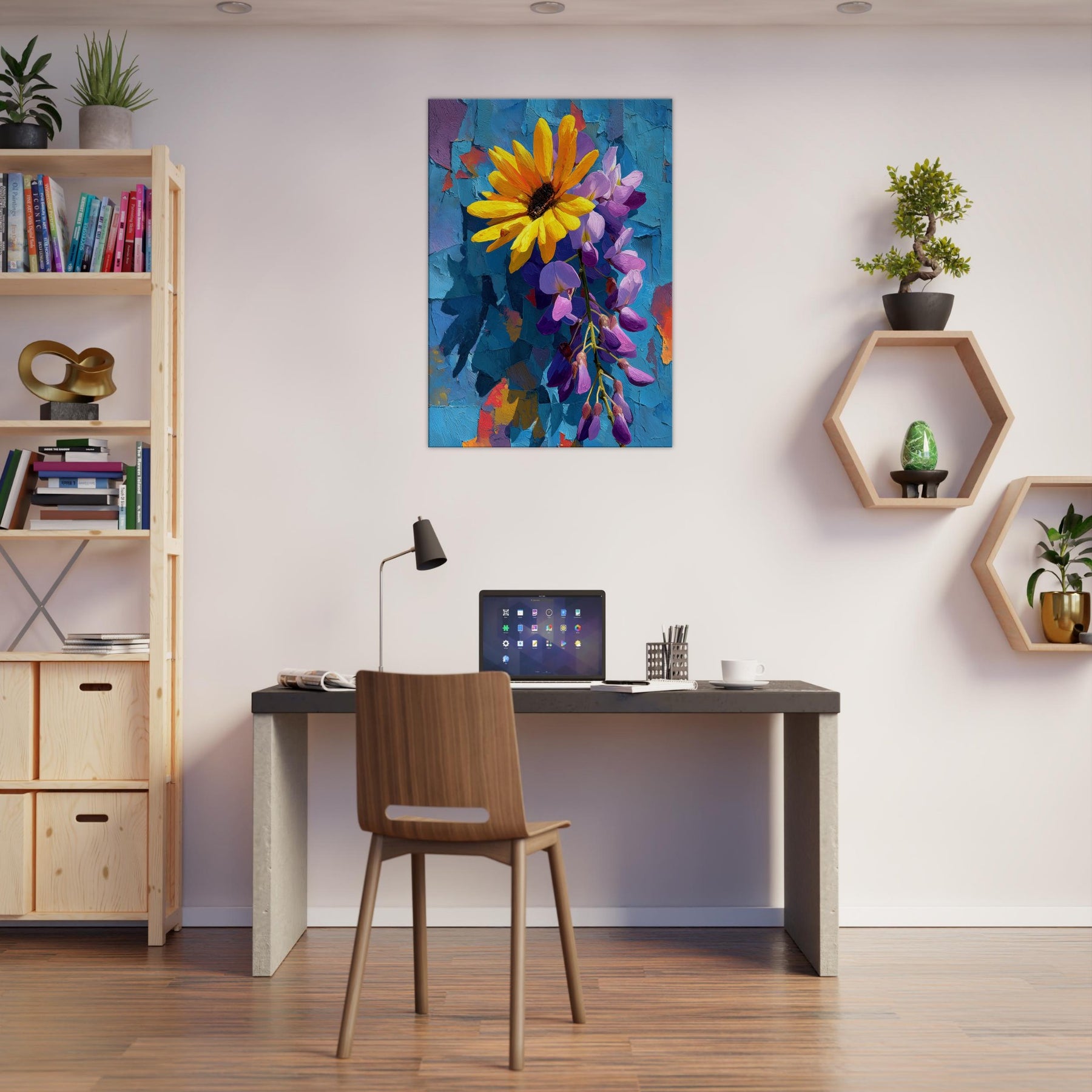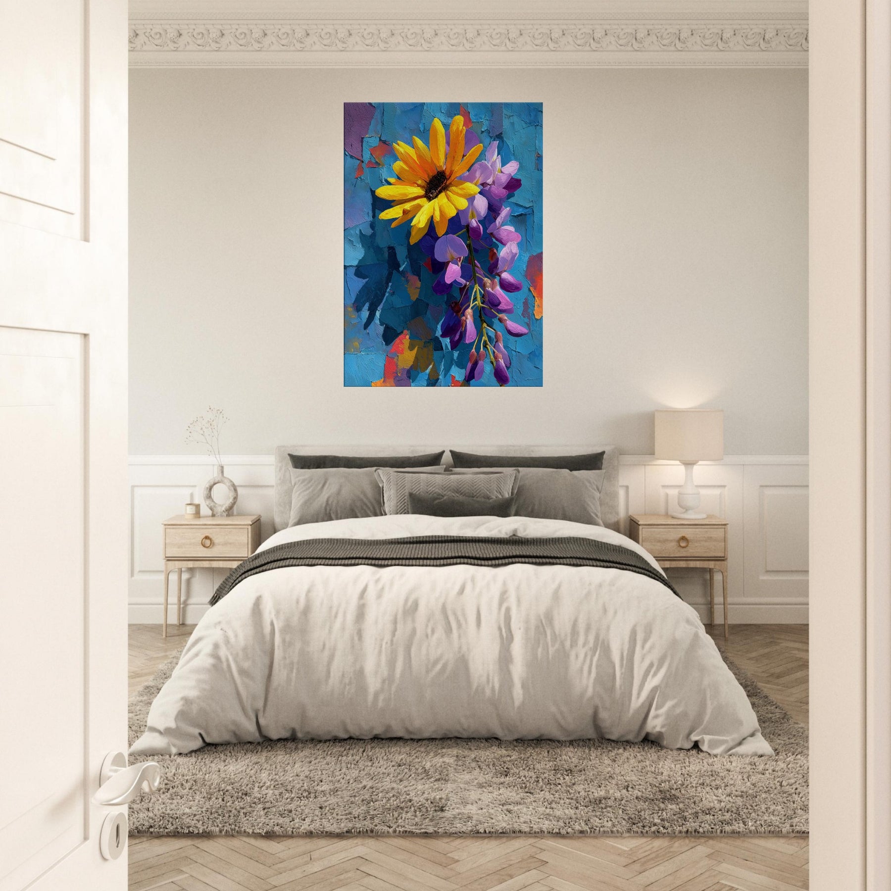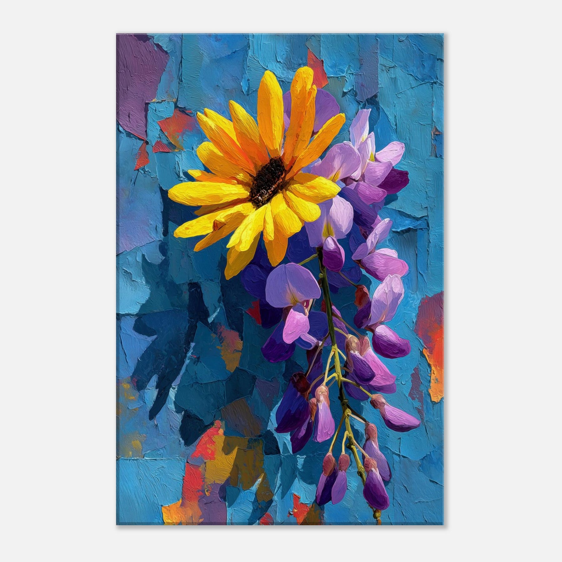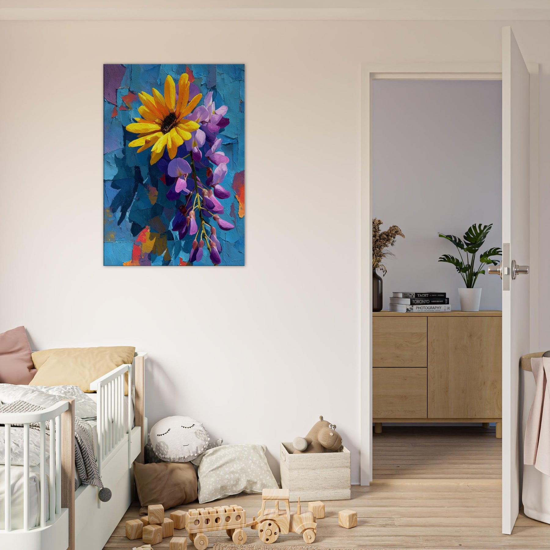 Wisteria bursts through an electric field of color in this abstract study, where a sun washed bloom anchors the composition and cobalt blues glow along the edges. The painterly textures invite a slow gaze, as lilac clusters drift beside vibrant, sun kissed petals. In your living space, the piece infuses a room with renewal, warmth, and quiet drama a natural, uplifting mood that elevates everyday moments and pairs beautifully with clean lines and soft neutrals.